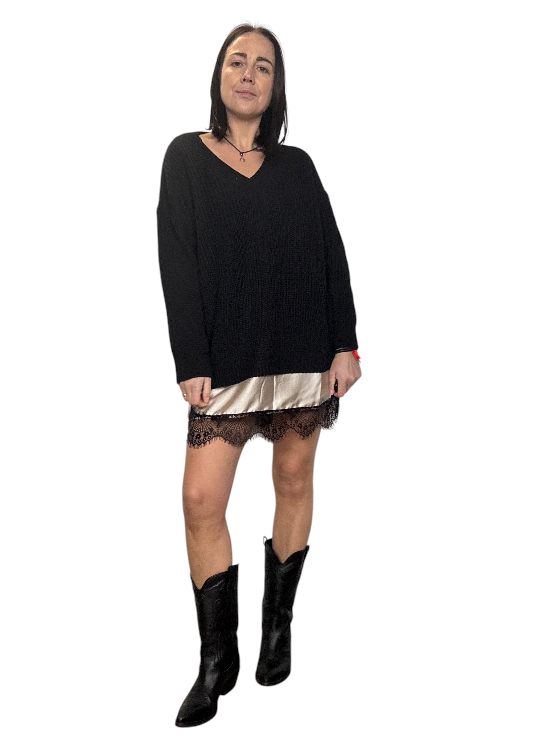 abito corto con scollo a v ed inserto in raso+pizzo sul fondo