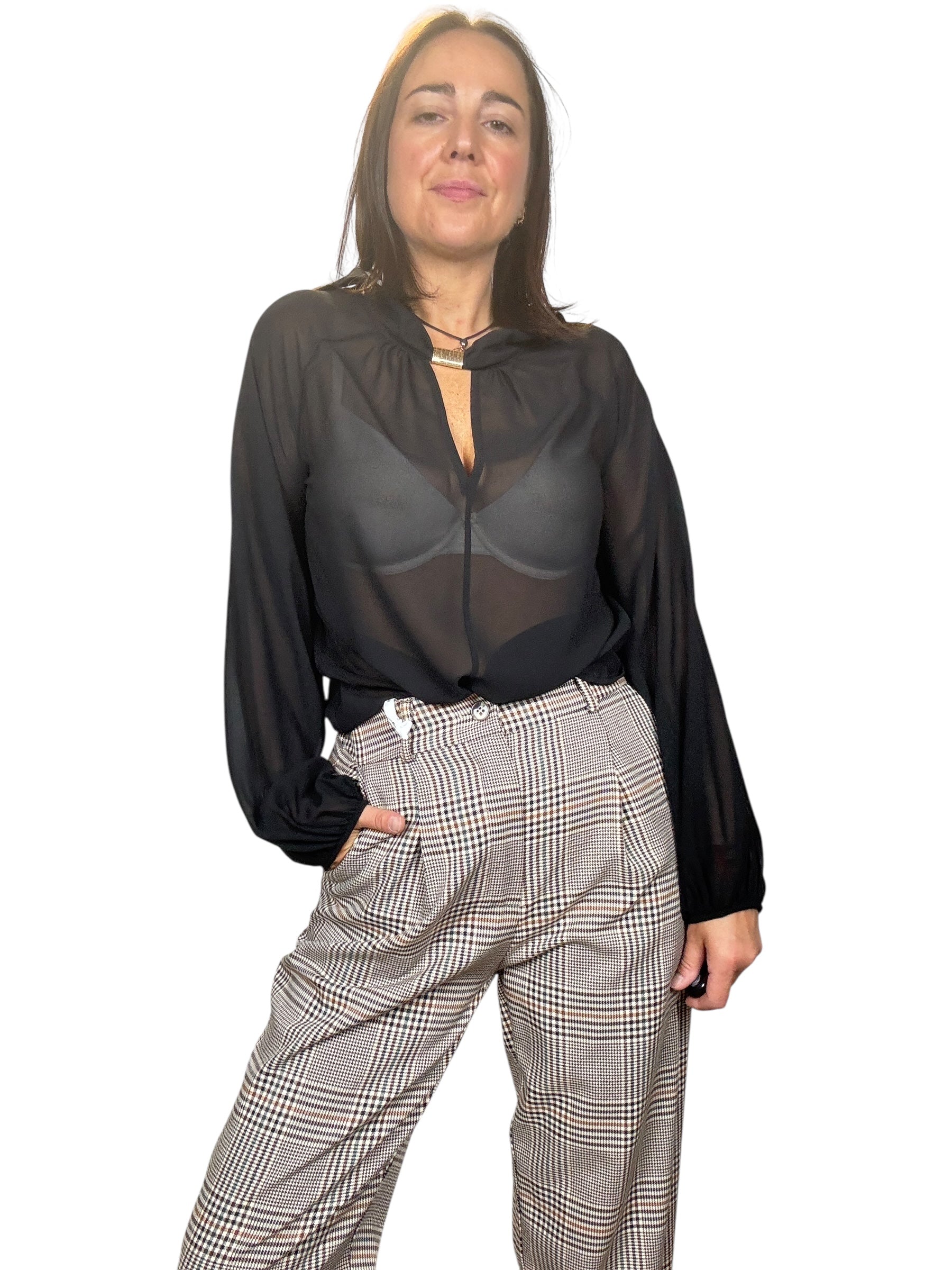 camicia con manica lunga a palloncino e dettaglio "anello dorato" sul collo. Tessuto fluido vestibilità morbida (non elasticizzata Tg in foto M)