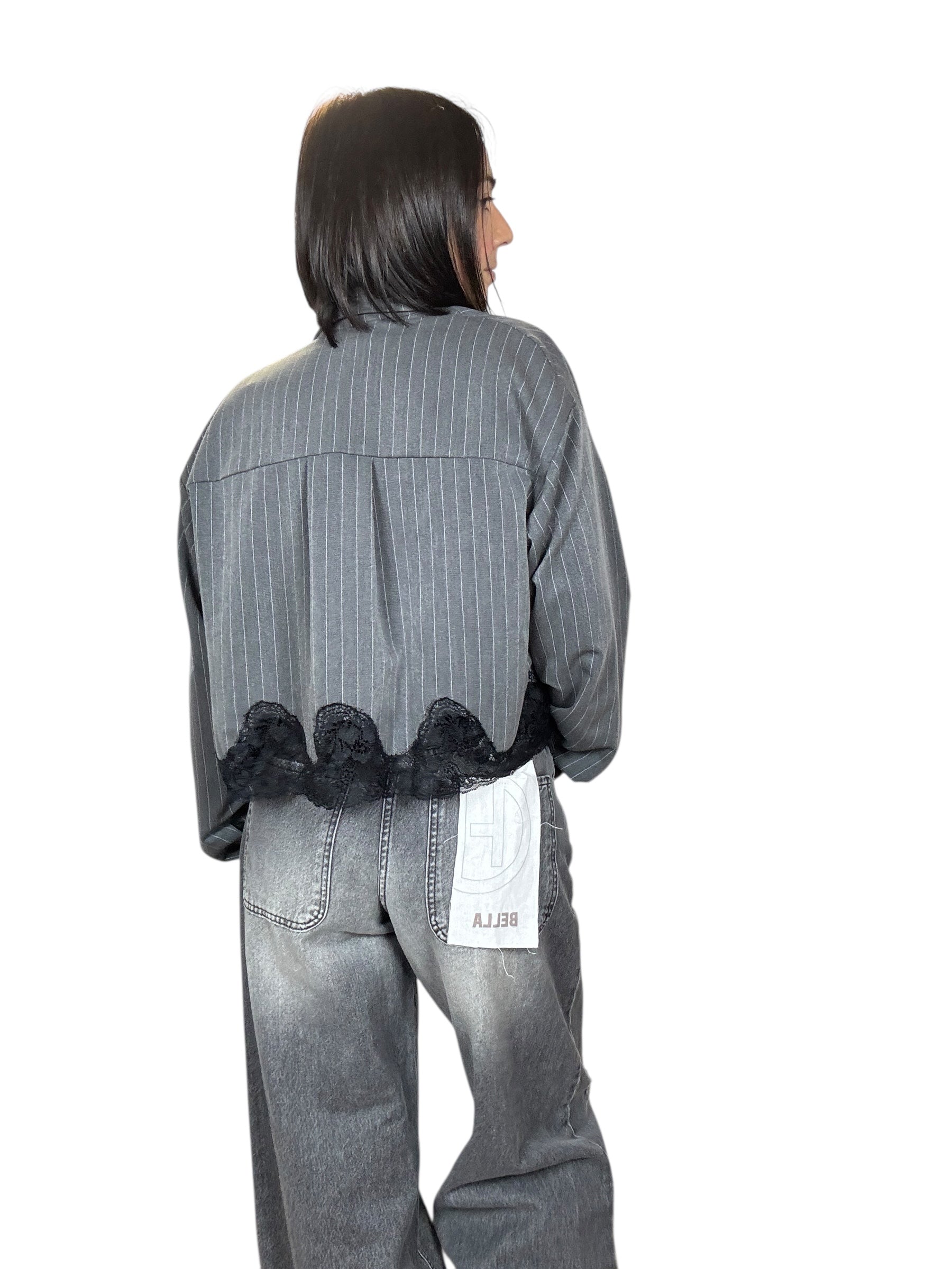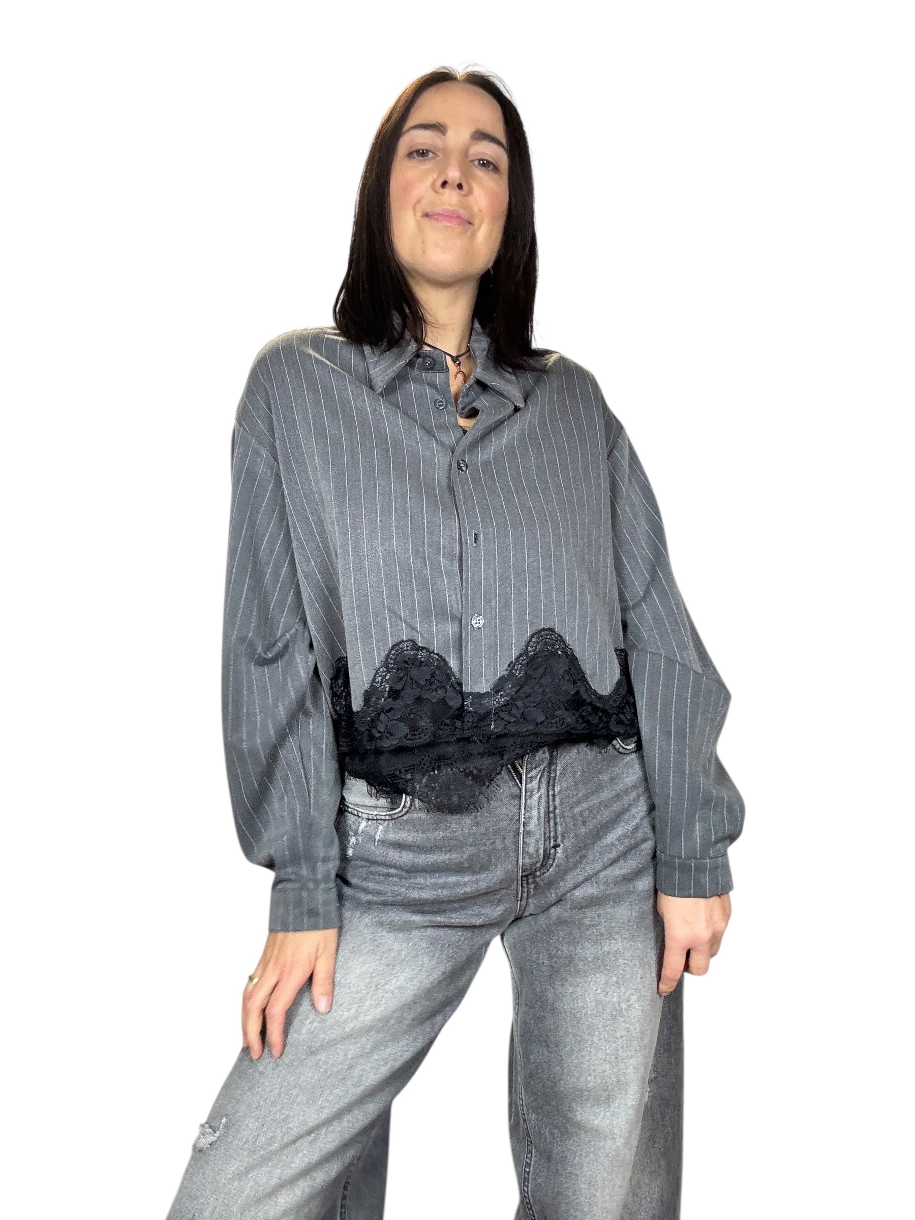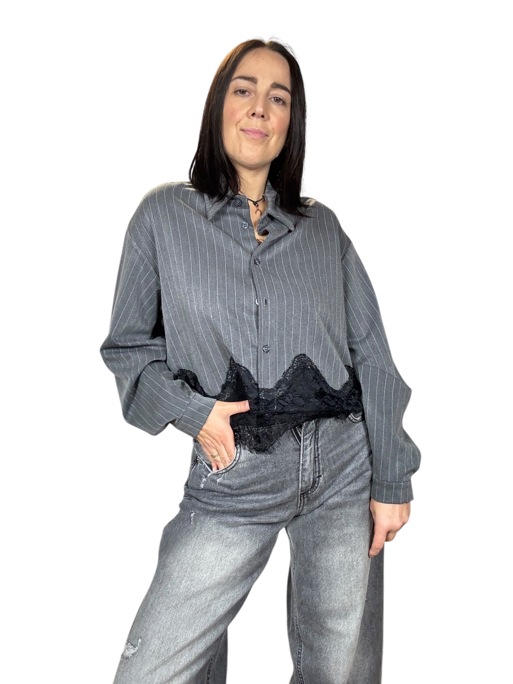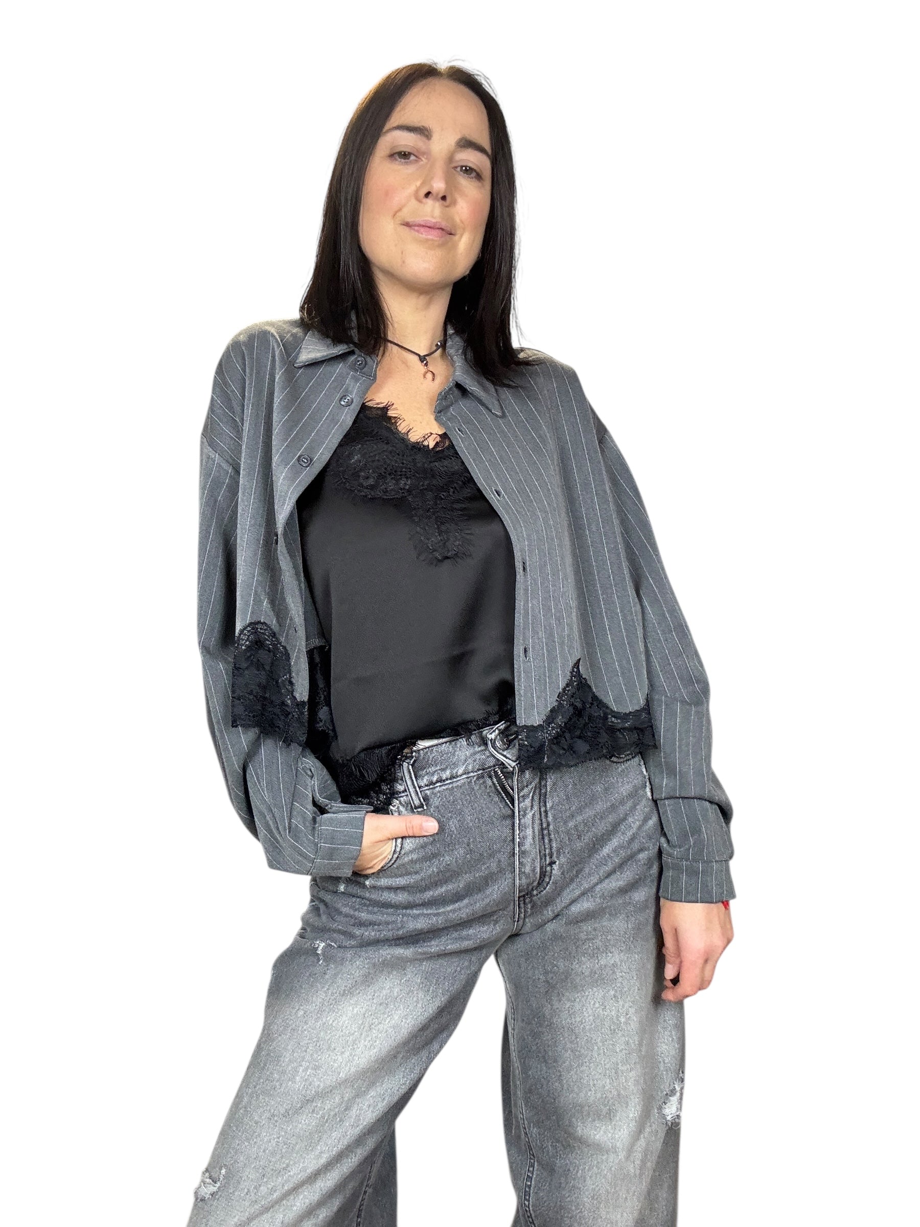 camicia gessata con inserto in pizzo sul fondo e carrè con soffietto sulla schiena, short abbinabile