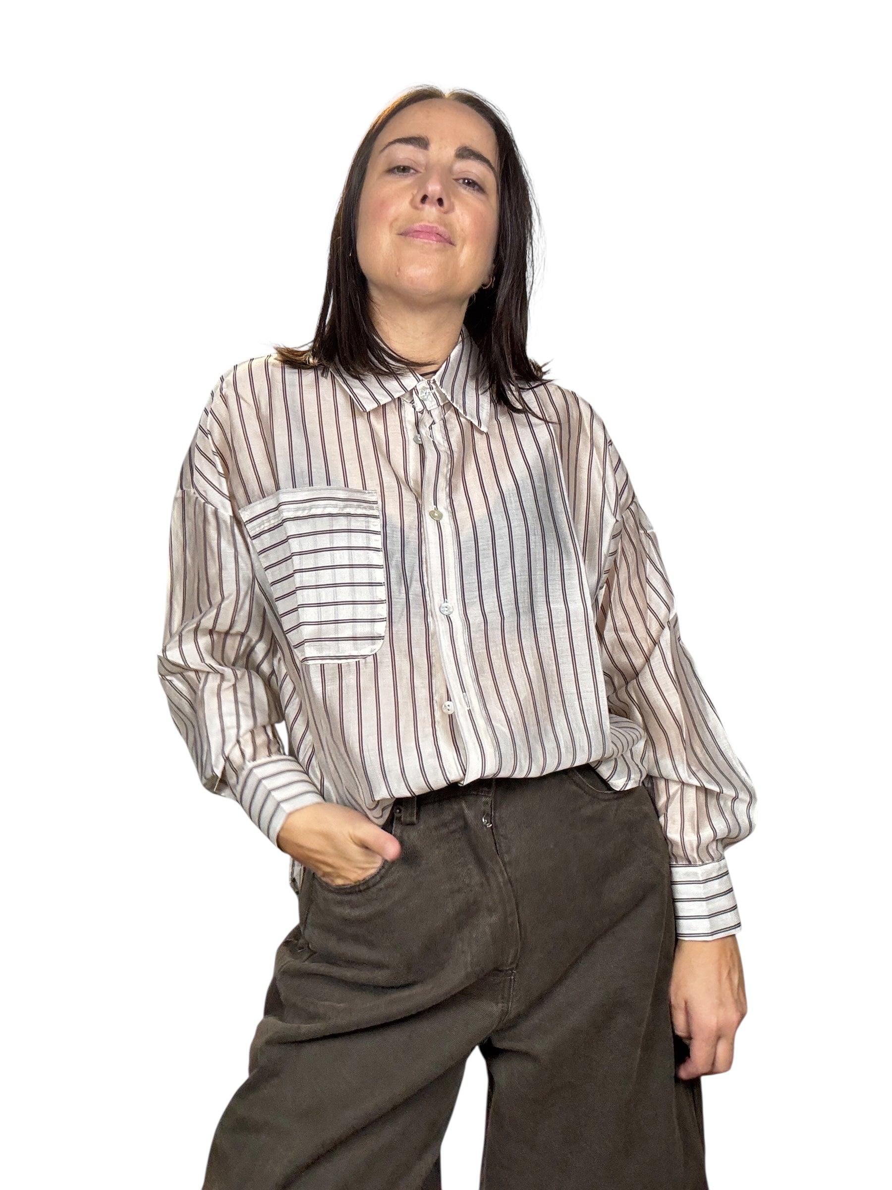 Camcia a manica lunga con colletto e bottoncini davanti e carrè con soffietto sulla schiena. Modello oversize con tascona frontale