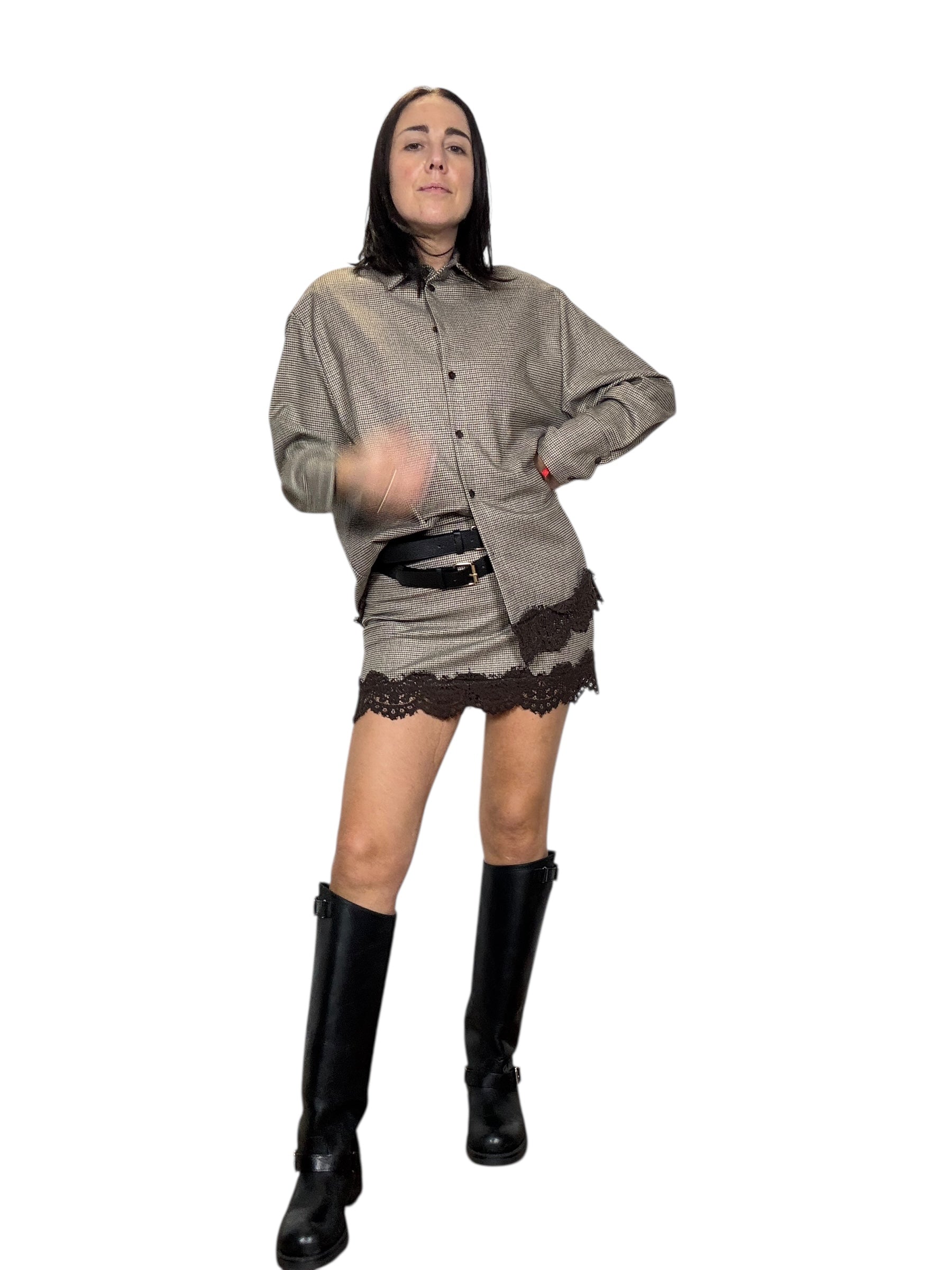 camicia oversize con soffietto sulla schiena ed inserto in pizzo sul fondo. Minigonna abbinabile