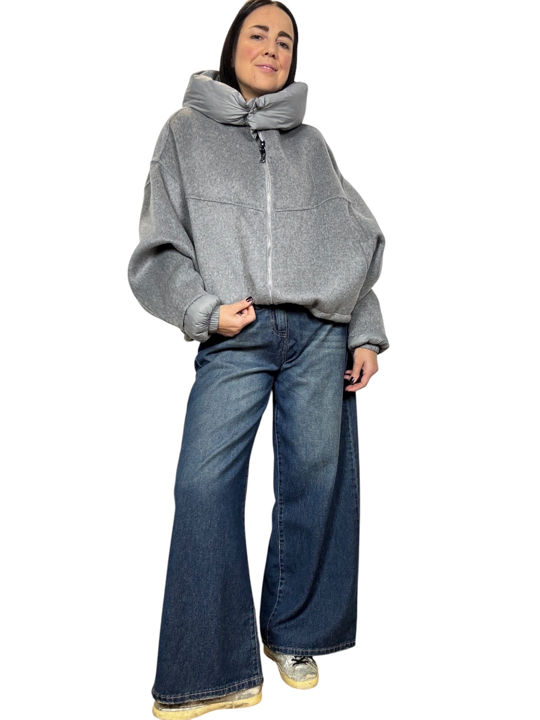 Giubbino con manica lunga a reglan, tasche laterali e cappuccio impermeabile. Modello taglio bomber over con coulisse sul fondo per portarlo rimborsato. Tessuto misto lana HANDMADE