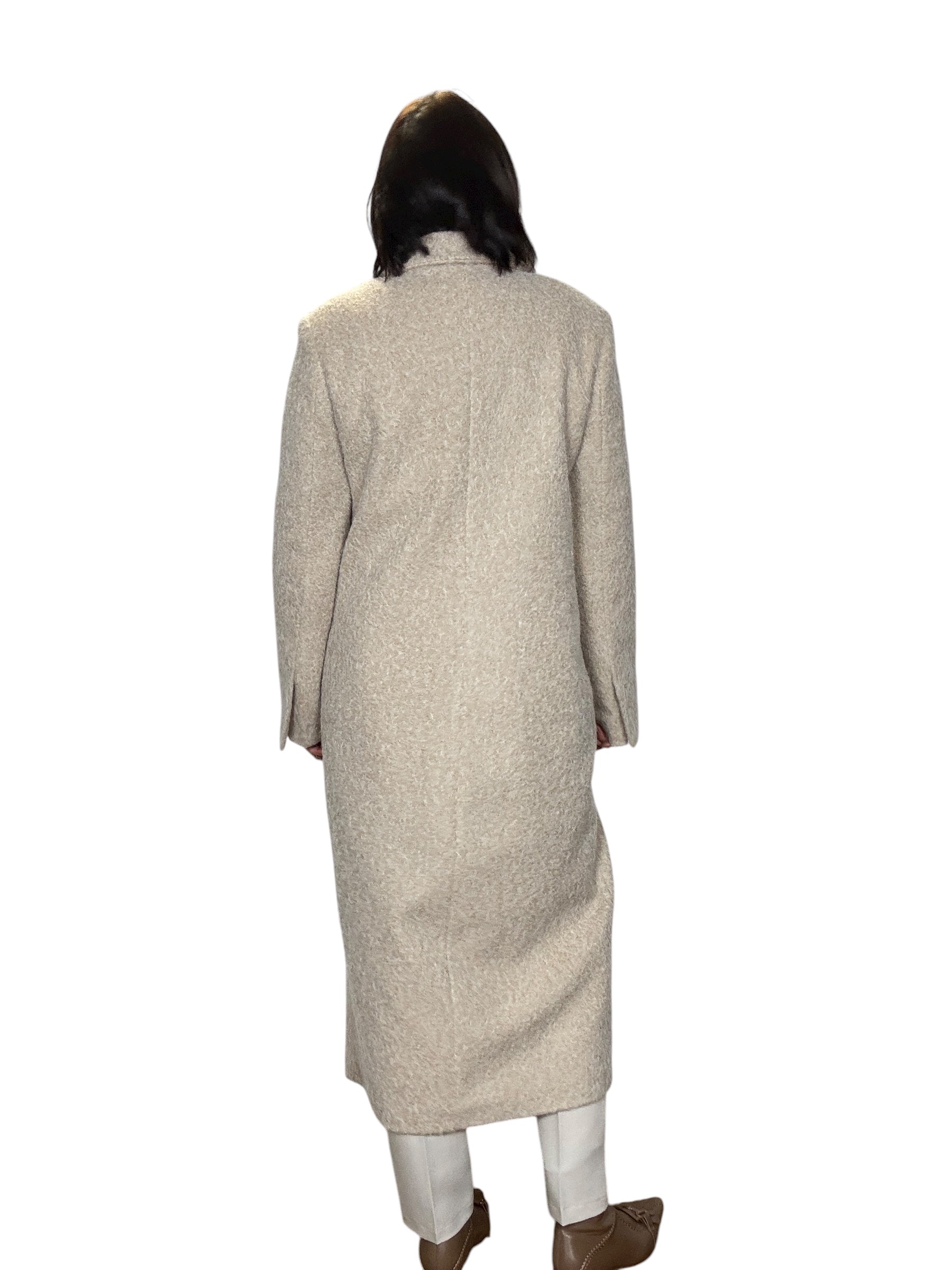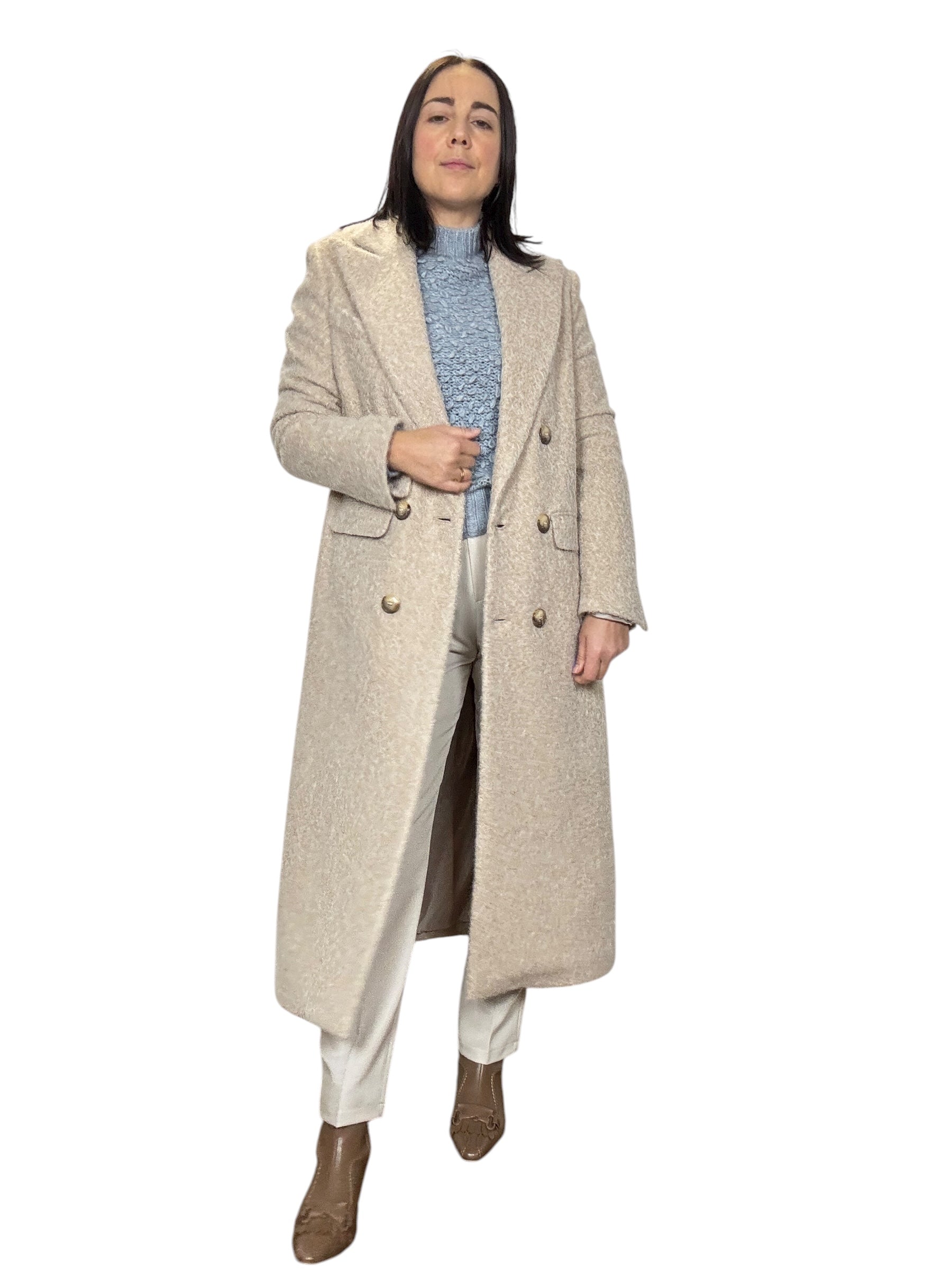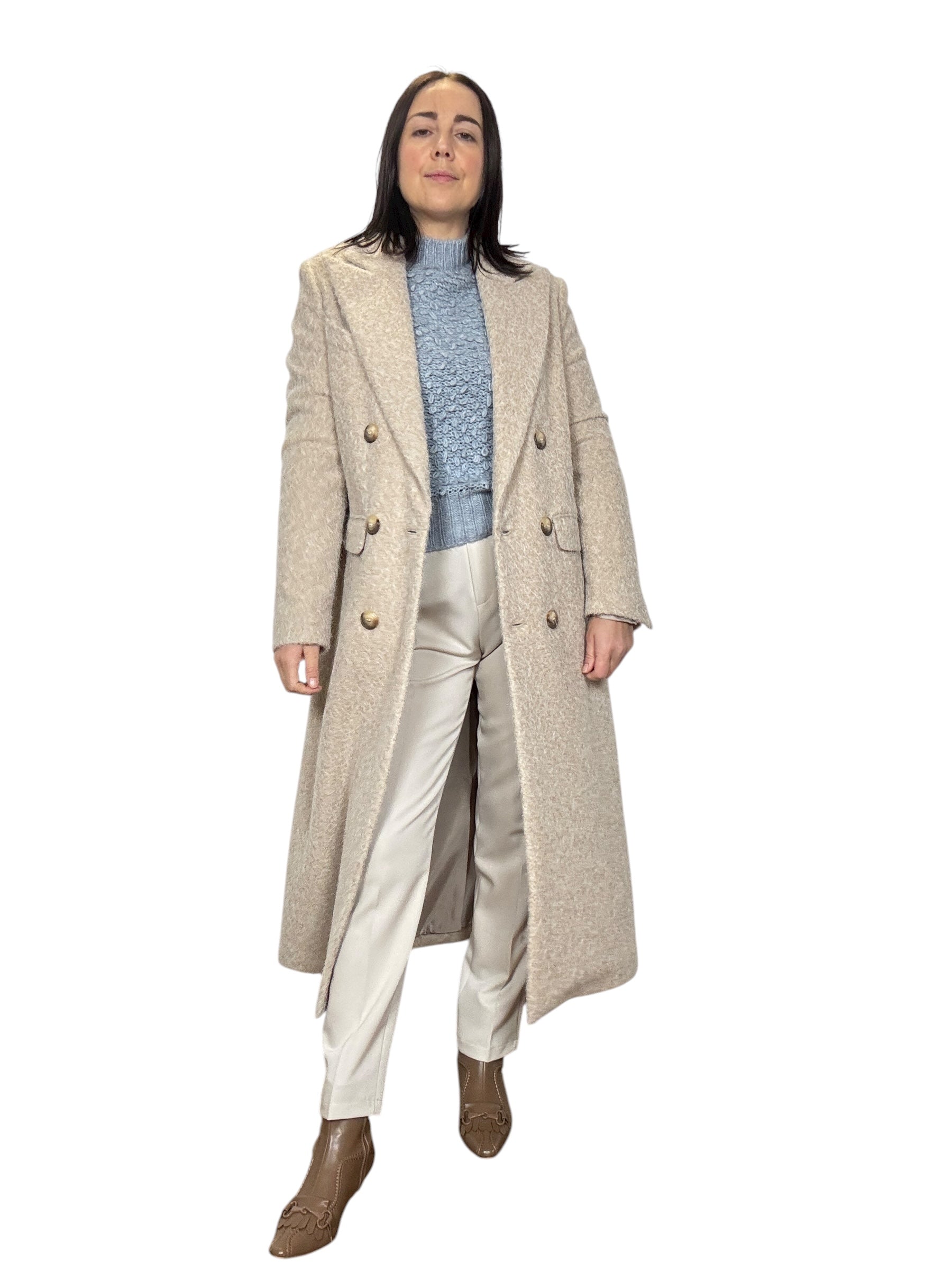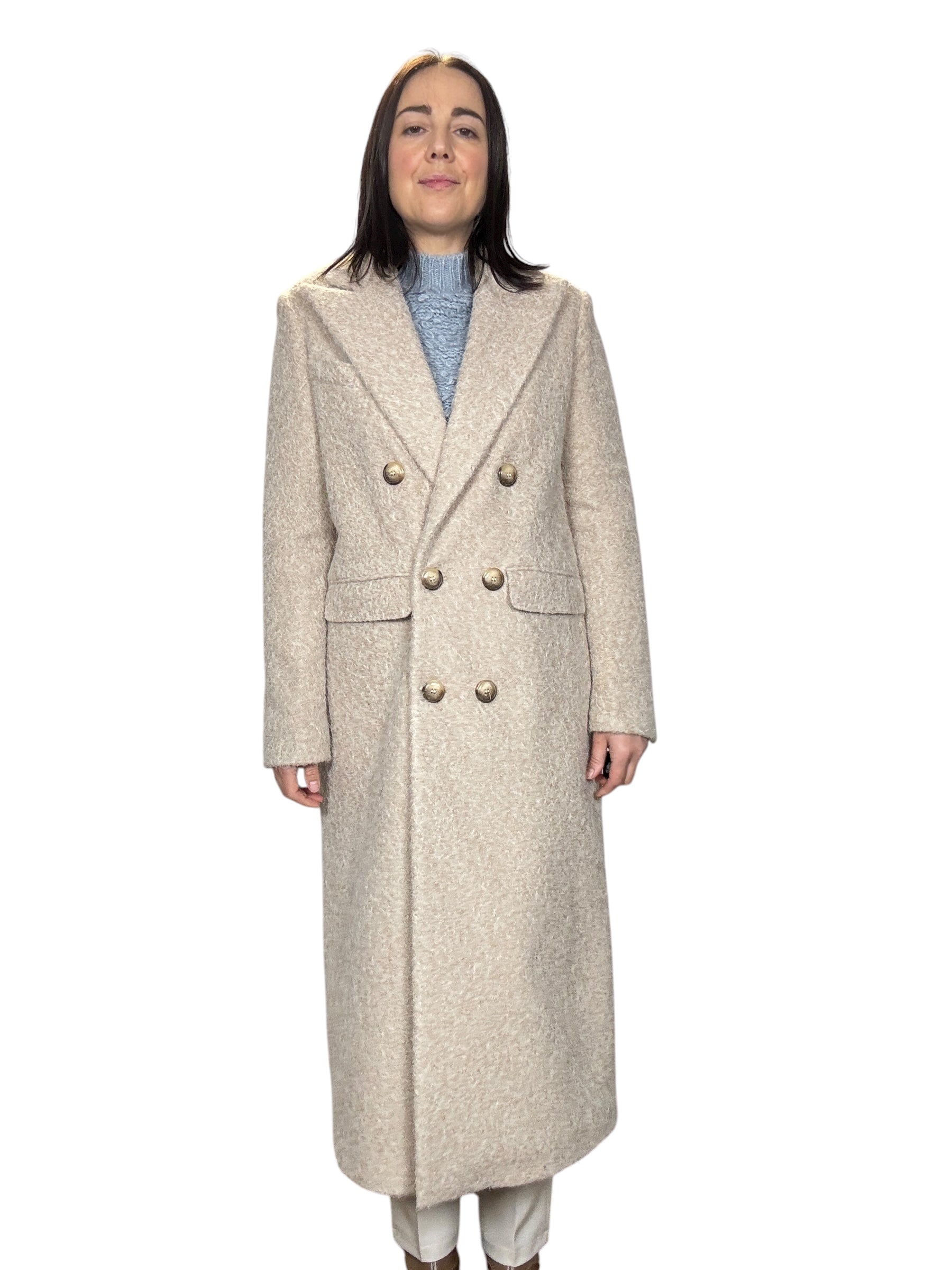 cappotto foderato con chiusura a doppiopetto e tasche laterali. Modello a ovetto ottima vestibilità (tg in foto S)