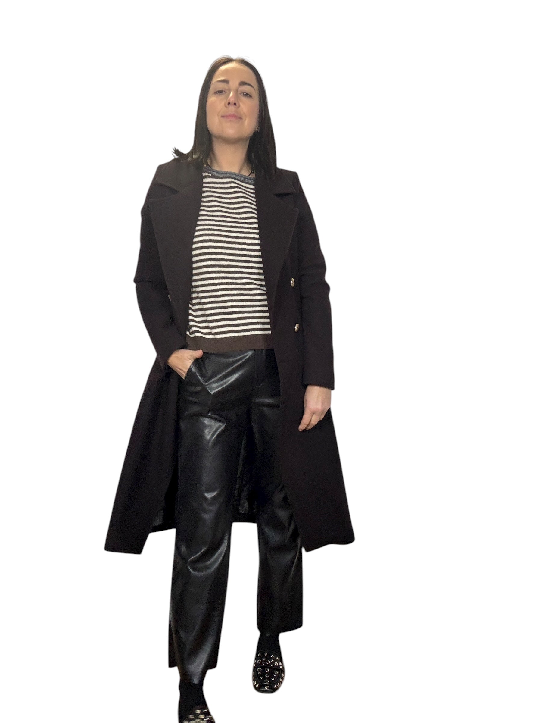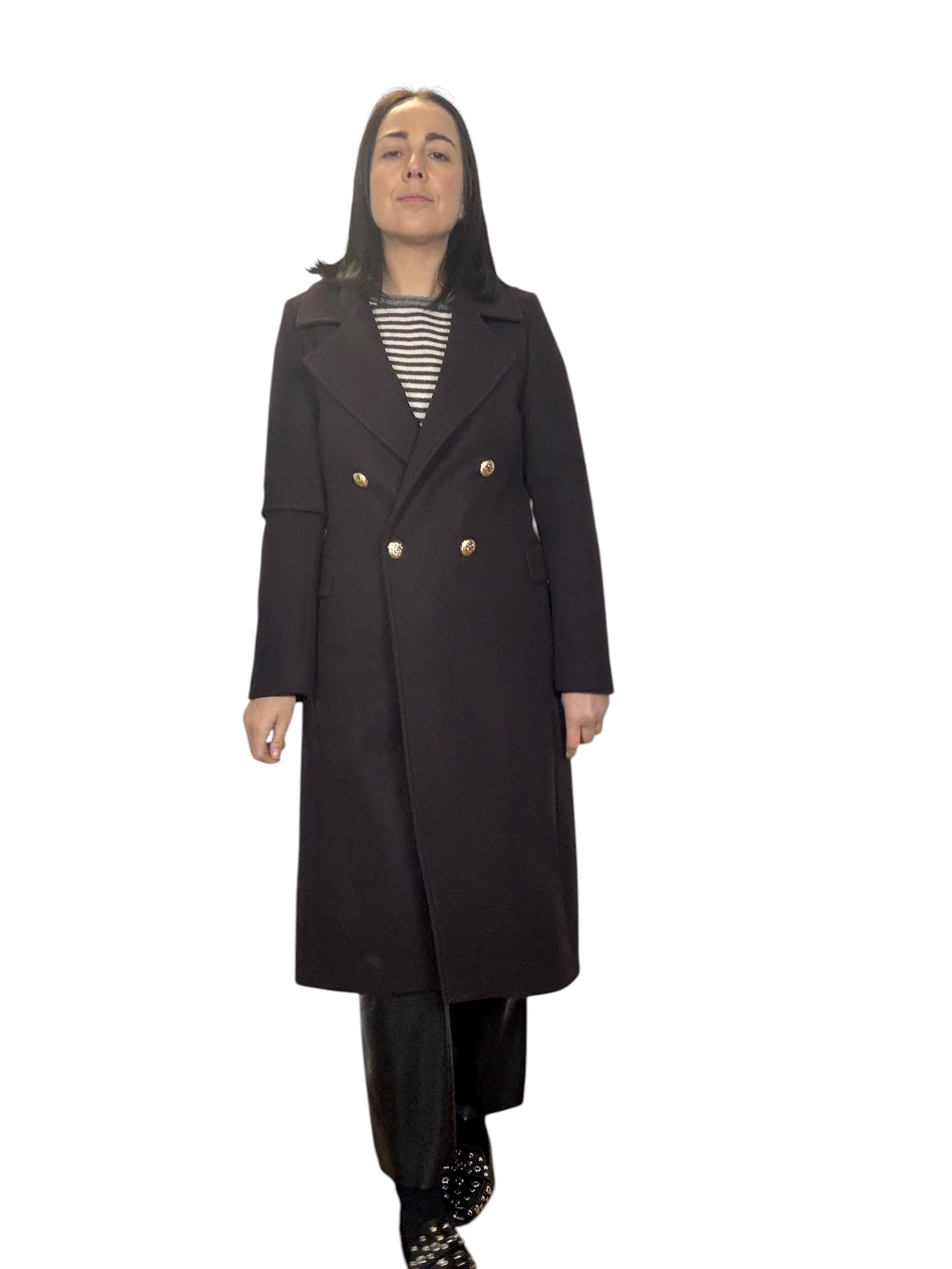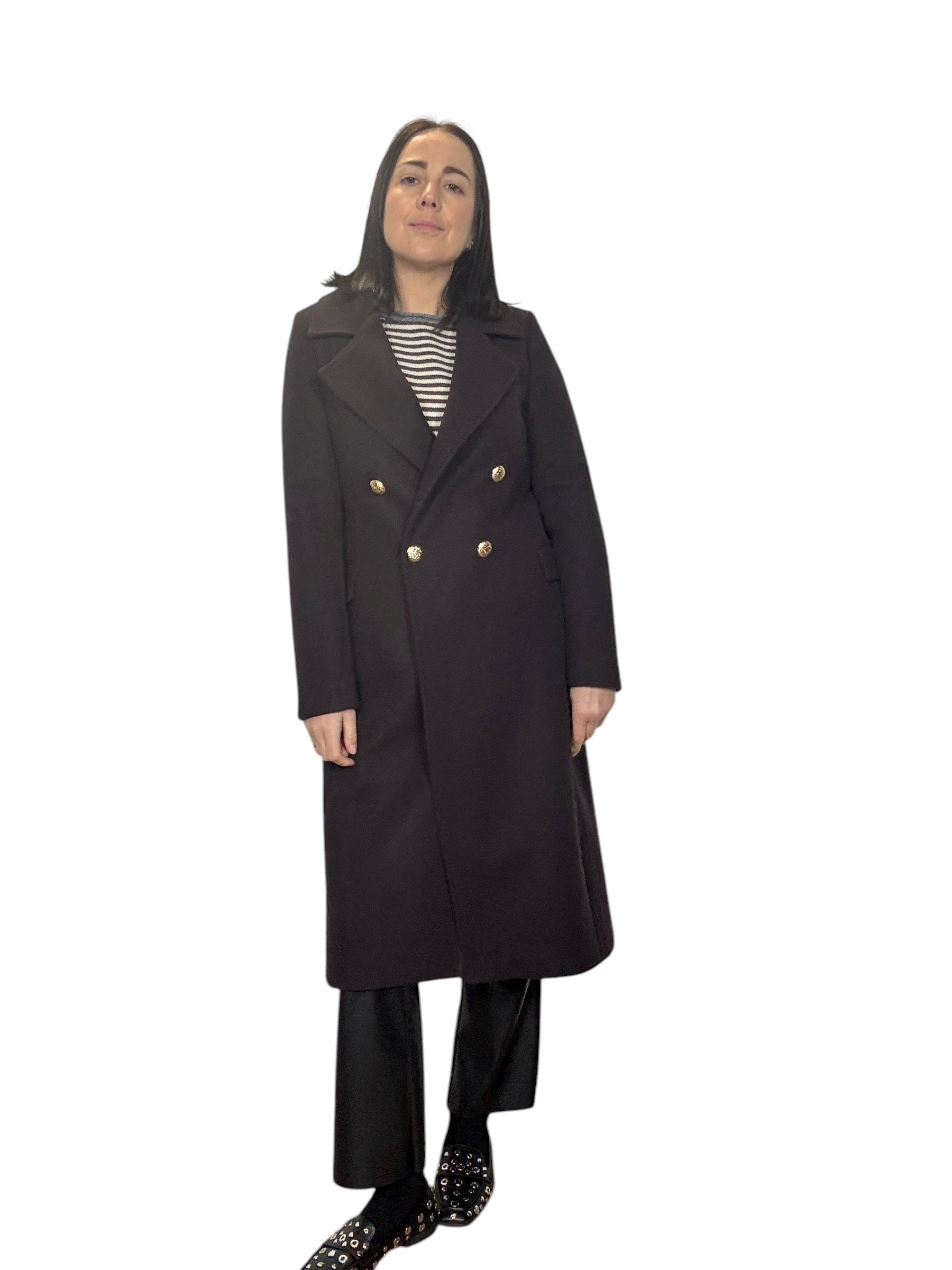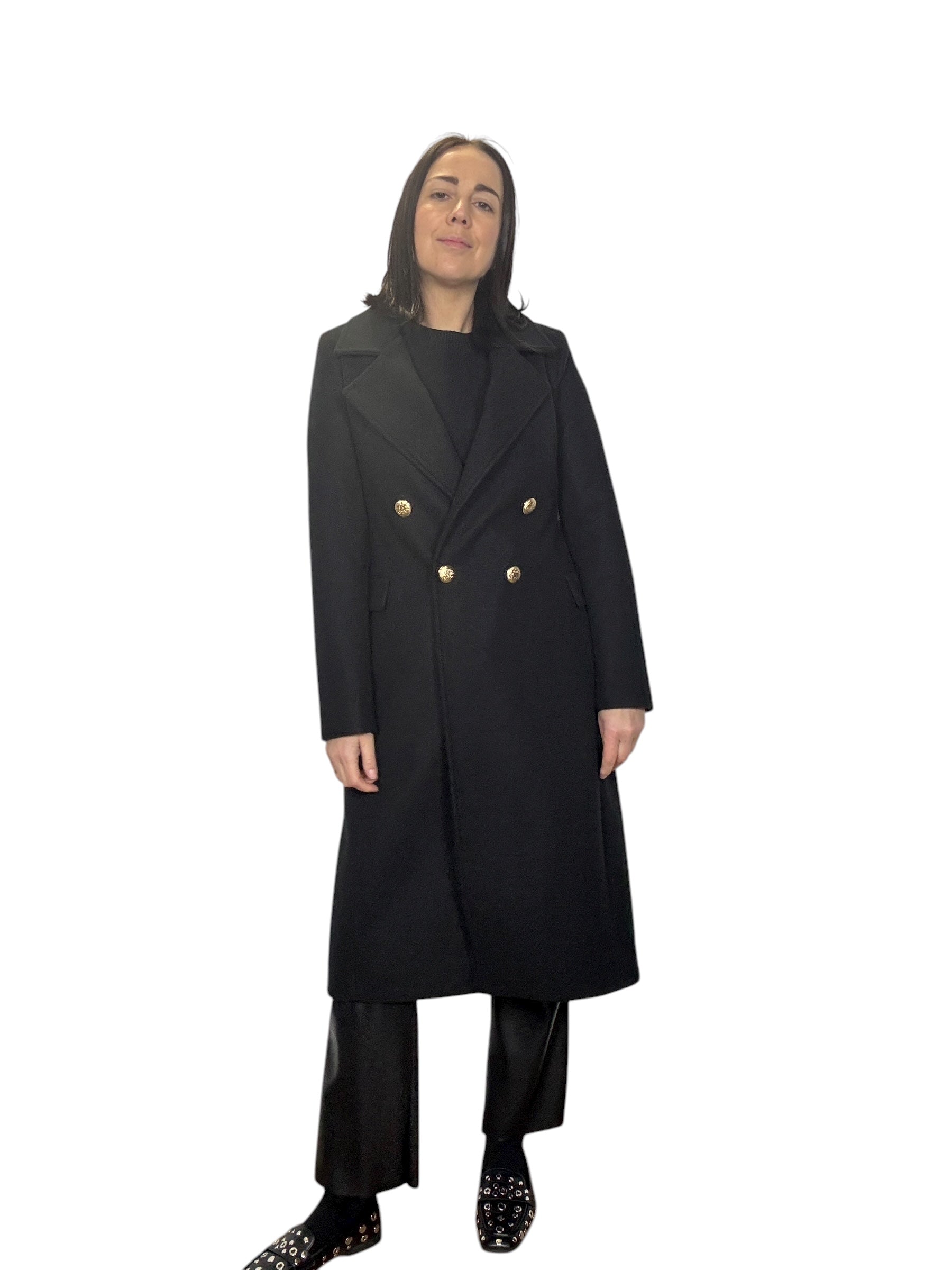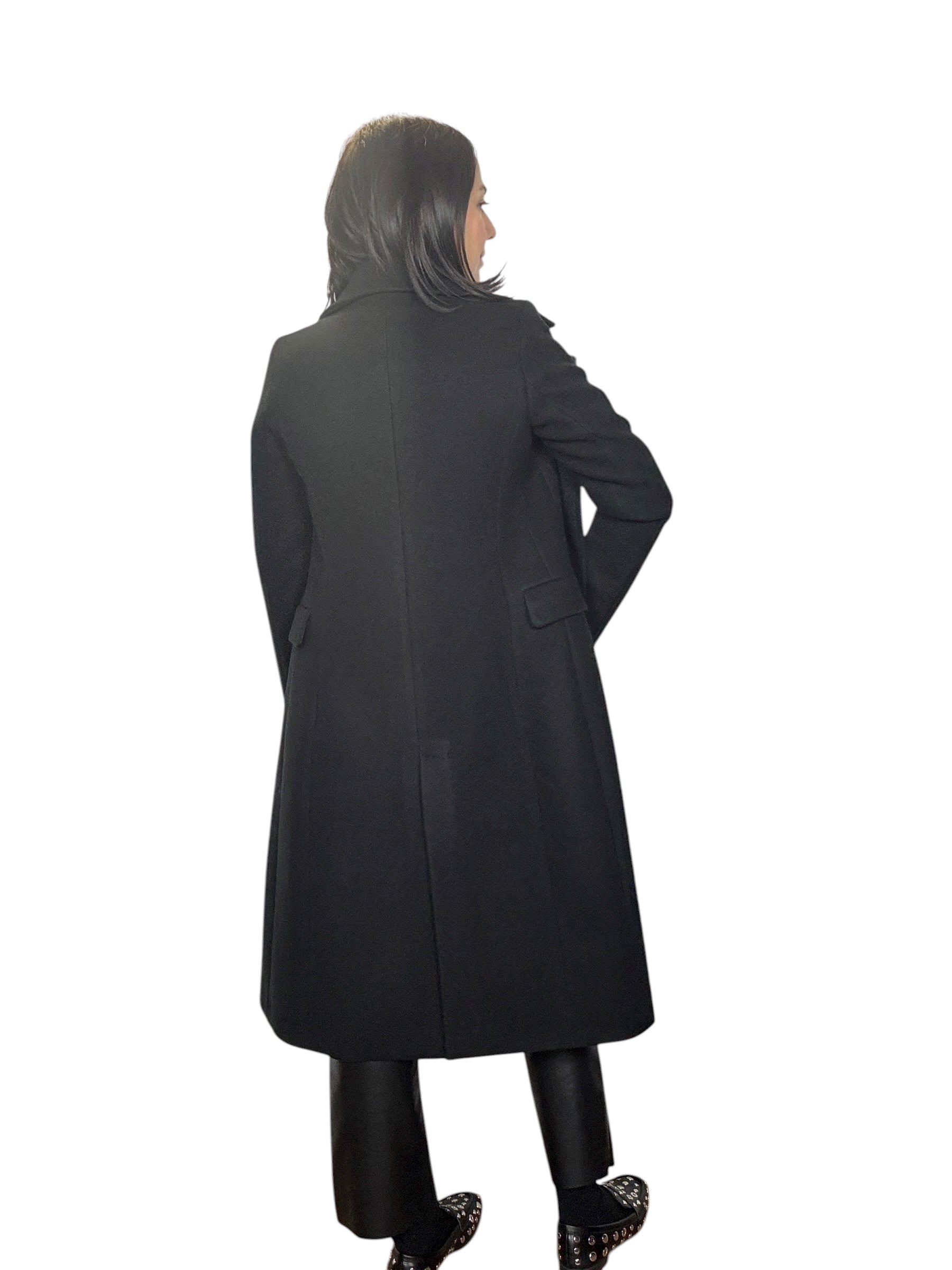 cappotto foderato con chiusura a sempiopetto, spacco dietro e taschine. Dettaglio bottoni dorati. Modello sfiancato ed elasticizzato (tg in foto S)