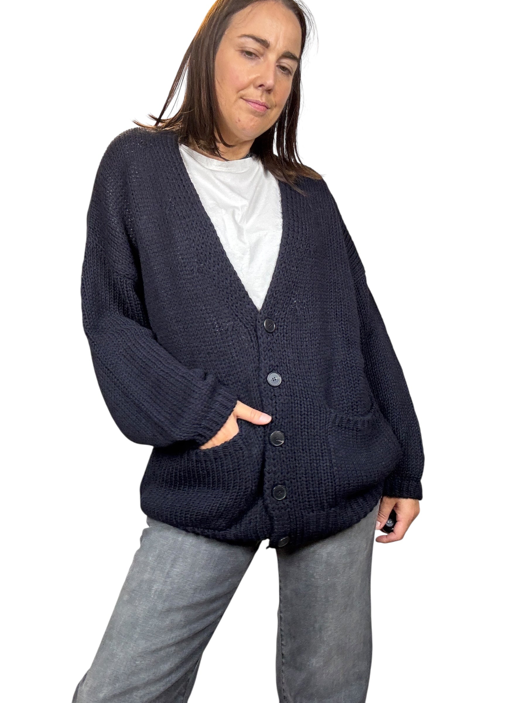 Cardigan abbottonato davanti con manica lunga a reglan e tasche. Modello oversize