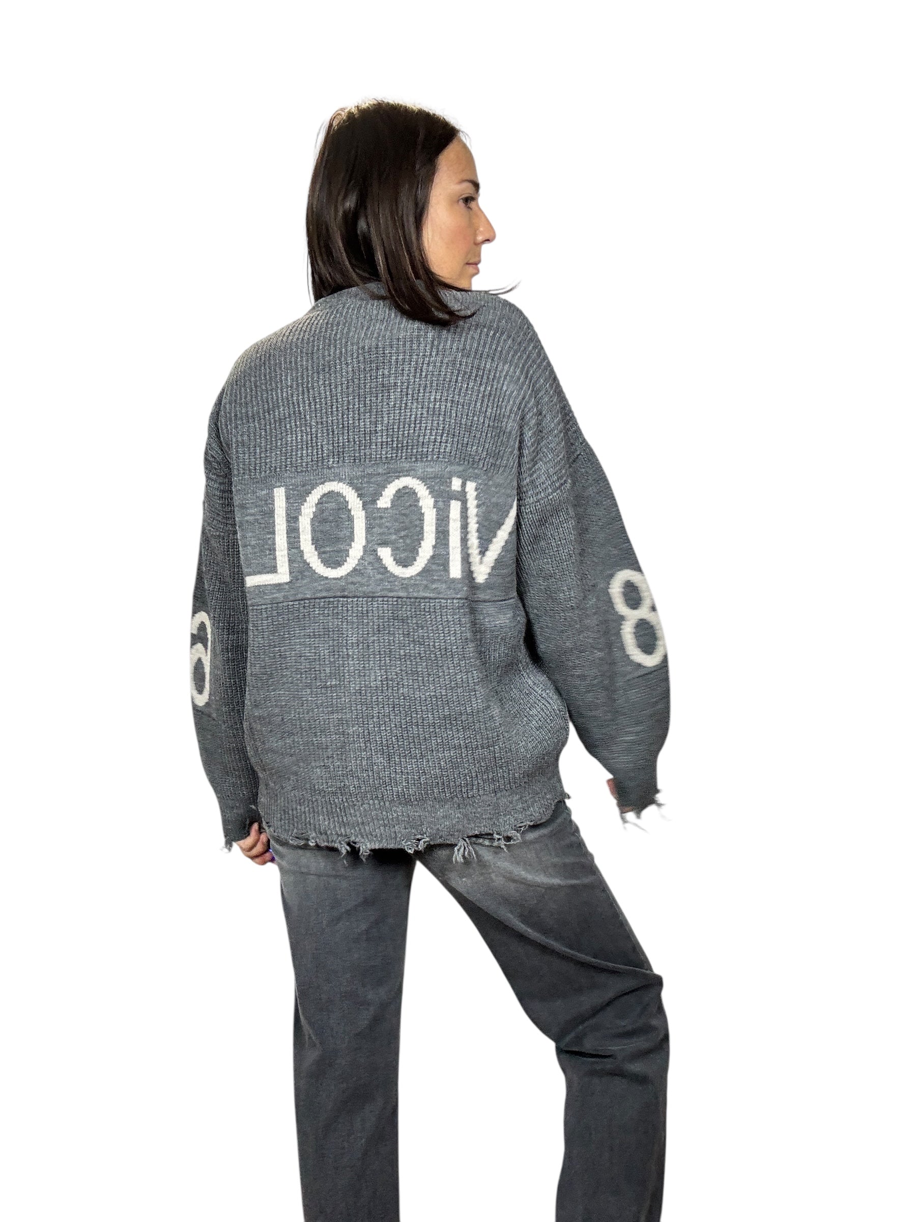 Cardigan oversize con bottoni davanti e piccole rotture sulle manicahe e sul fondo. Dettaglio logo vicolo sulla schiena