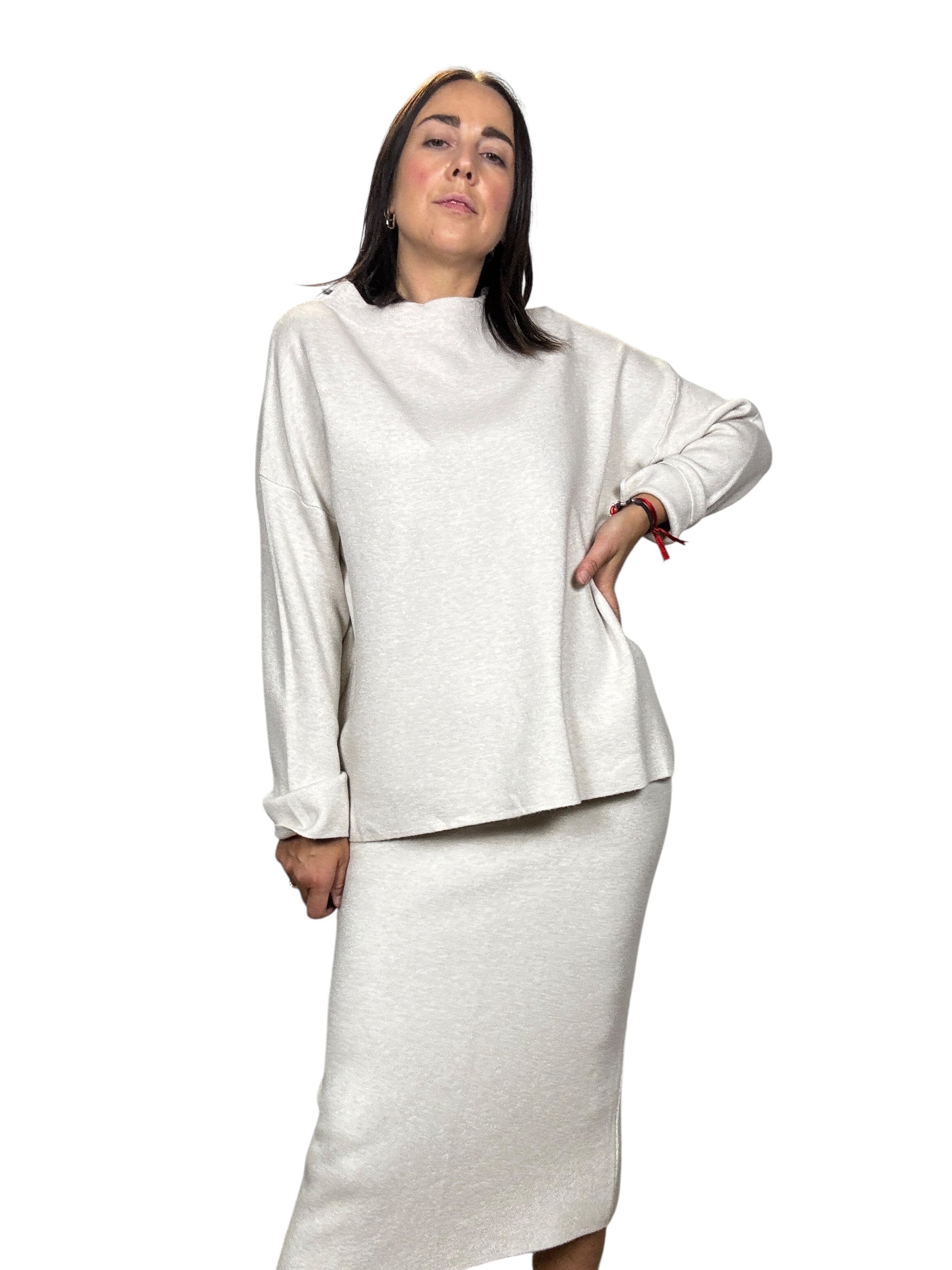 Maglia paricollo a manica lunga oversize, gonna a tubino a vita alta con elastico in cintura e spacco dietro. Elasticizzato