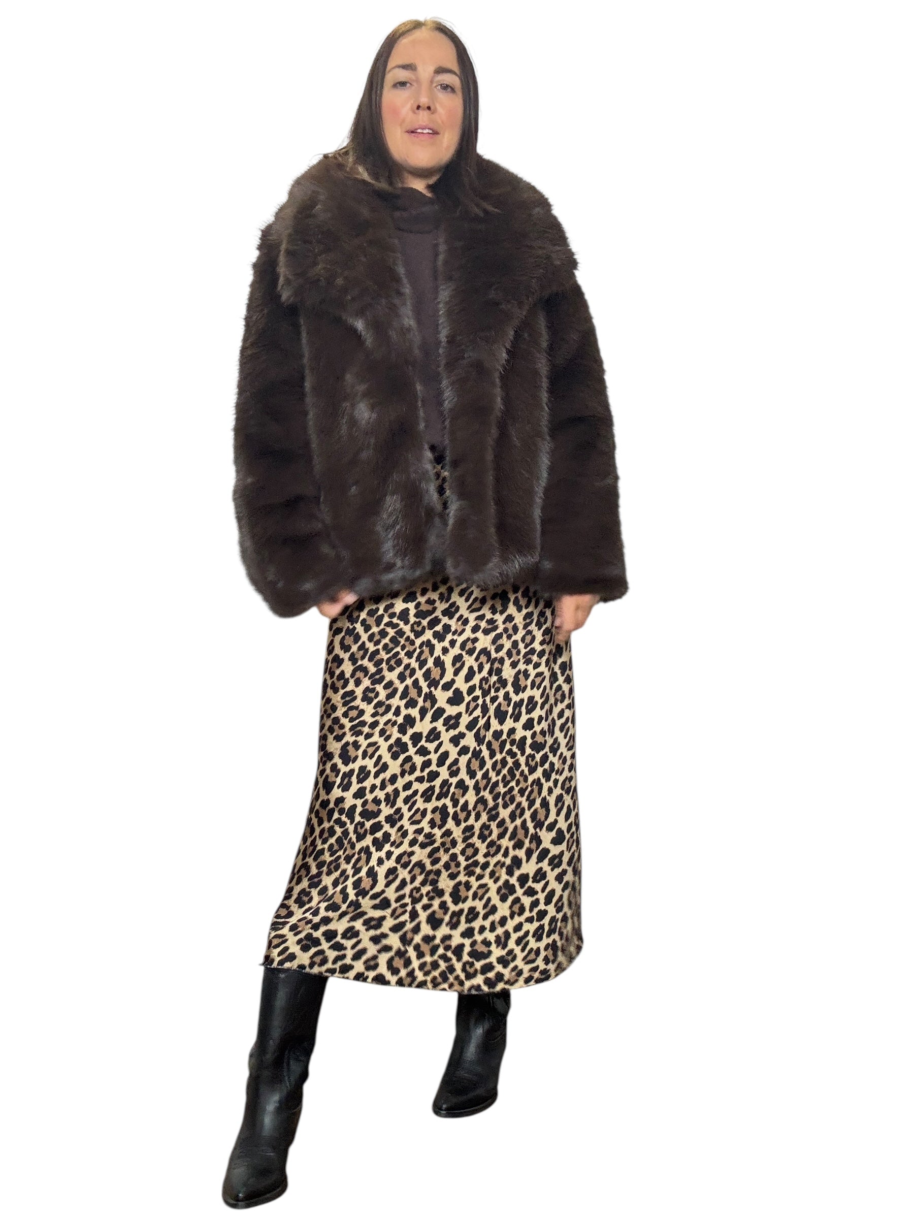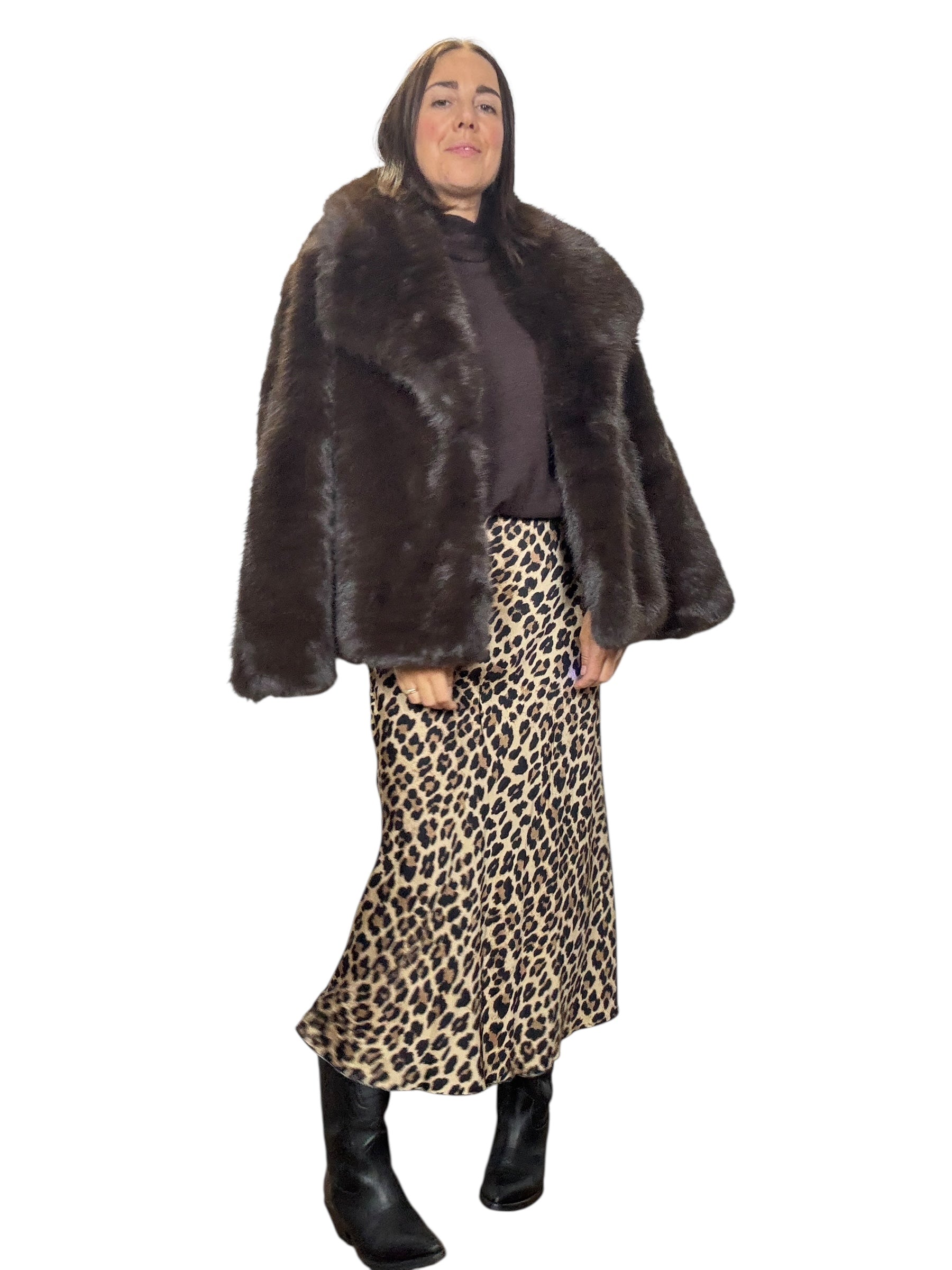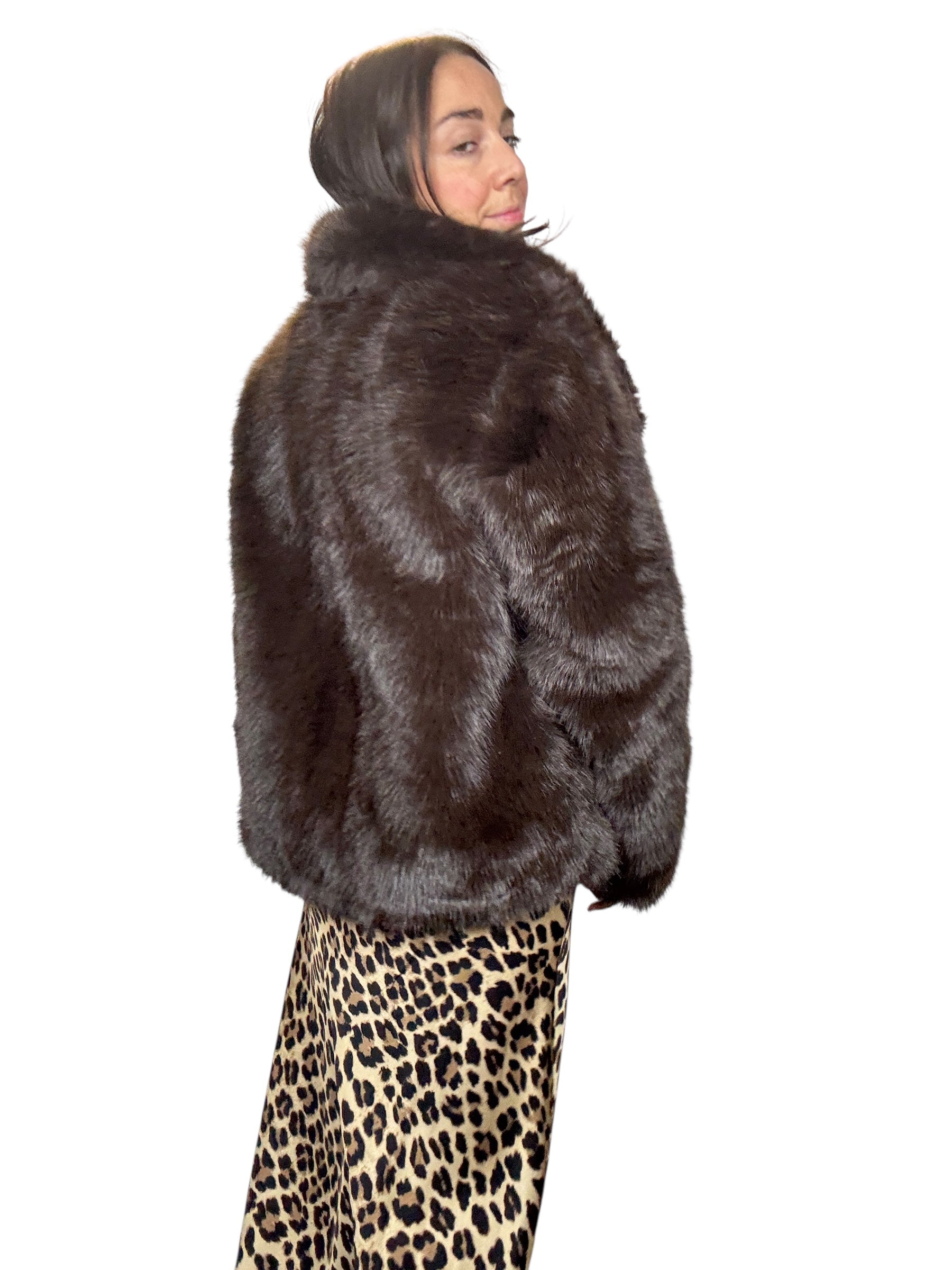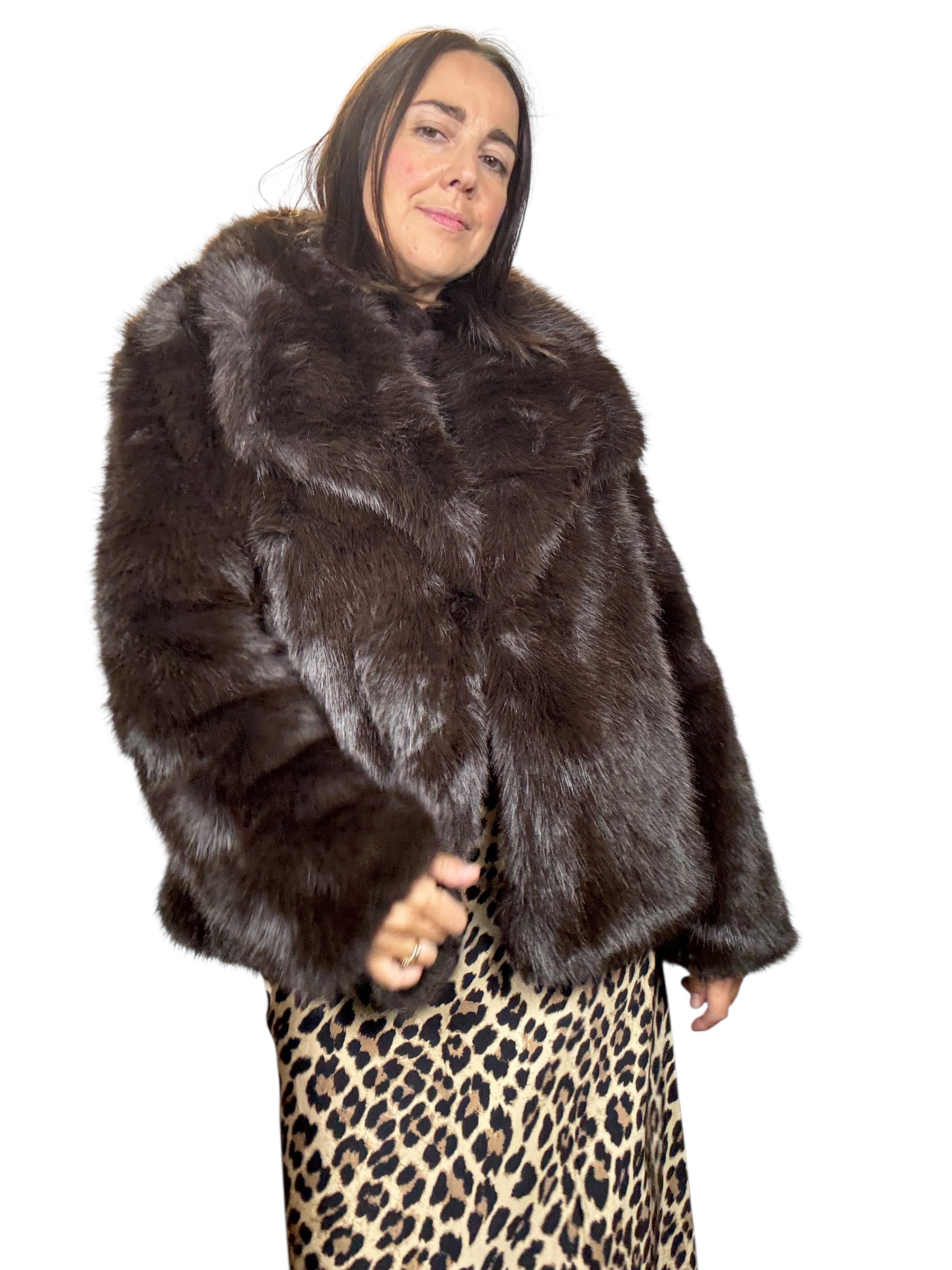 Pelliccia foderata con chiusura a gancetto e tasche laterali. Lunghezza in cintura aderente morbida