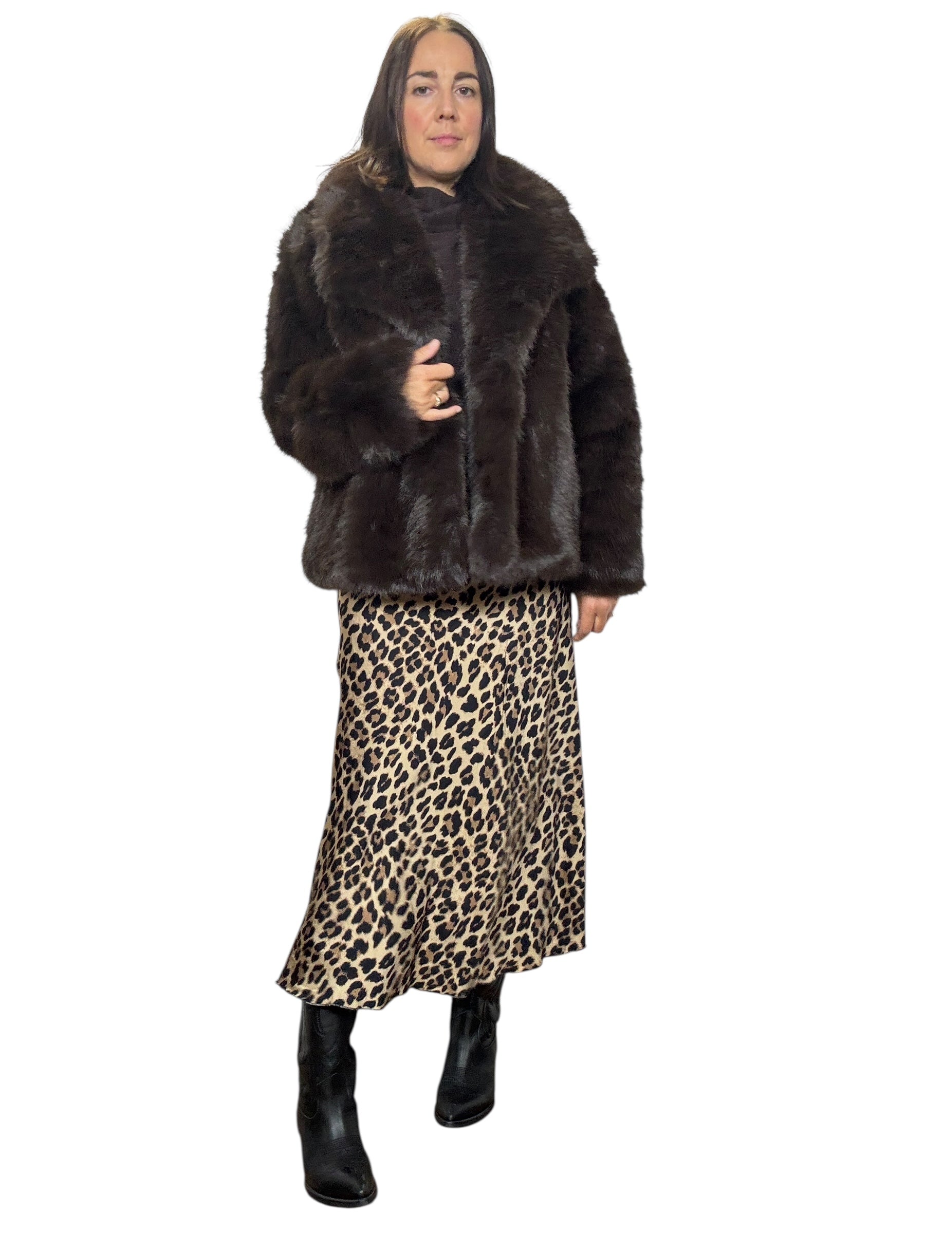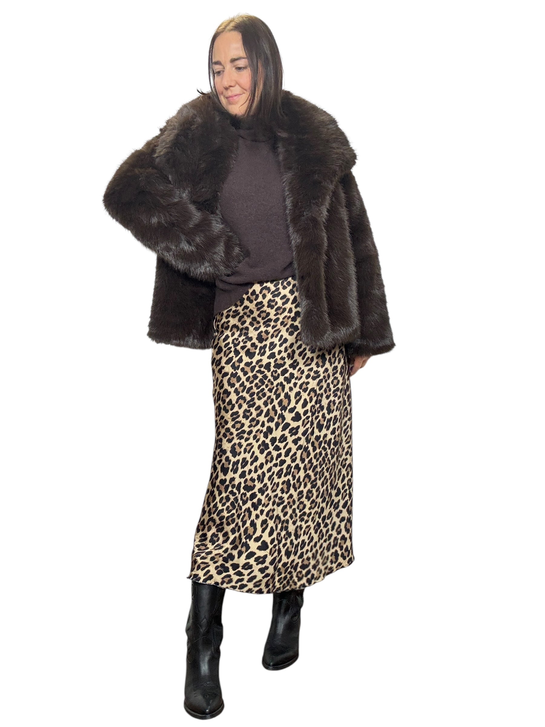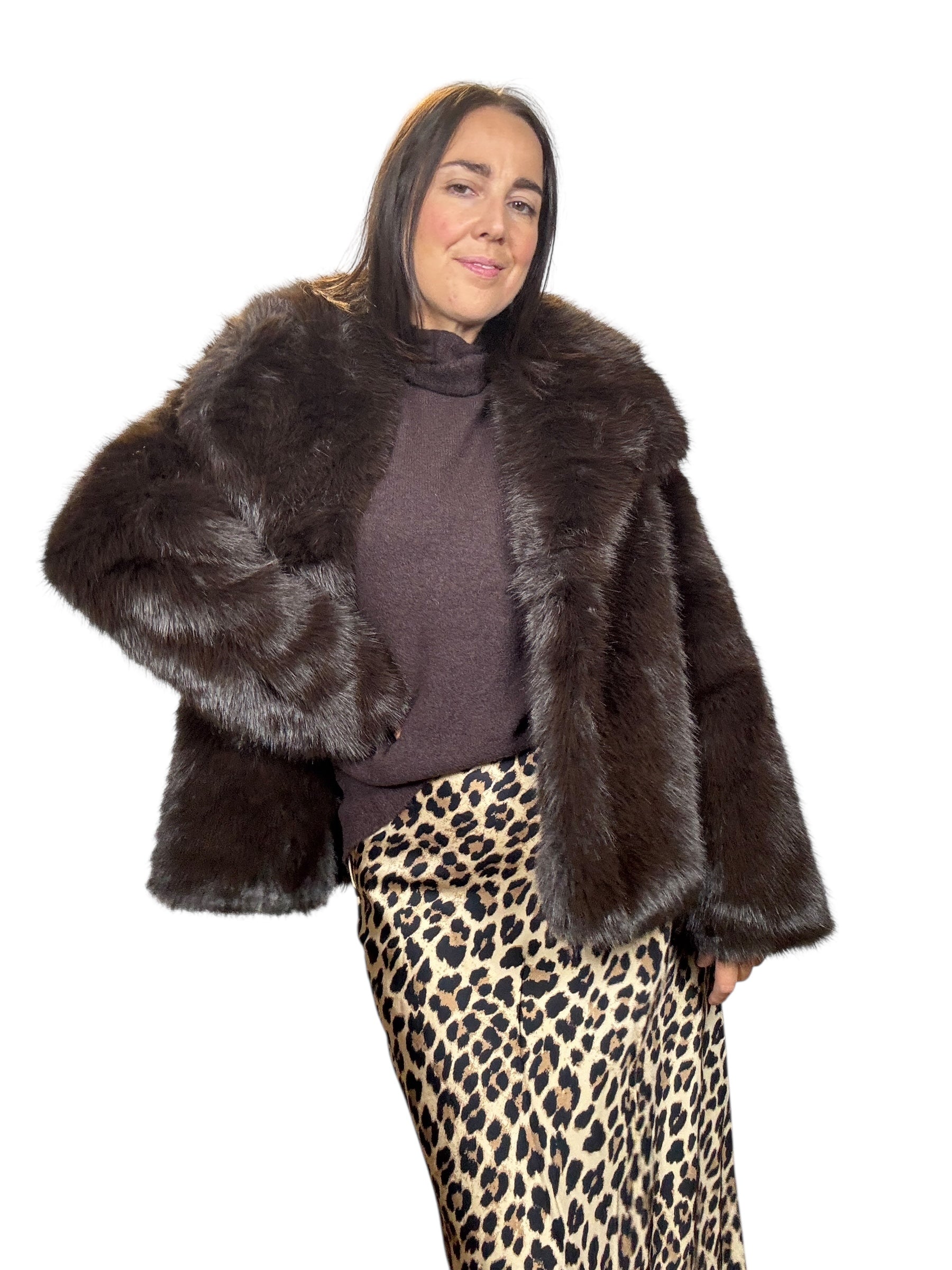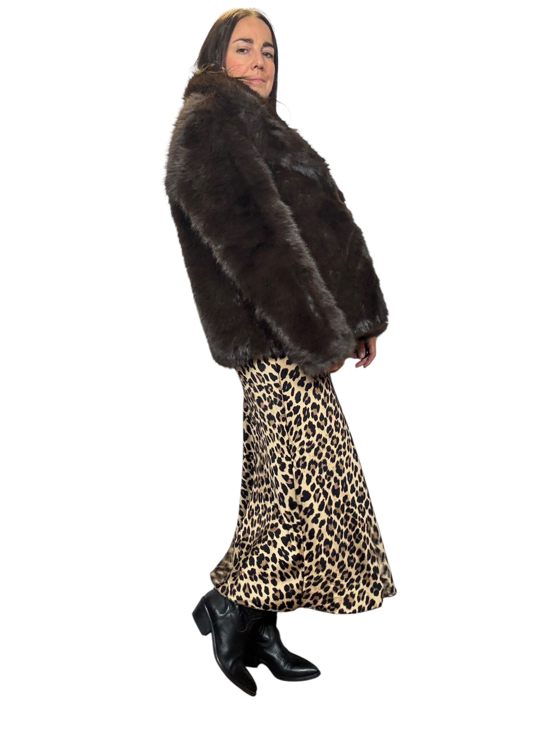 Pelliccia foderata con chiusura a gancetto e tasche laterali. Lunghezza in cintura aderente morbida