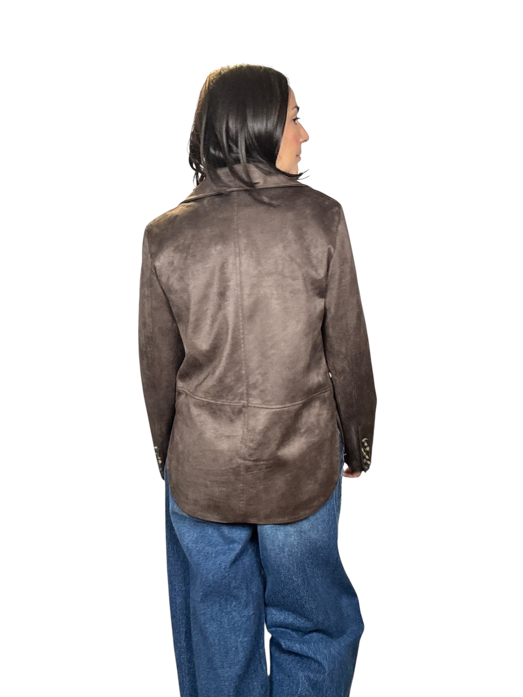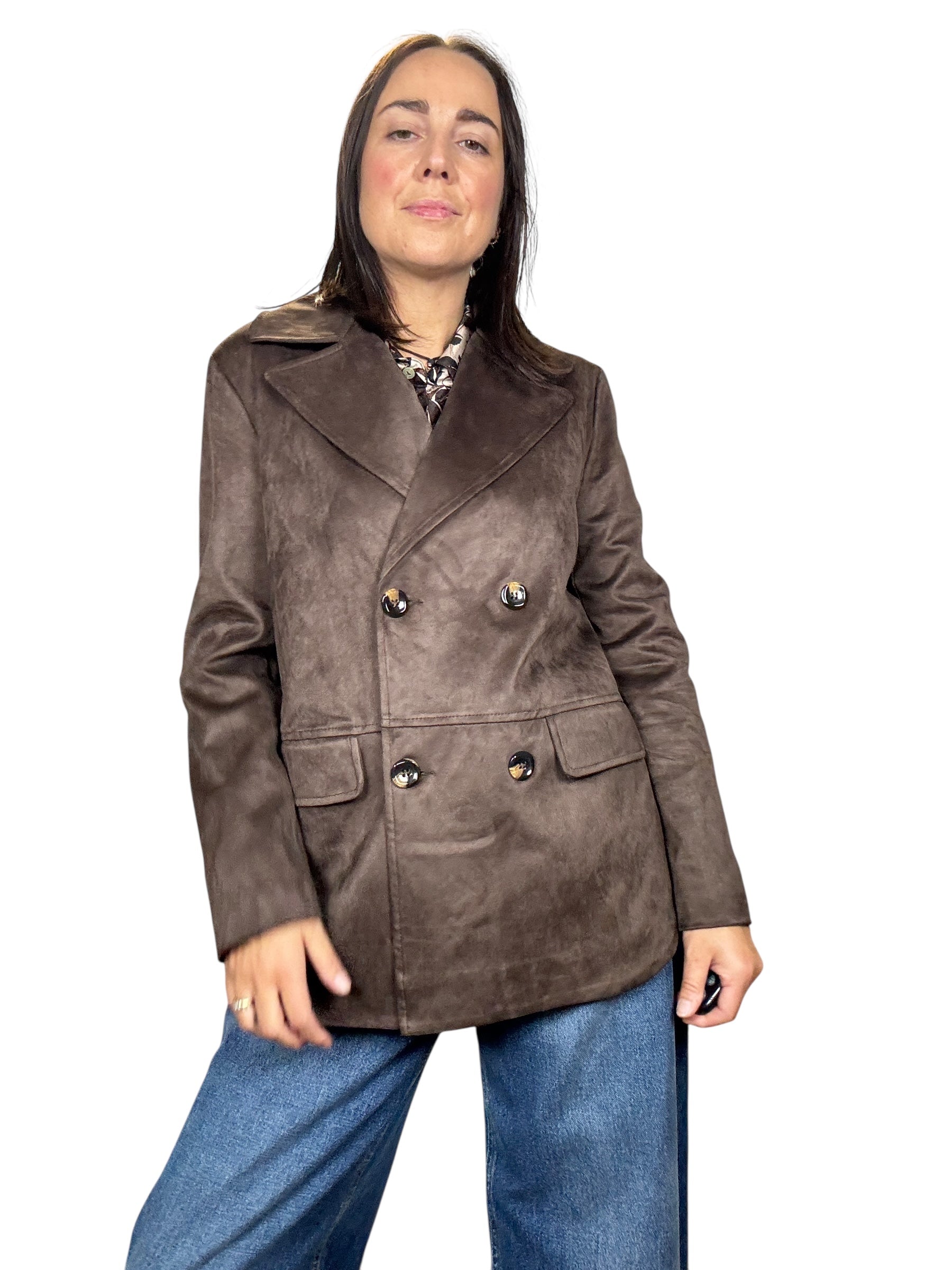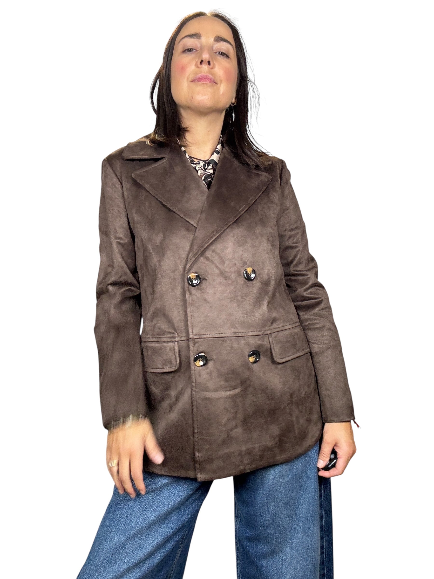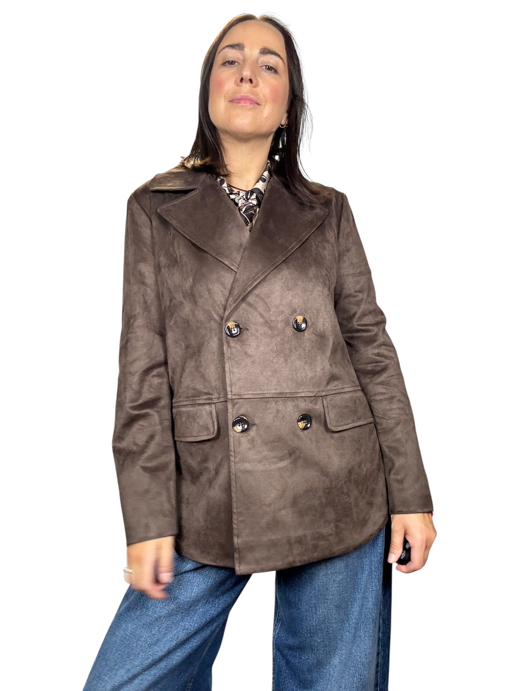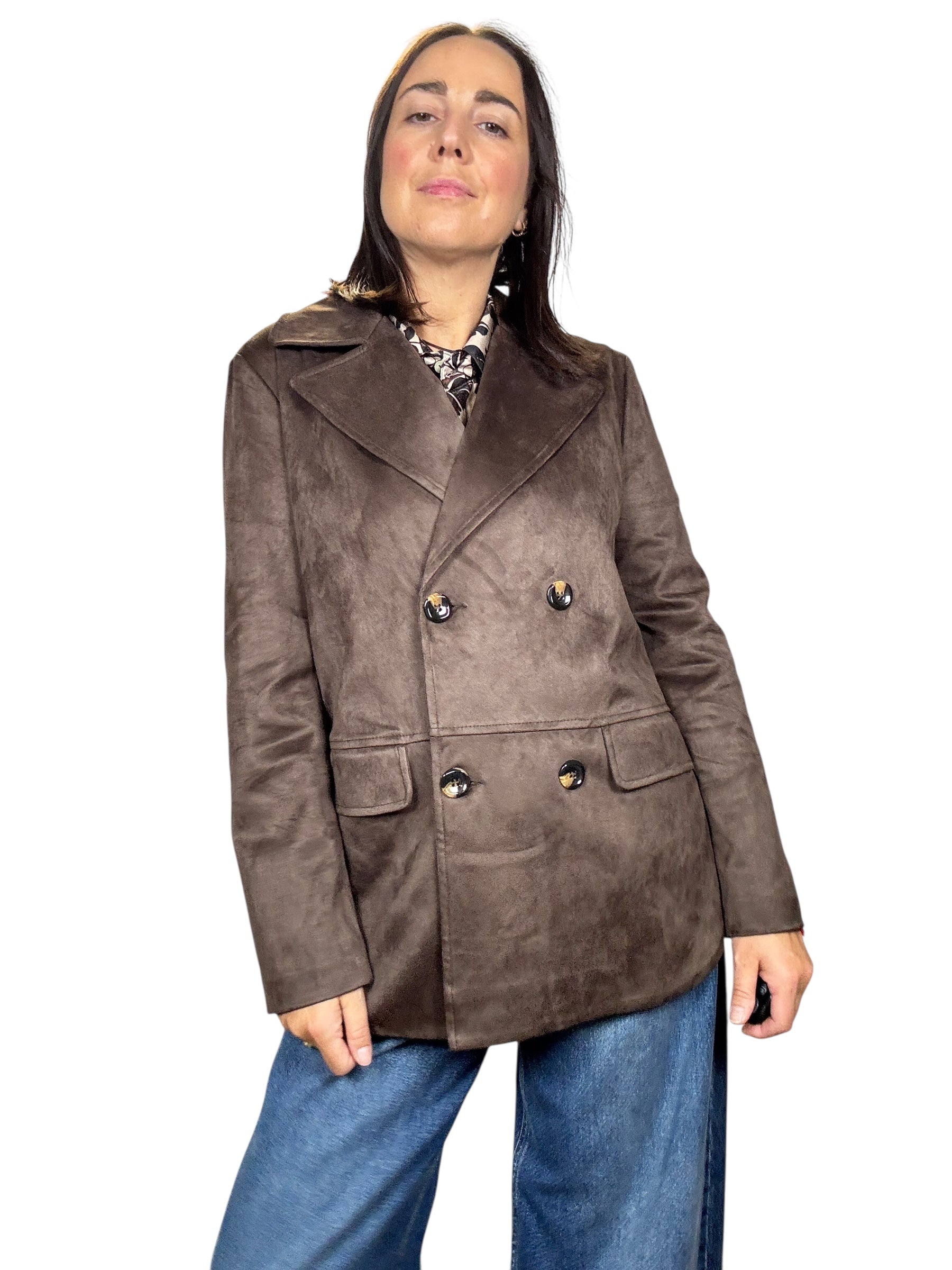 Giacca foderata a doppiopetto in ecodainetto con finte tasche con pattina. Modello stondato con spacchi ai lati. Tessuto elasticizzato (tg in foto S)