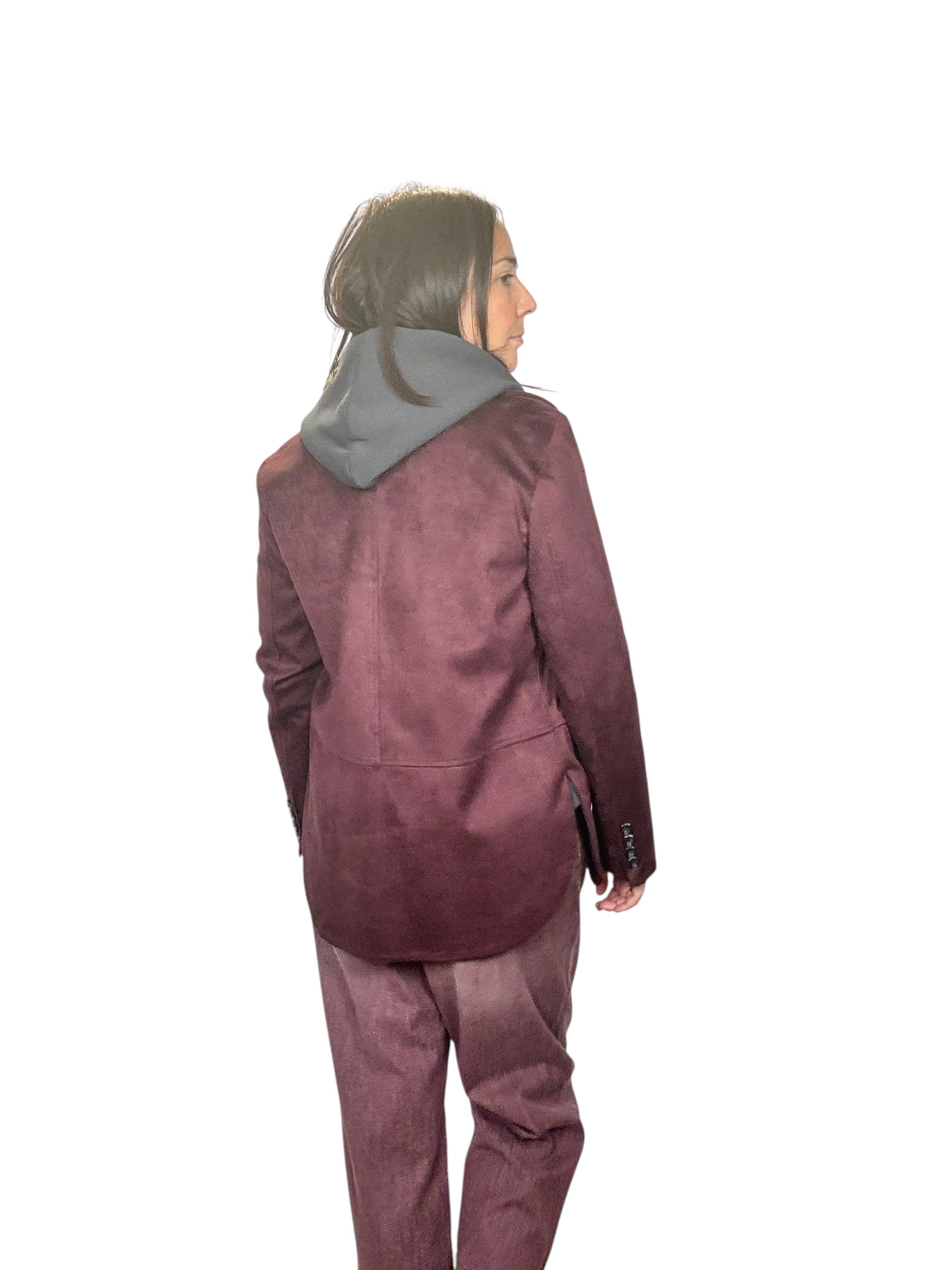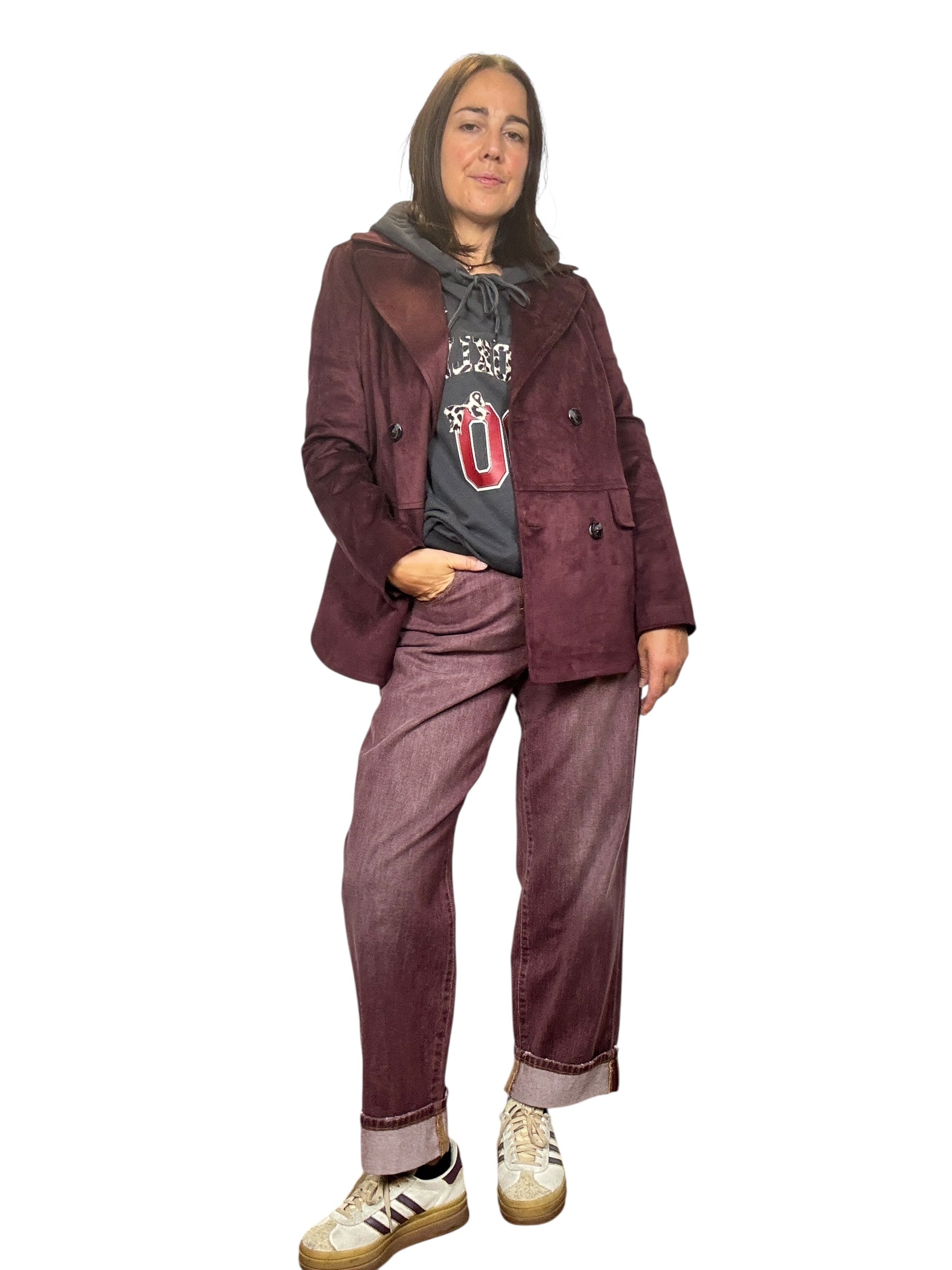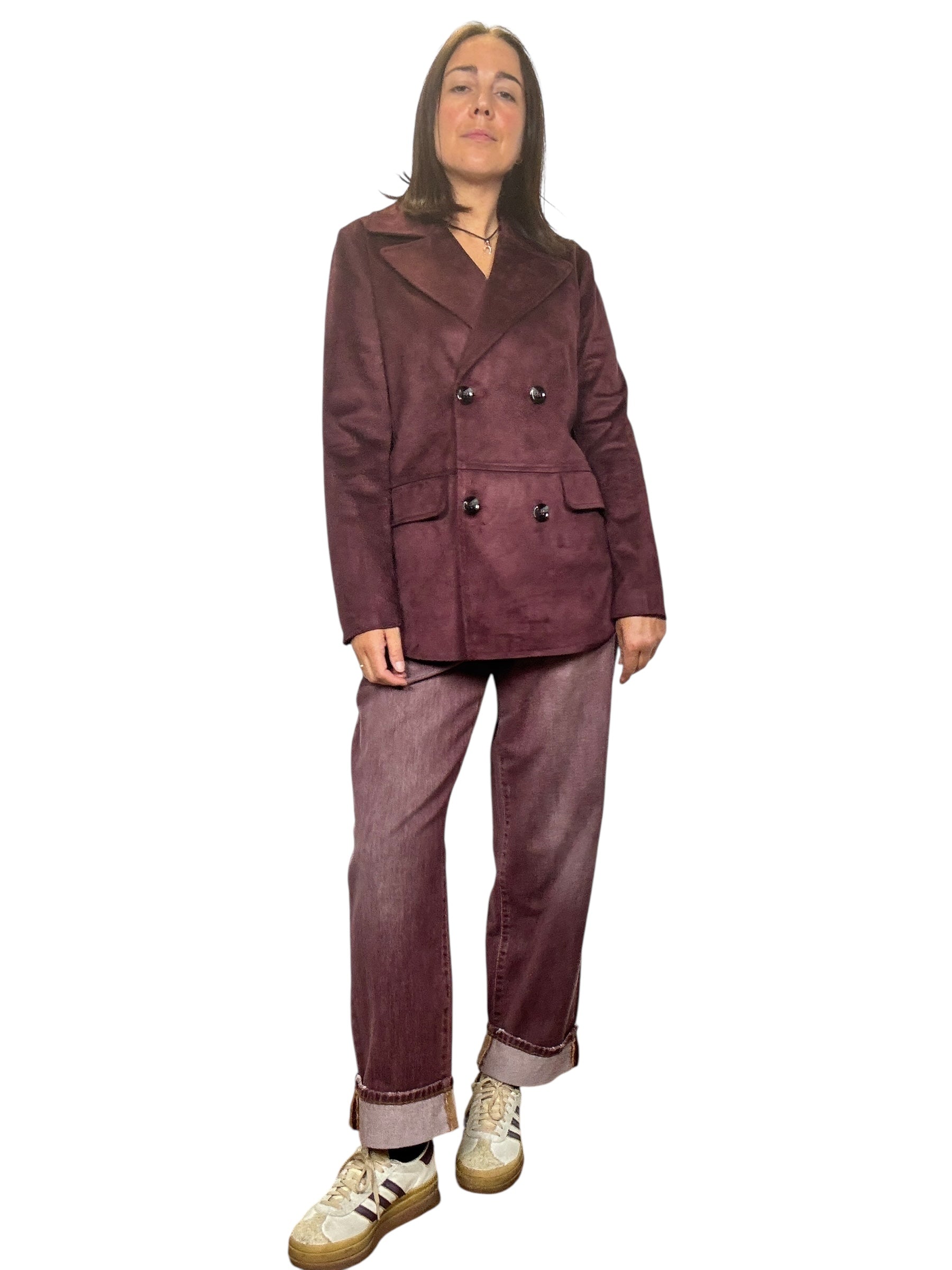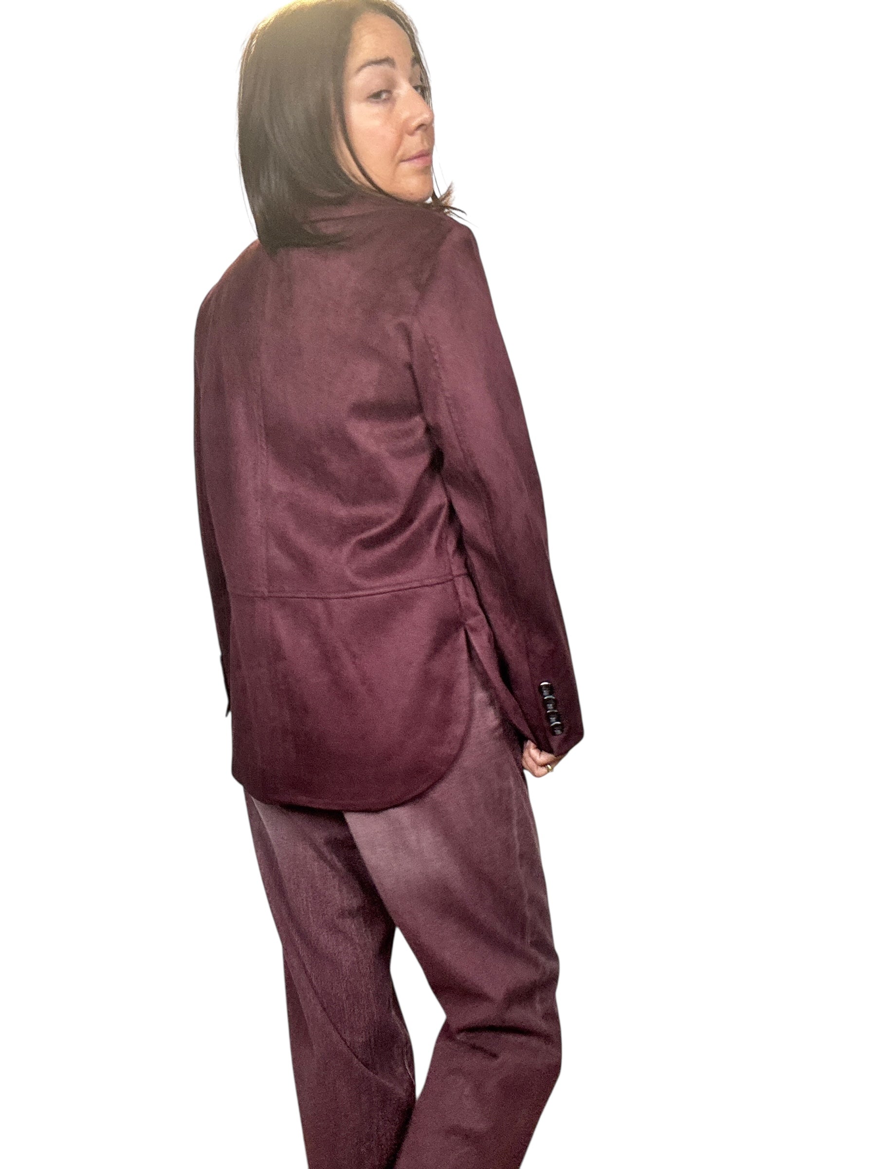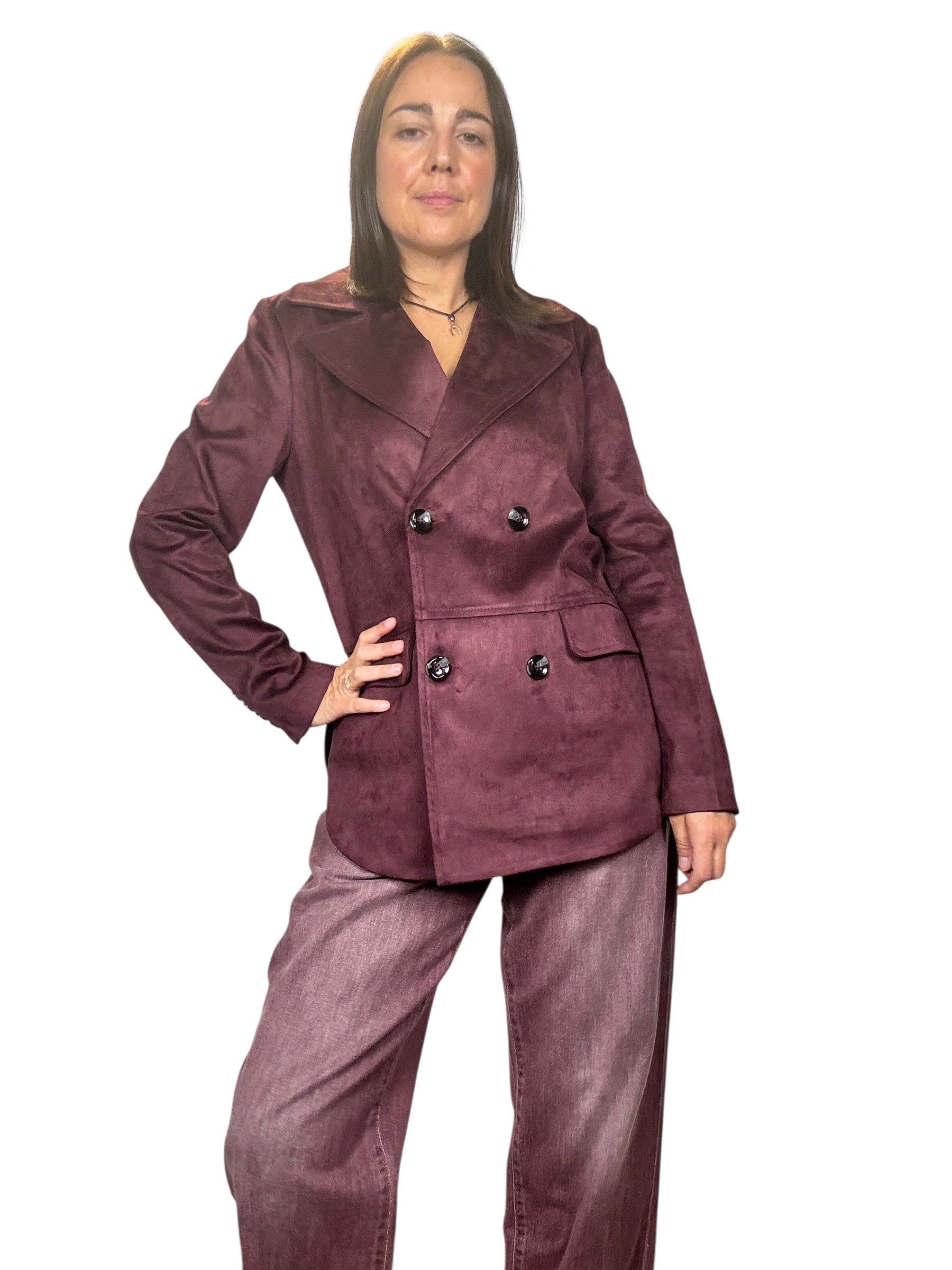Giacca foderata a doppiopetto in ecodainetto con finte tasche con pattina. Modello stondato con spacchi ai lati. Tessuto elasticizzato (tg in foto S)
