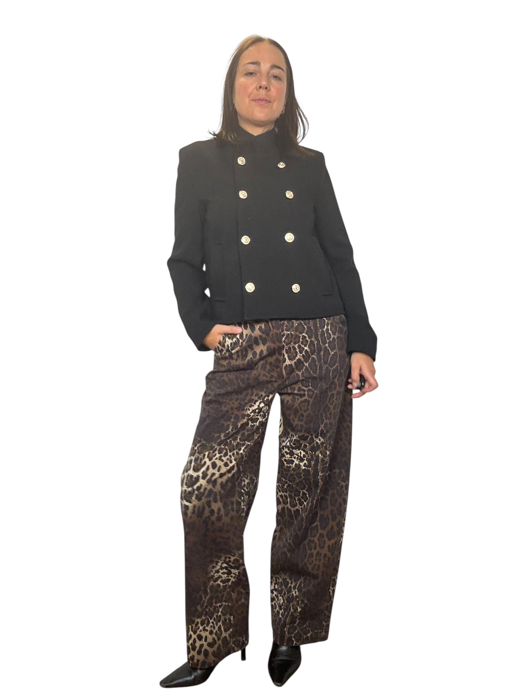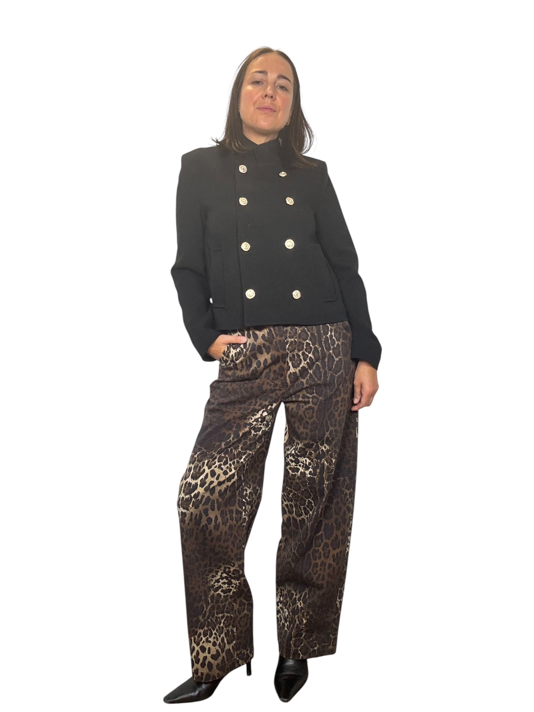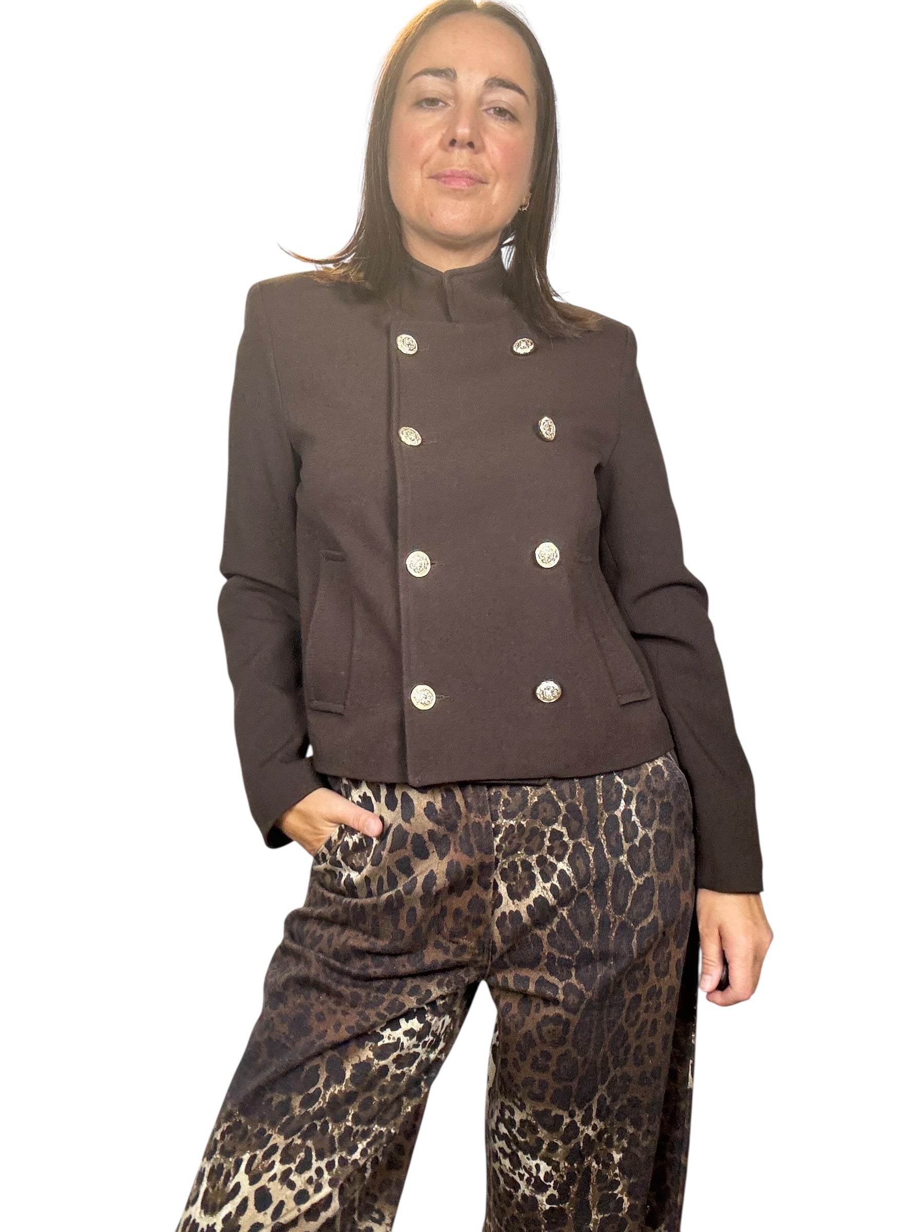 Giacca foderata a manica lunga con collo a coreana , chiusura a doppiopetto e tasche laterali. Modello leggermente svasato, lunghezza in cintura (tg in foto S) Elasticizzata