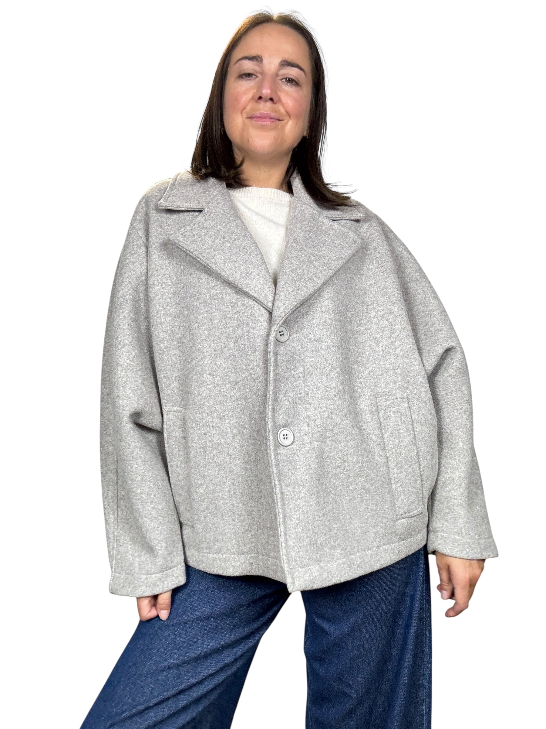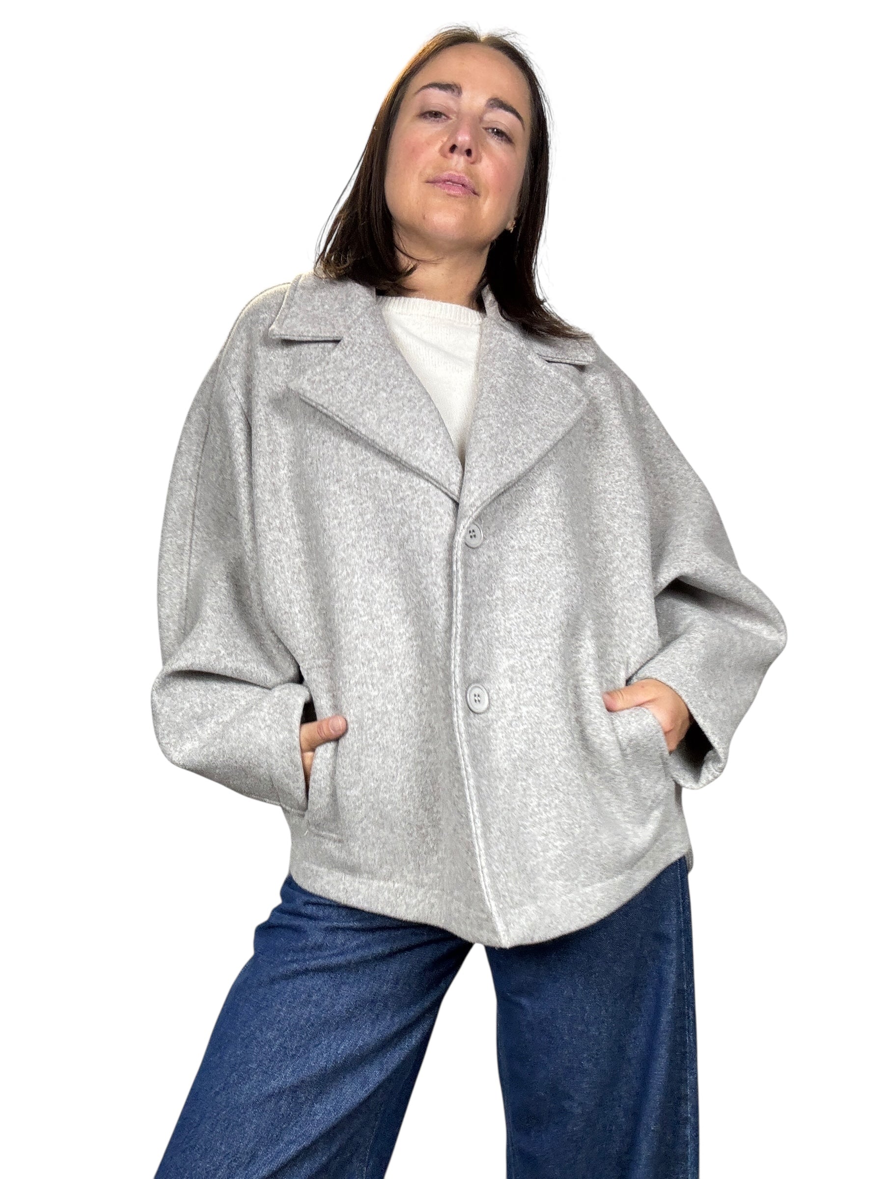Giacca sfoderata con doppio bottone e tasche laterali. Modello con manica ampia, fit oversize