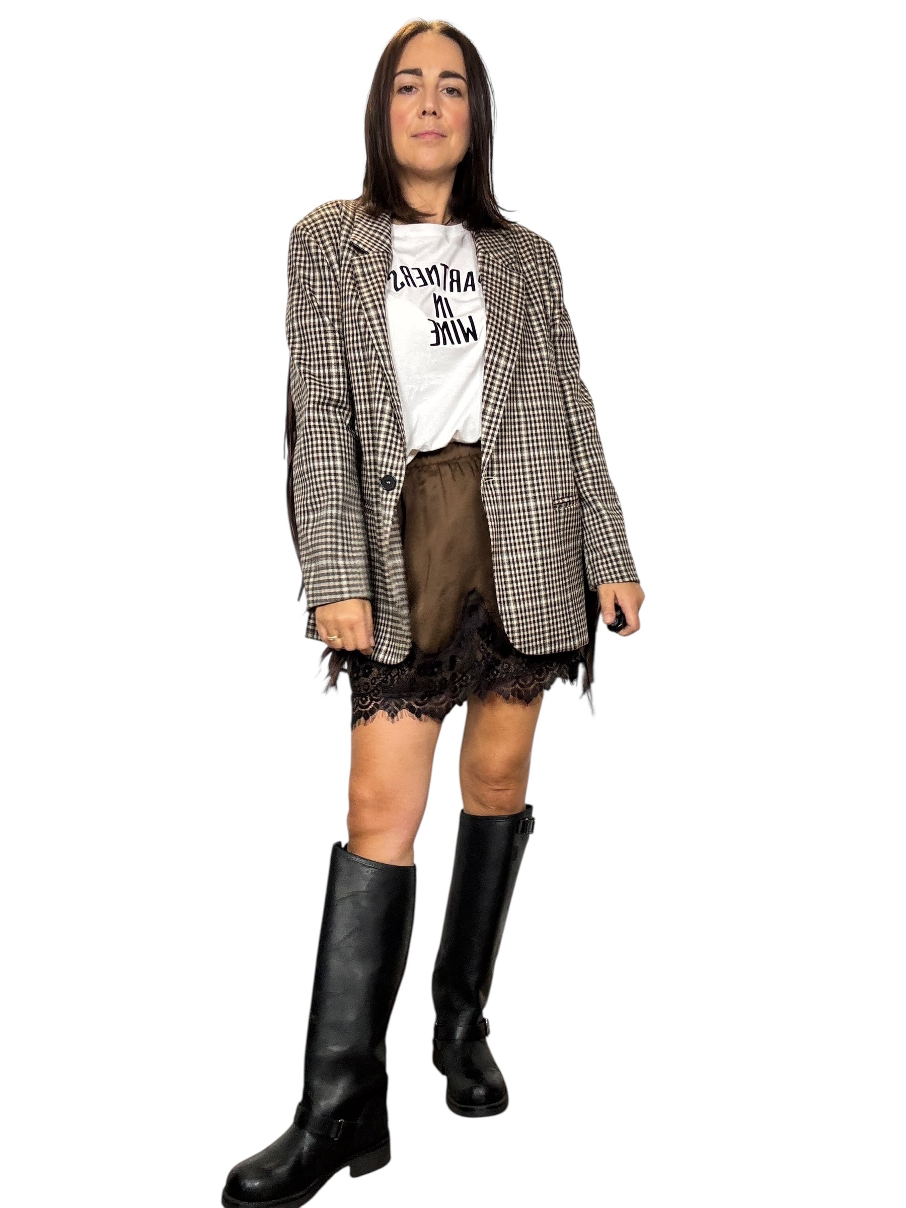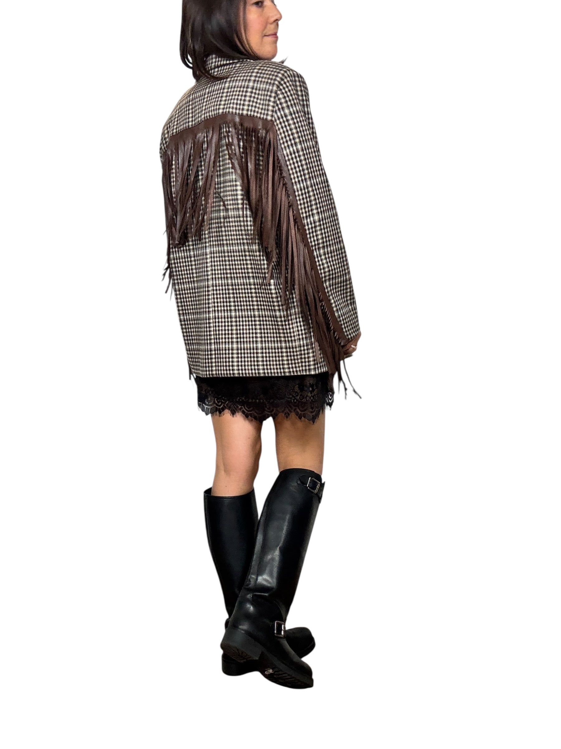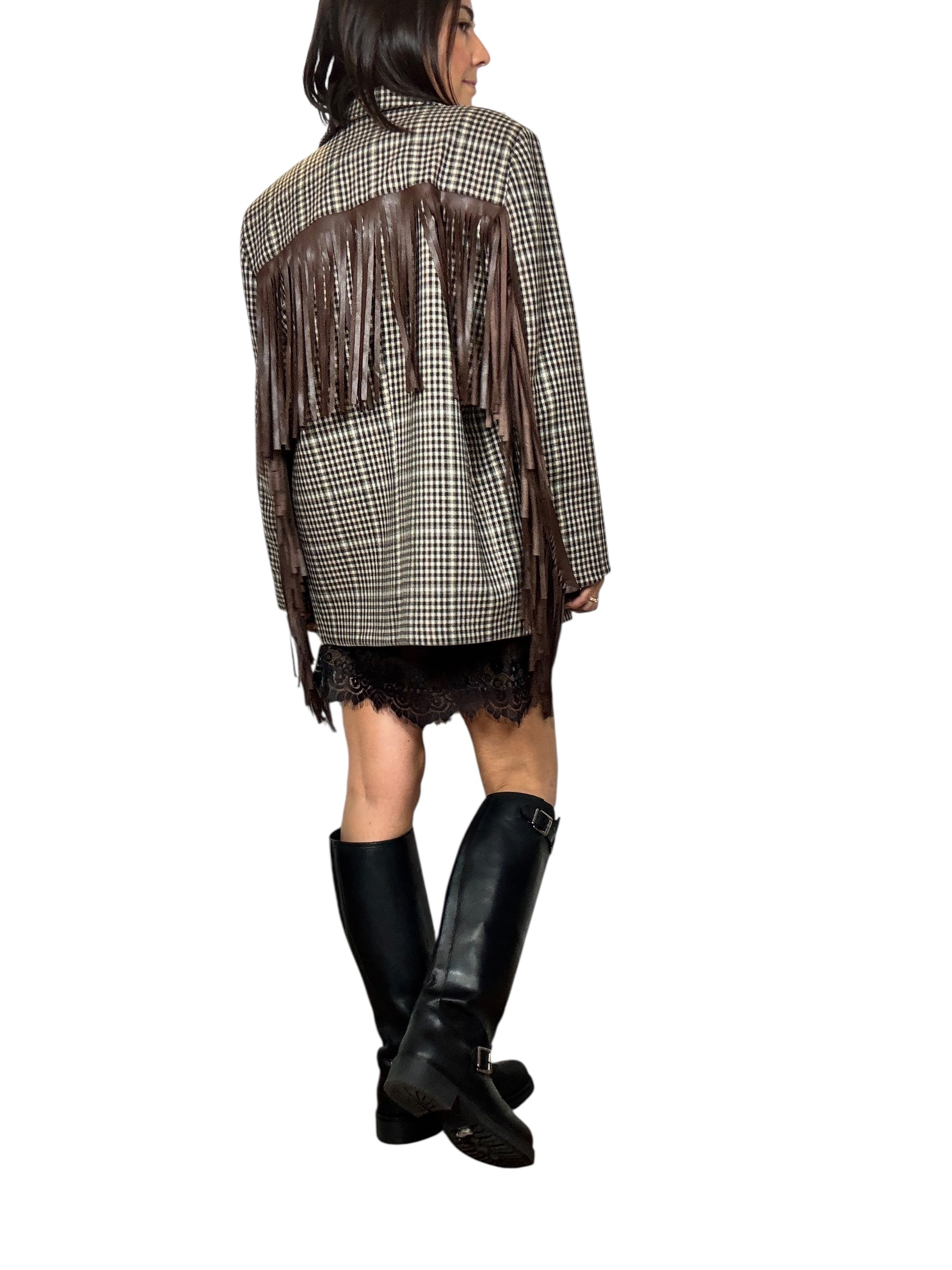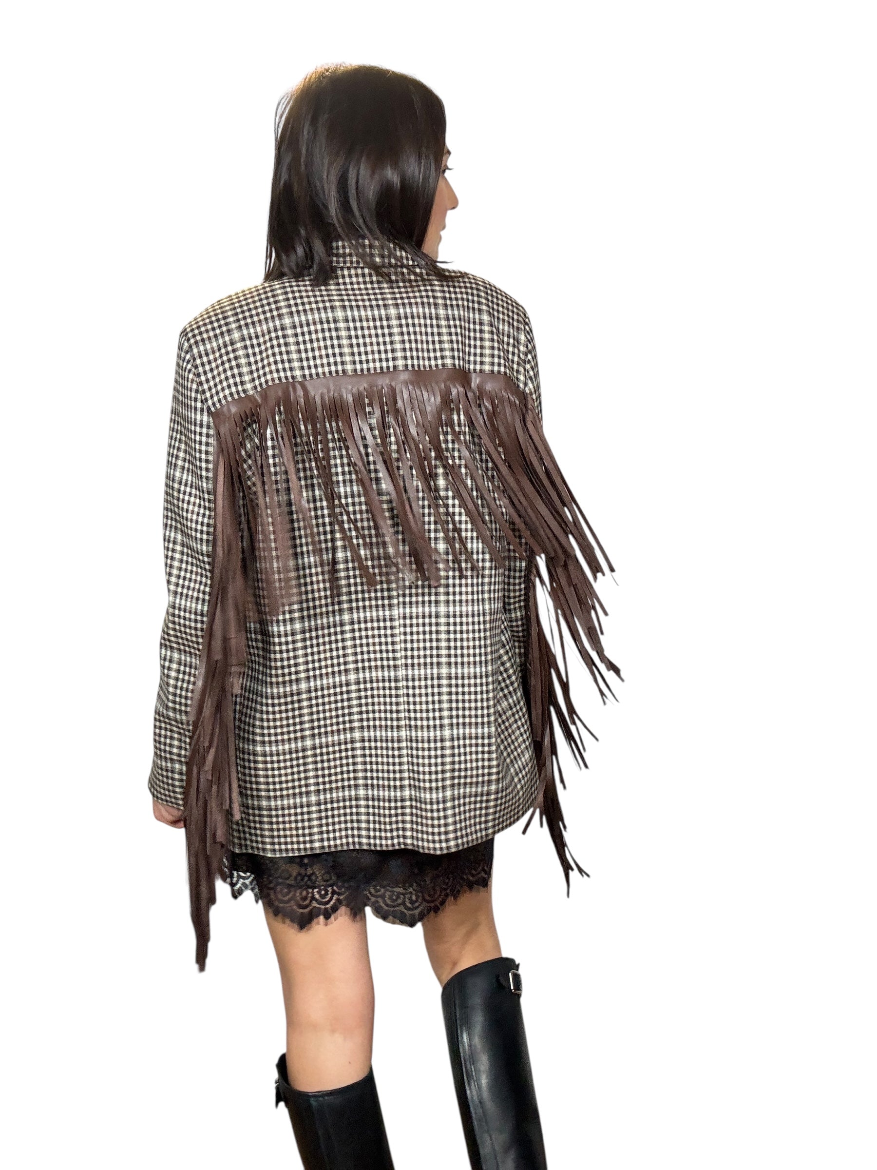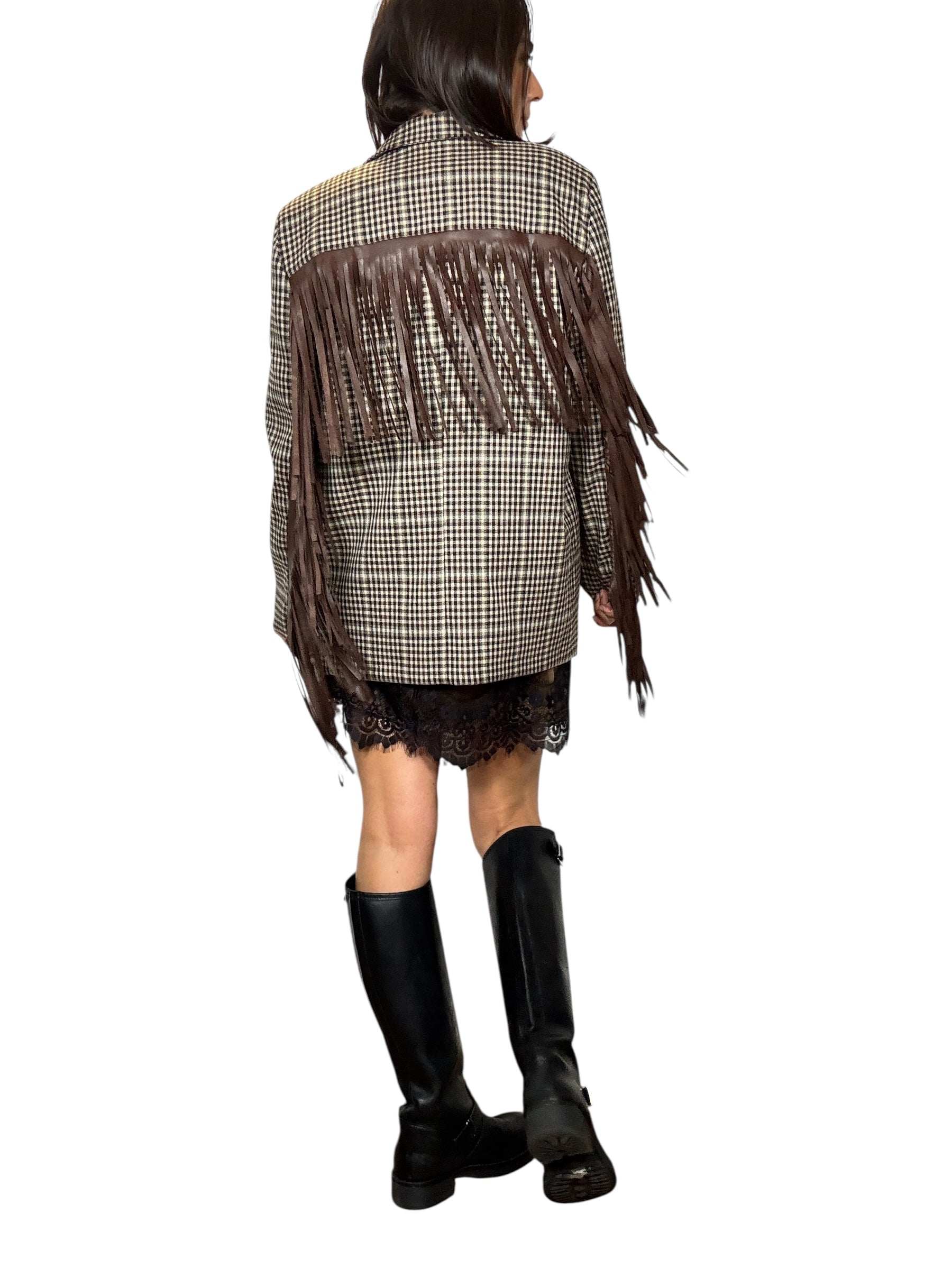 Giacca foderata a monopetto con finte tasche frontali e frange sulle braccia. Vestibilità abbondante (tg in foto S)