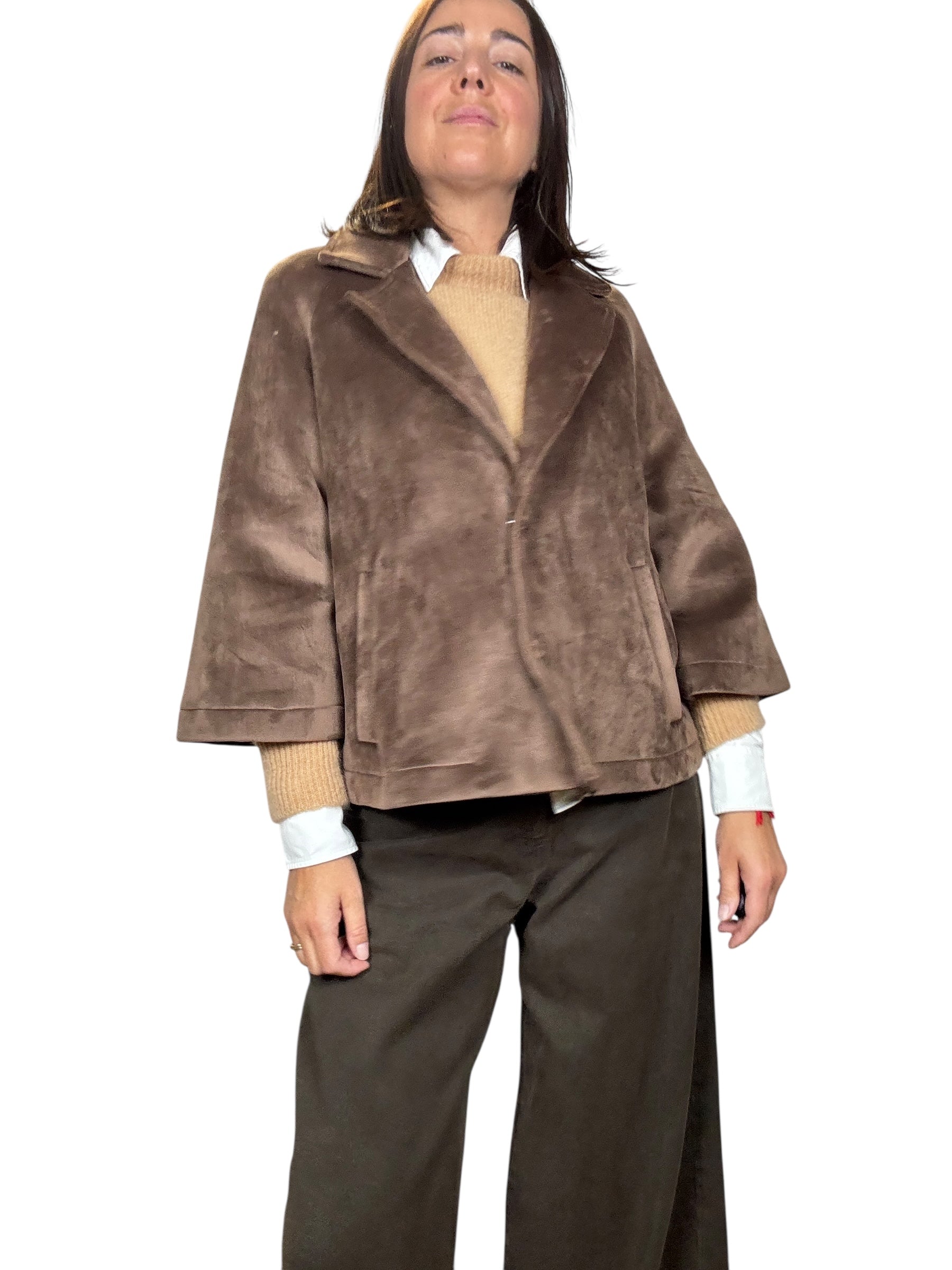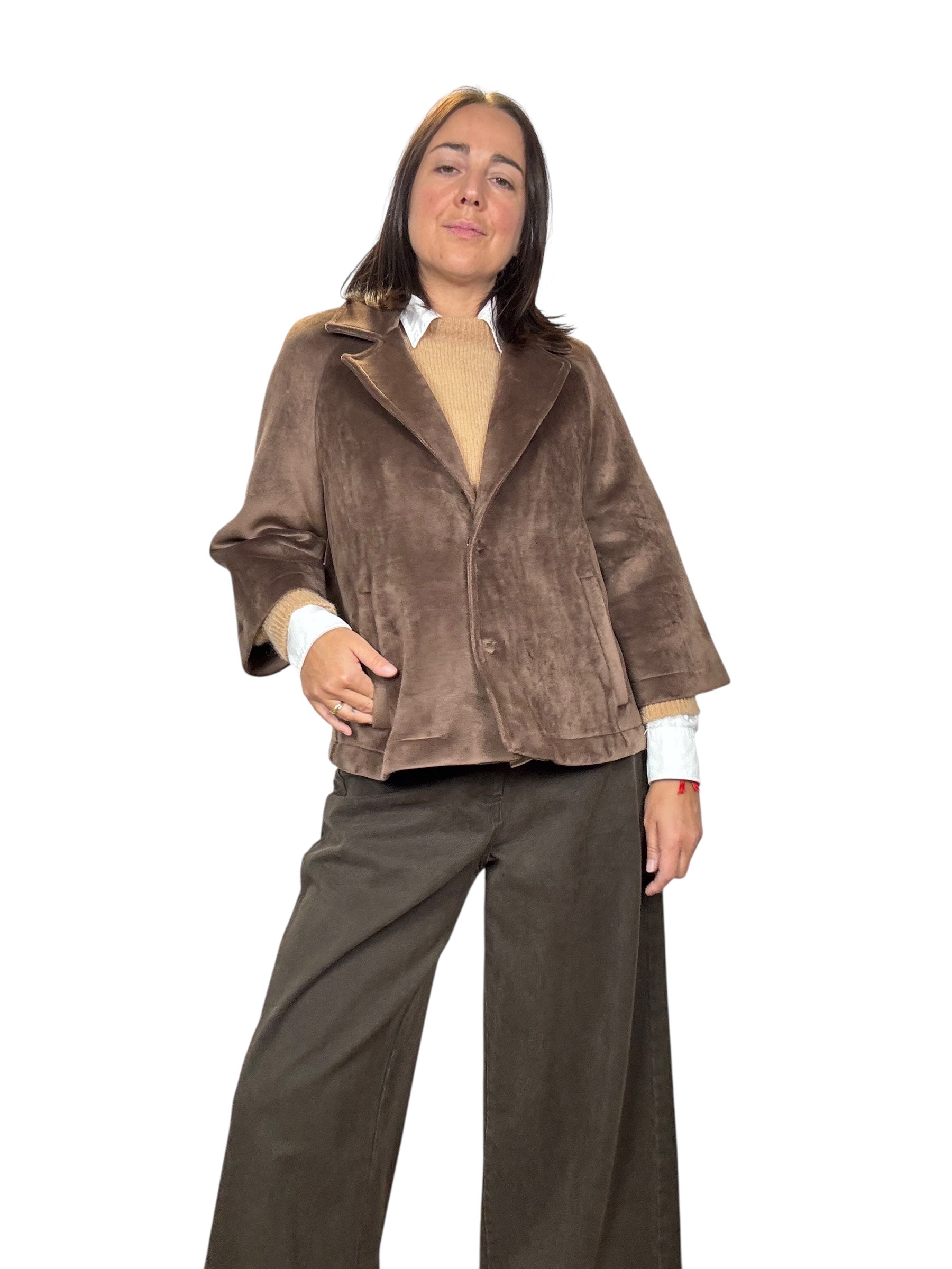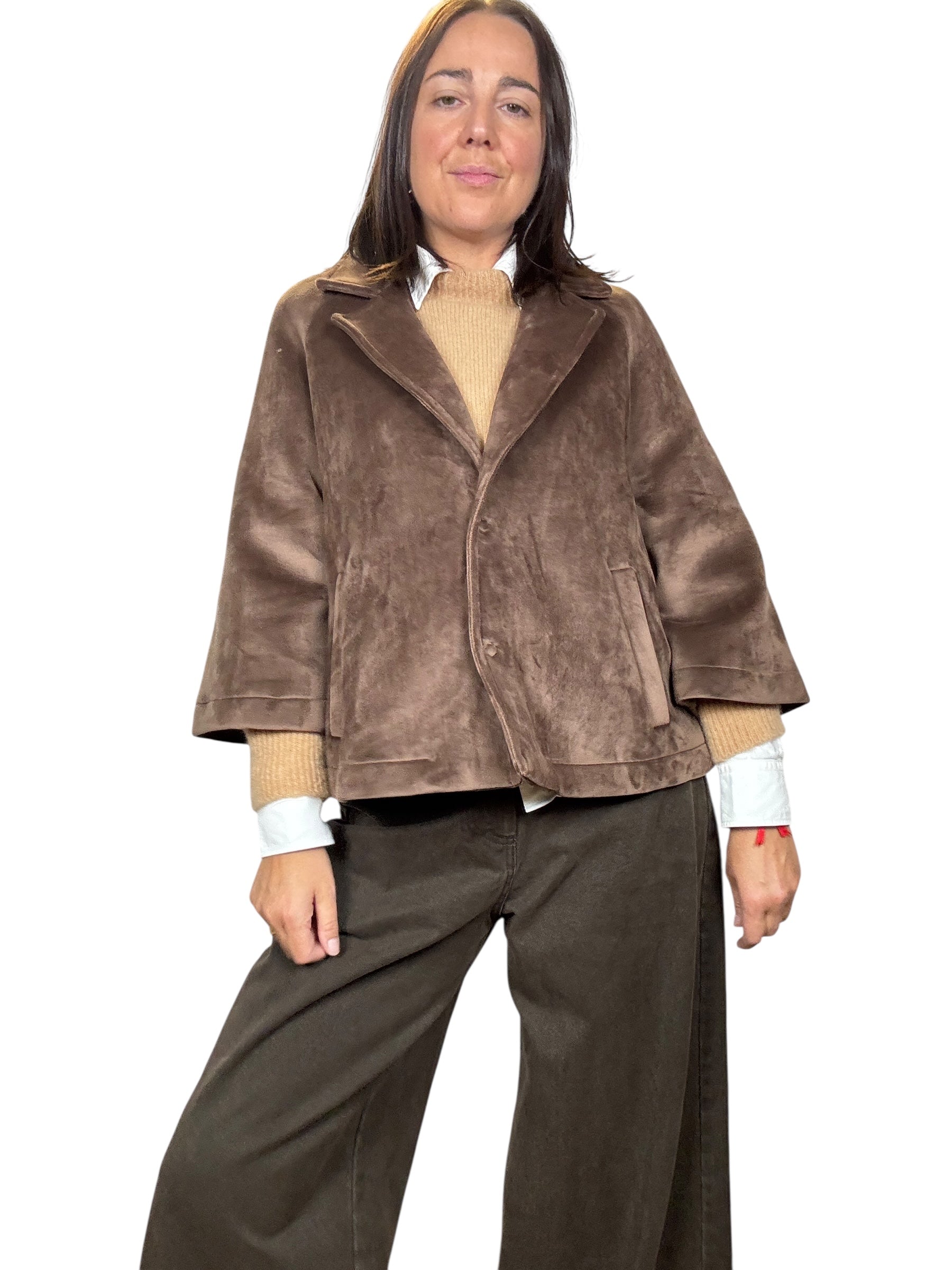 Giacca a manica 3/4 con doppio bottone e tasche laterali. Modello svasato fit over