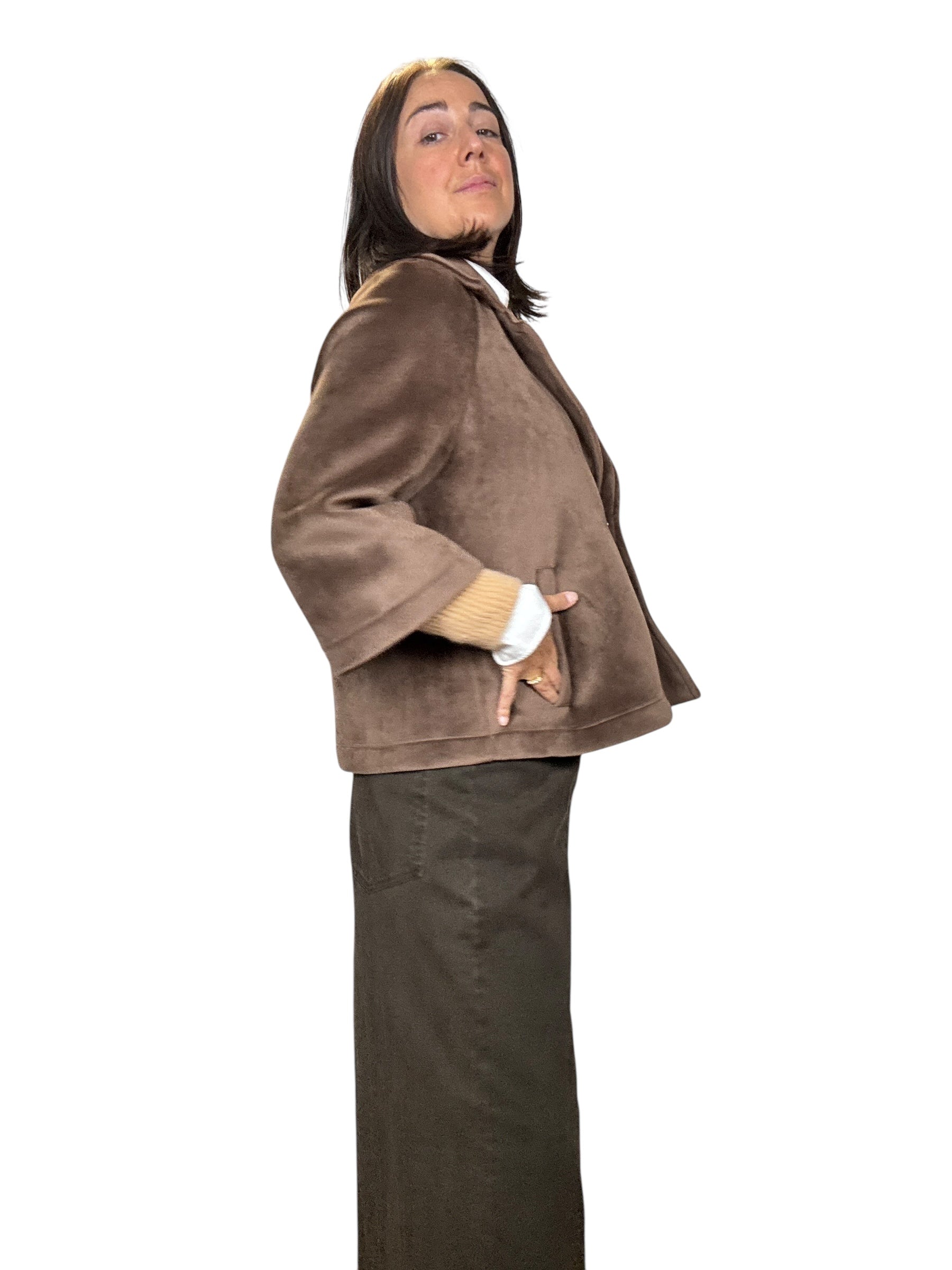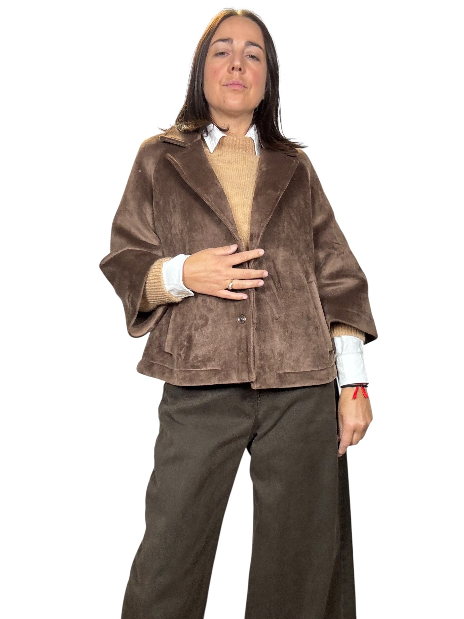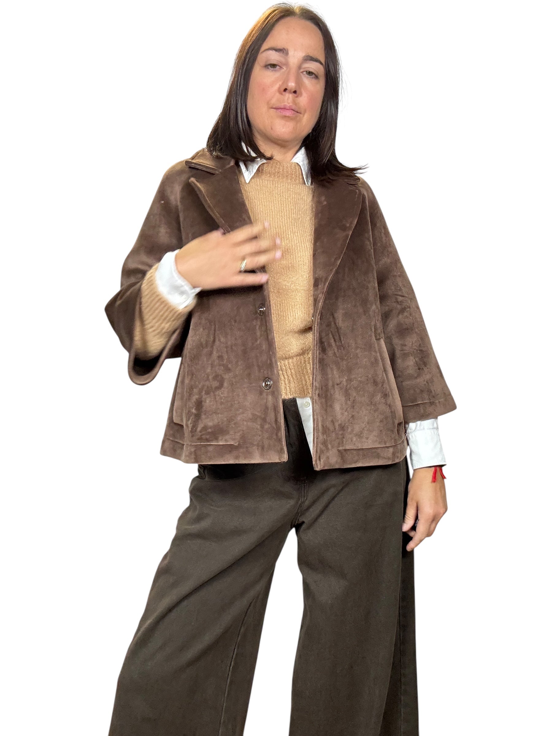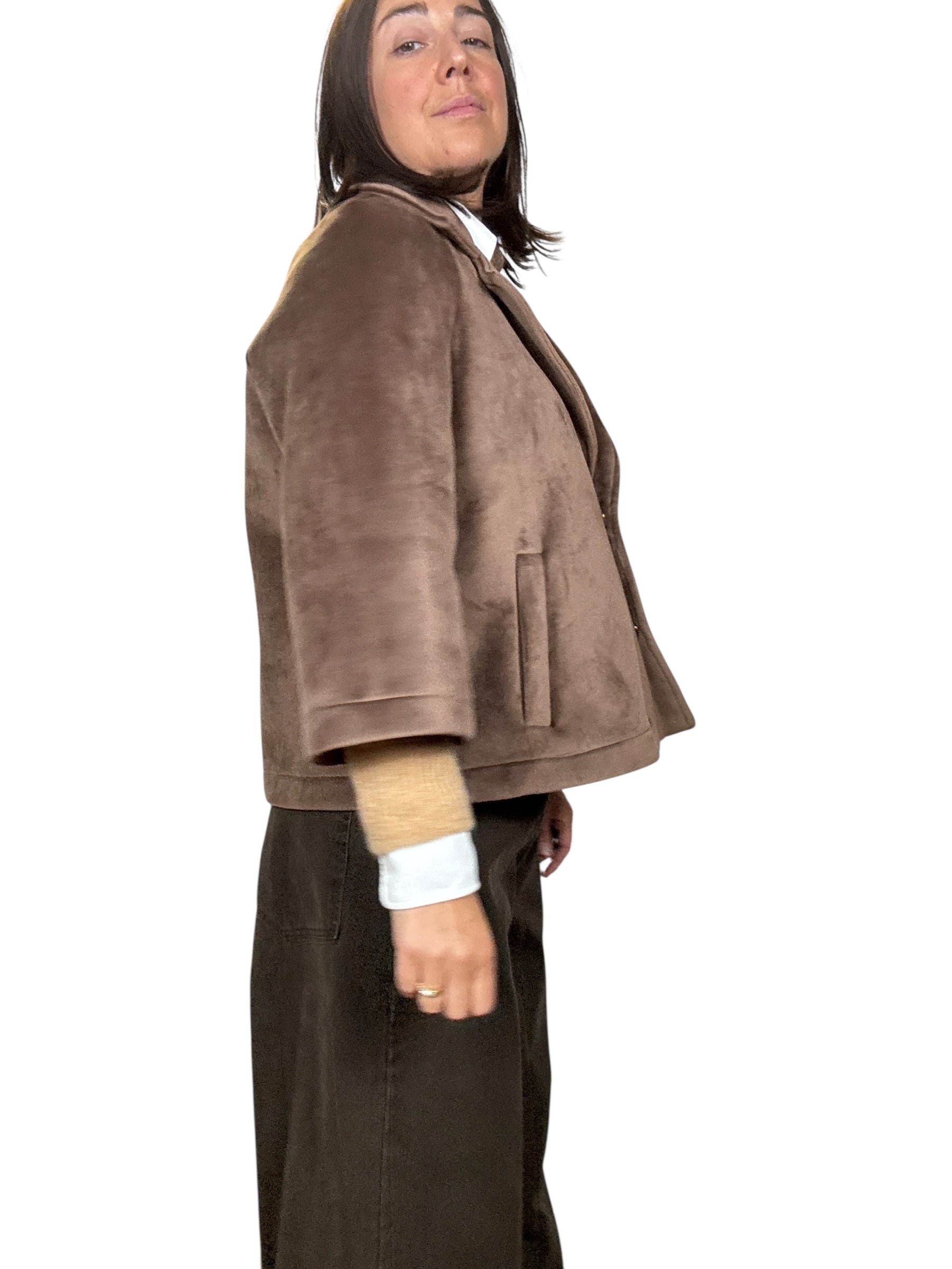 Giacca a manica 3/4 con doppio bottone e tasche laterali. Modello svasato fit over