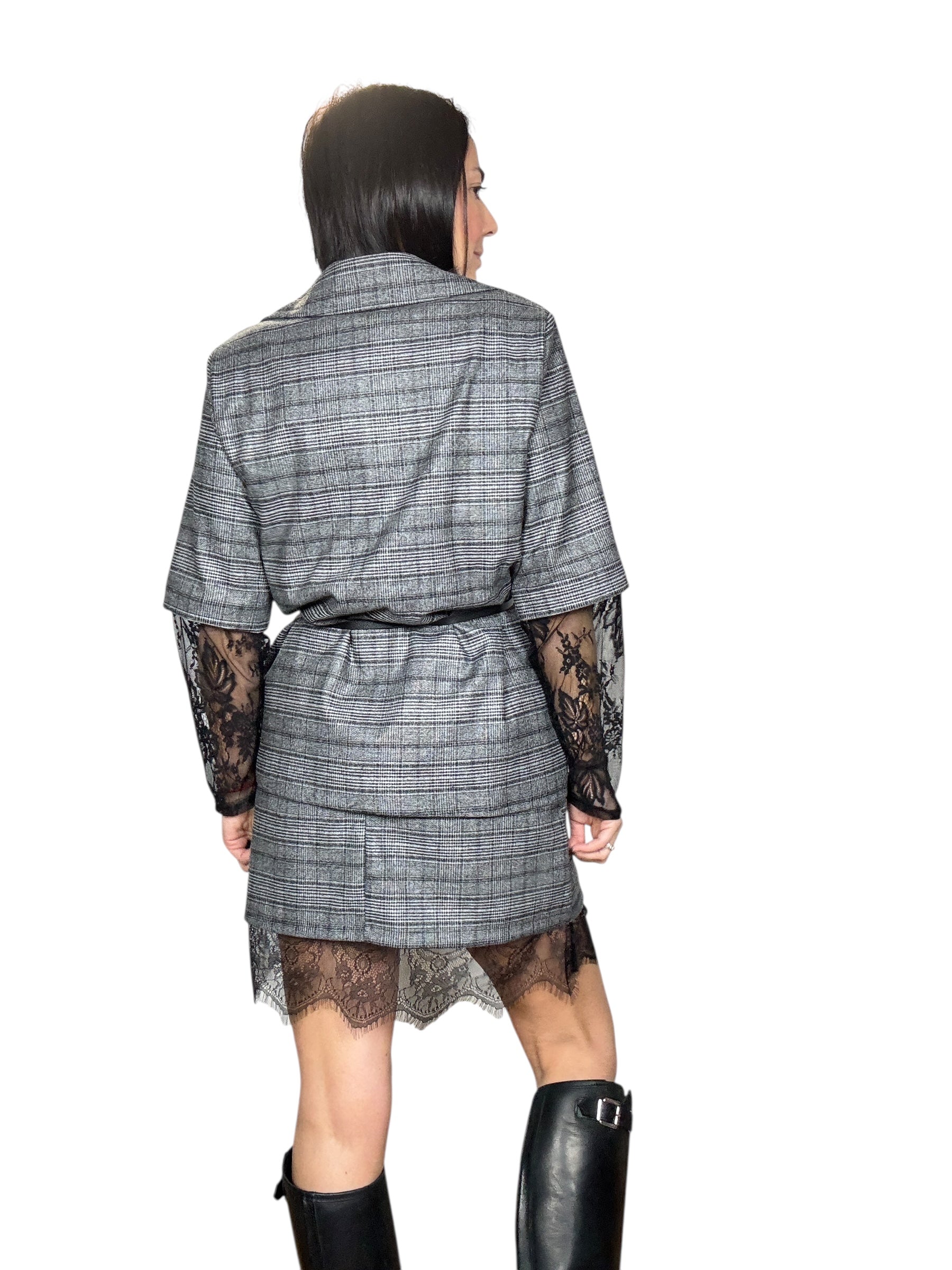 Giacca sfoderata monopetto con finte tasche e manica con inserto in pizzo. Vestibilità morbida, minigonna abbinabile (tg in foto S)