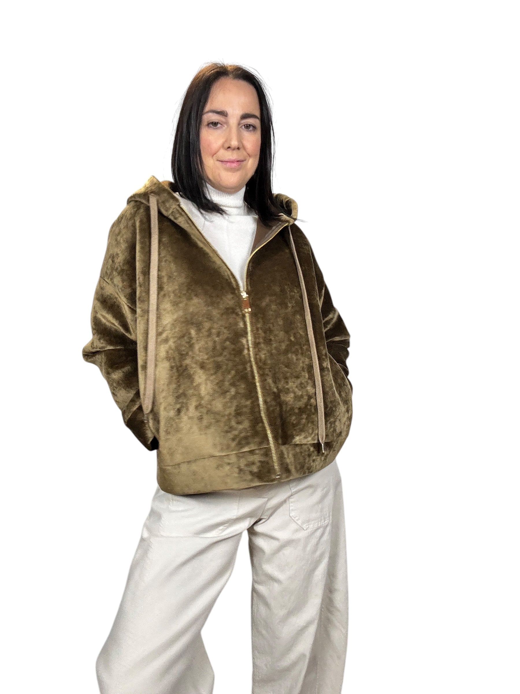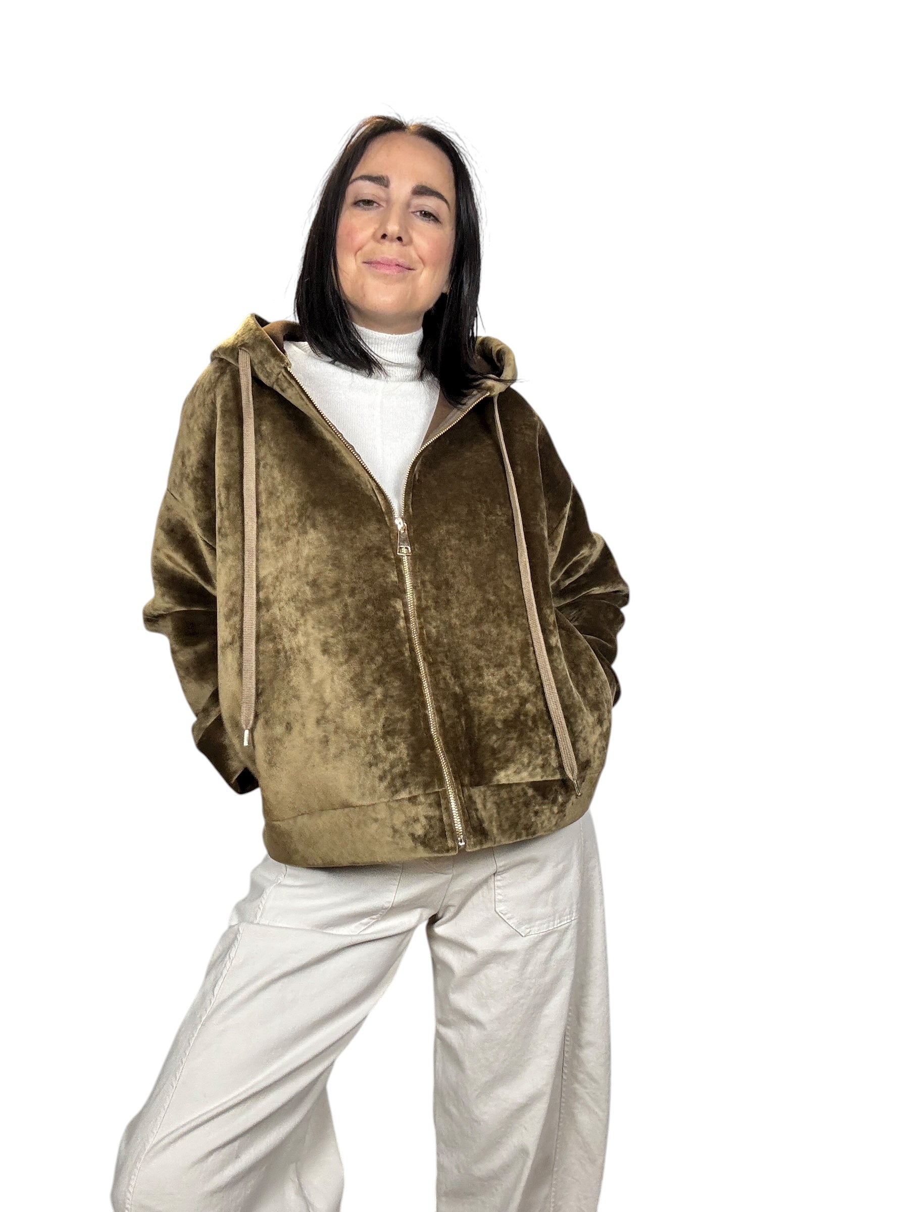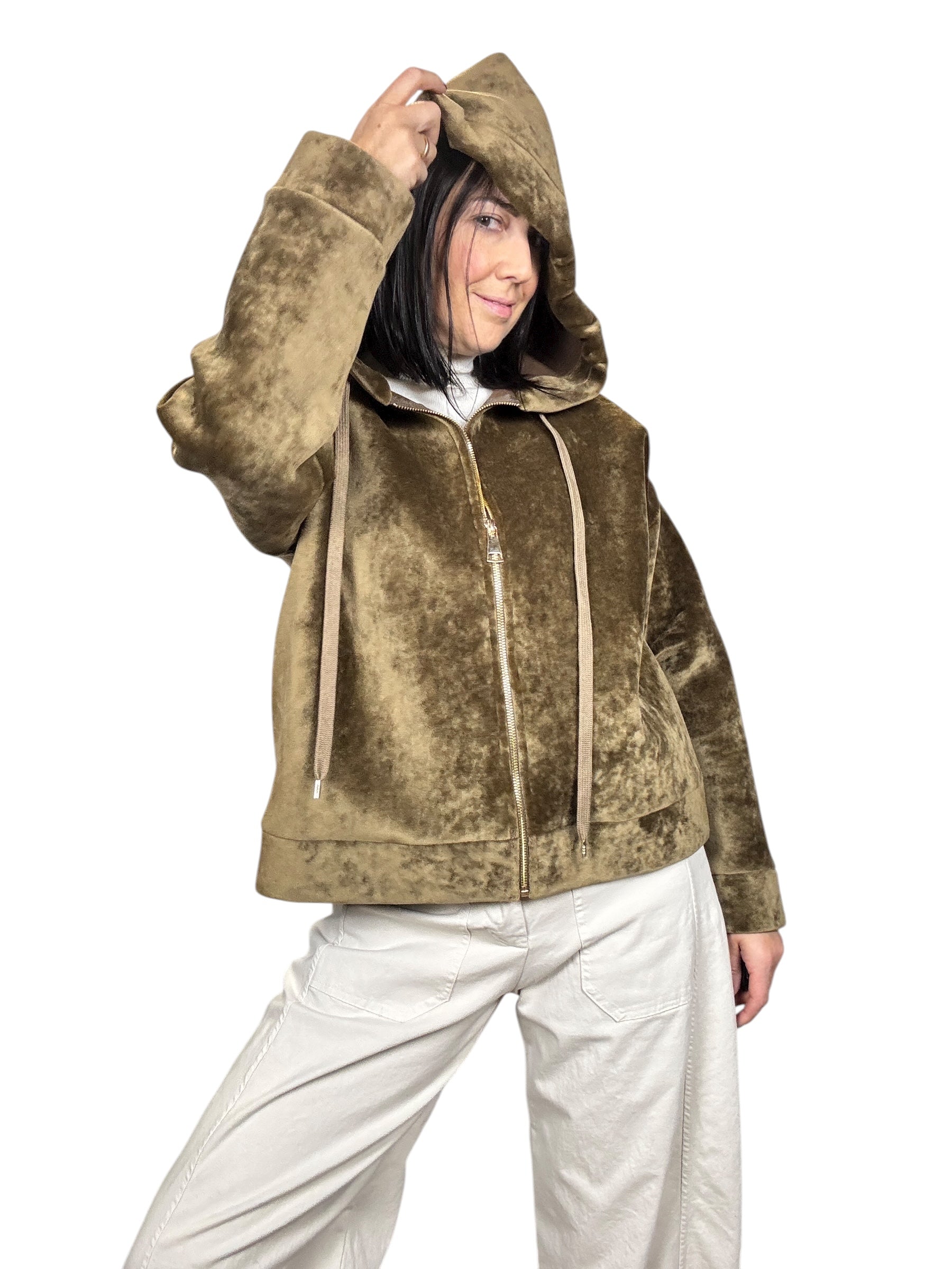 Giubbino oversize con zip frontale, cappuccio e tasche laterali. Elasticizzato