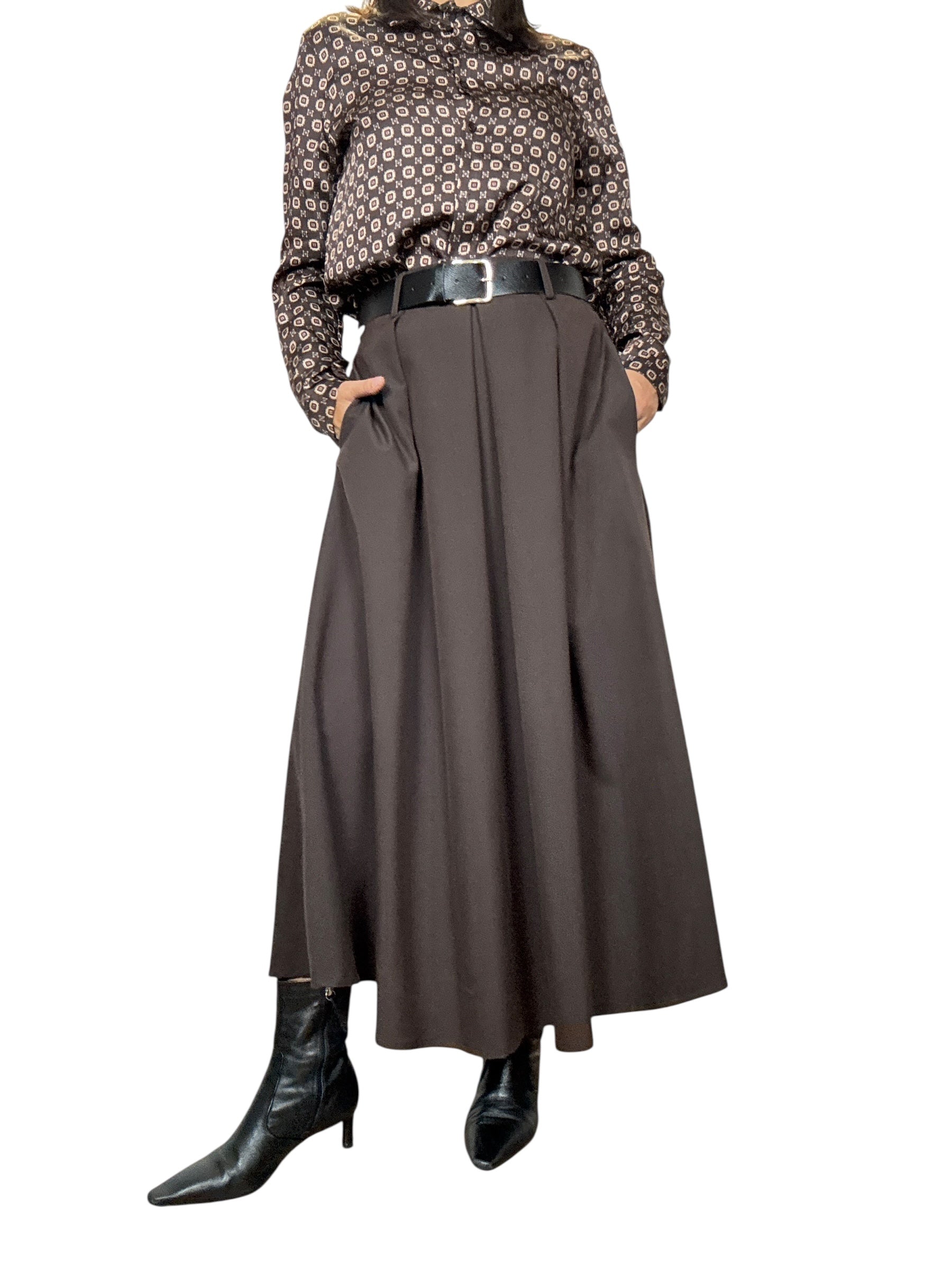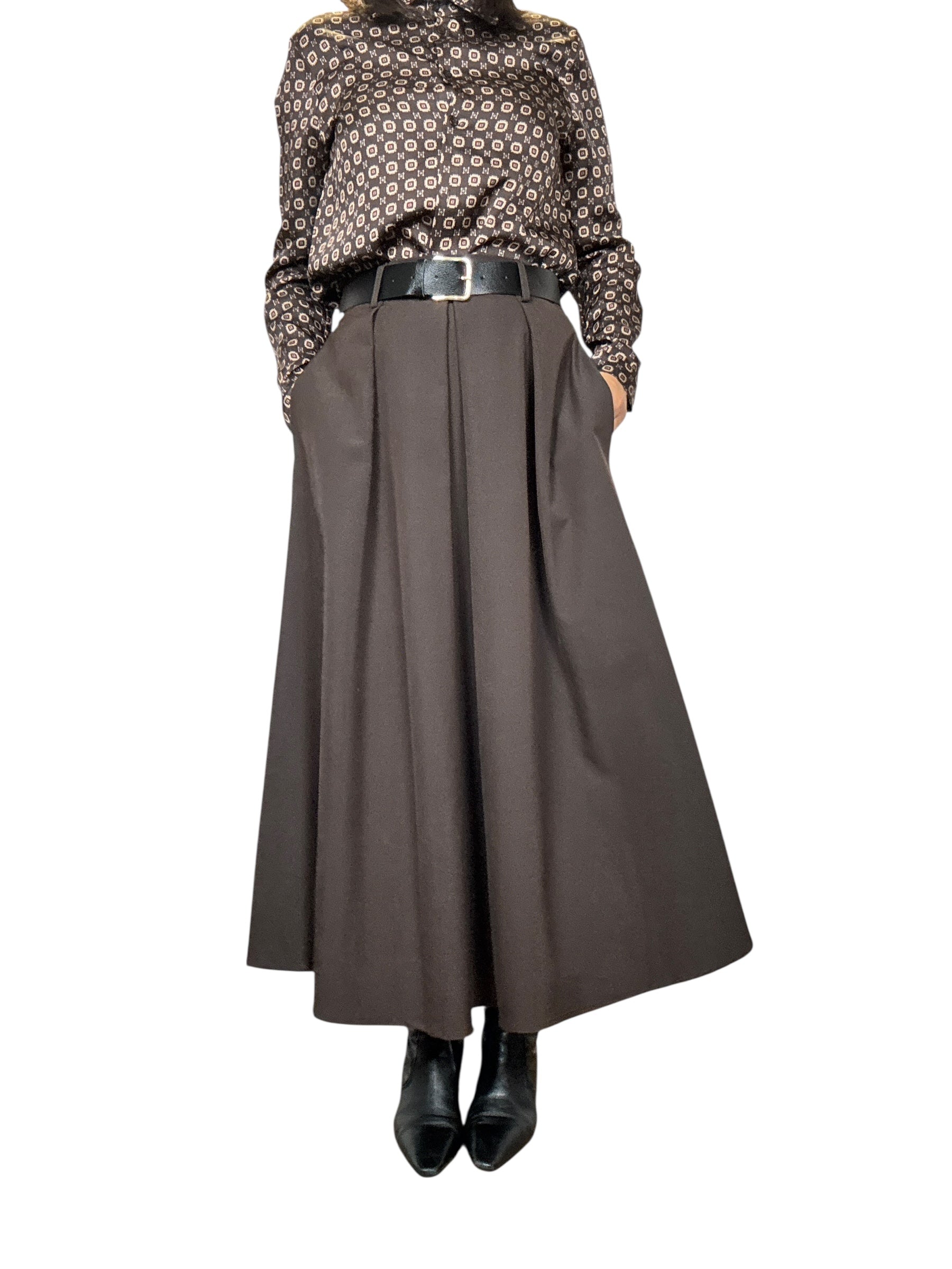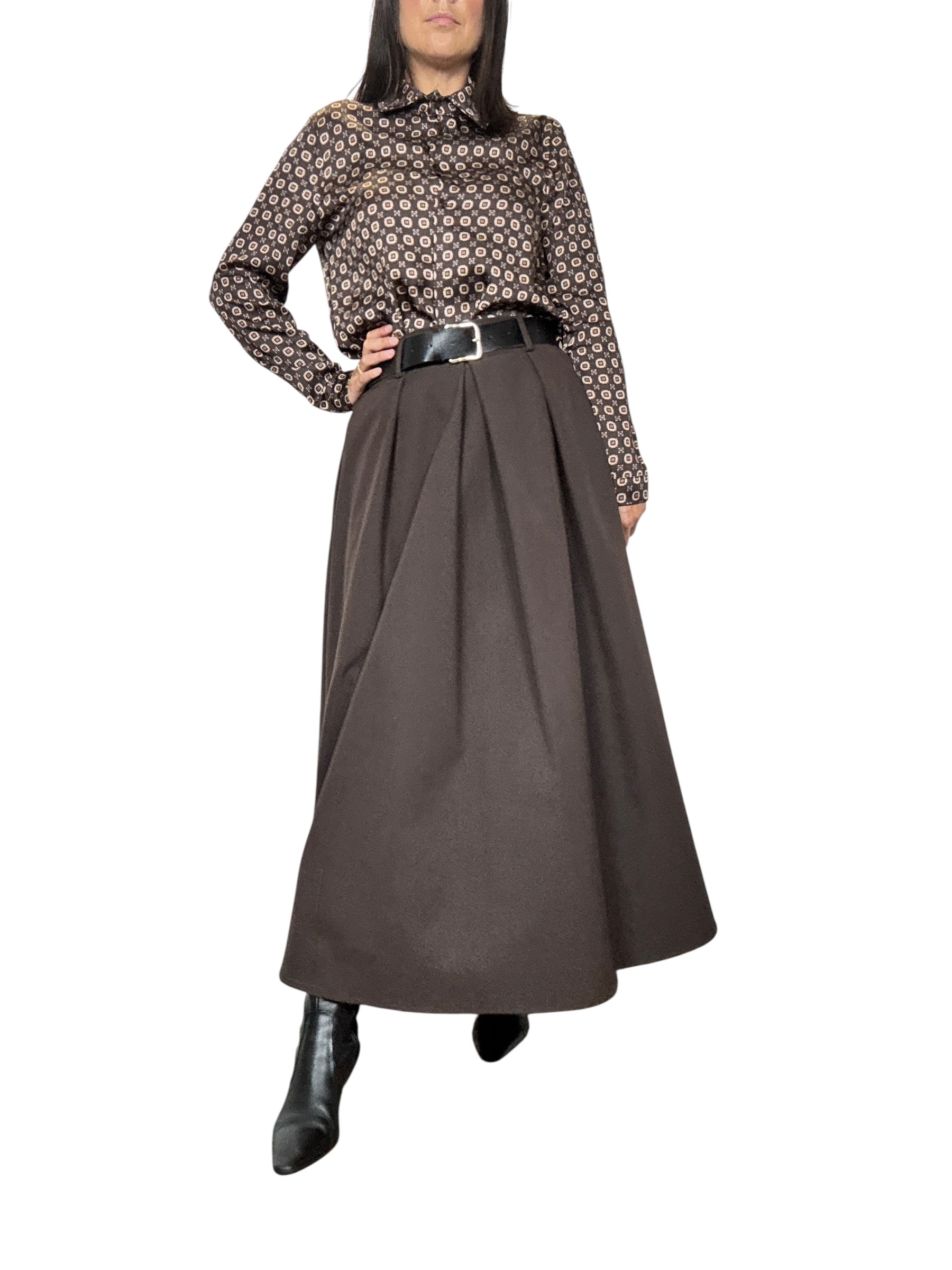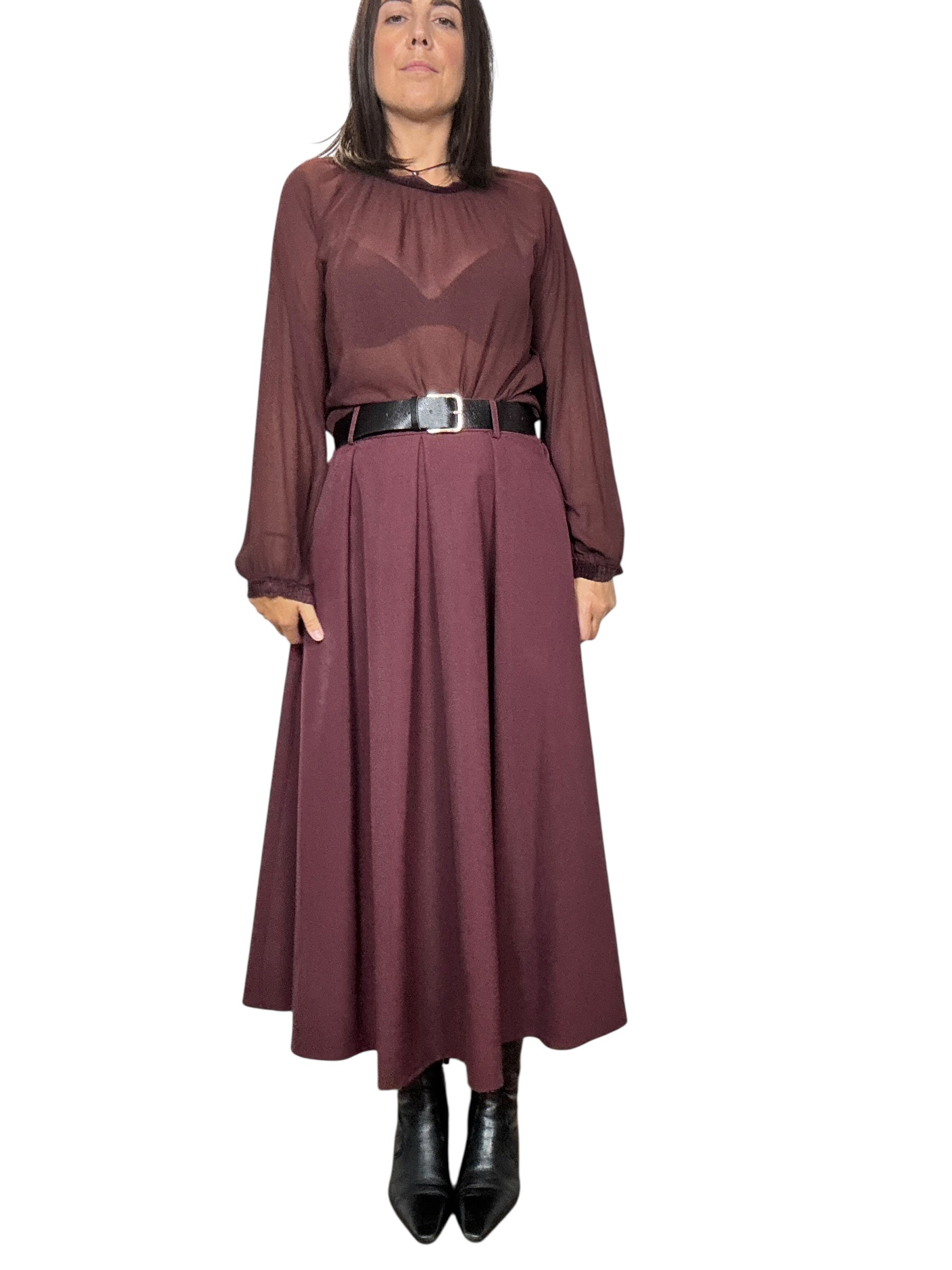 Gonna a vita alta con fascia elastica sul retro del cinturone e tasche laterali. Modello svasato con pieghe davanti, lunghezza alla caviglia (tessuto elasticizzato ottima vestibilità)