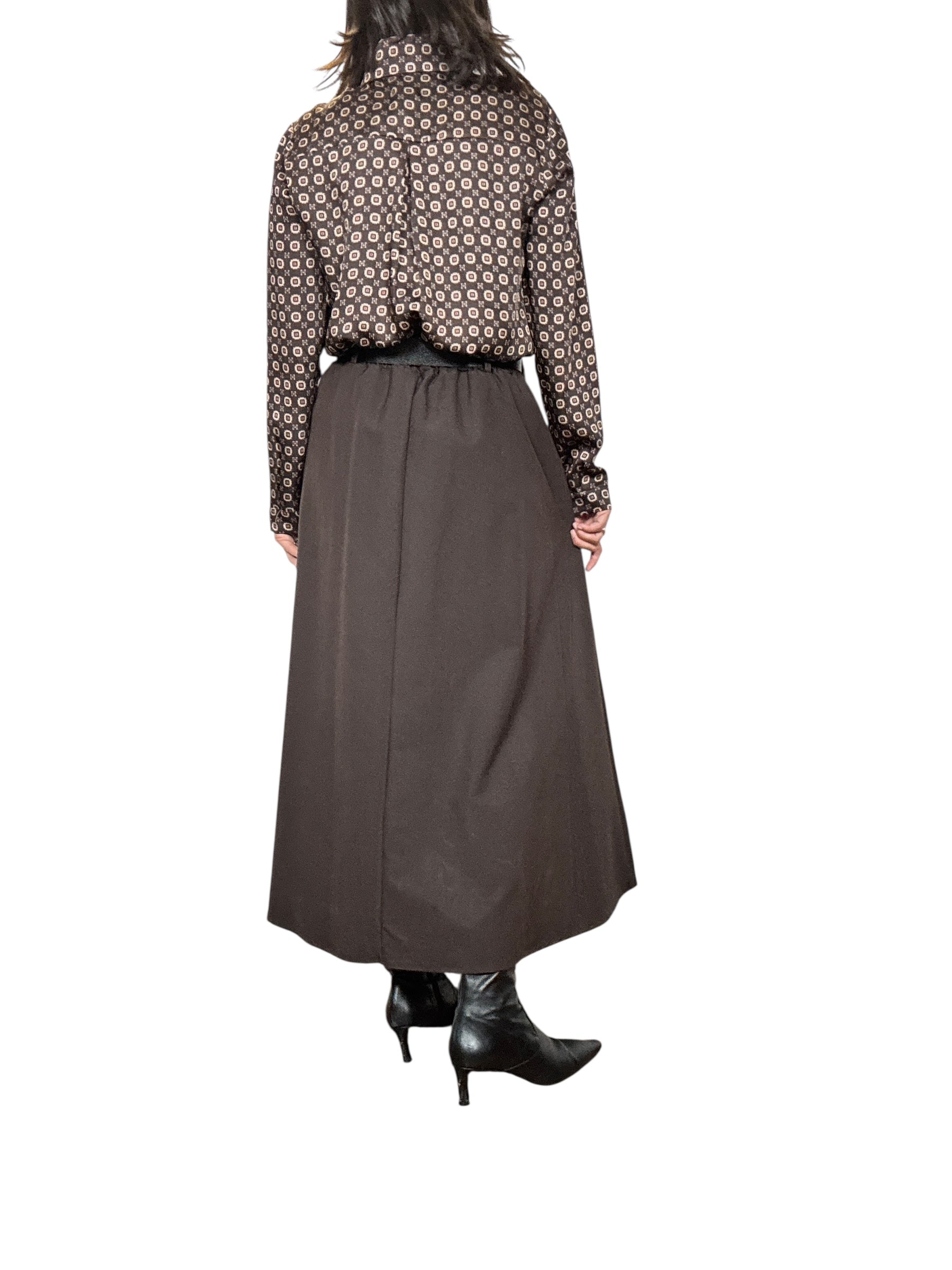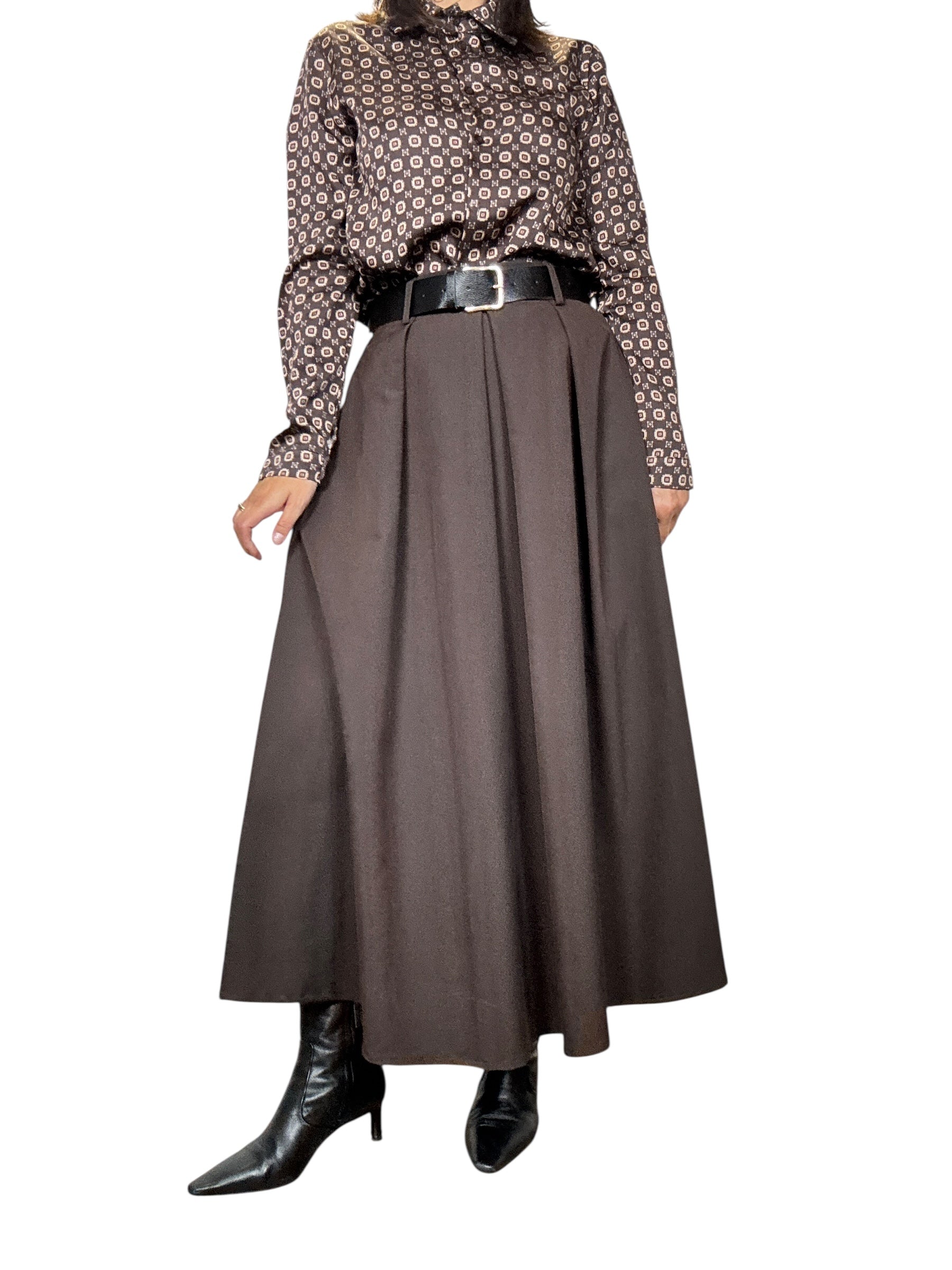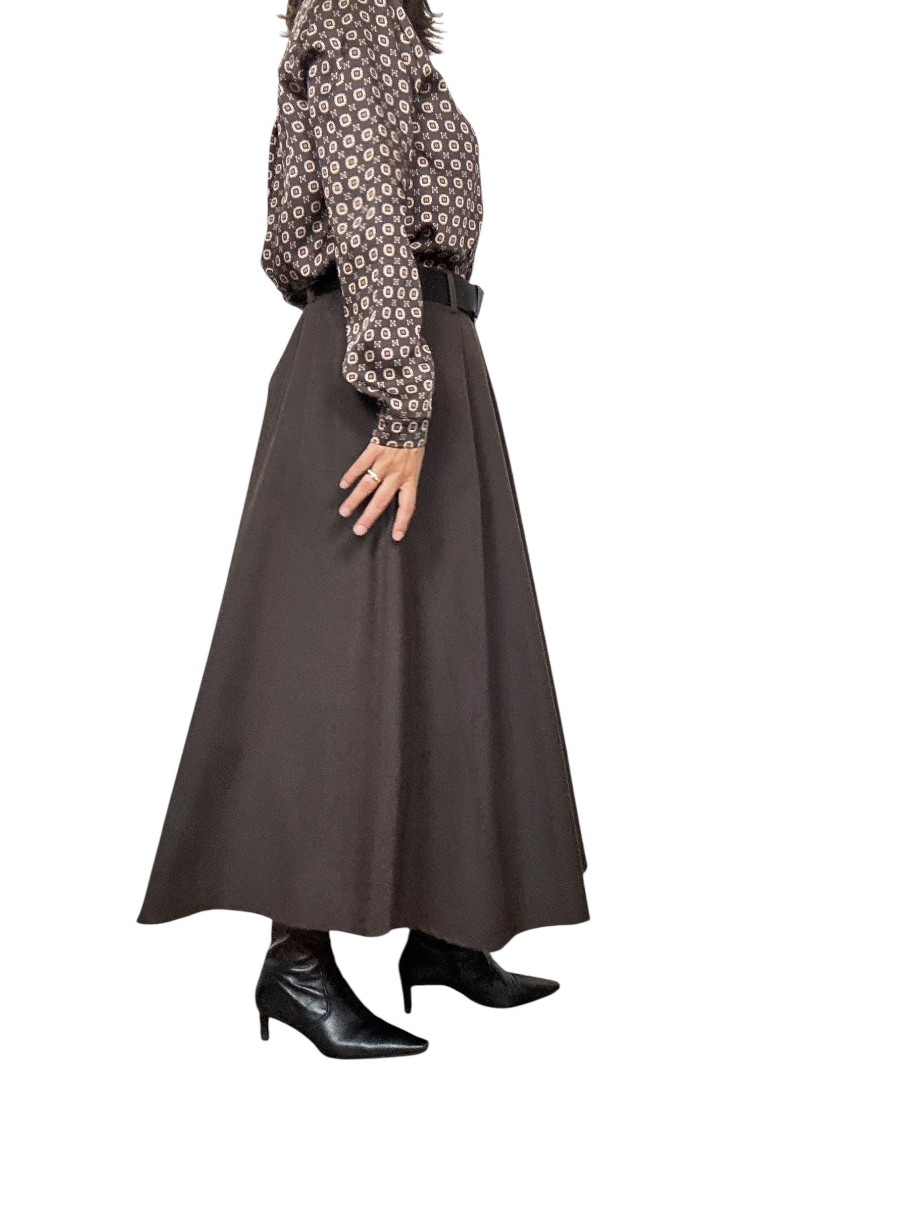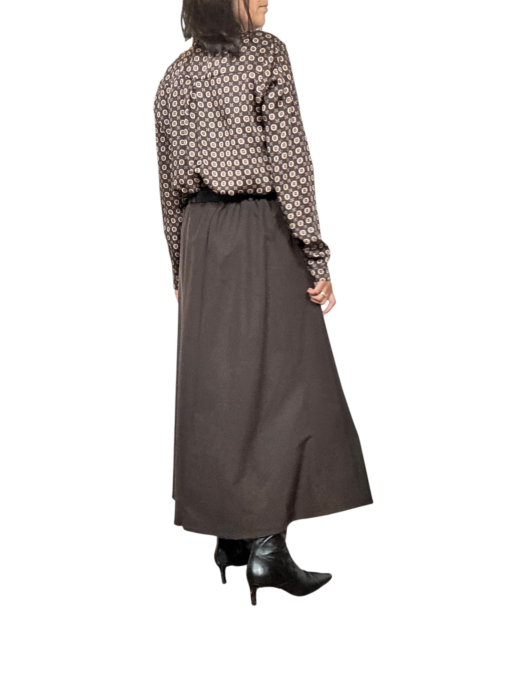 Gonna a vita alta con fascia elastica sul retro del cinturone e tasche laterali. Modello svasato con pieghe davanti, lunghezza alla caviglia (tessuto elasticizzato ottima vestibilità)