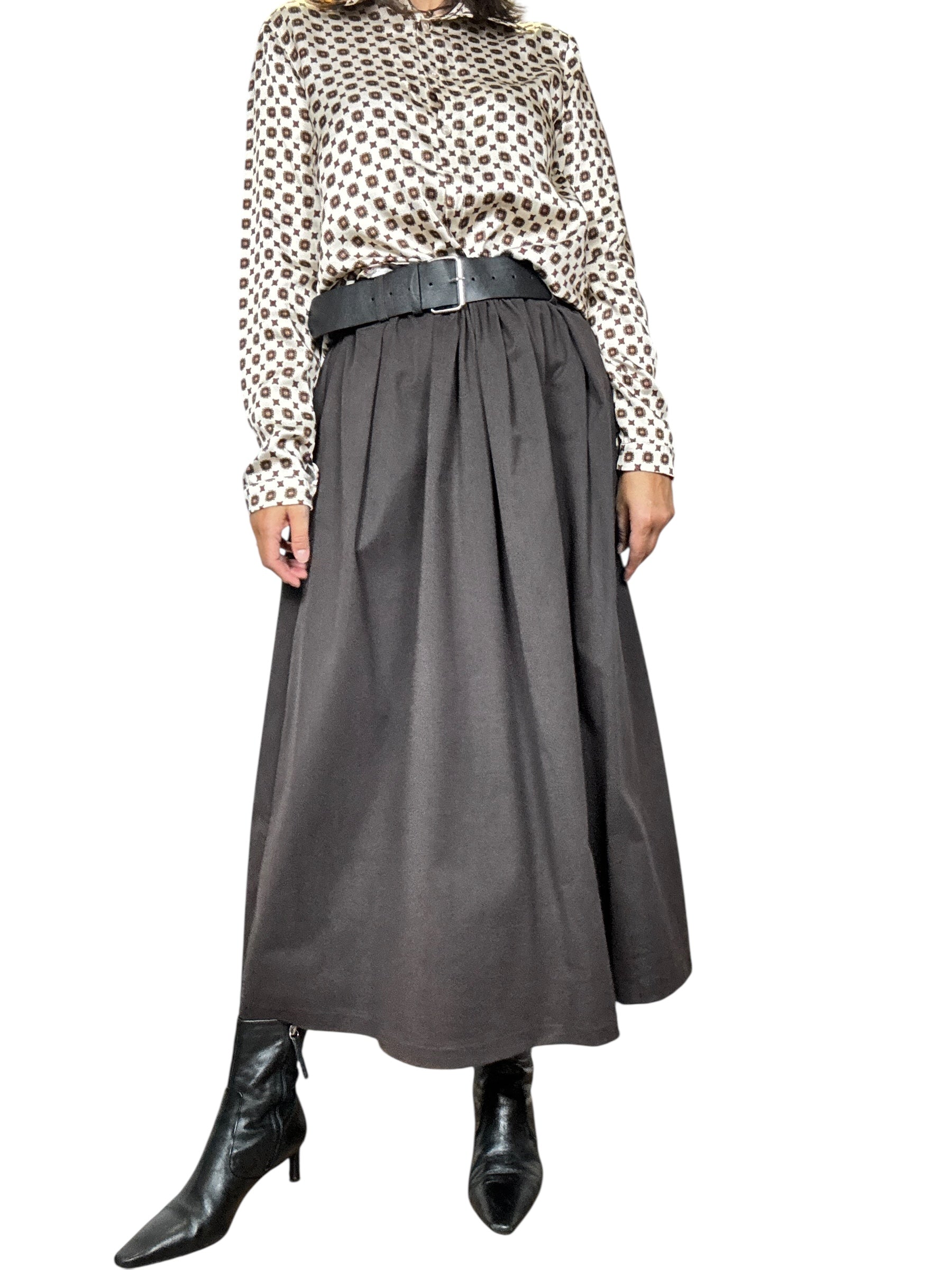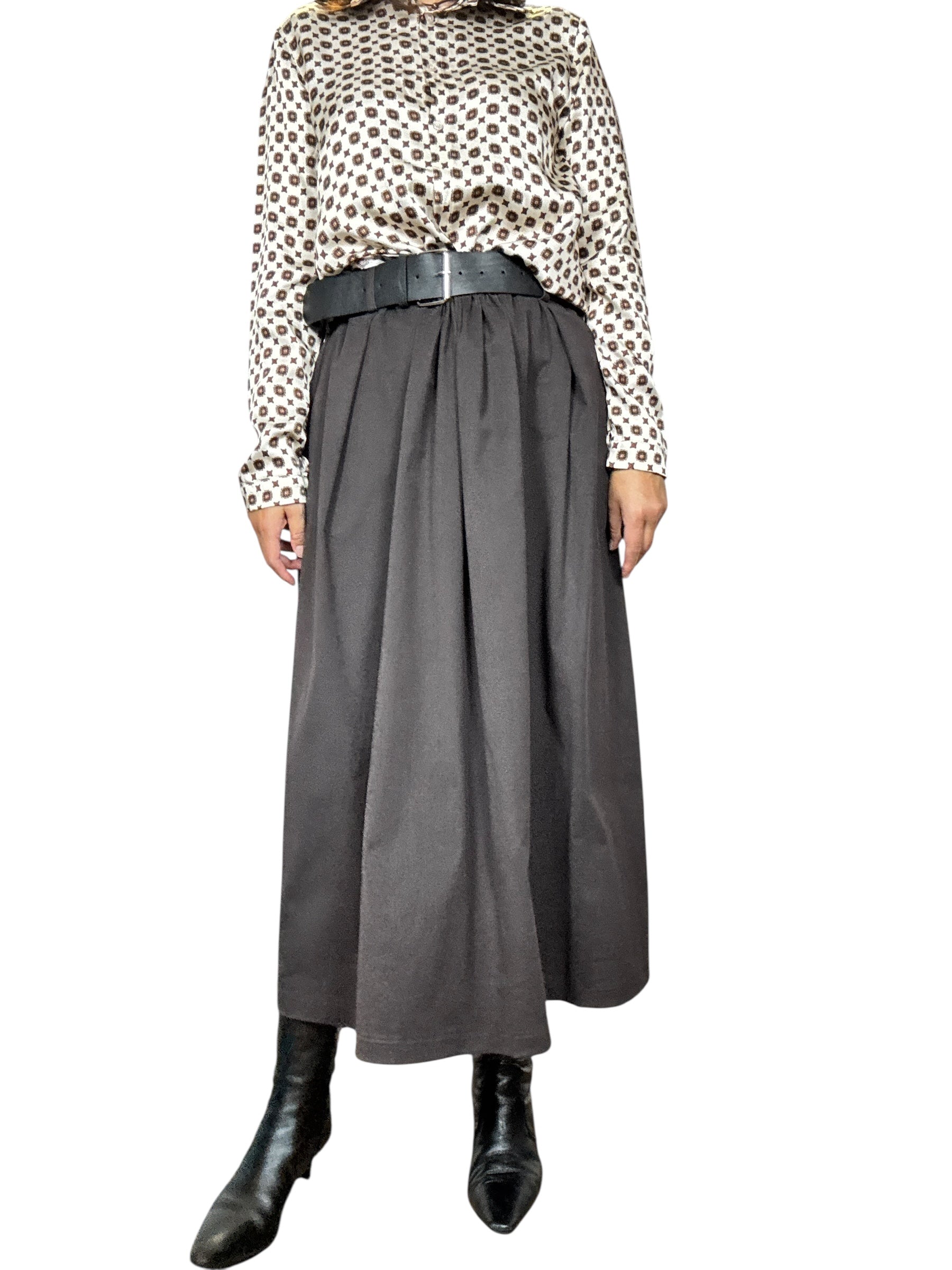 Gonna a vita alta con fascia elastica sul retro del cinturone e pieghe davanti. Modello svasato, lunghezza in caviglia. Tessuto elasticizzato (tg in foto XS)