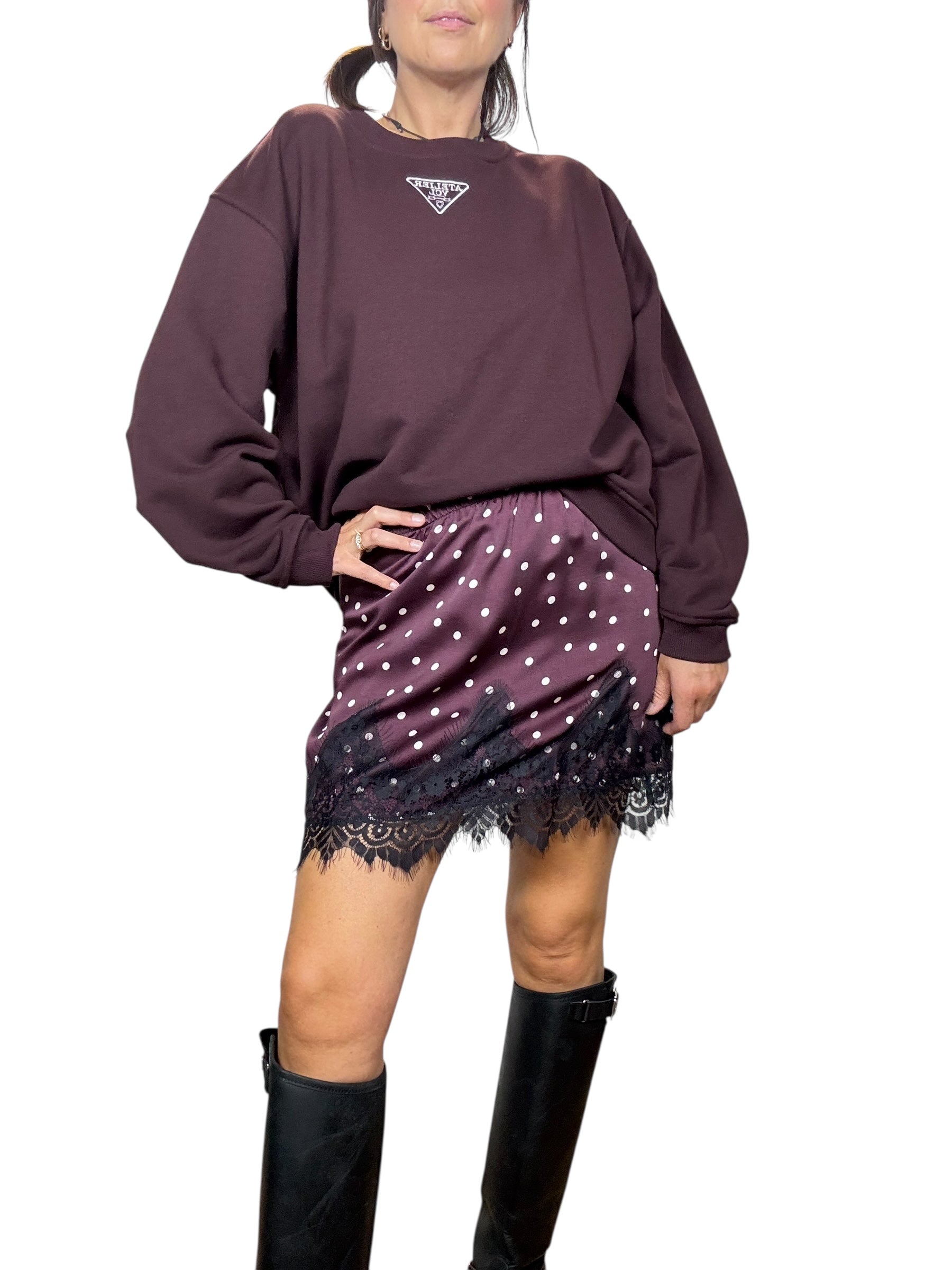 Minigonna a pois con elastico in cintura ed inserto in pizzo