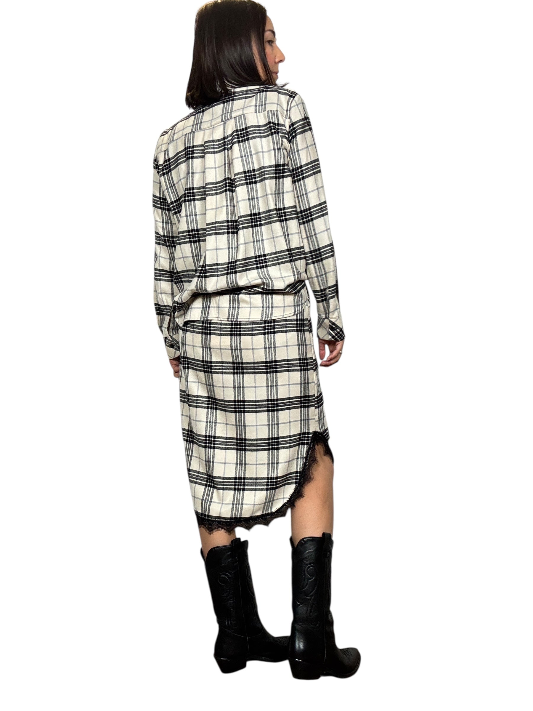 Gonna a vita alta con elastico in cintura, bottoni frotali ed inserto in pizzo. Lunghezza midi, top e camicia abbinabili (tg in foto S)