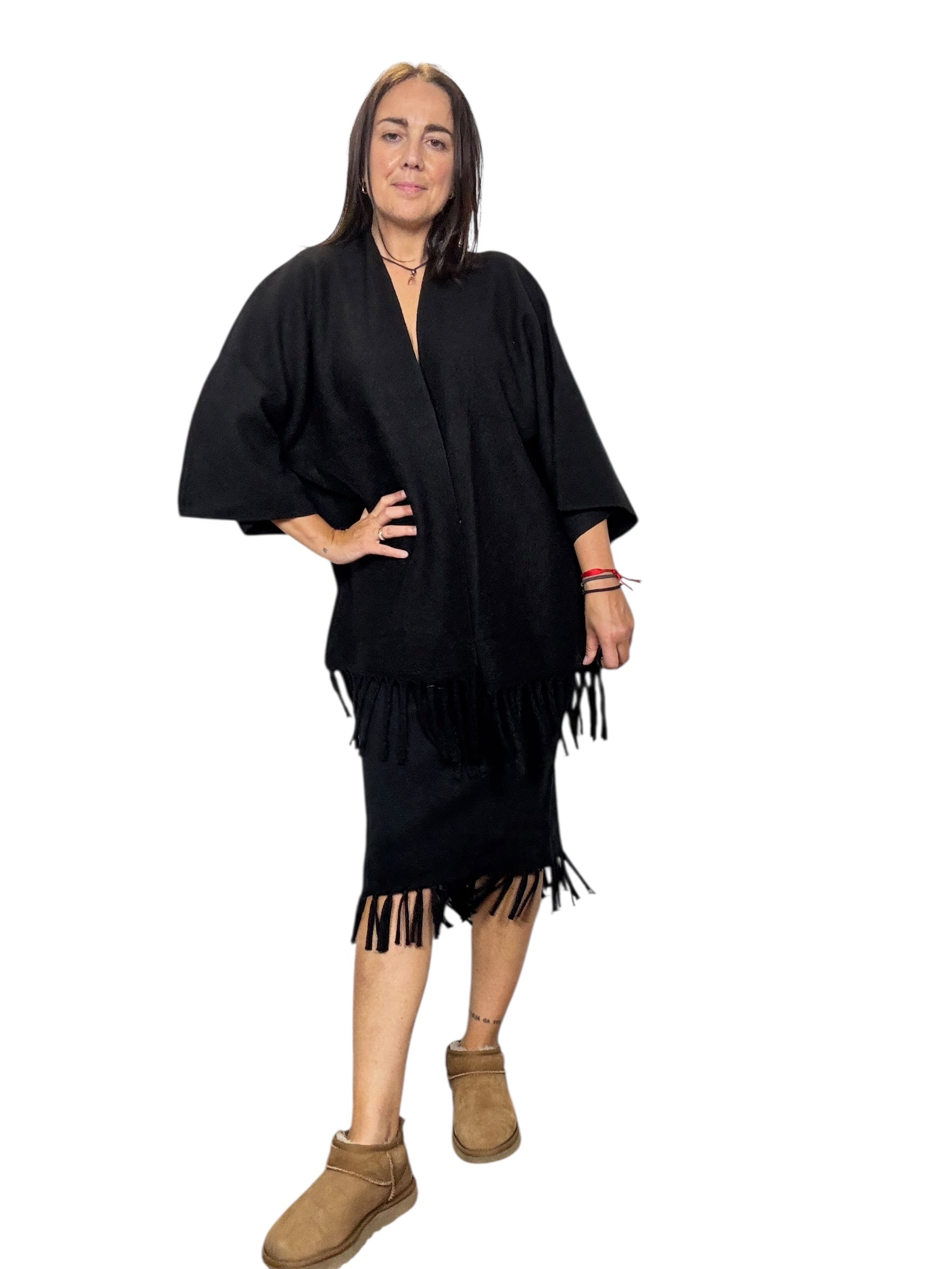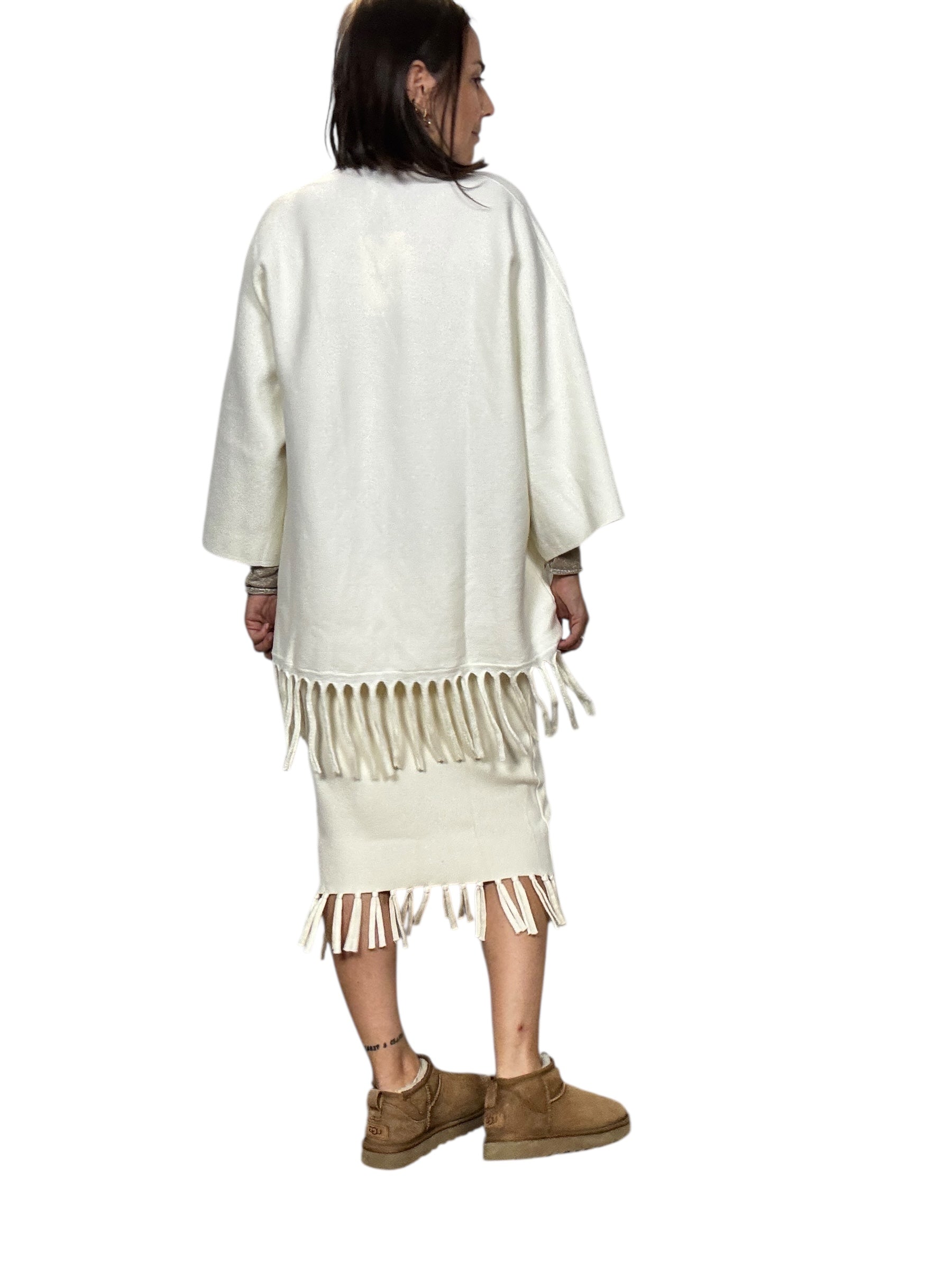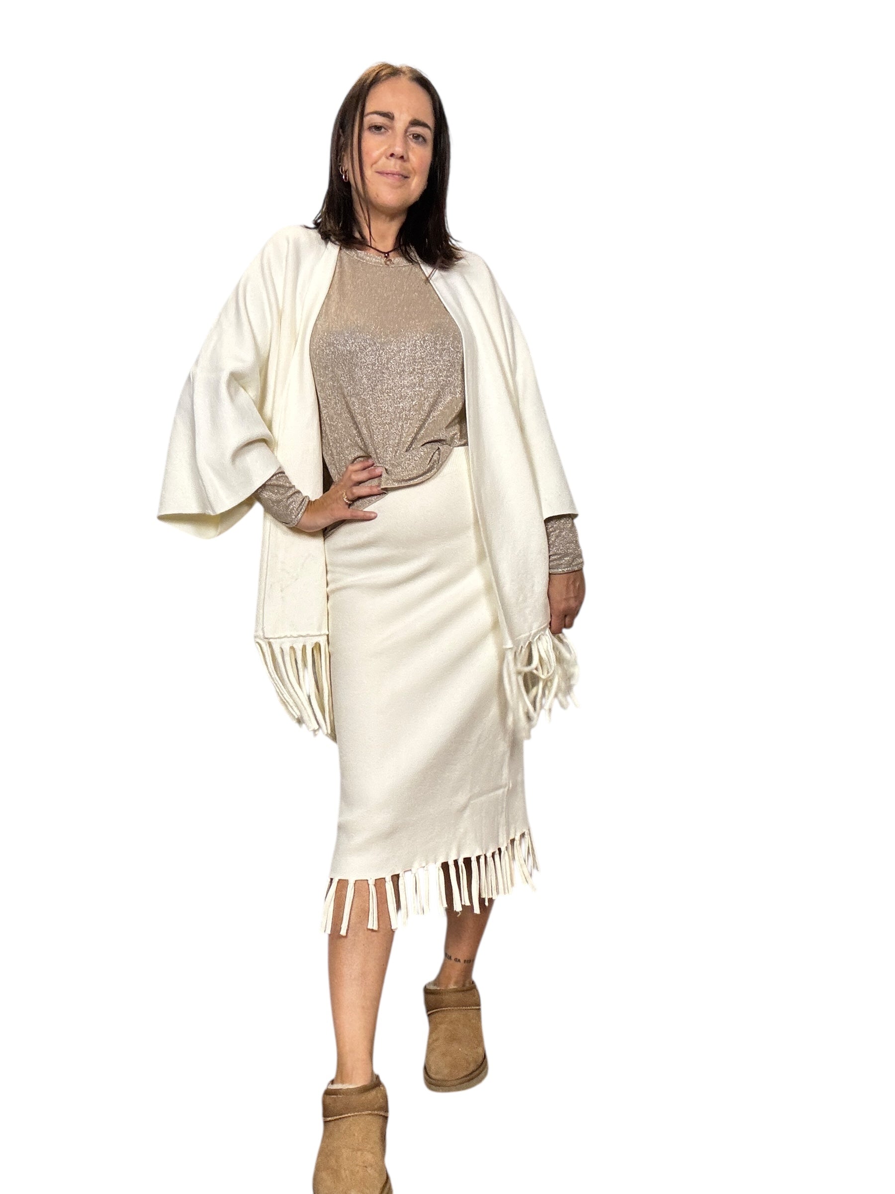 Gonna a vita alta con elastico in cintura e frange sotto, cappa abbinabile
