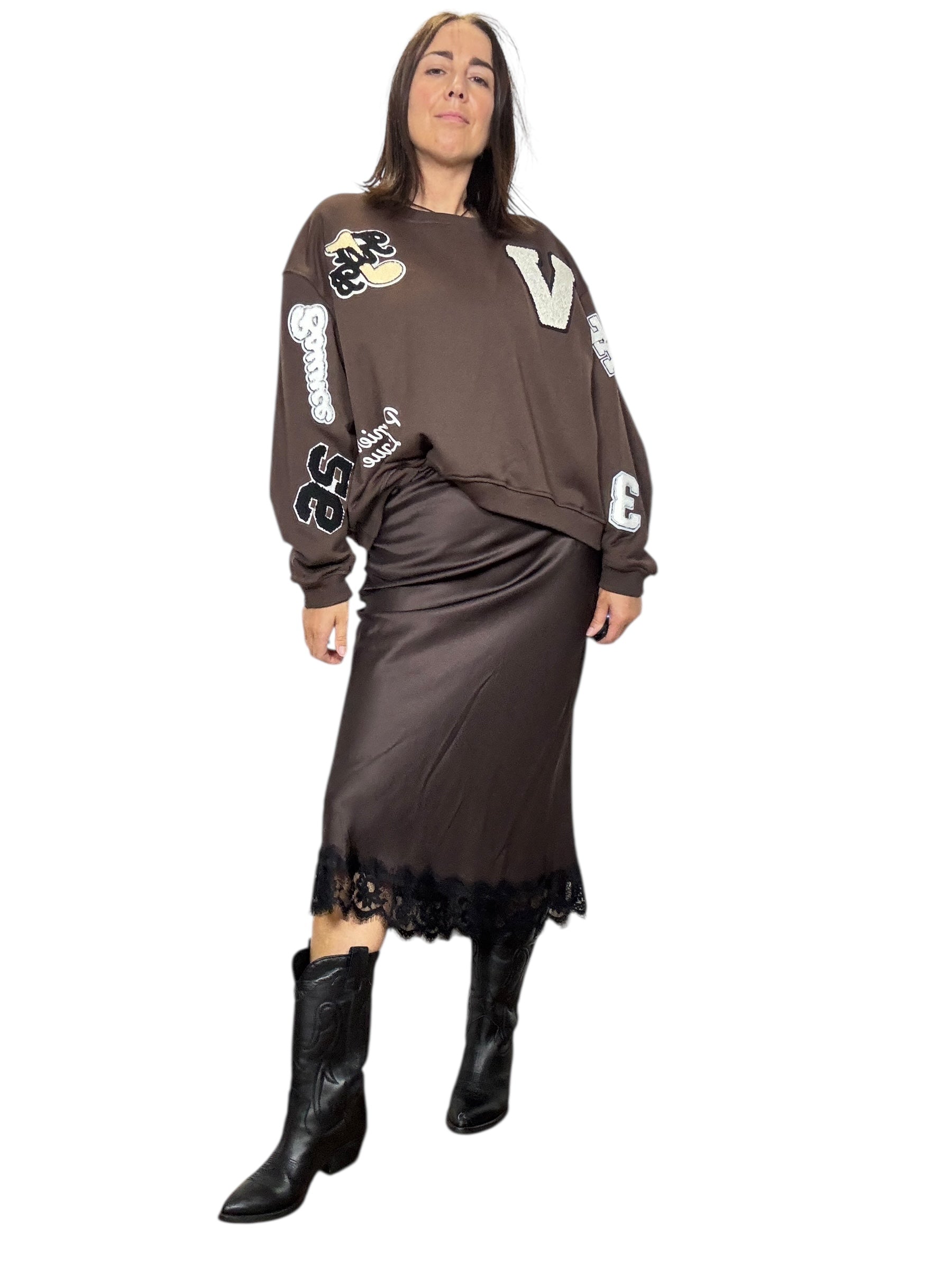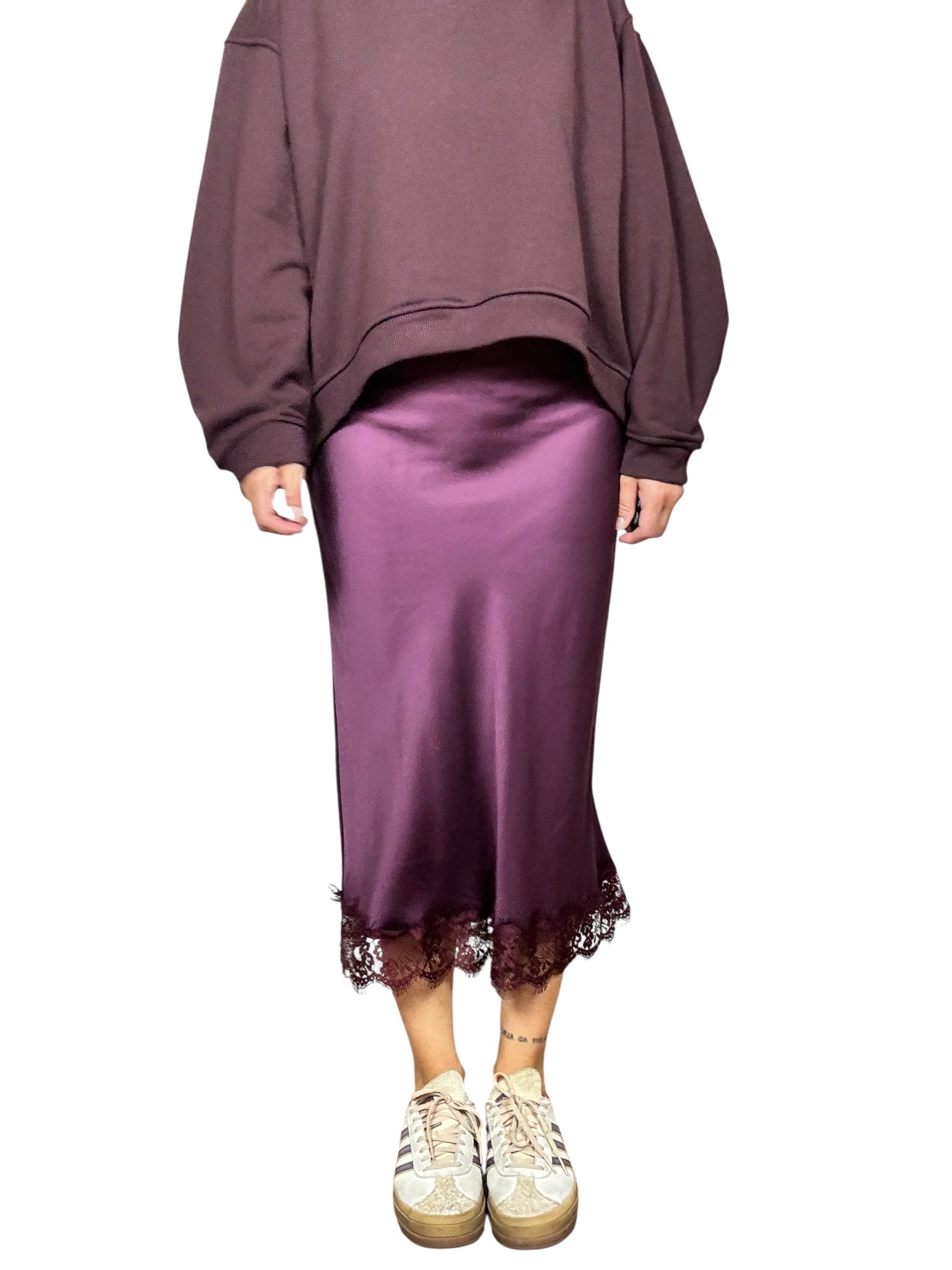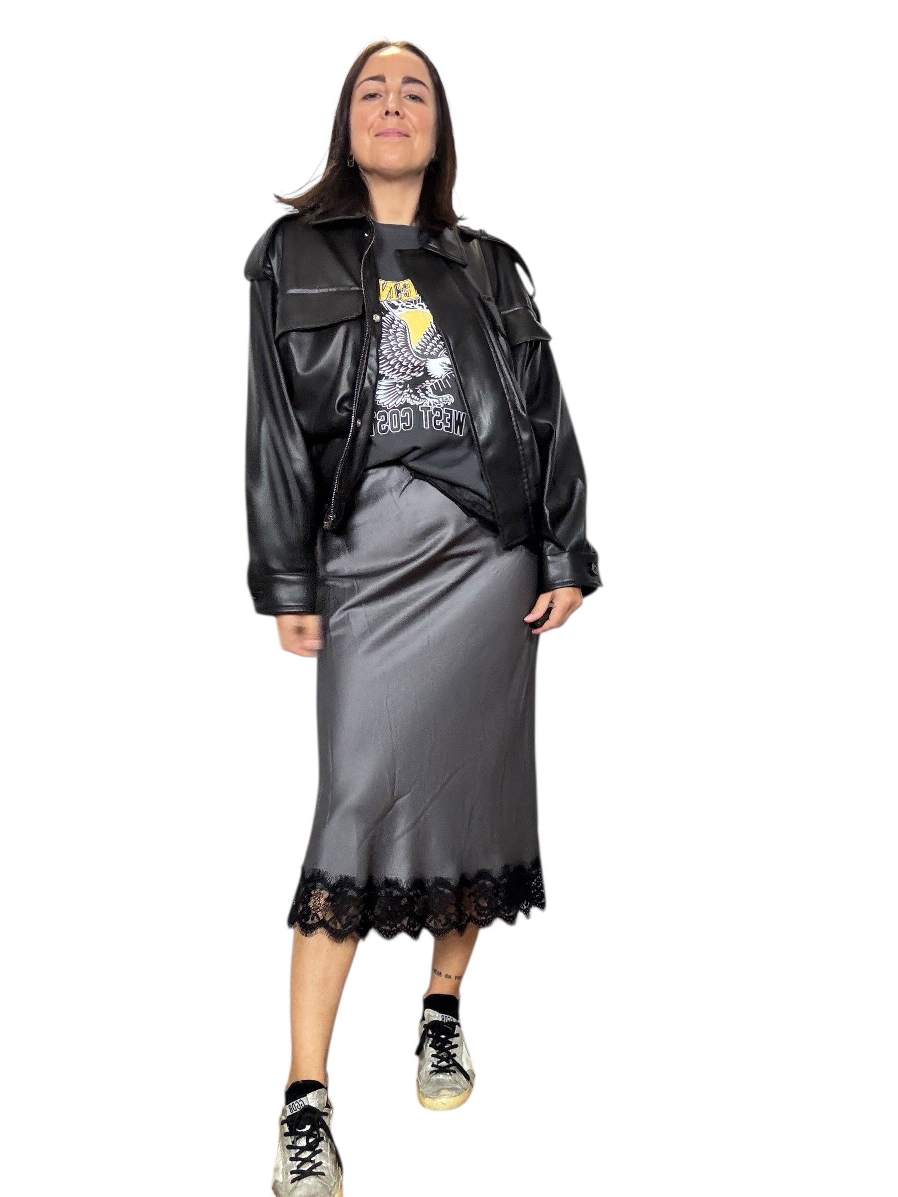 Gonna a vita alta con elastico in cintura ed inserto in pizzo sul fondo, lunghezza midi (tg in foto S)