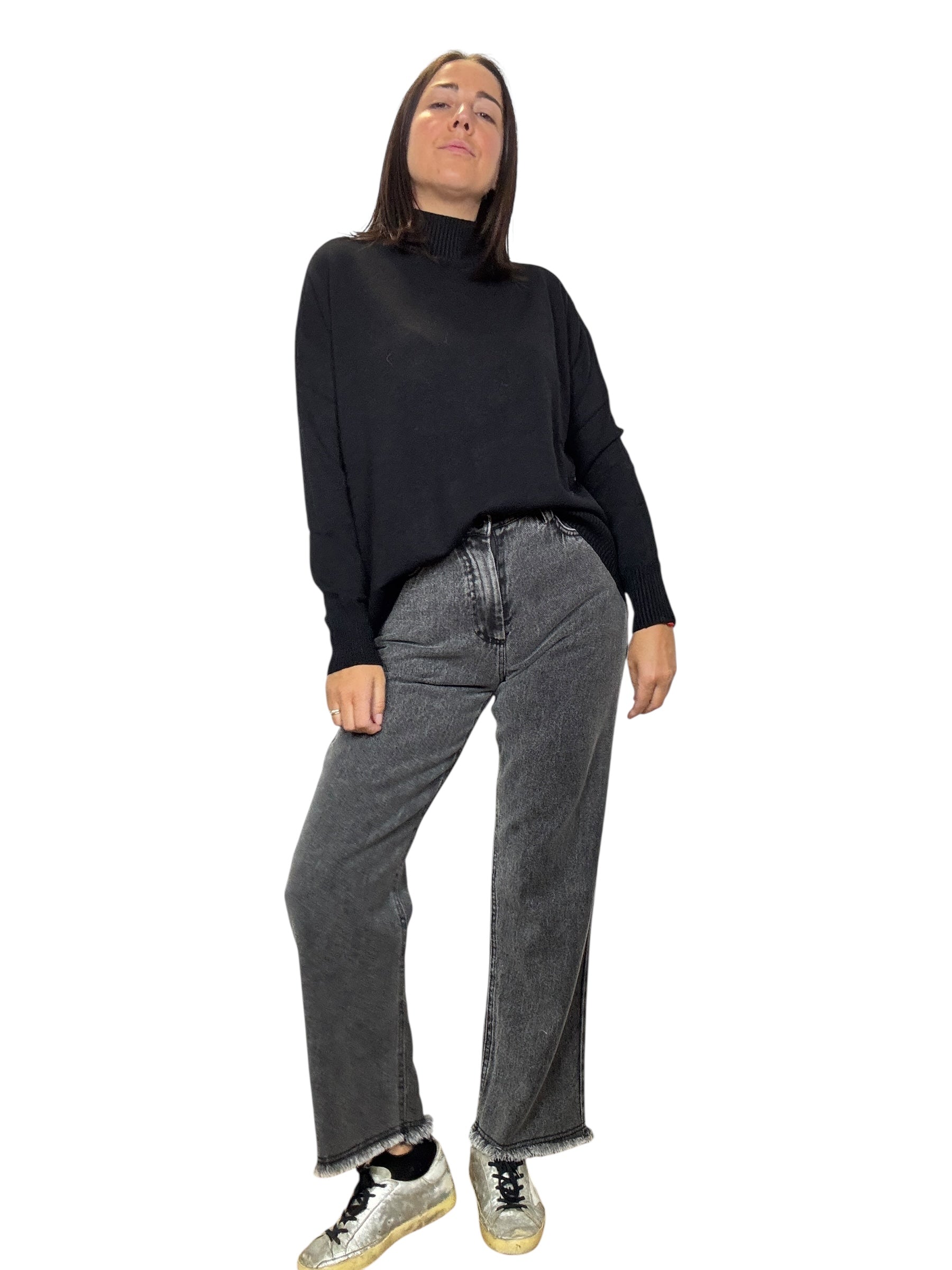 Jeans a vita alta con tasche laterali e posteriori, chiusura con zip e bottone frontale. Modello a gamba asciutta sfrangiato sotto. Non elasticizzato (tg in foto XS)