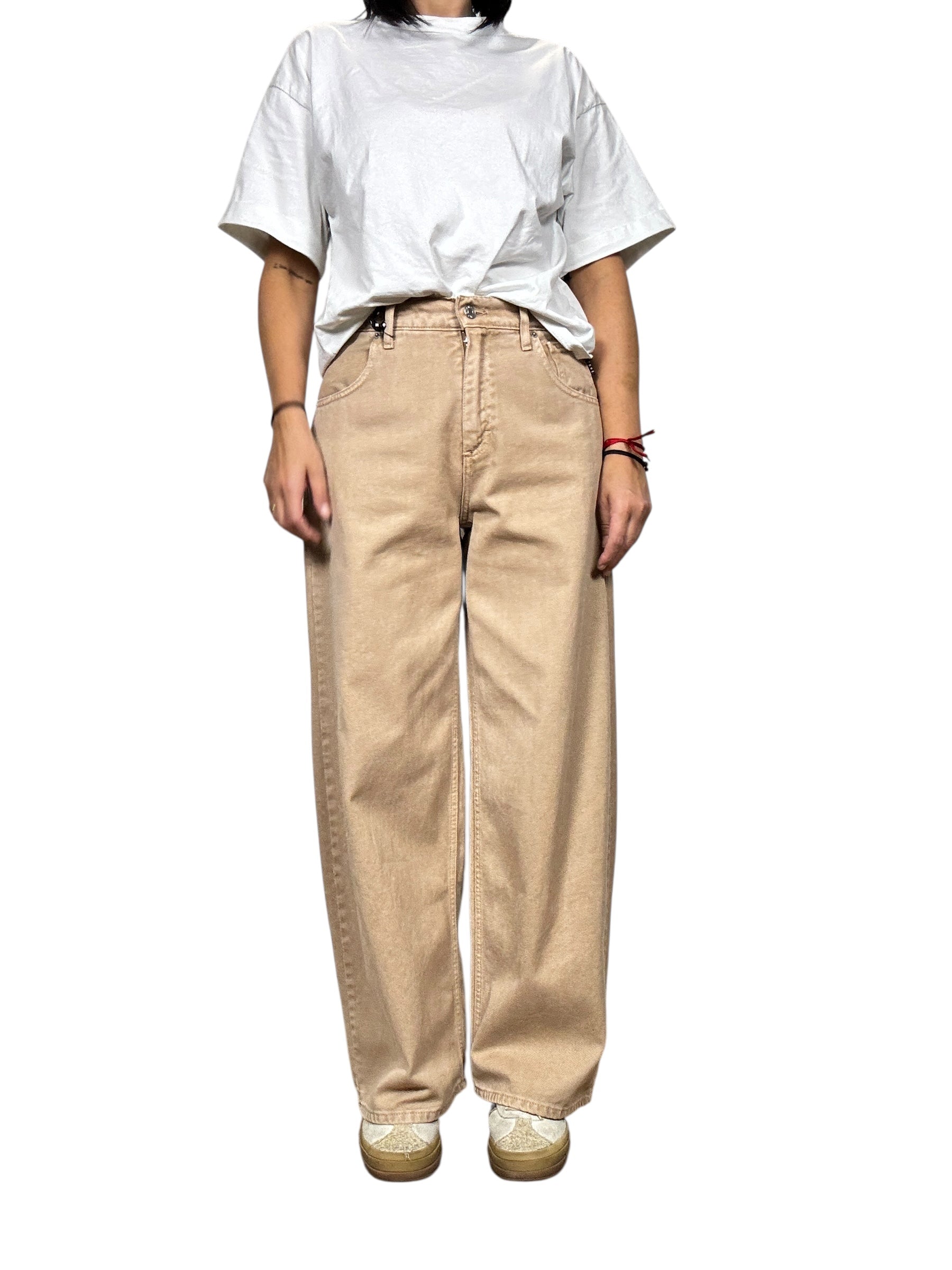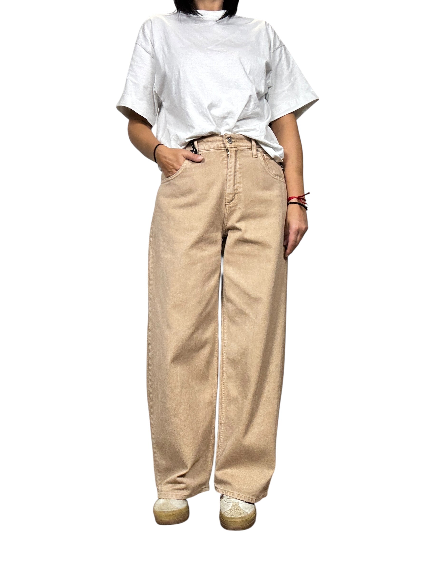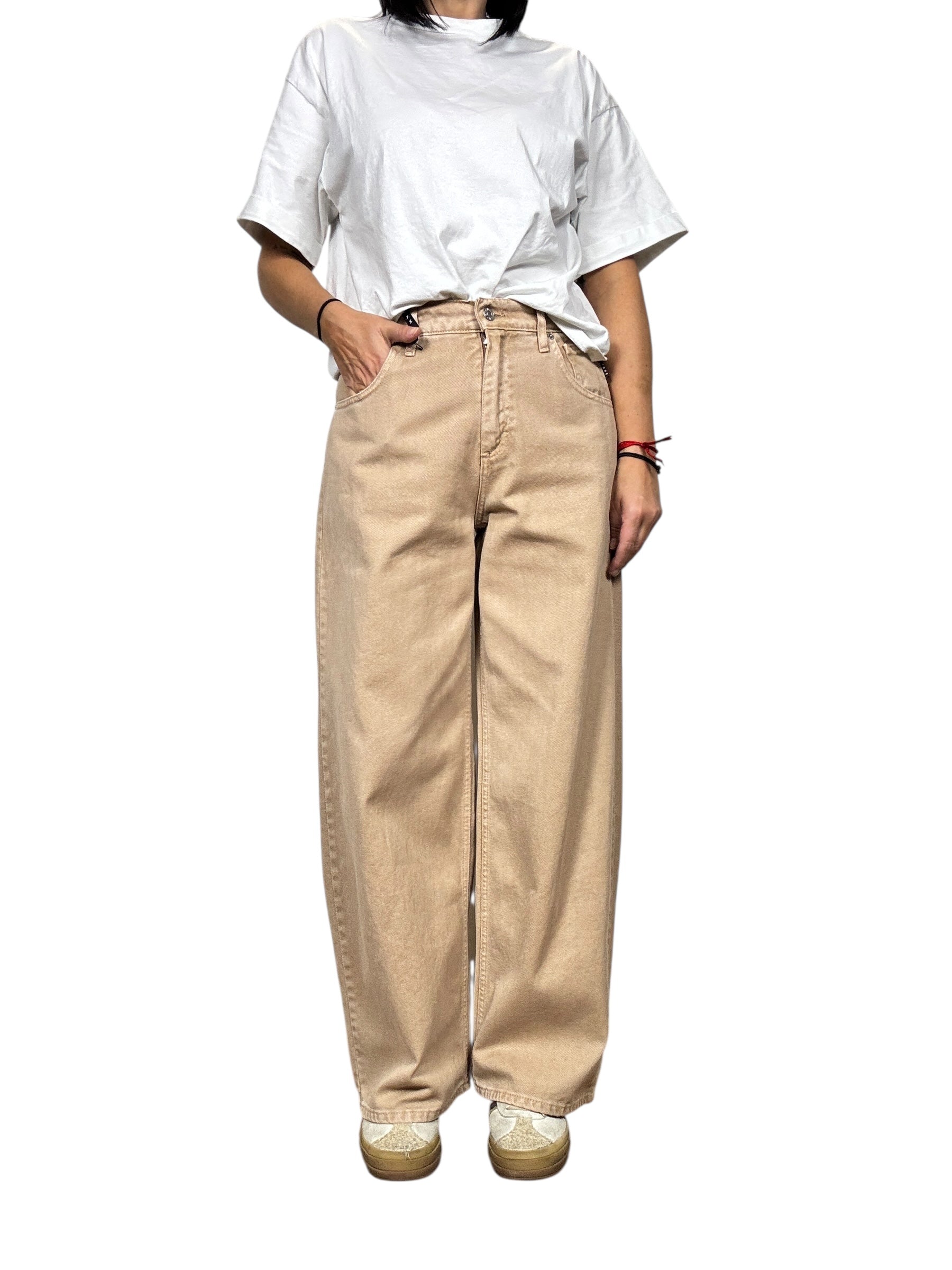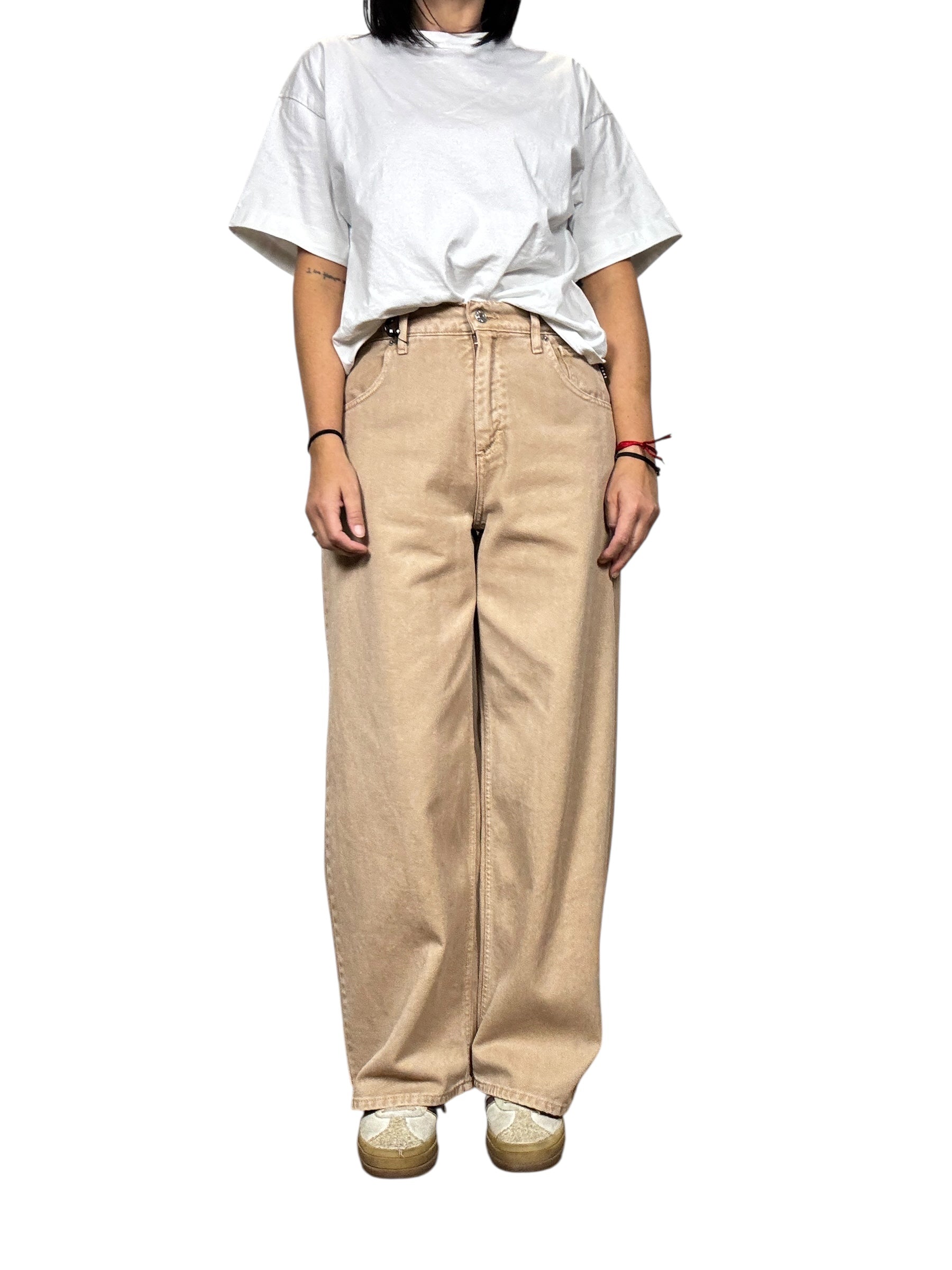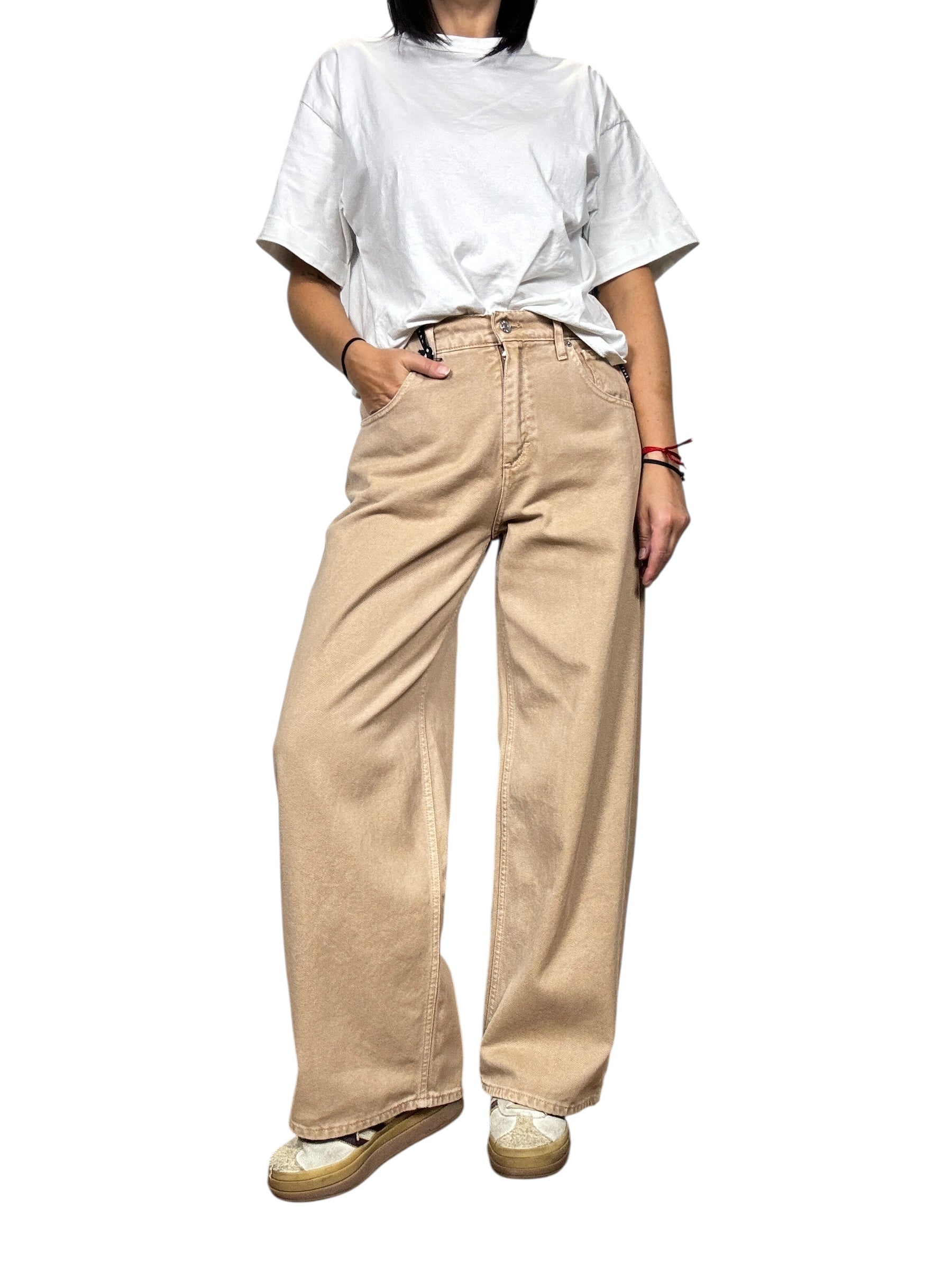 Jeans a vita alta con tasche laterali e posteriori, chiusura con bottone e zip frontale. Modello con gamba a palazzo, tessuto non elasticizzato (tg in foto S vestibilità comoda)