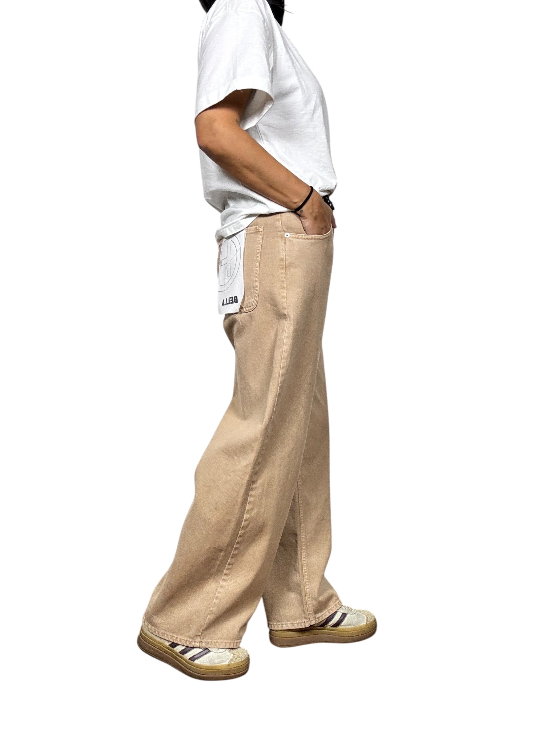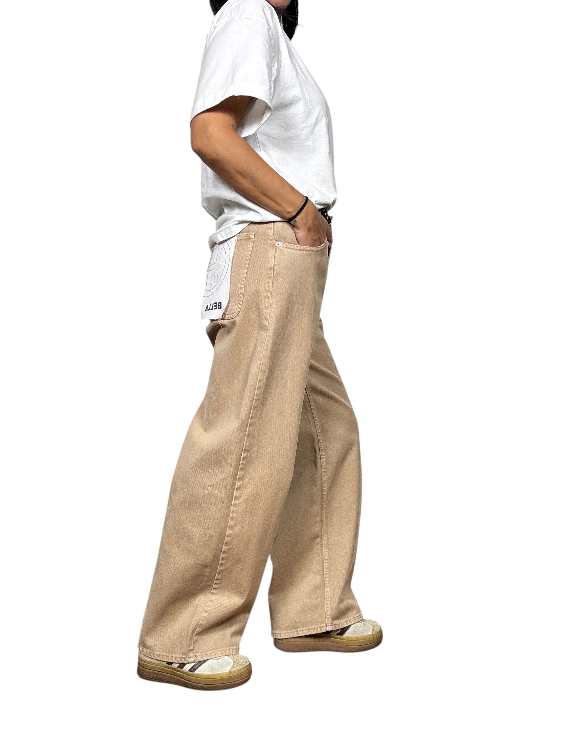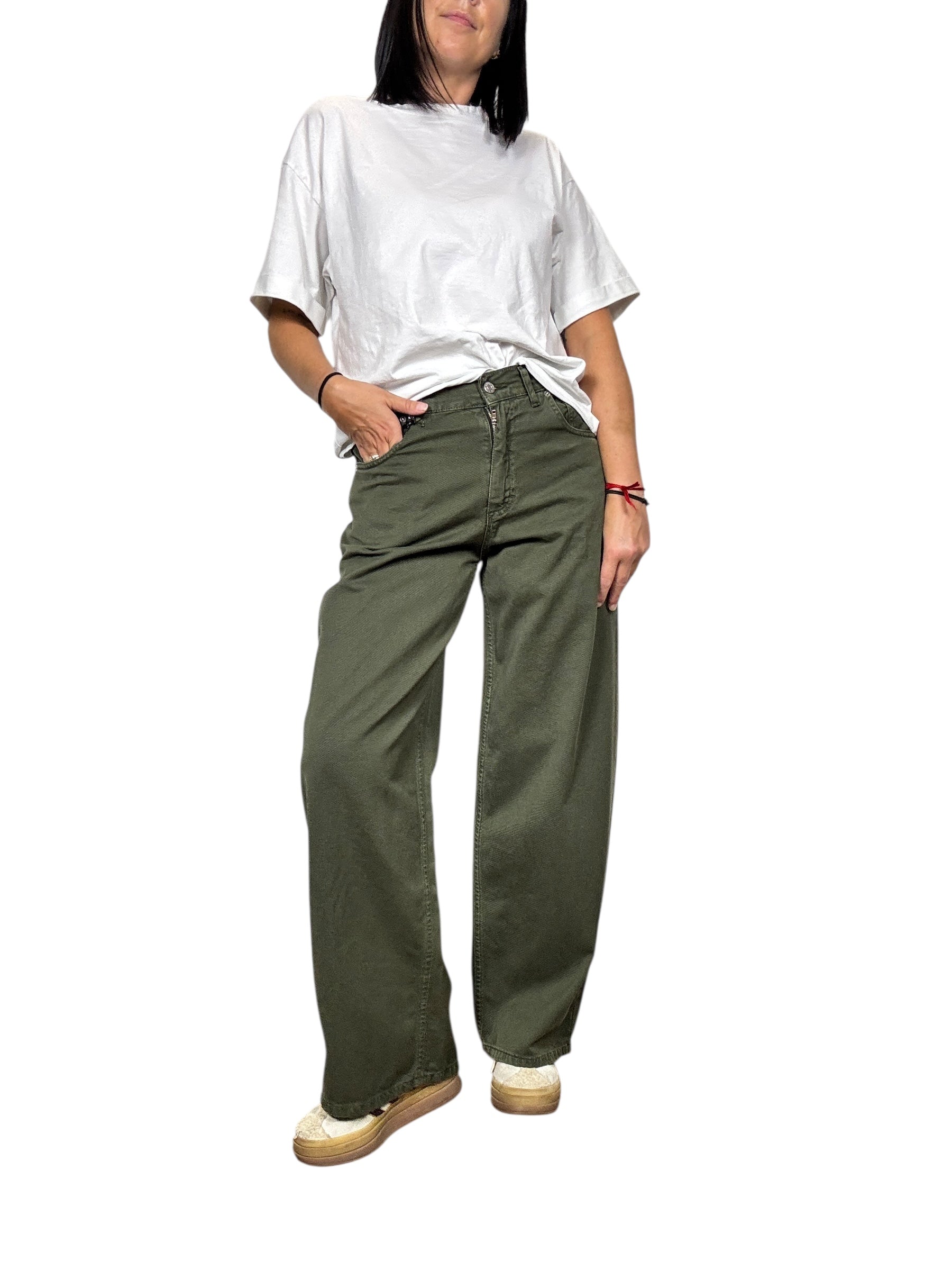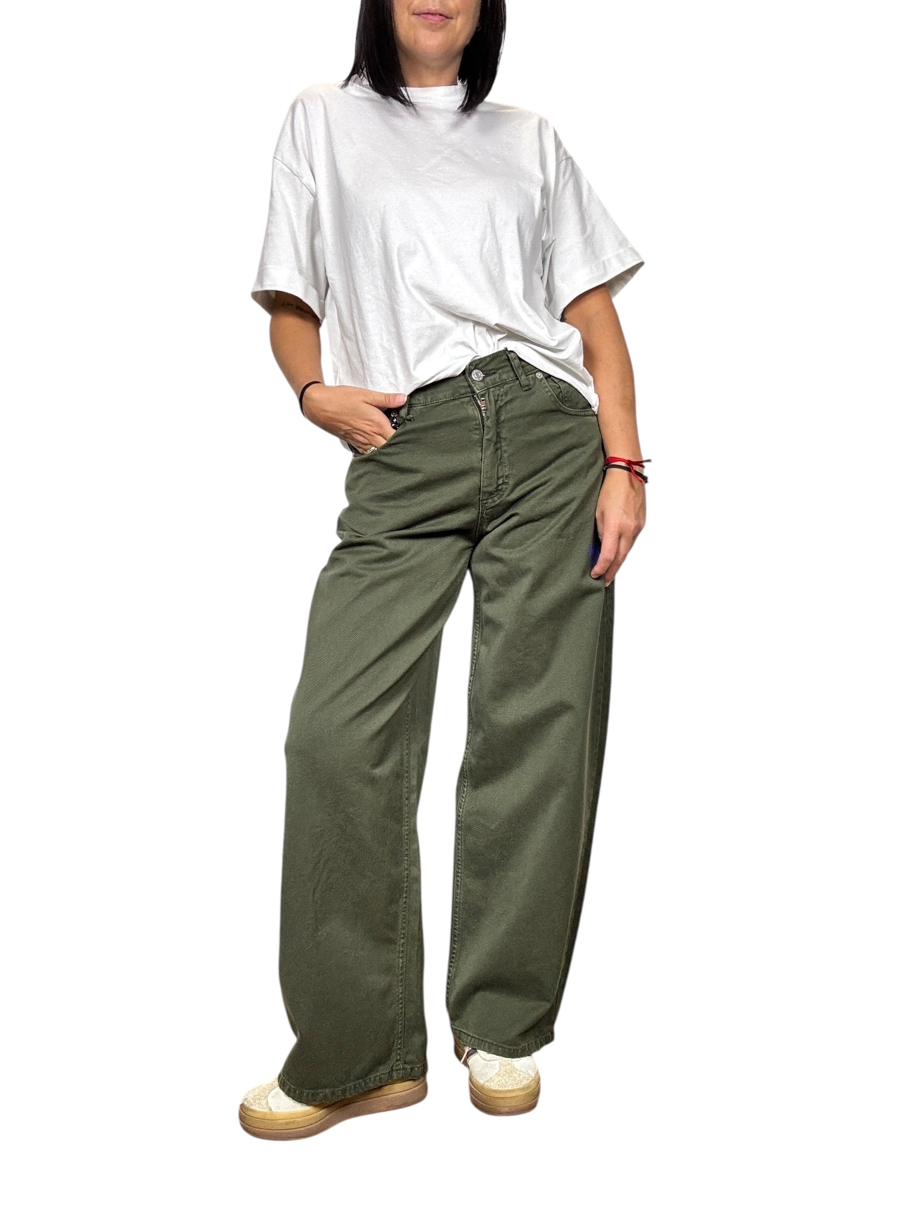 Jeans a vita alta con tasche laterali e posteriori, chiusura con bottone e zip frontale. Modello con gamba a palazzo, tessuto non elasticizzato (tg in foto S vestibilità comoda)