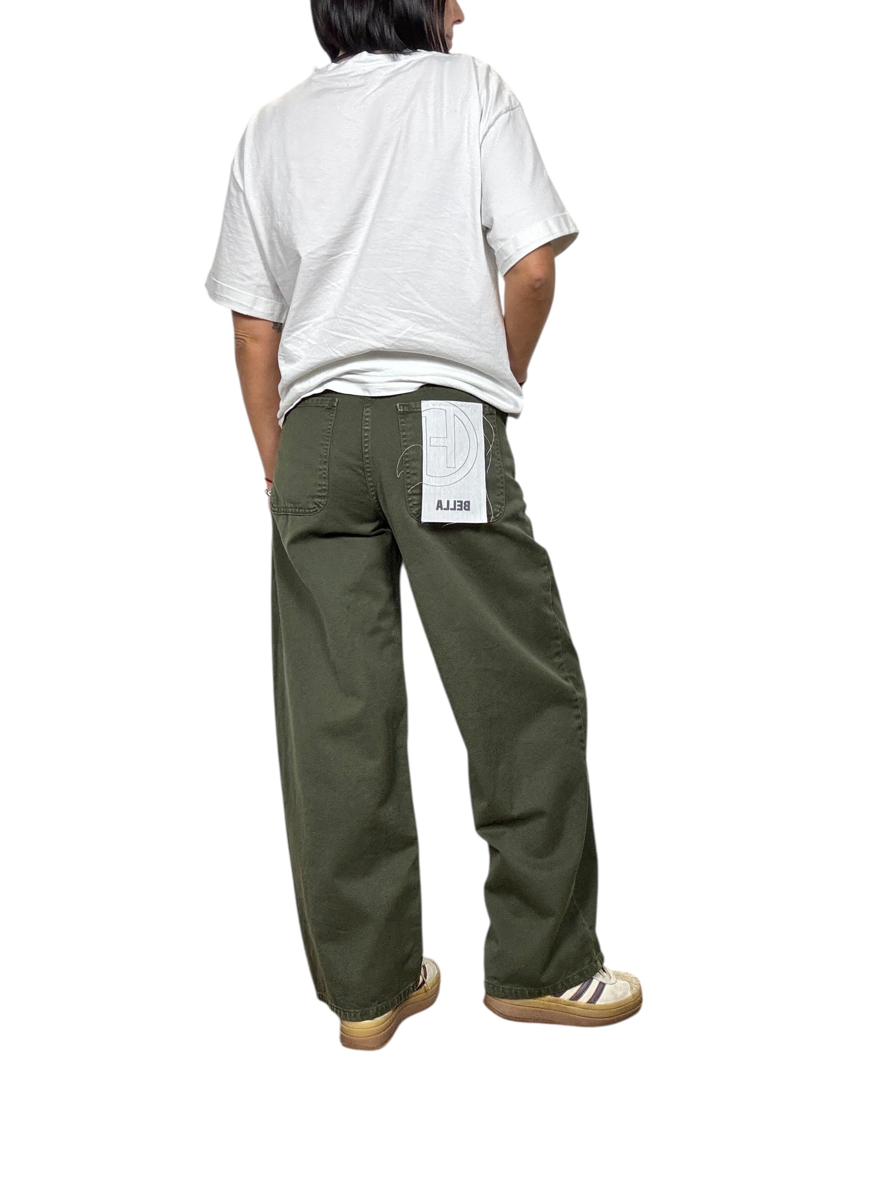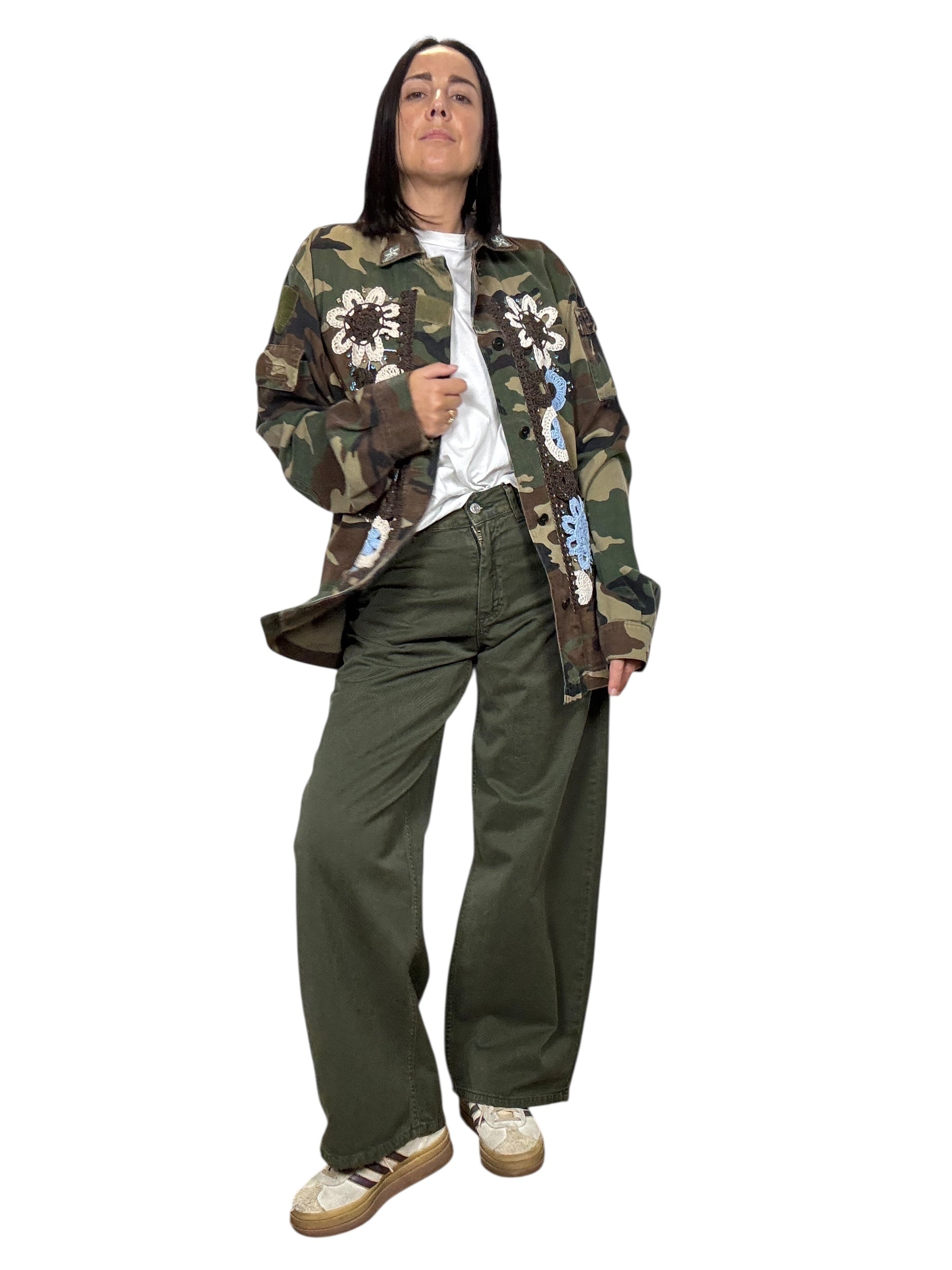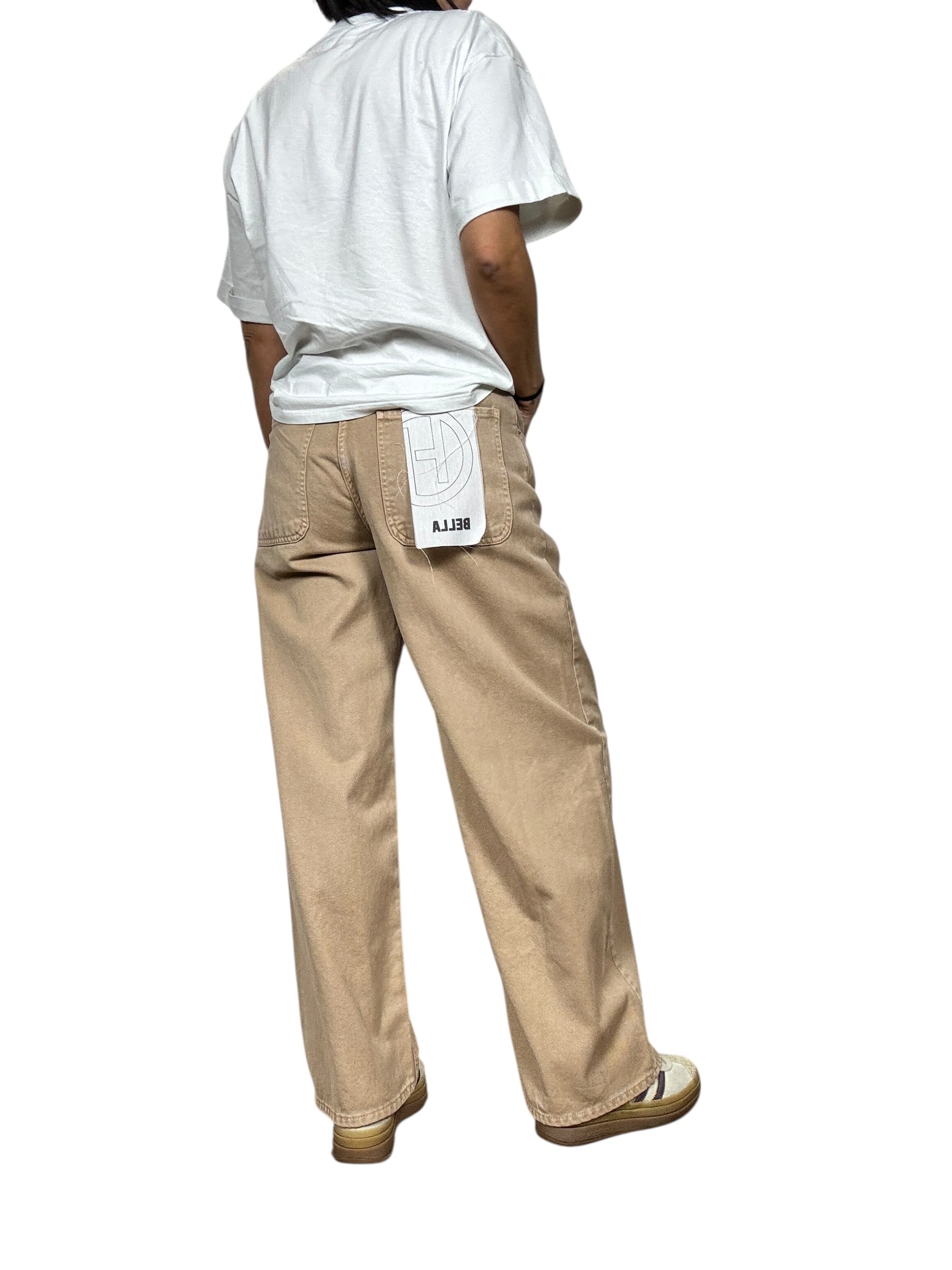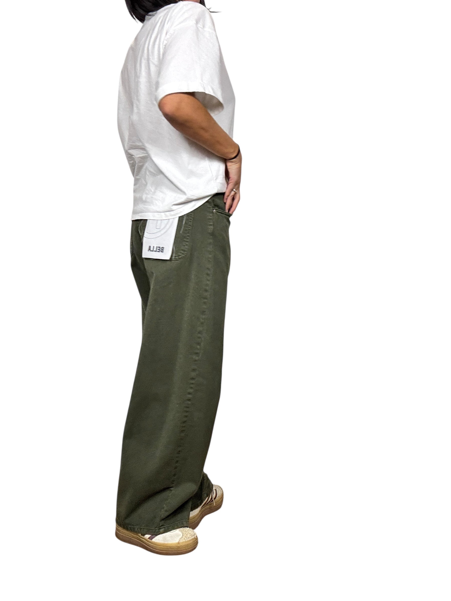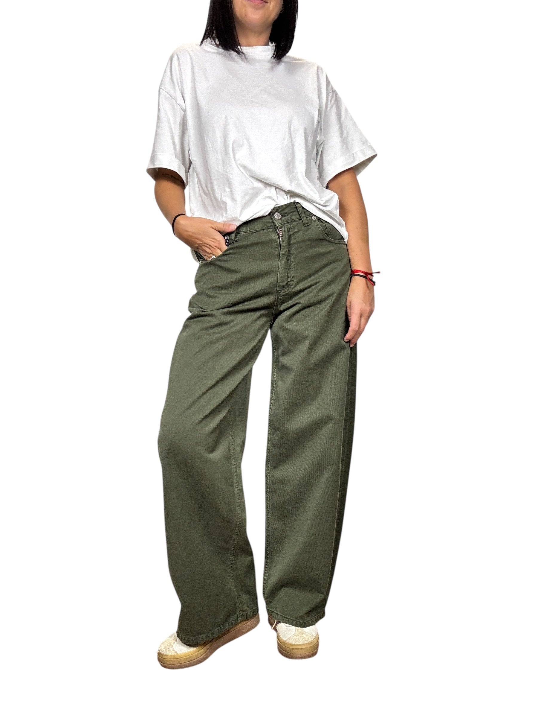 Jeans a vita alta con tasche laterali e posteriori, chiusura con bottone e zip frontale. Modello con gamba a palazzo, tessuto non elasticizzato (tg in foto S vestibilità comoda)