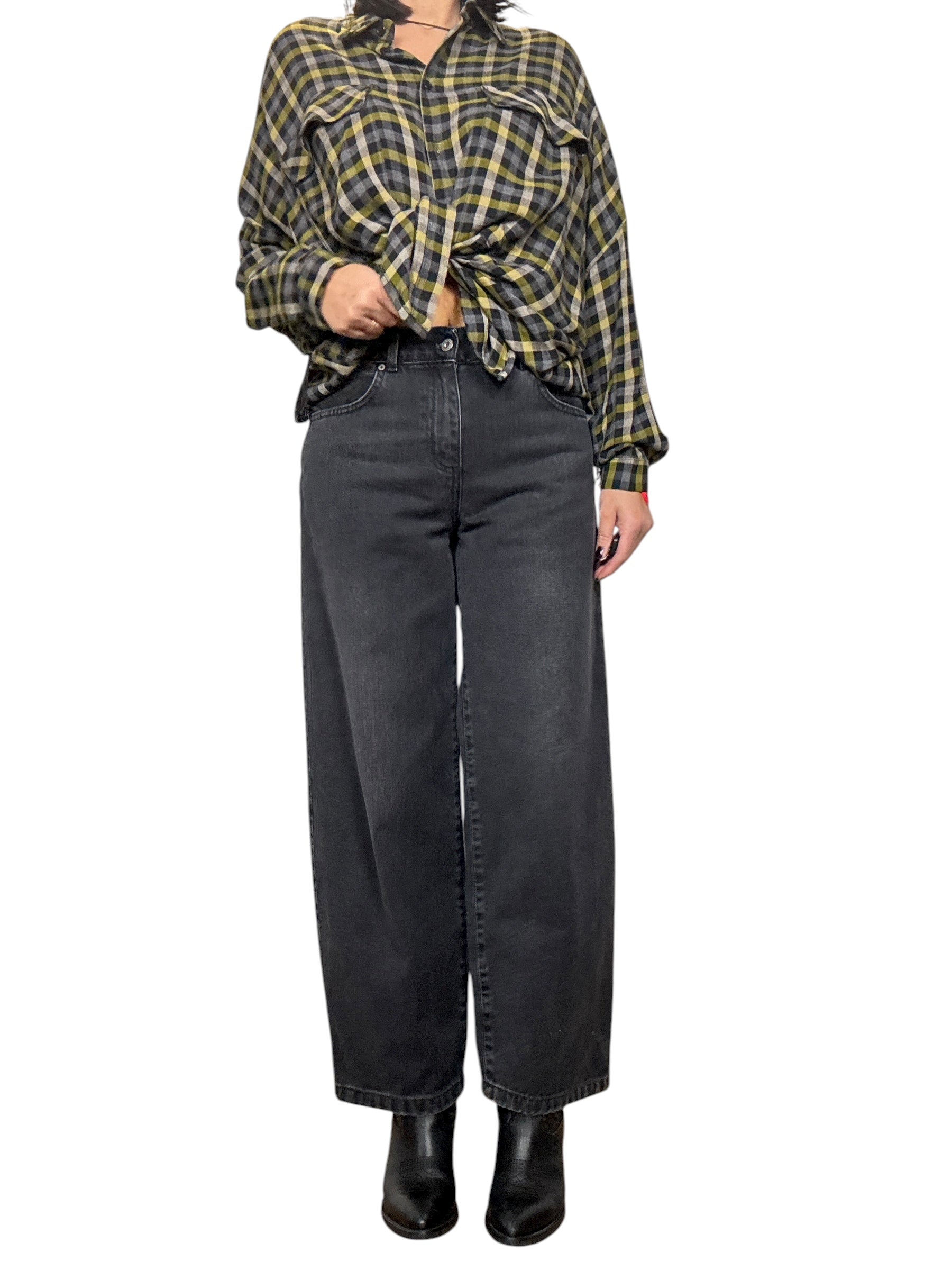 Jeans a vita alta con tasche laterali e posteriori, chiusura con zip e bottone frontale. Modello a gamba dritta e morbida, non elasticizzato
