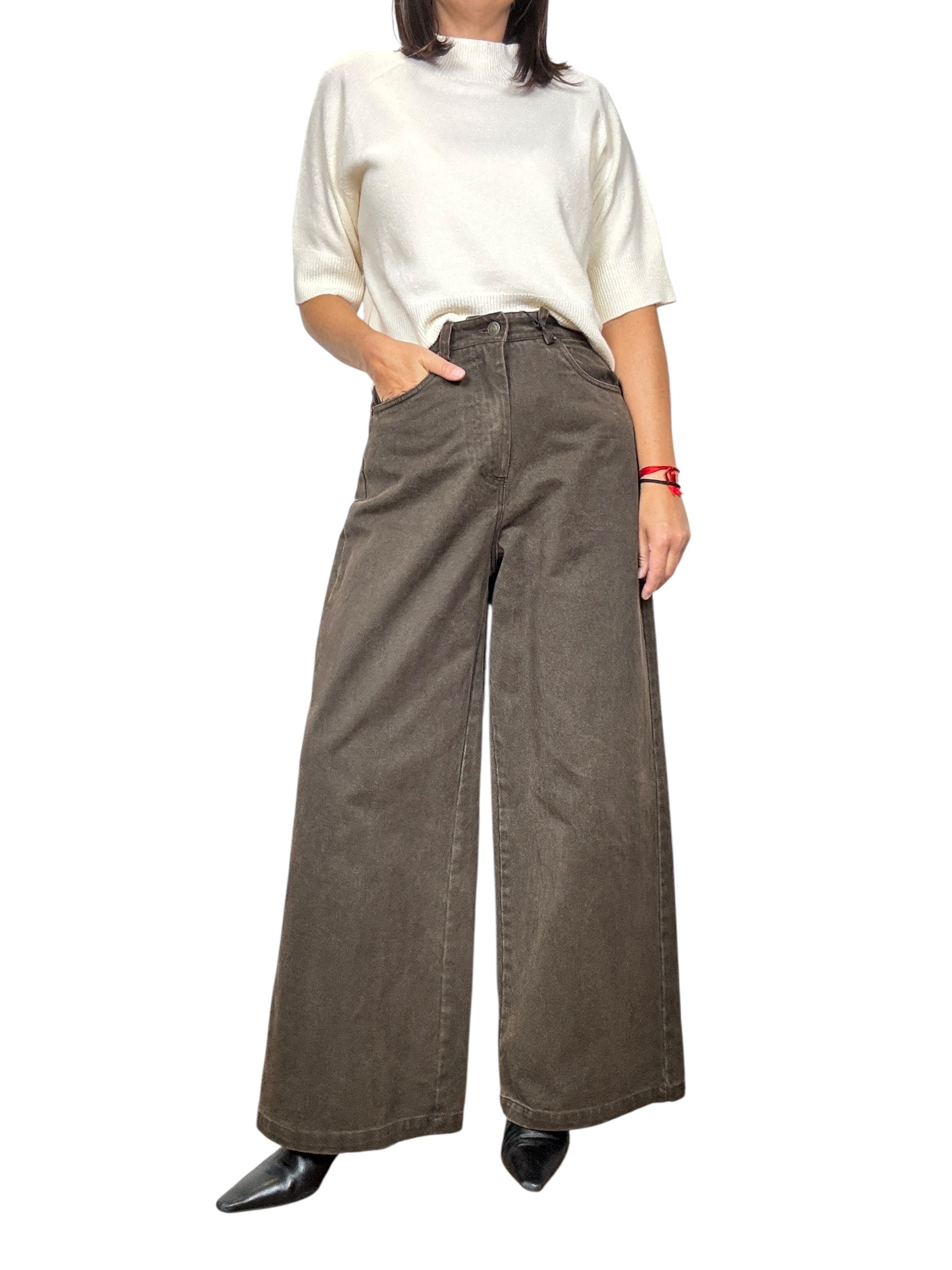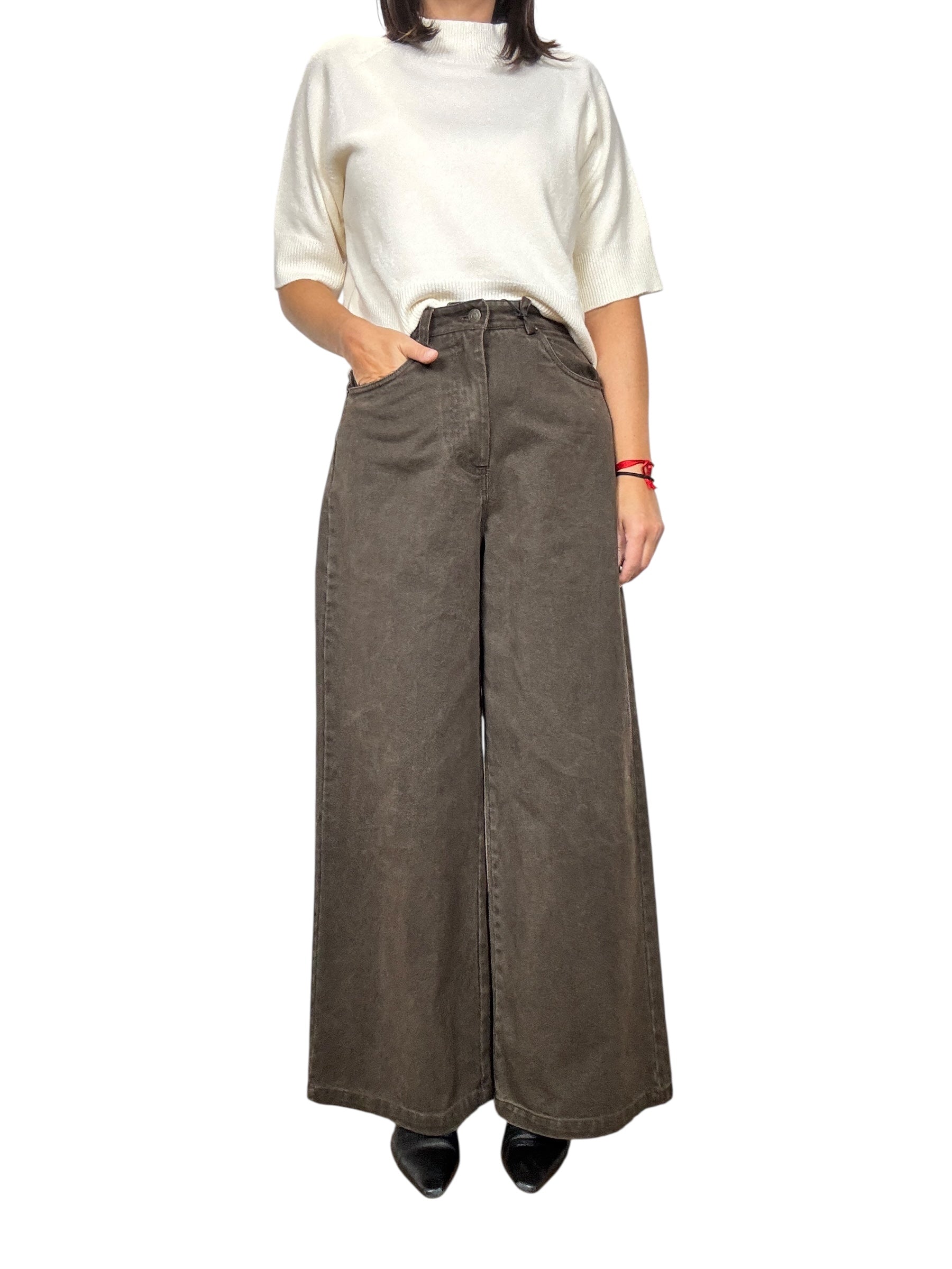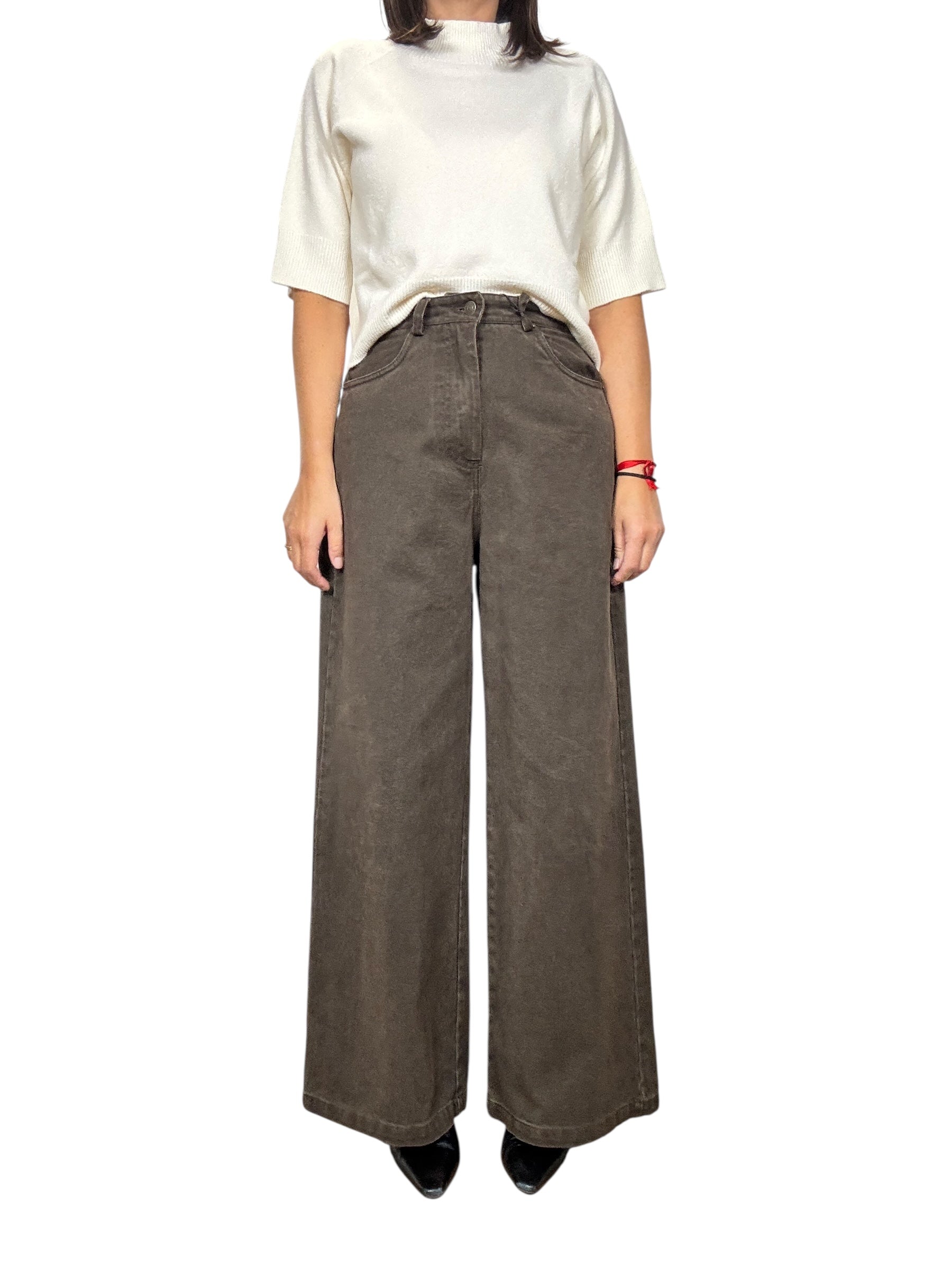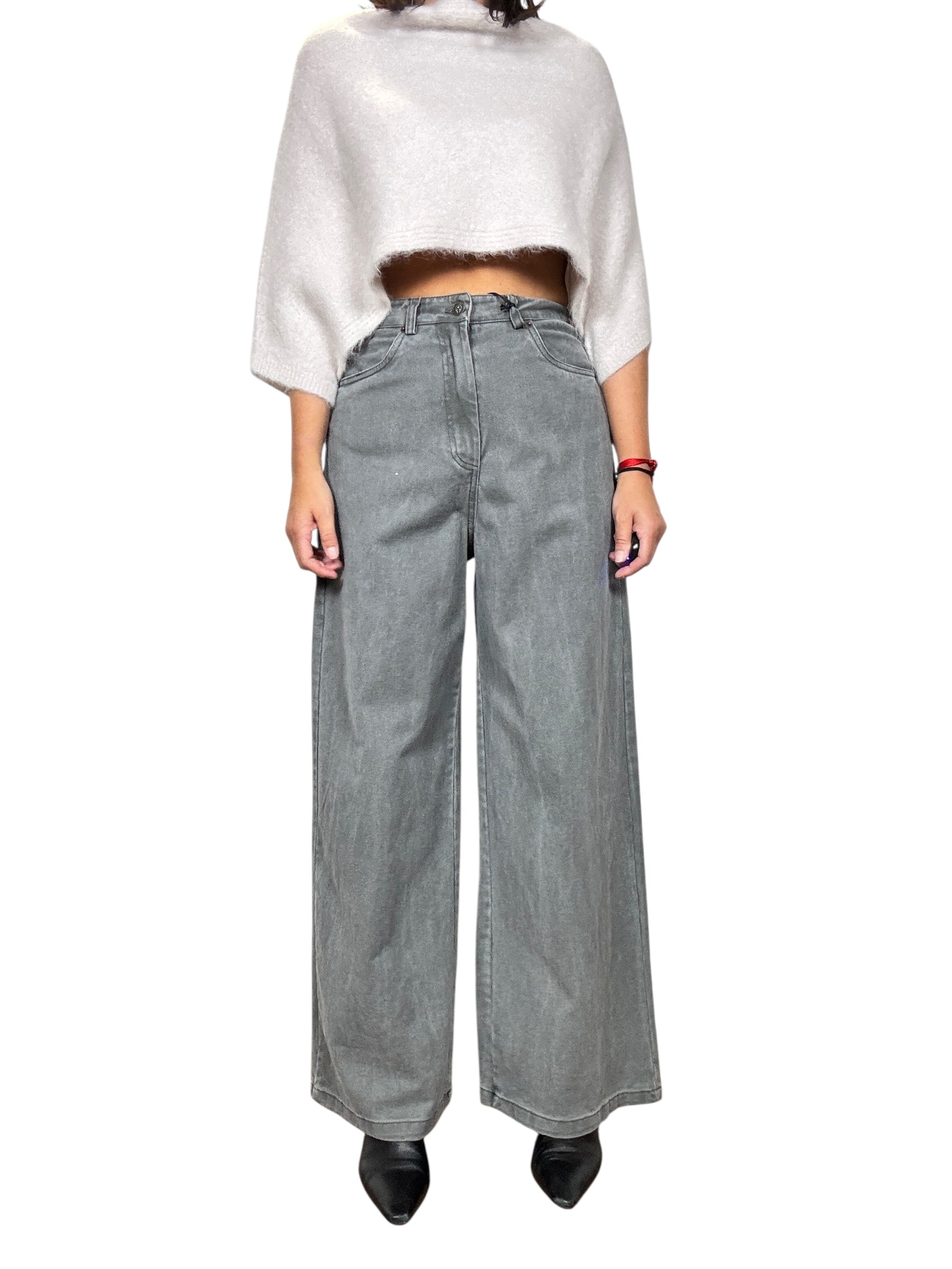 Jeans a vita alta con tasche laterali e chiusura con bottone e zip frontale. Modello a palazzo con dettaglio tasca profonda sul retro. Non elasticizzato (tg in foto XS)