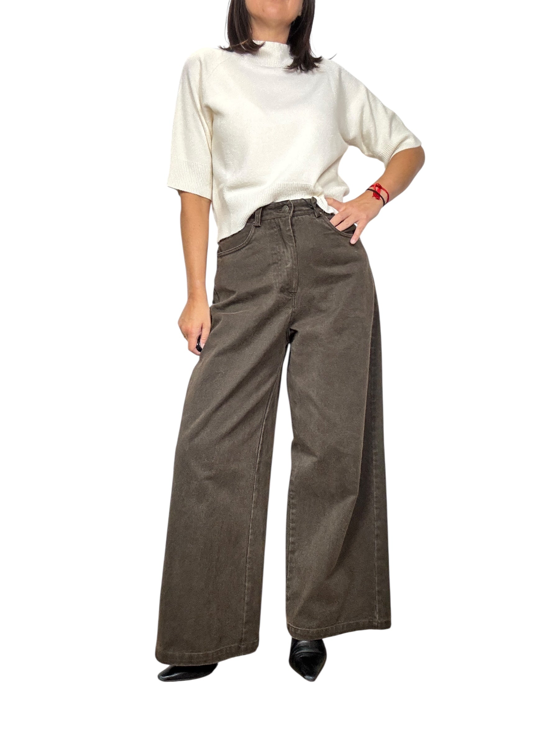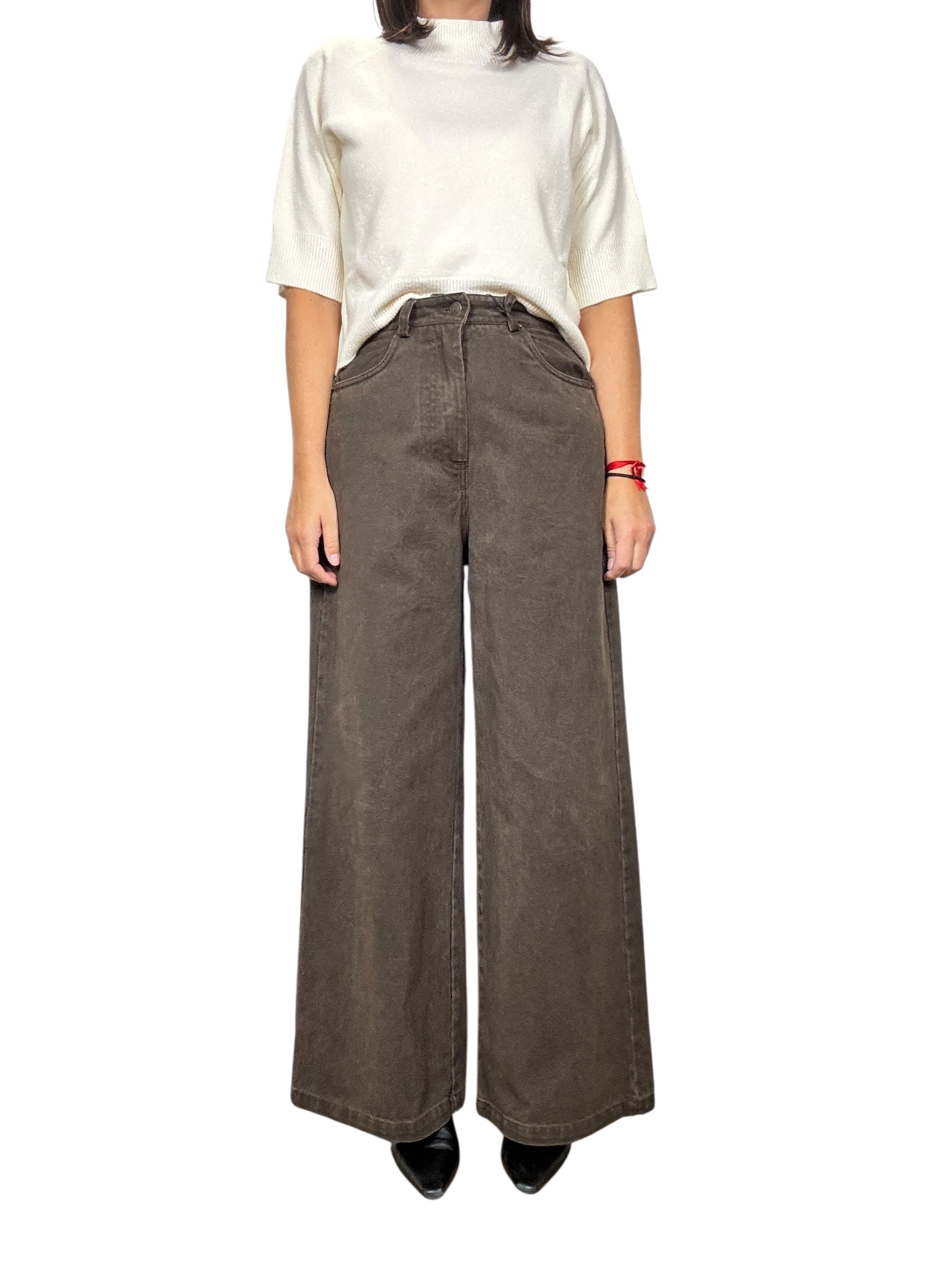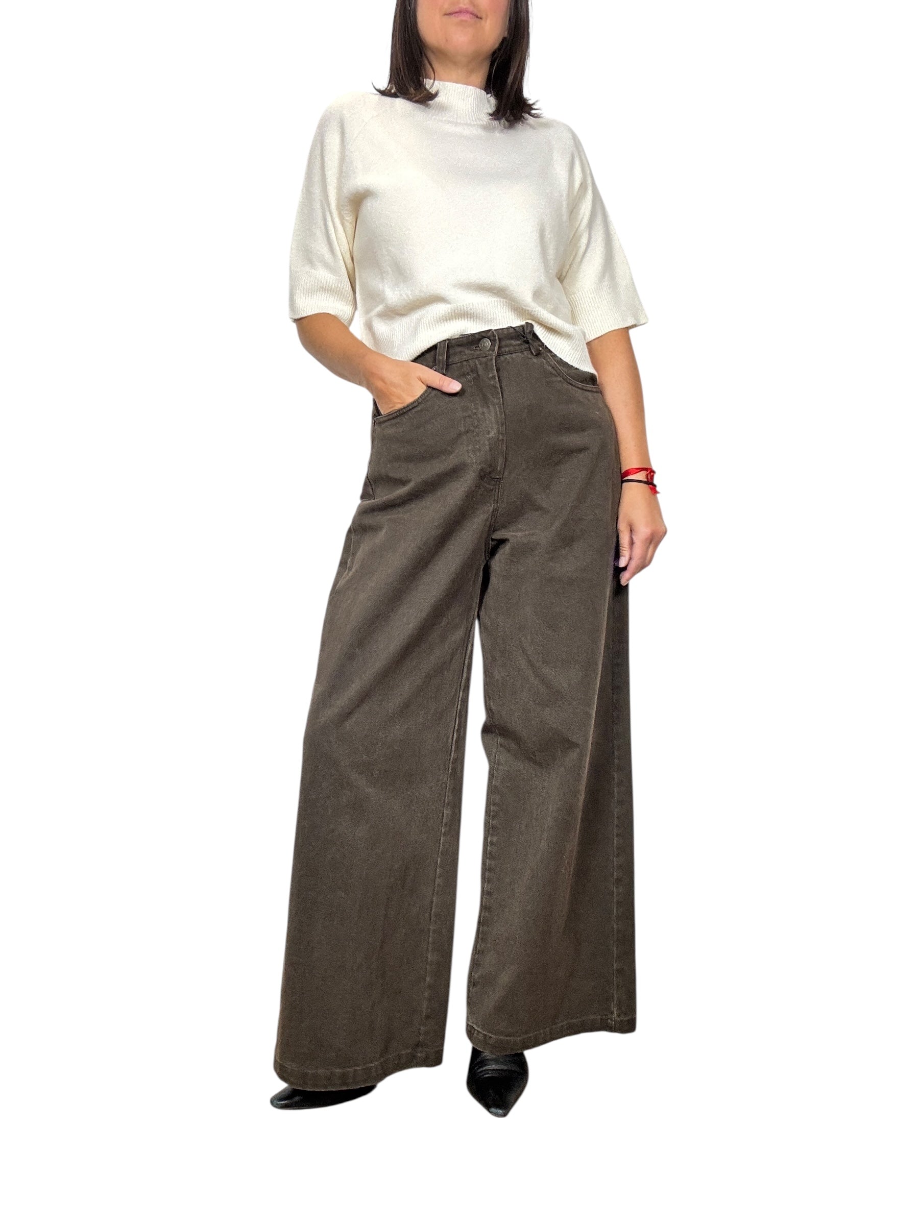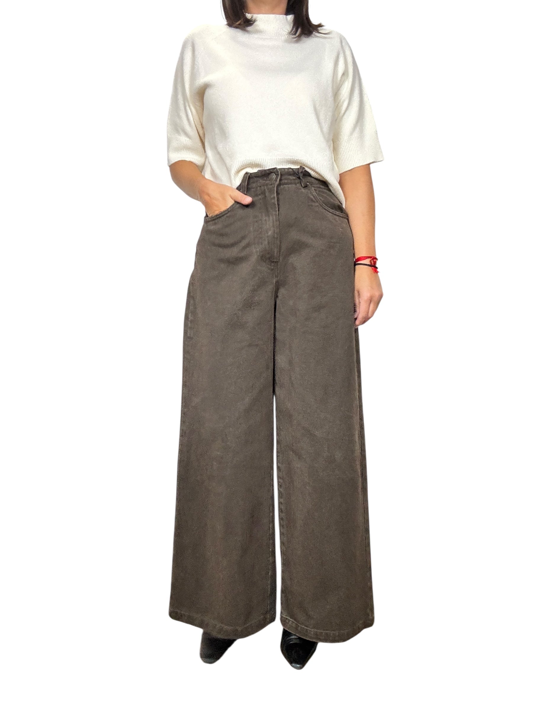 Jeans a vita alta con tasche laterali e chiusura con bottone e zip frontale. Modello a palazzo con dettaglio tasca profonda sul retro. Non elasticizzato (tg in foto XS)
