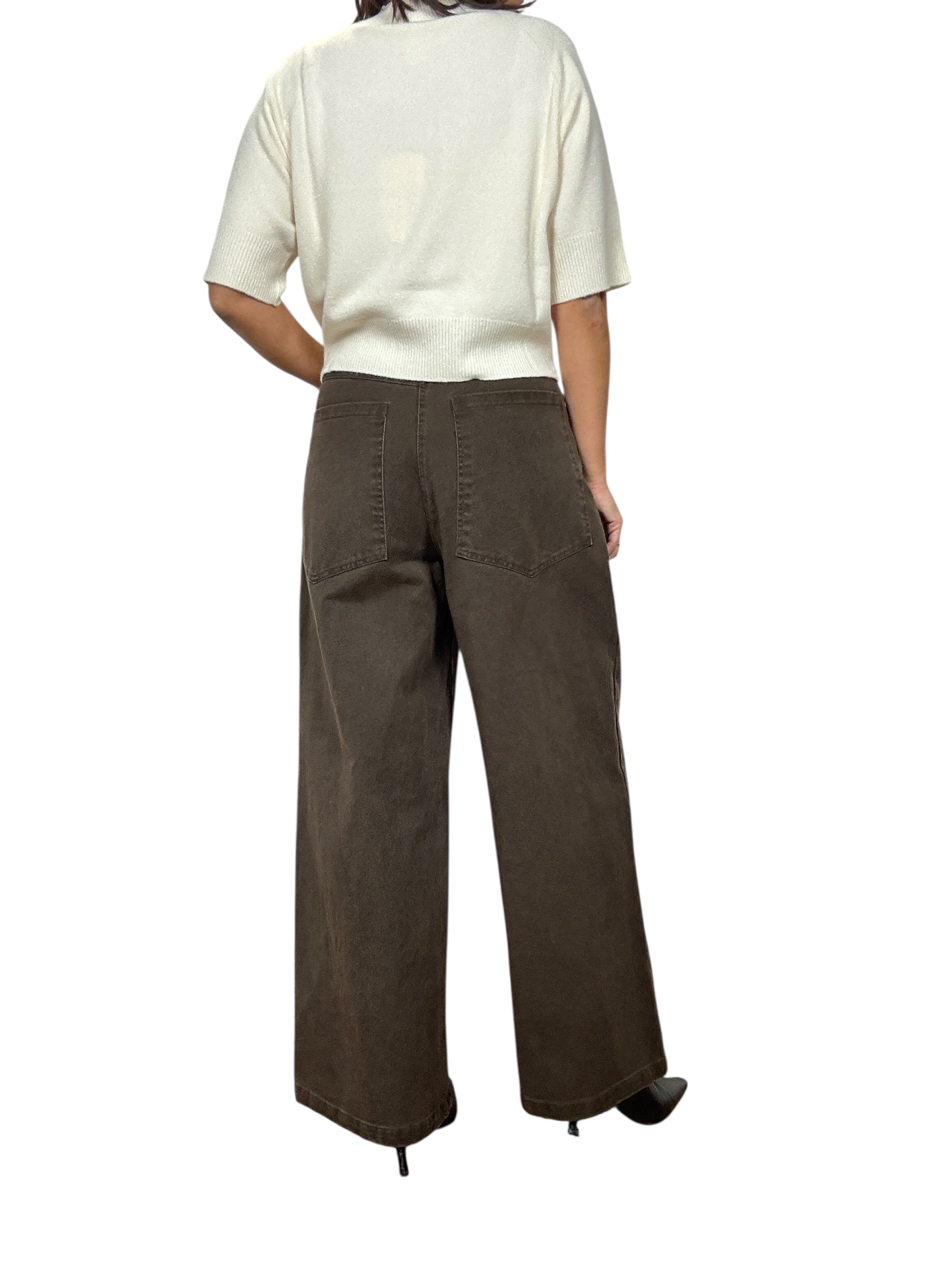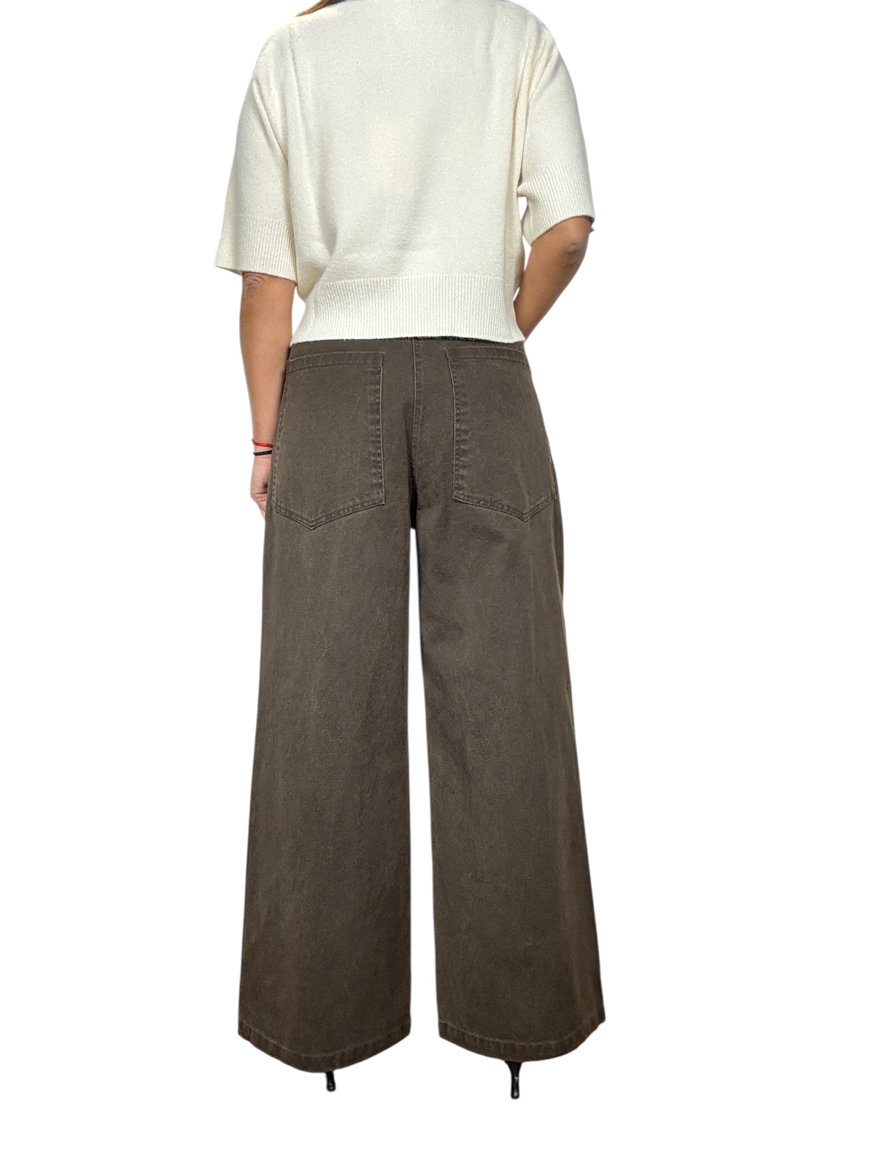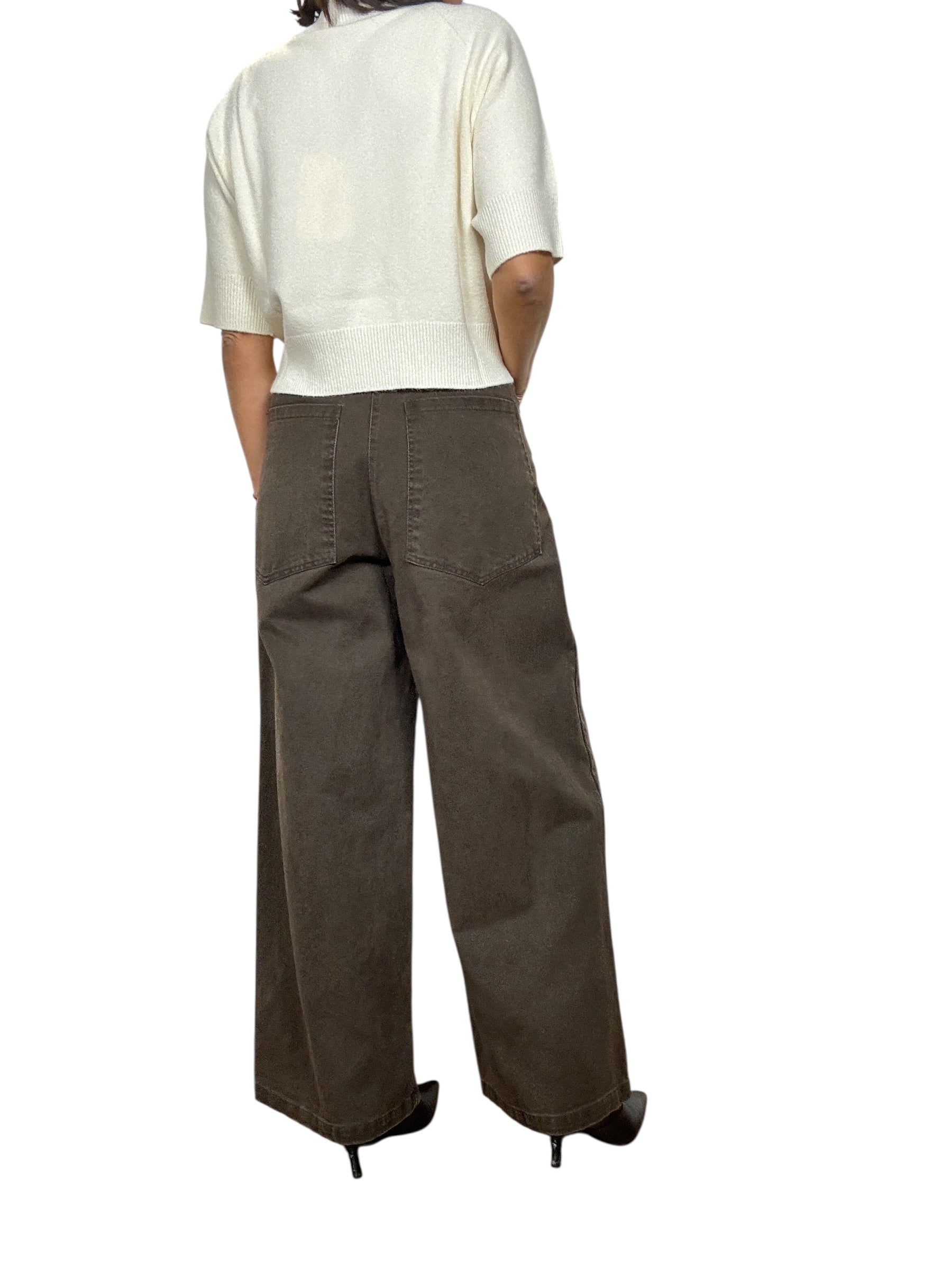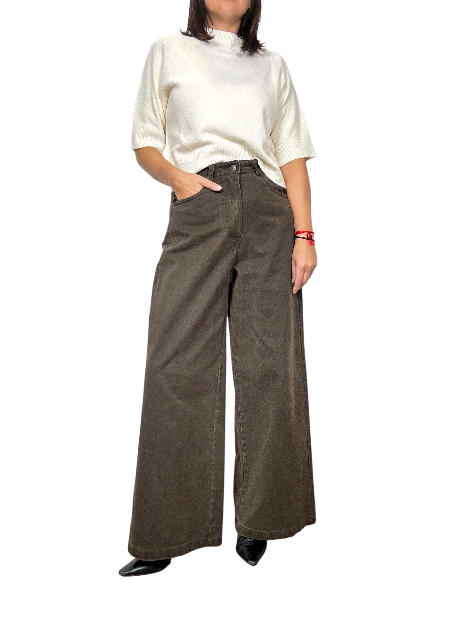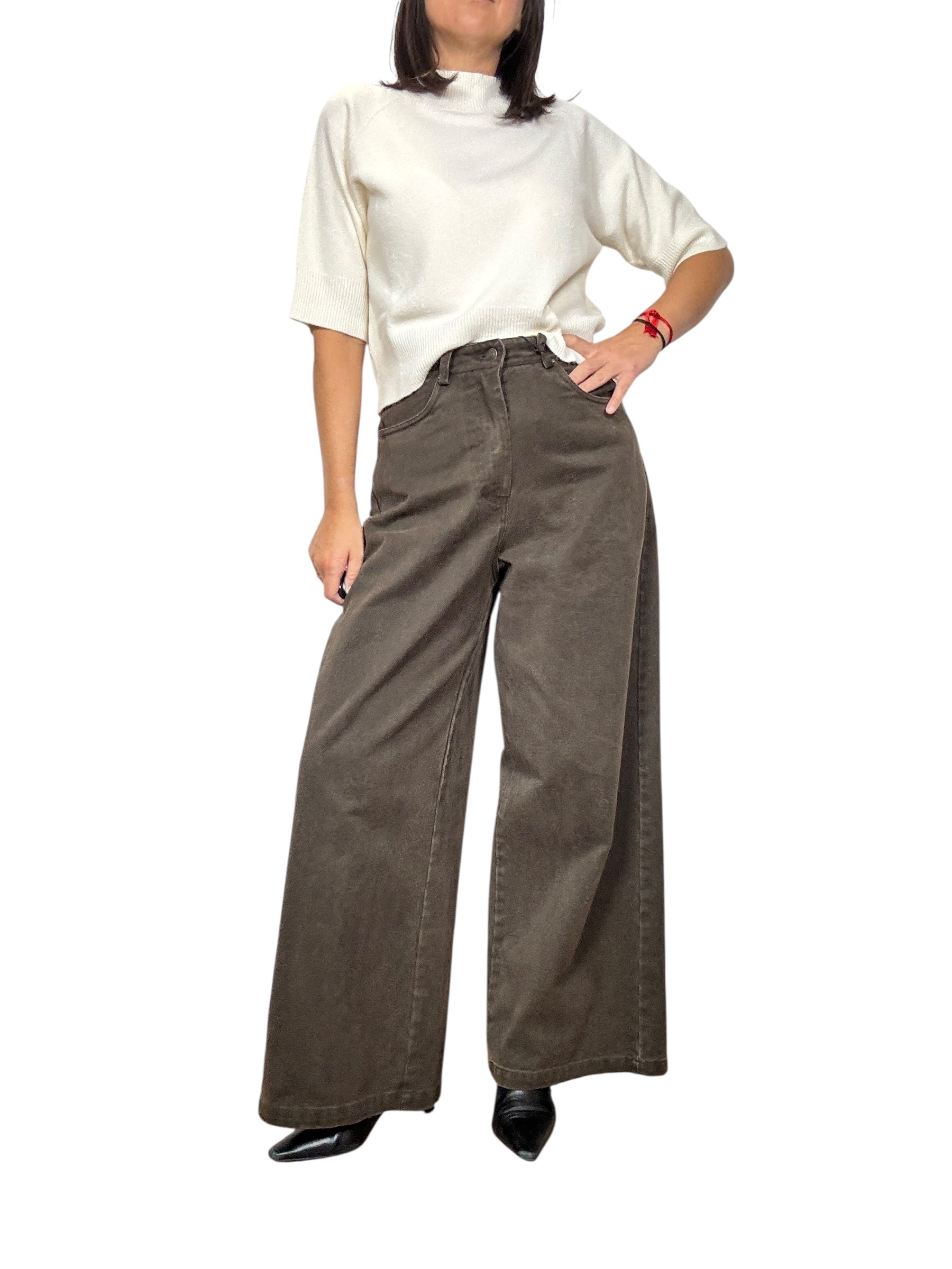 Jeans a vita alta con tasche laterali e chiusura con bottone e zip frontale. Modello a palazzo con dettaglio tasca profonda sul retro. Non elasticizzato (tg in foto XS)