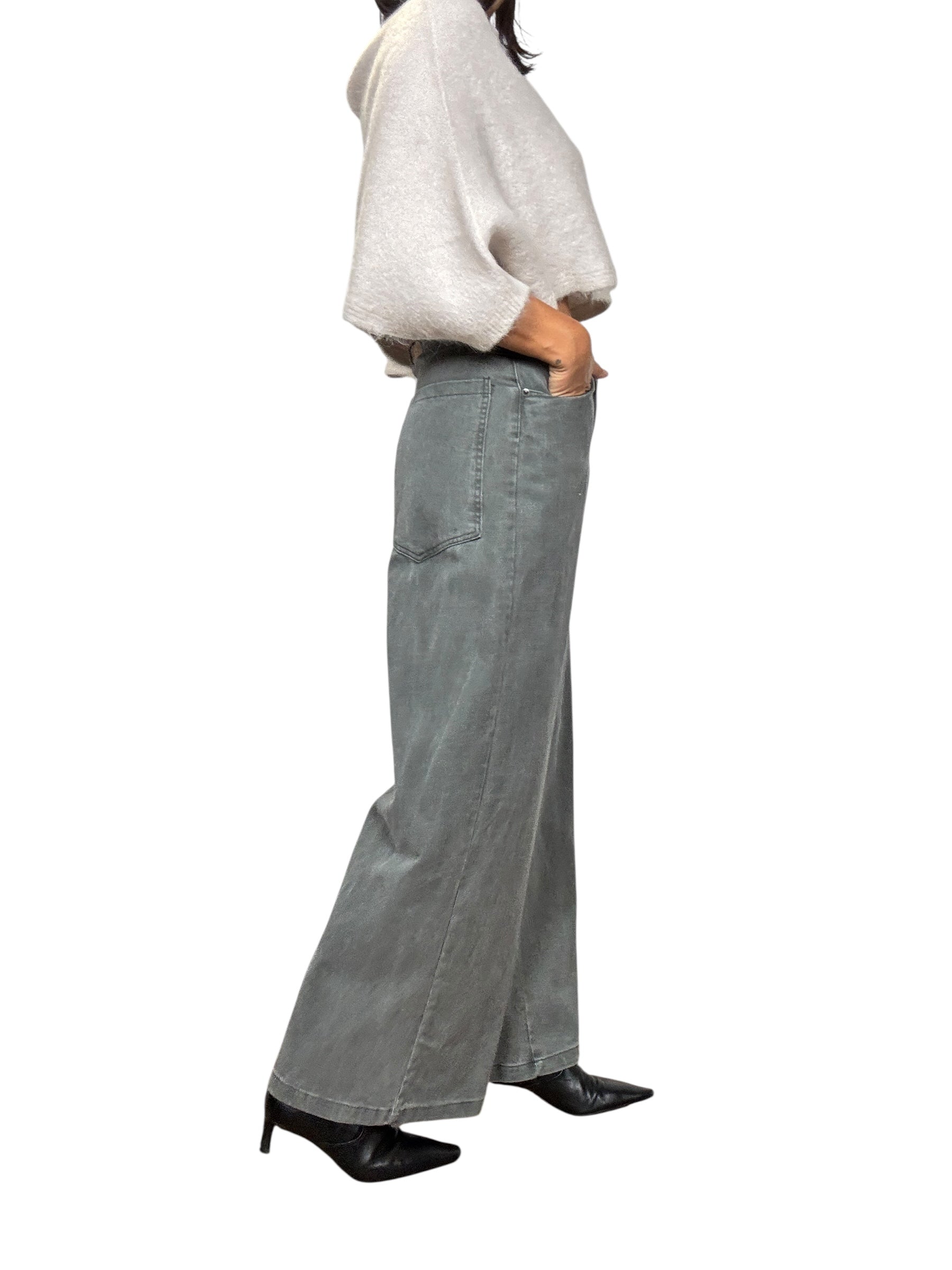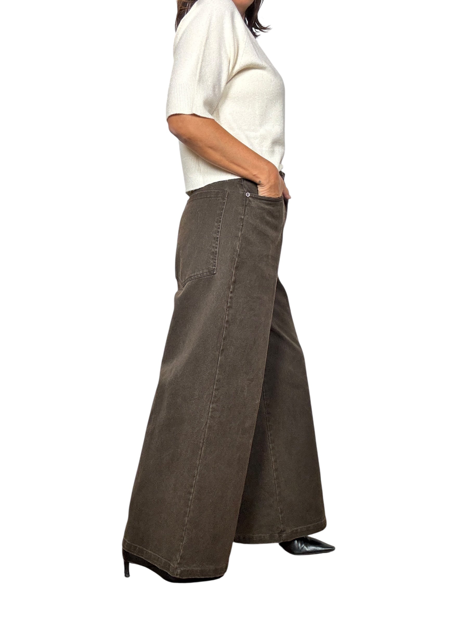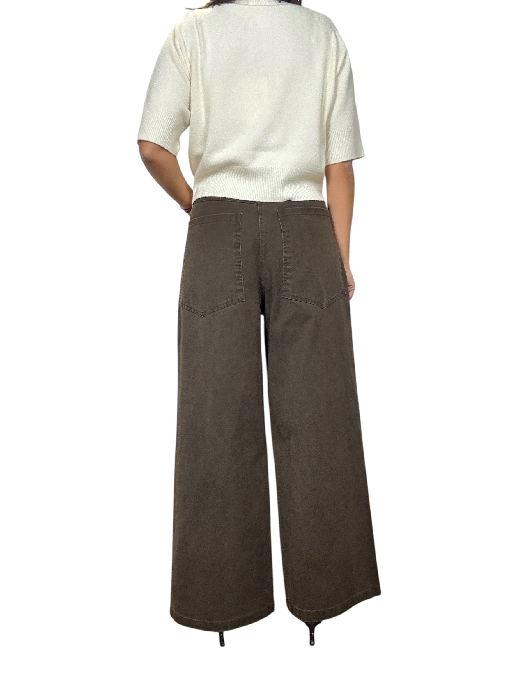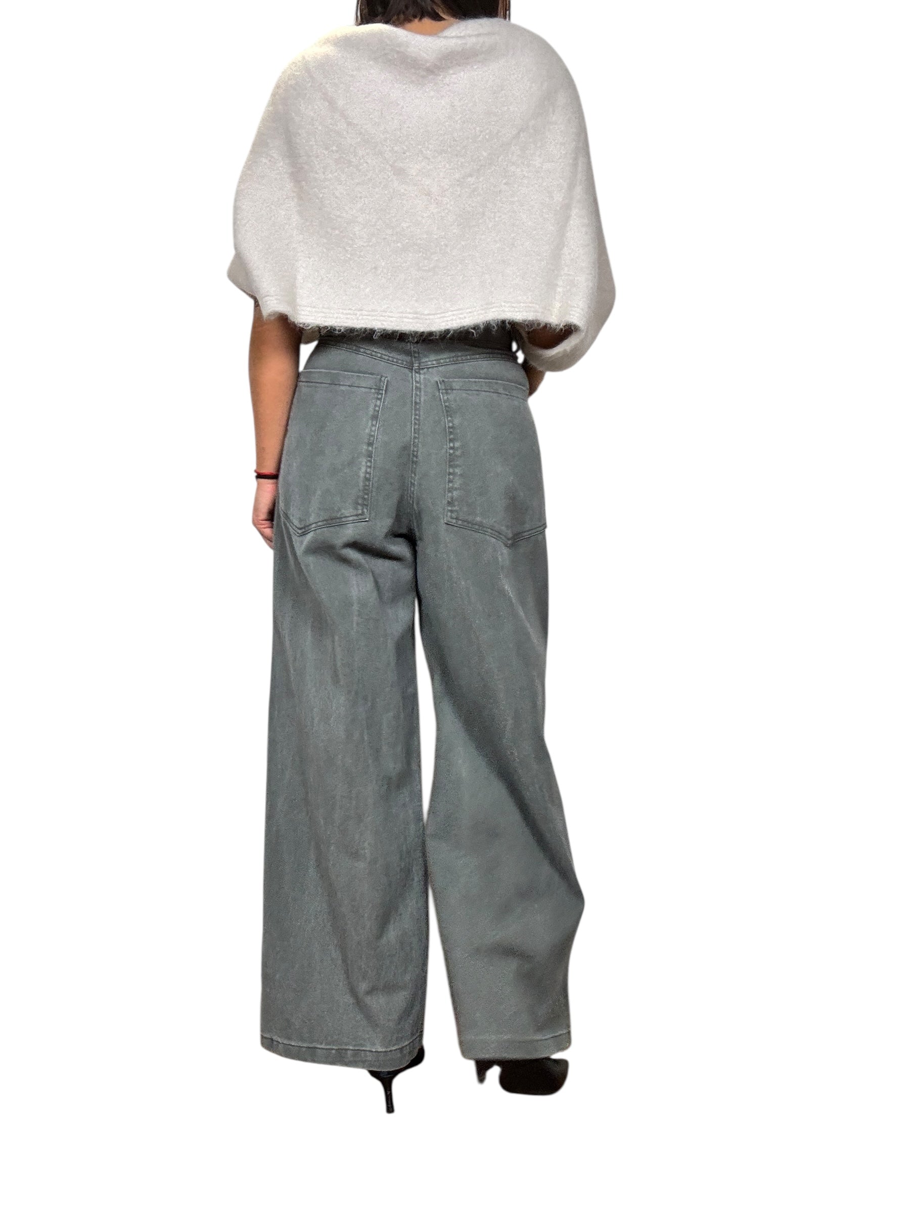 Jeans a vita alta con tasche laterali e chiusura con bottone e zip frontale. Modello a palazzo con dettaglio tasca profonda sul retro. Non elasticizzato (tg in foto XS)