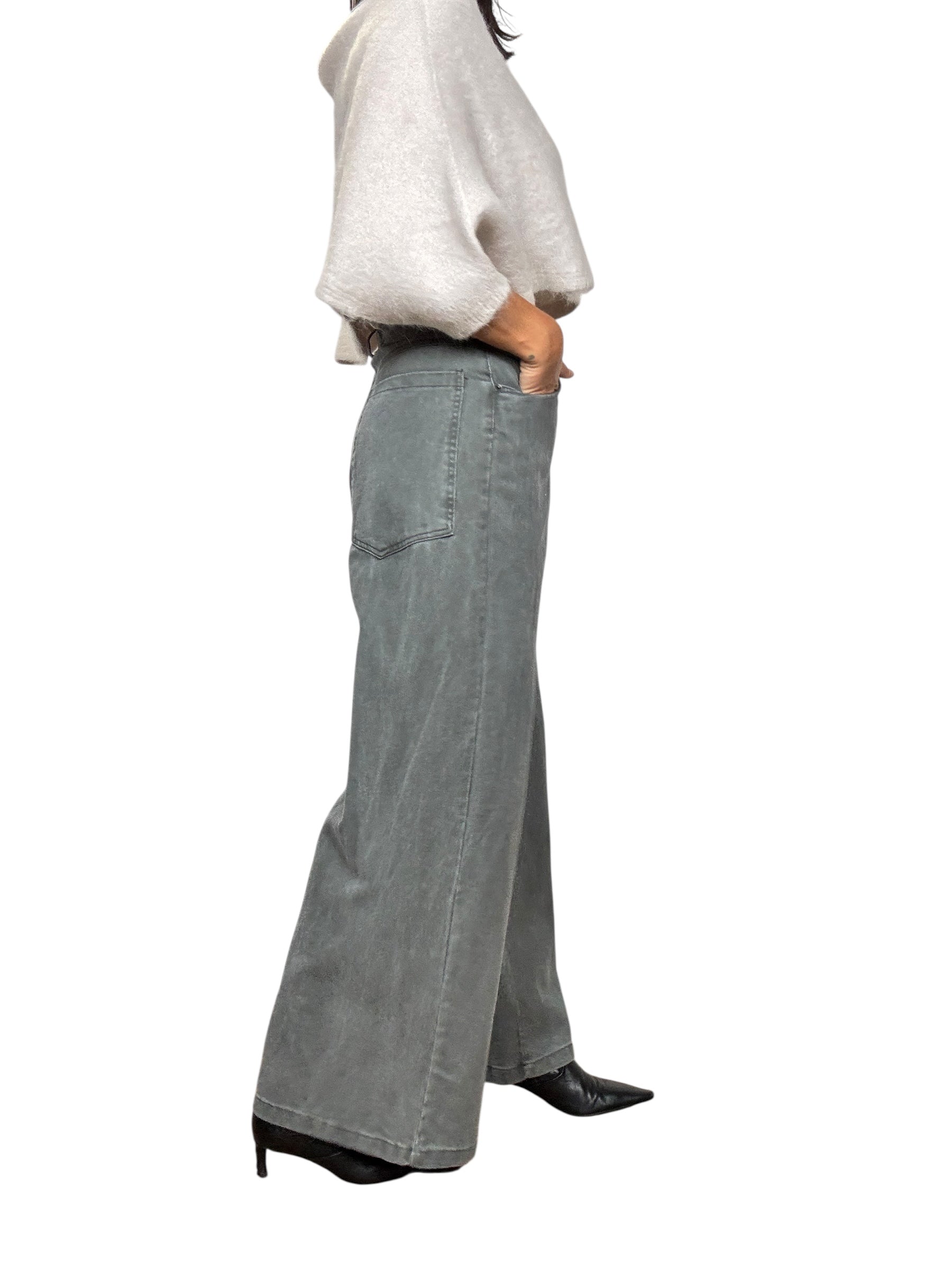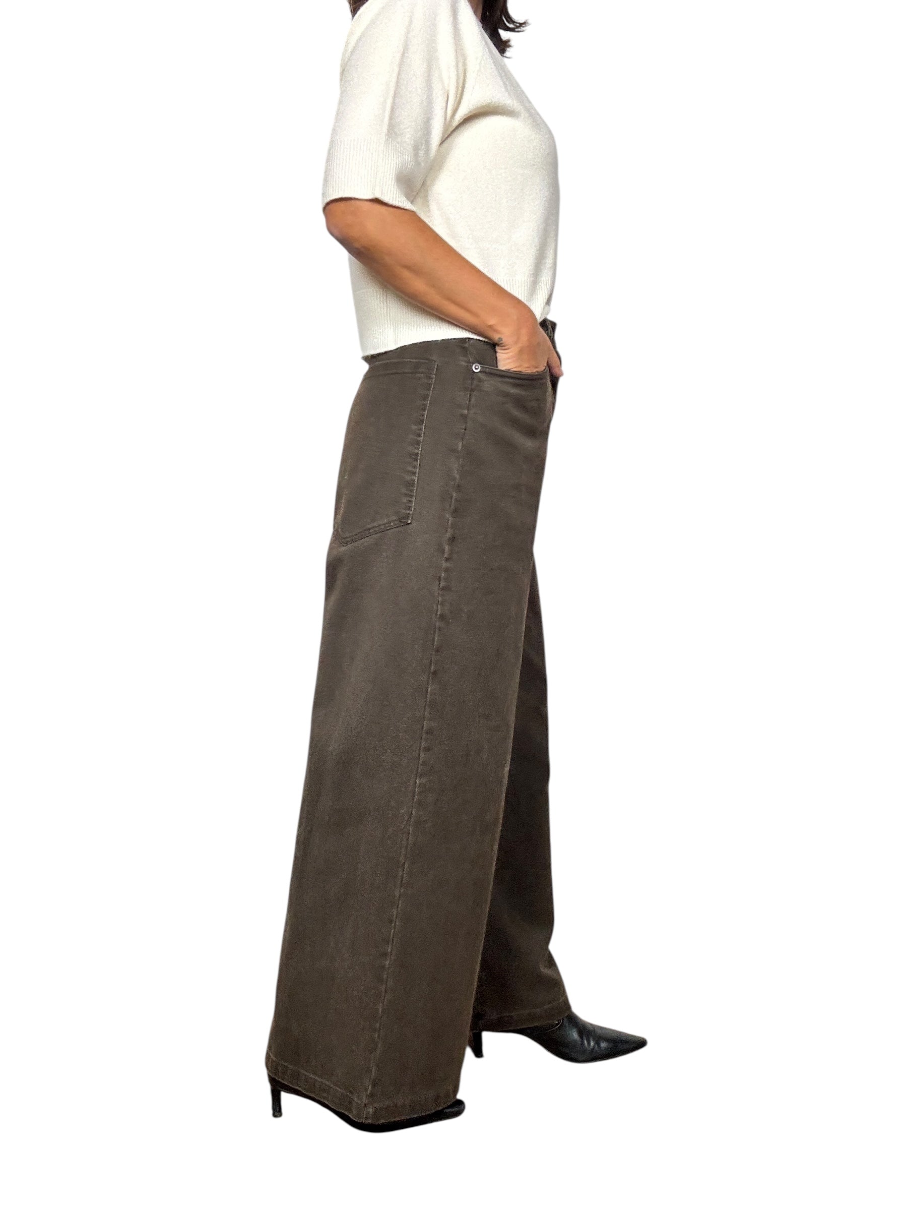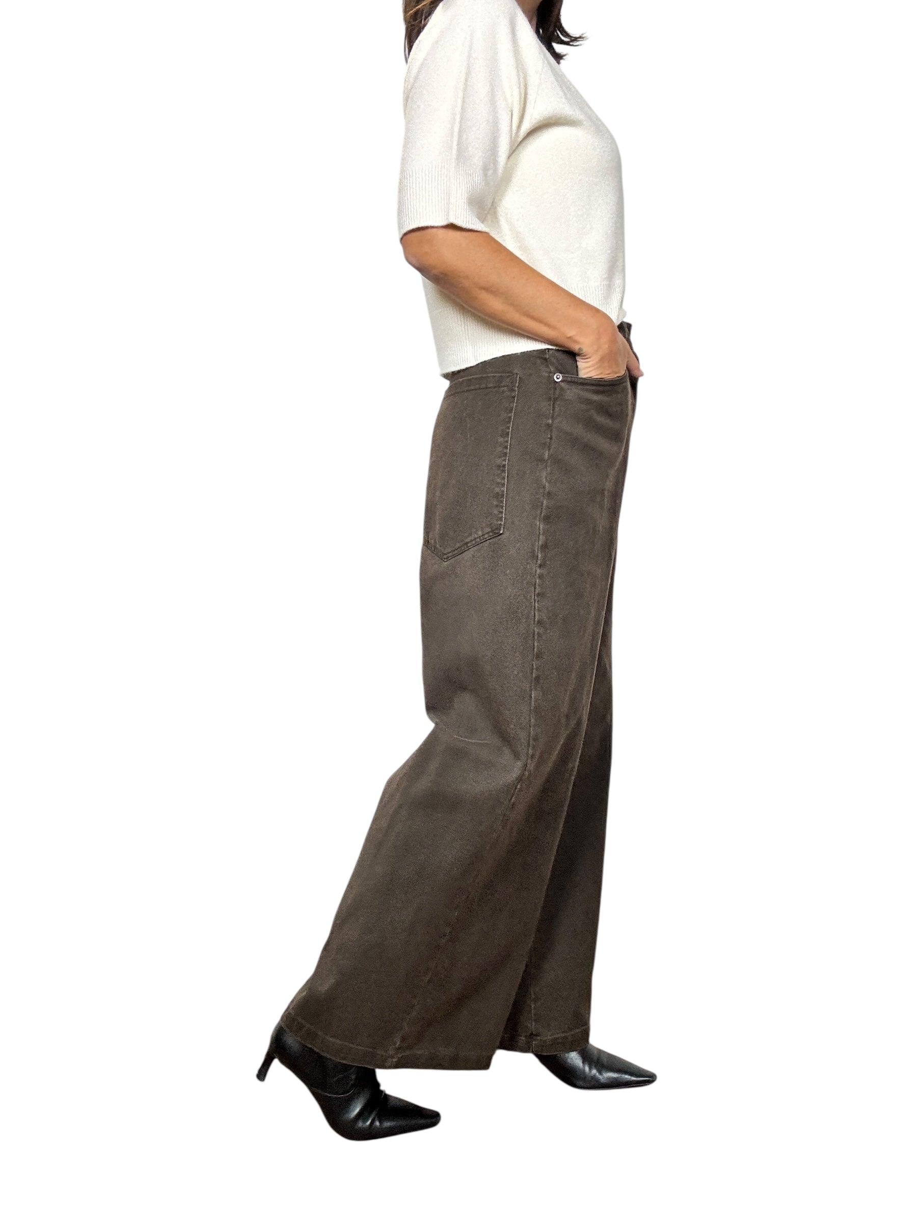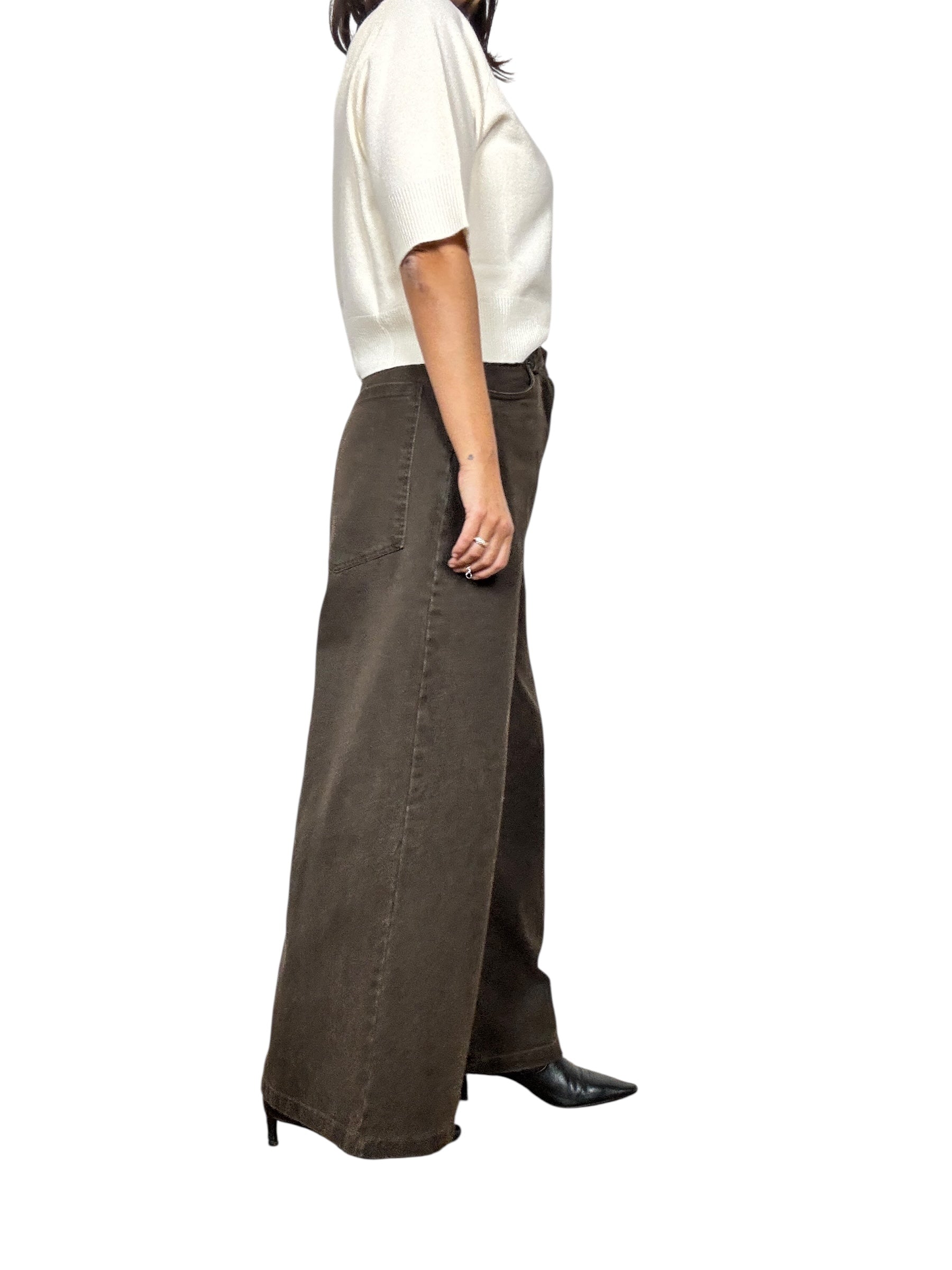 Jeans a vita alta con tasche laterali e chiusura con bottone e zip frontale. Modello a palazzo con dettaglio tasca profonda sul retro. Non elasticizzato (tg in foto XS)