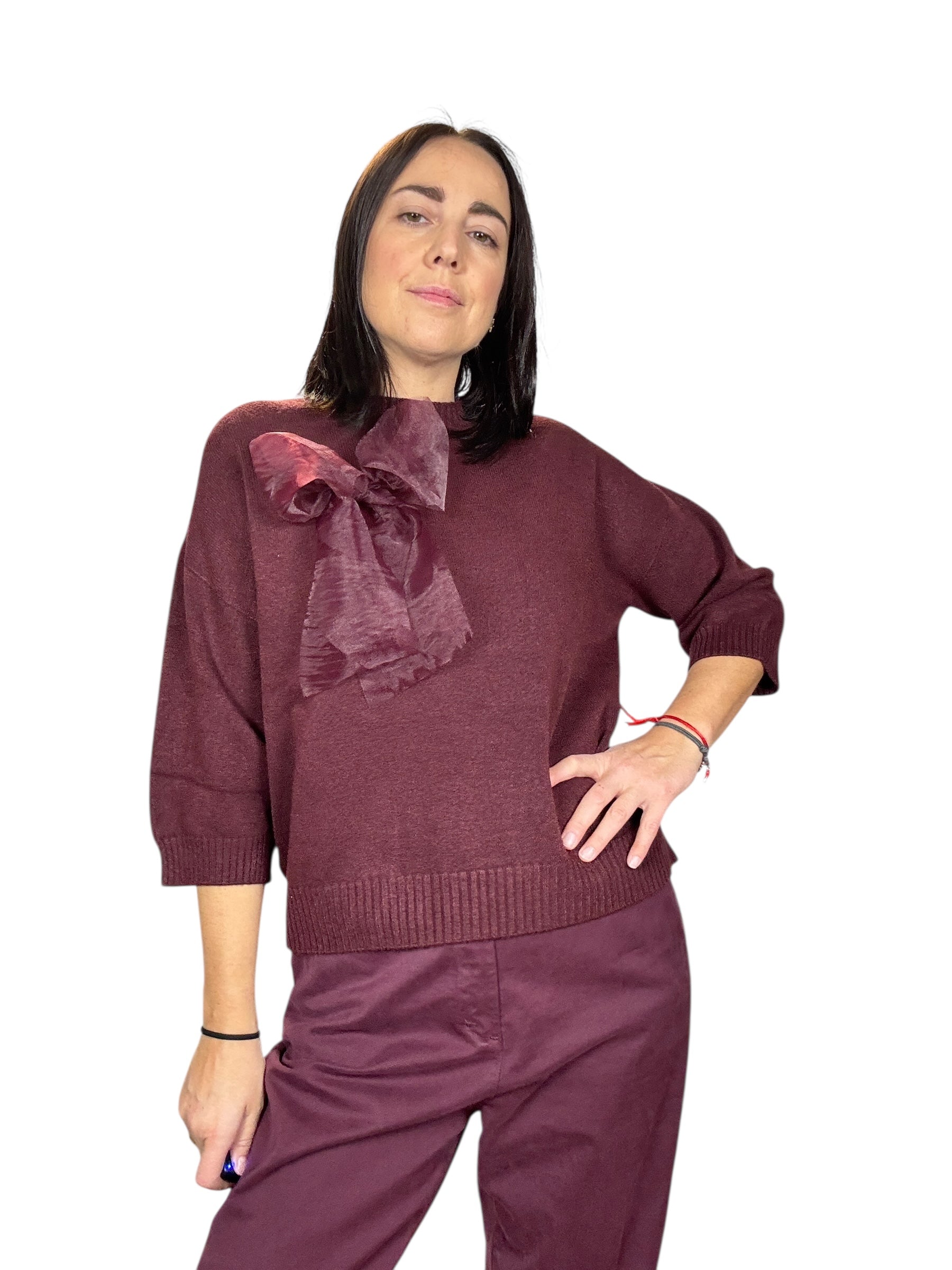 Maglia paricollo con manica a 3/4 e dettaglio spilla con fiocco rimuovibile