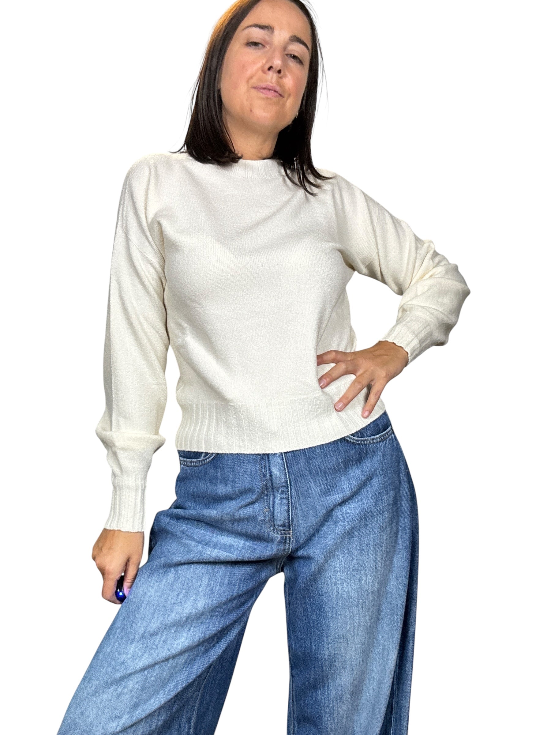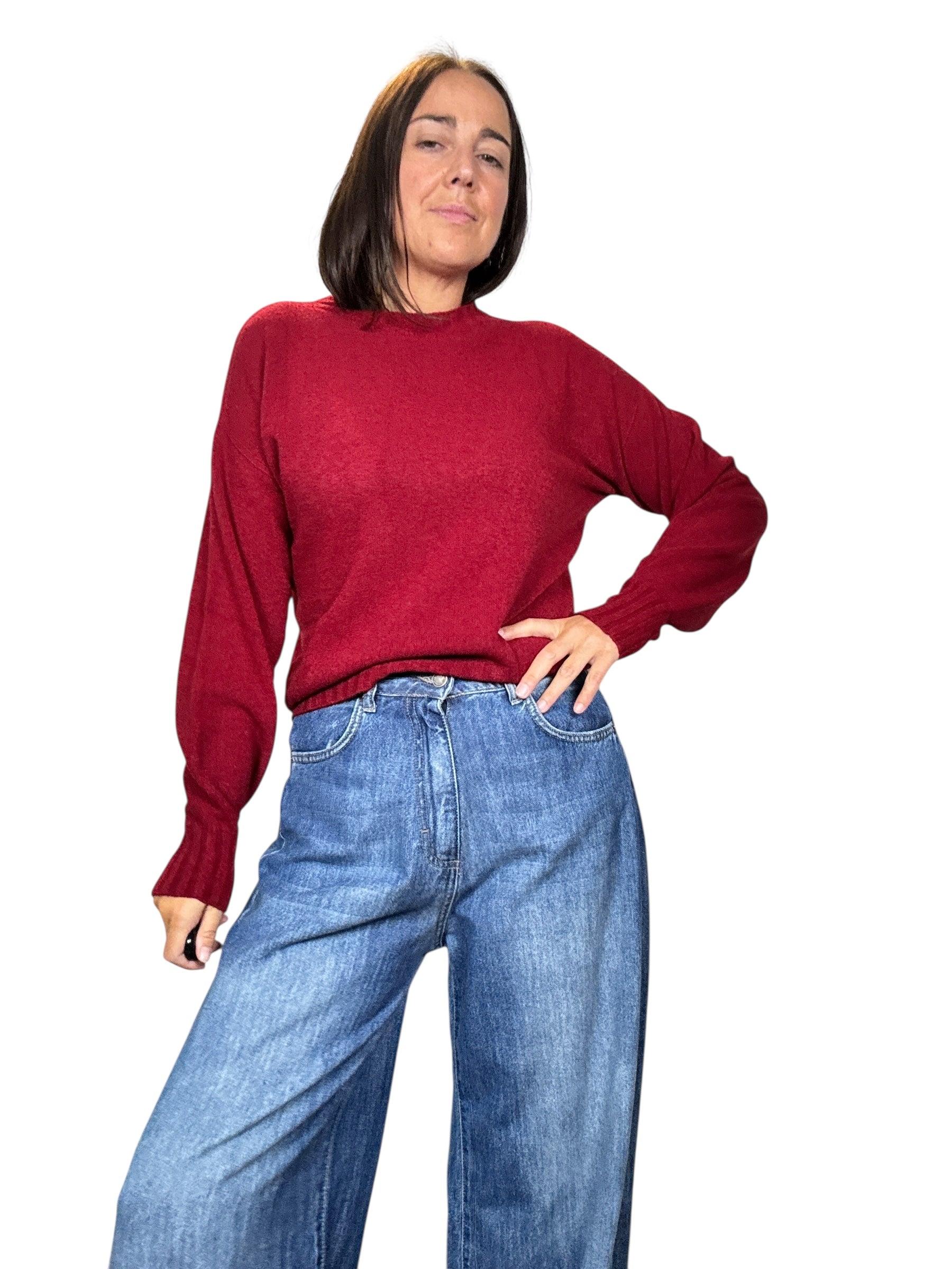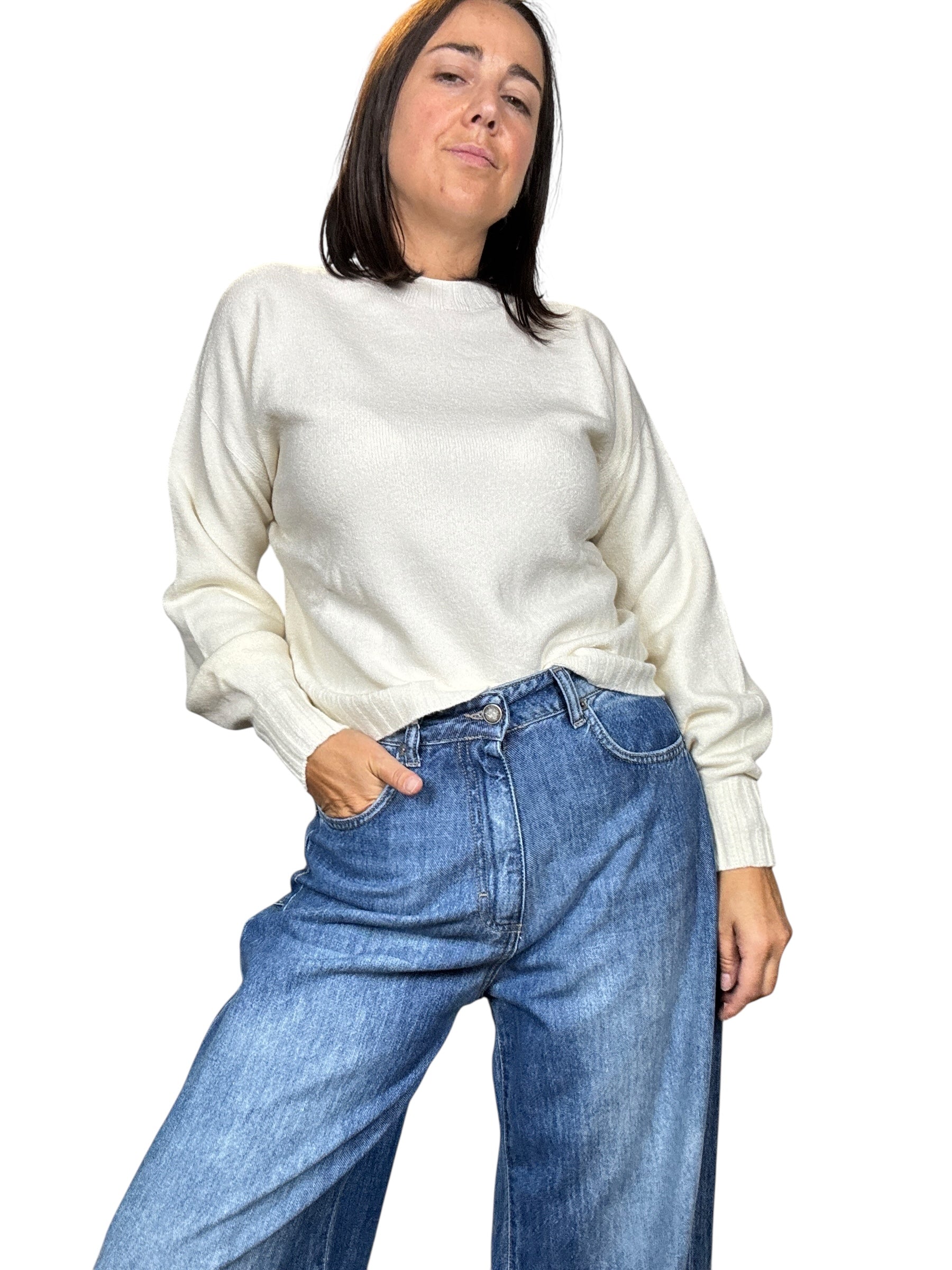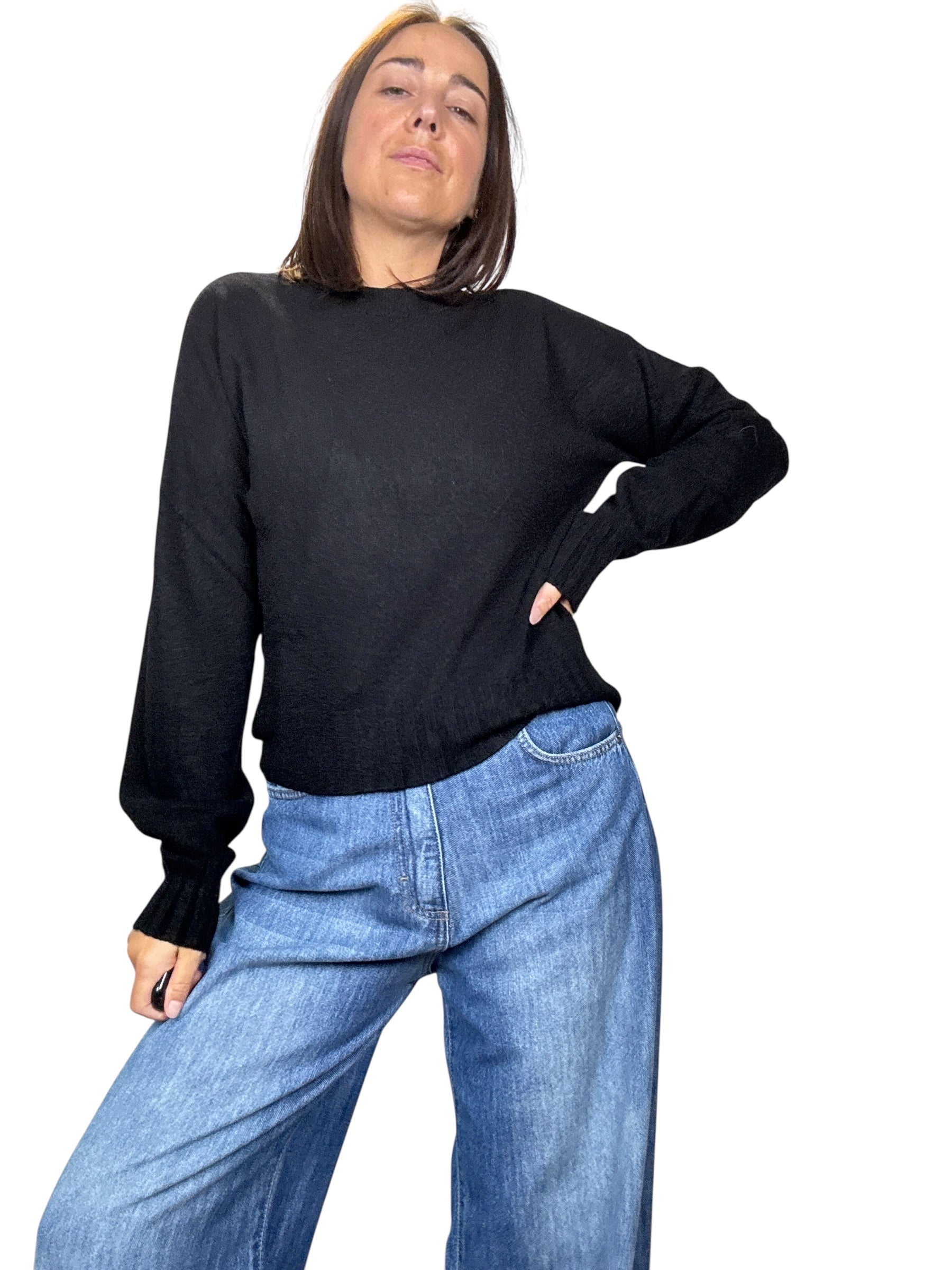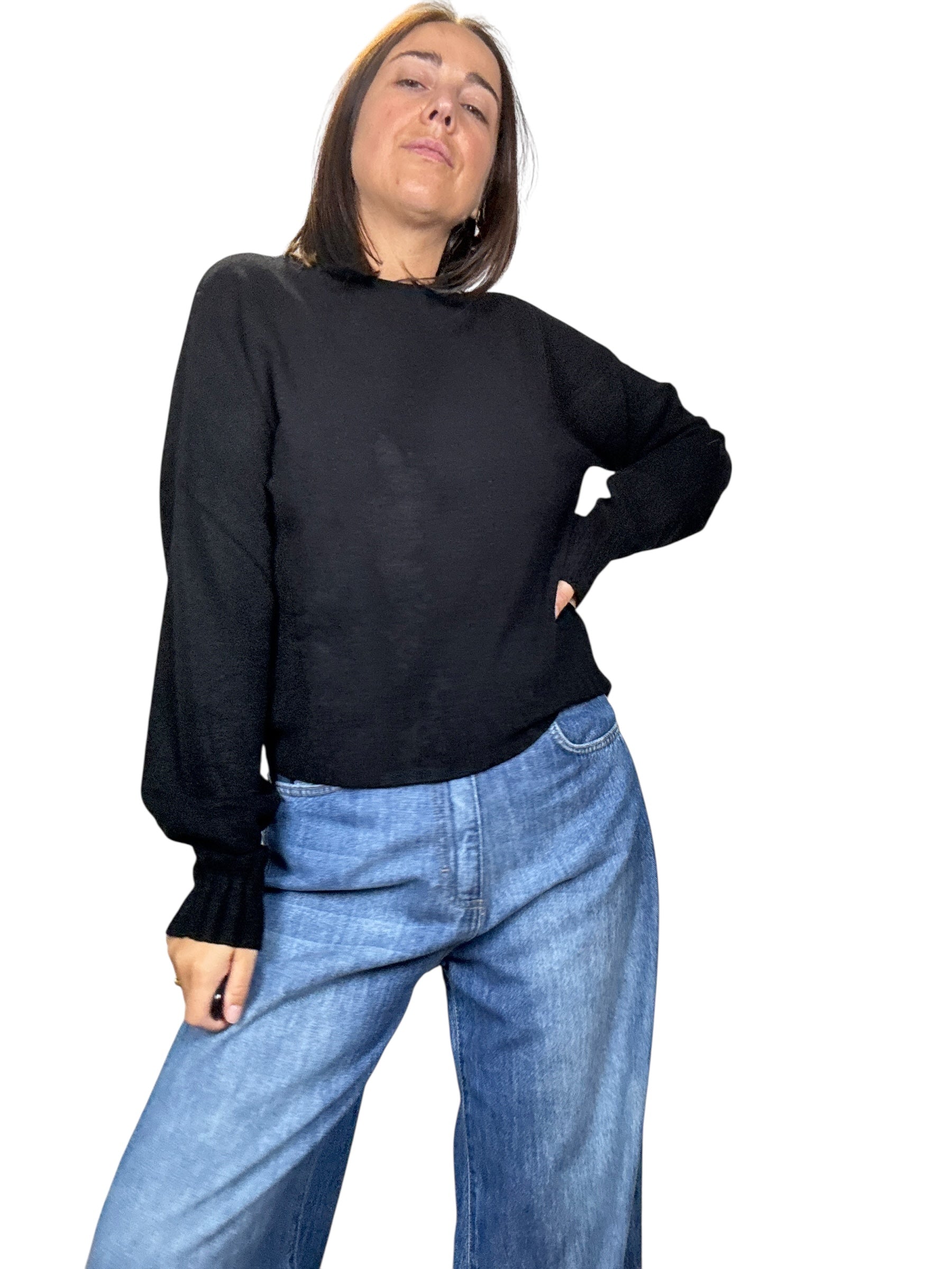 Maglia girocollo con manicaa palloncino e con profilo a costina sui polsini e sul fondo. Modello corto in cintura e morbido
