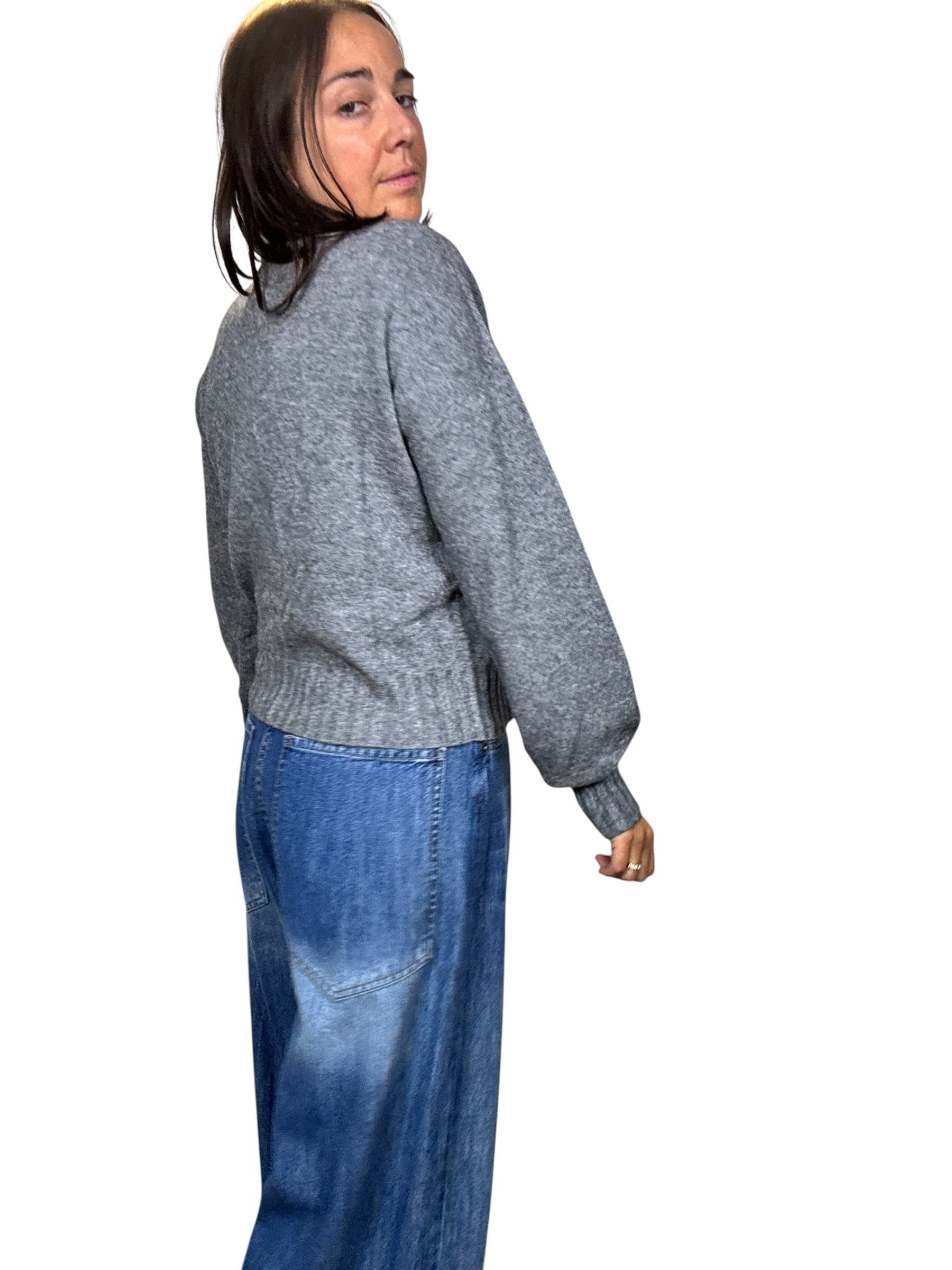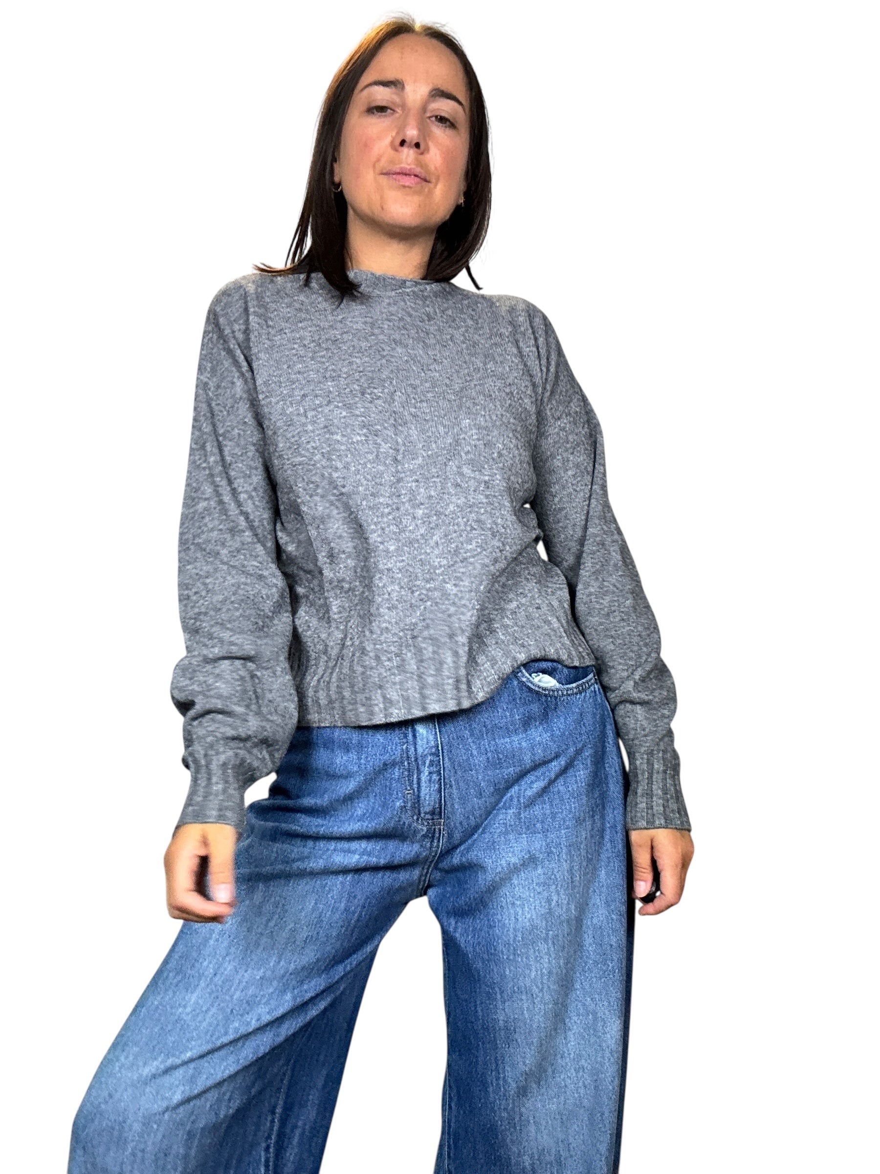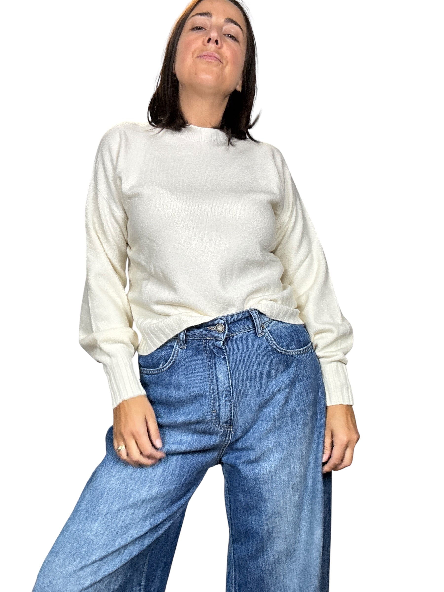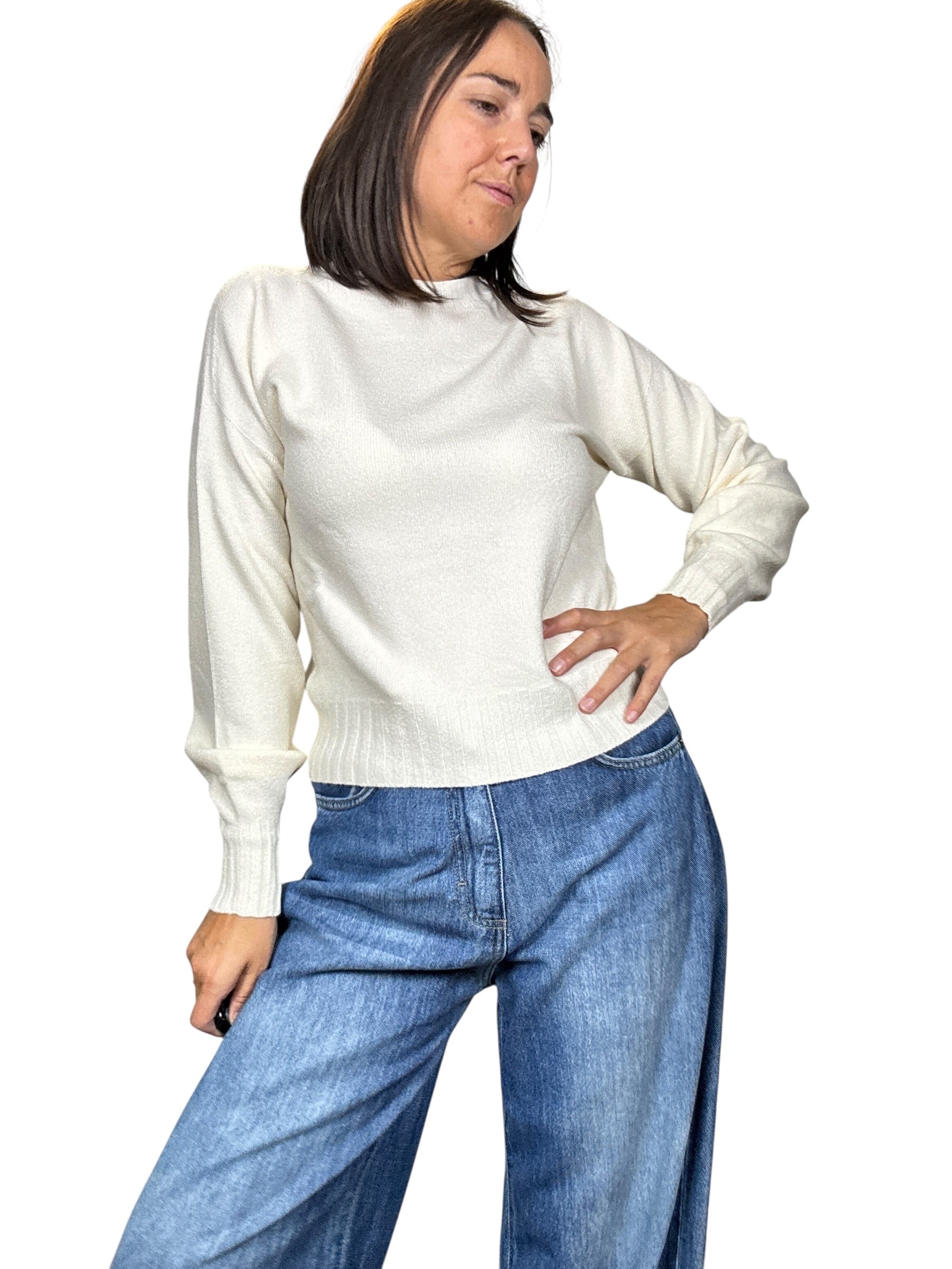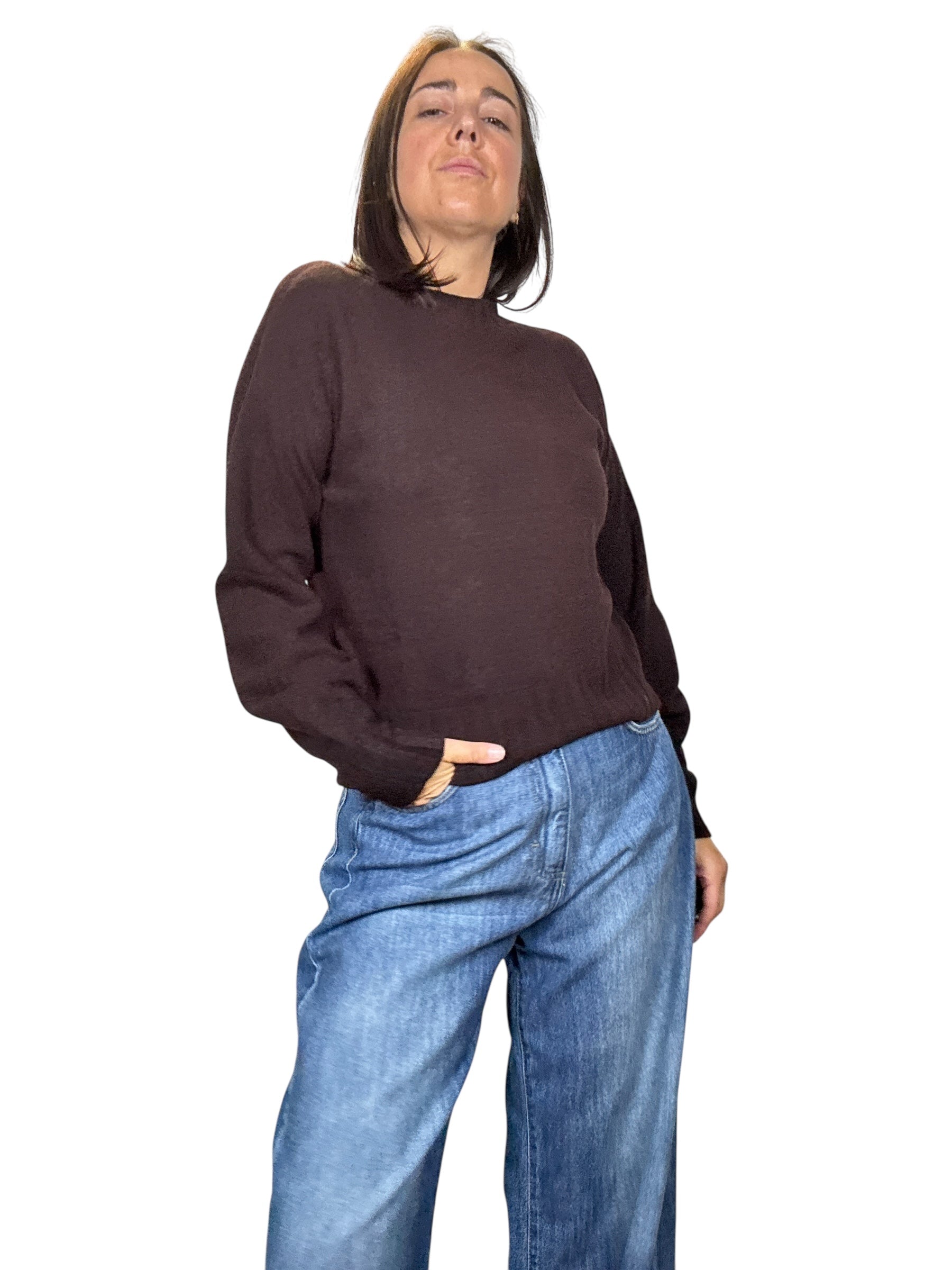 Maglia girocollo con manicaa palloncino e con profilo a costina sui polsini e sul fondo. Modello corto in cintura e morbido
