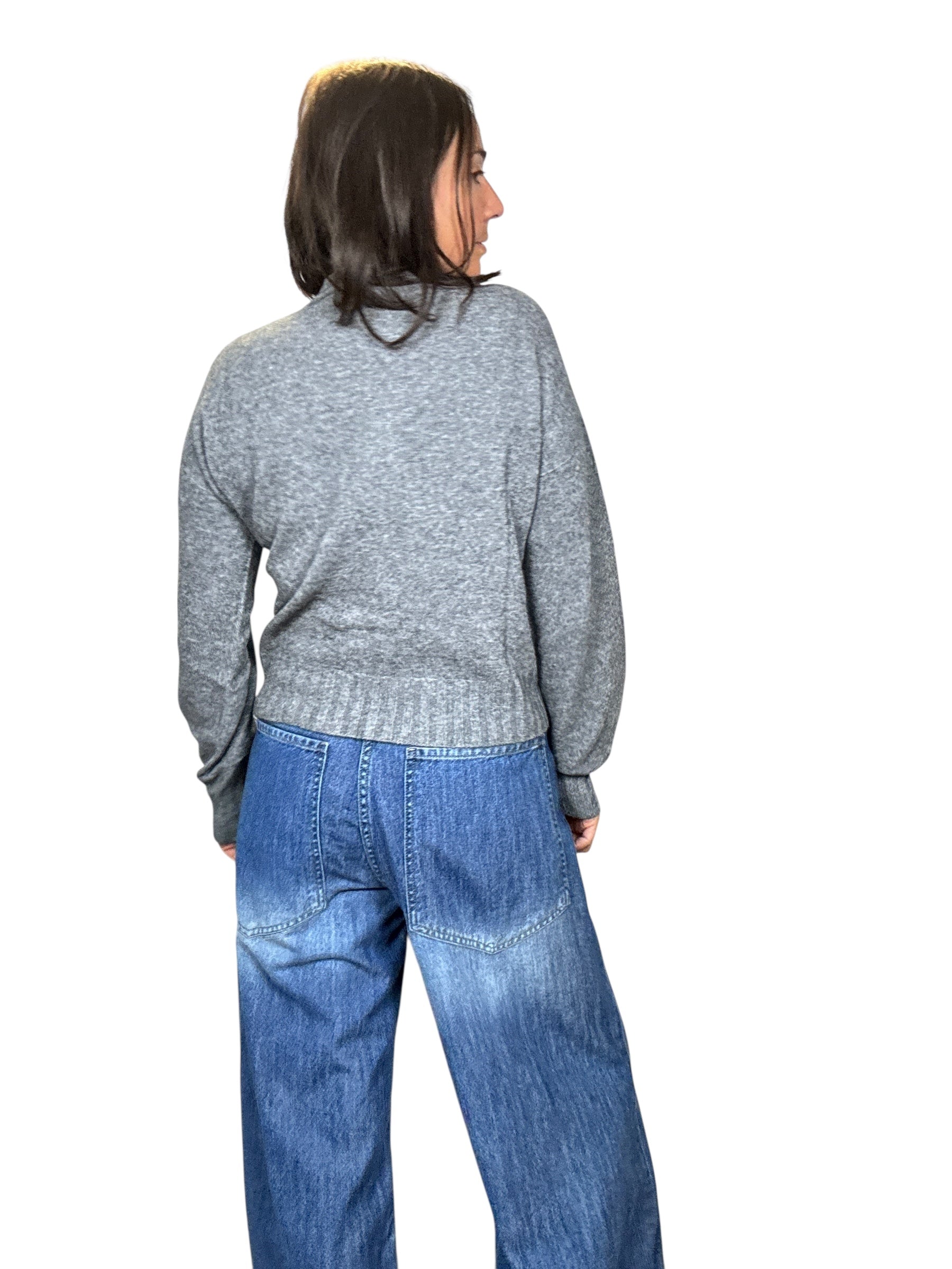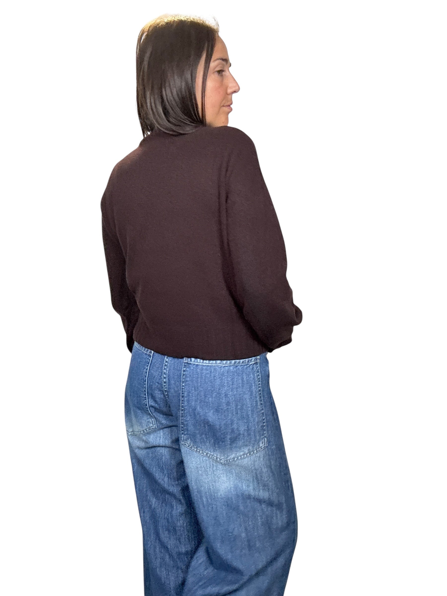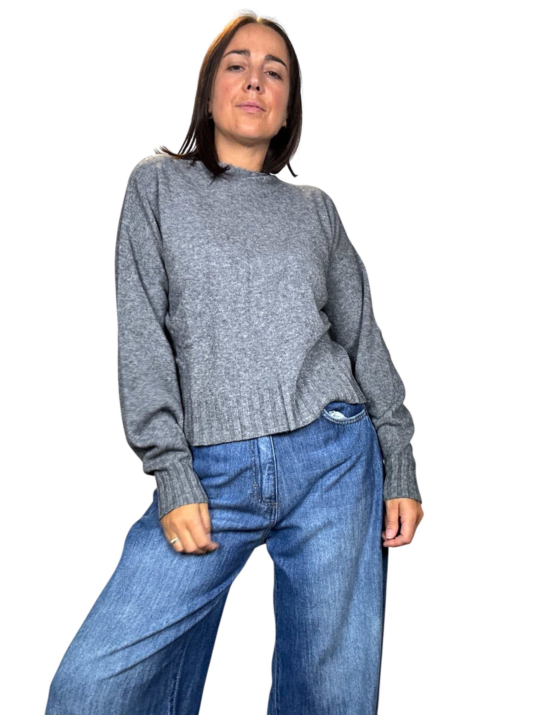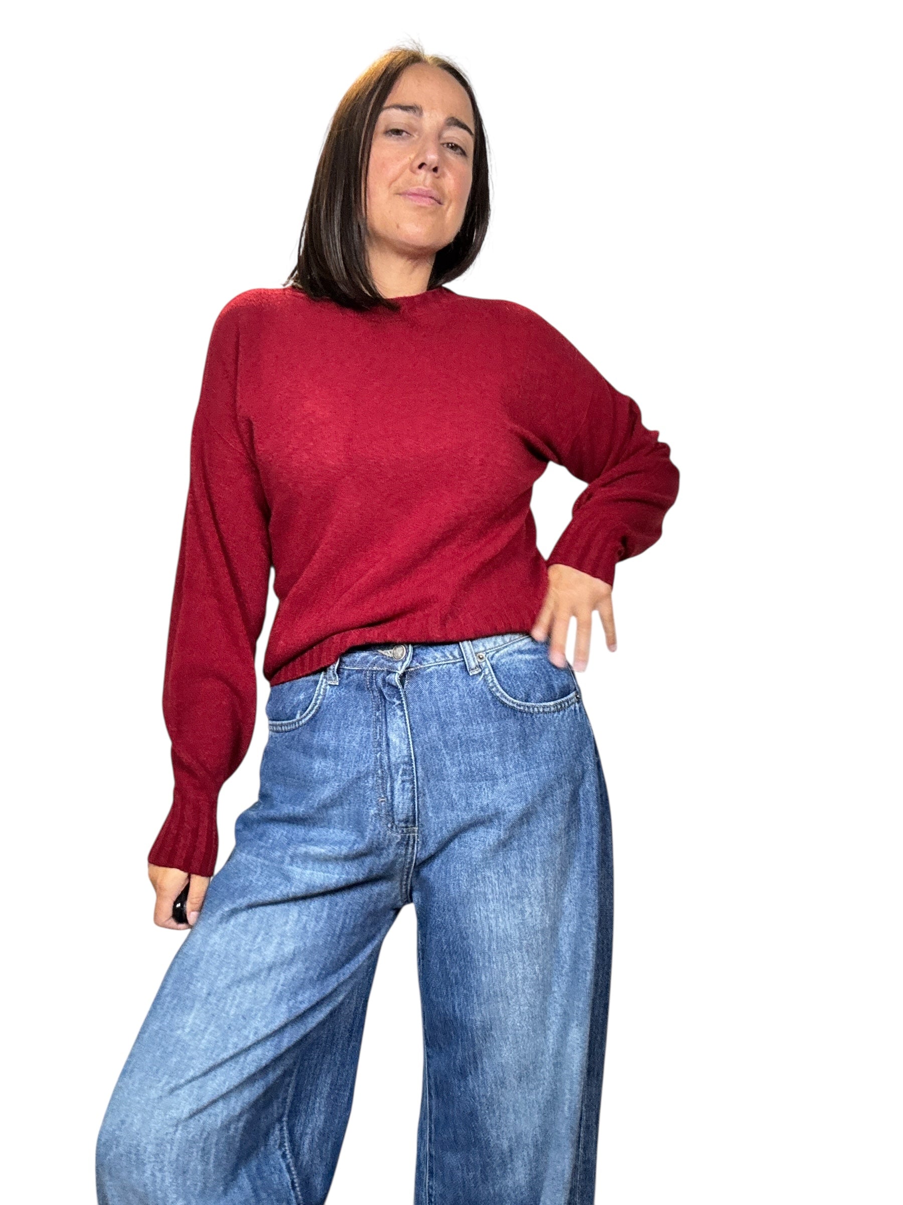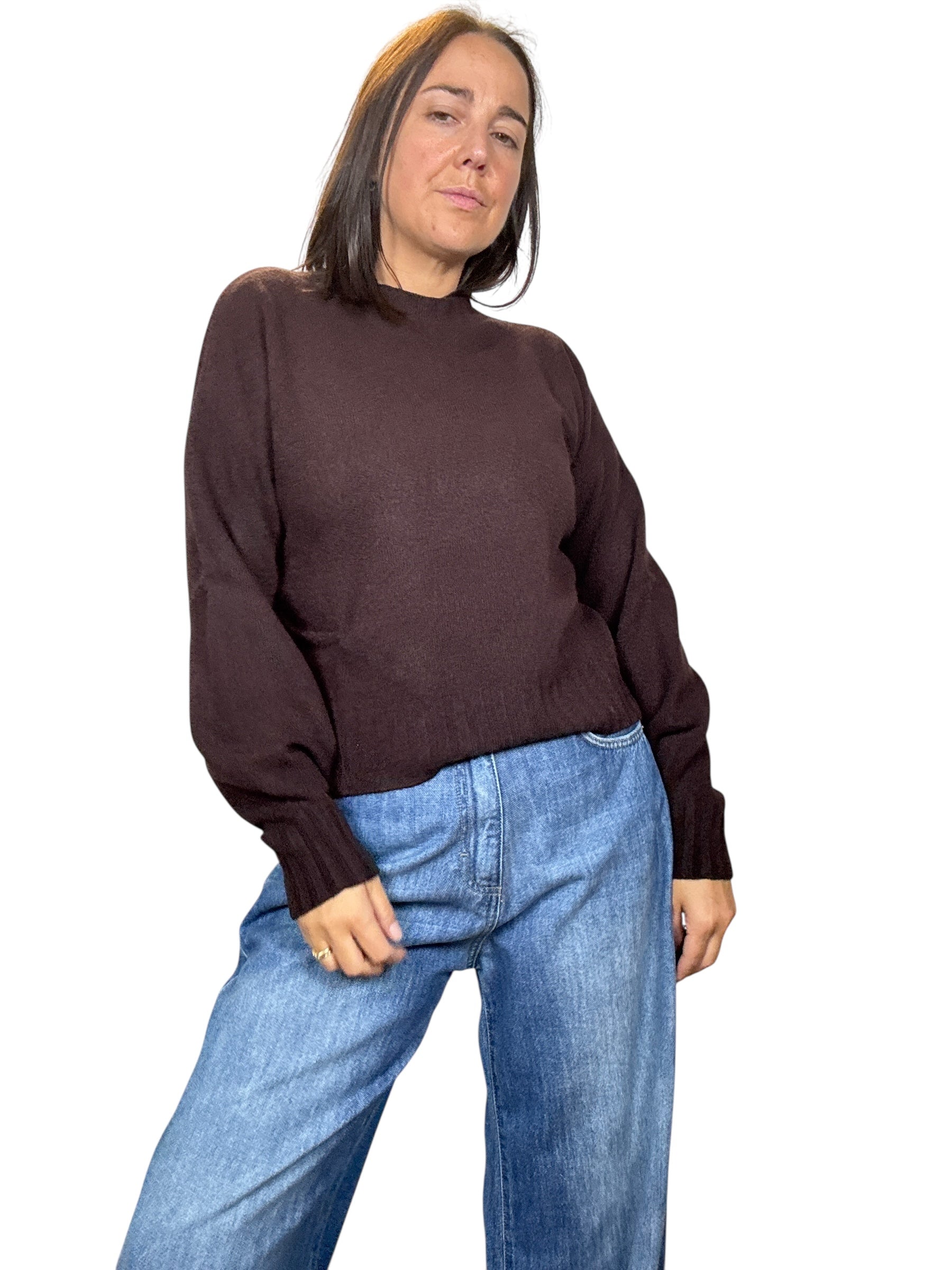 Maglia girocollo con manicaa palloncino e con profilo a costina sui polsini e sul fondo. Modello corto in cintura e morbido
