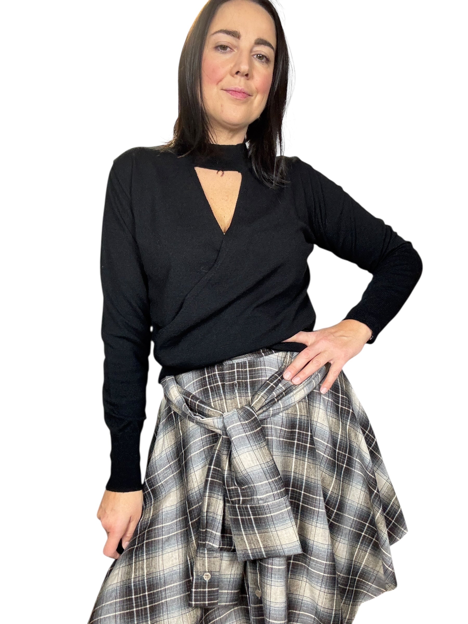 Maglia a manica lungo scollo choker incrociata davanti. Modello in figura, elasticizzata