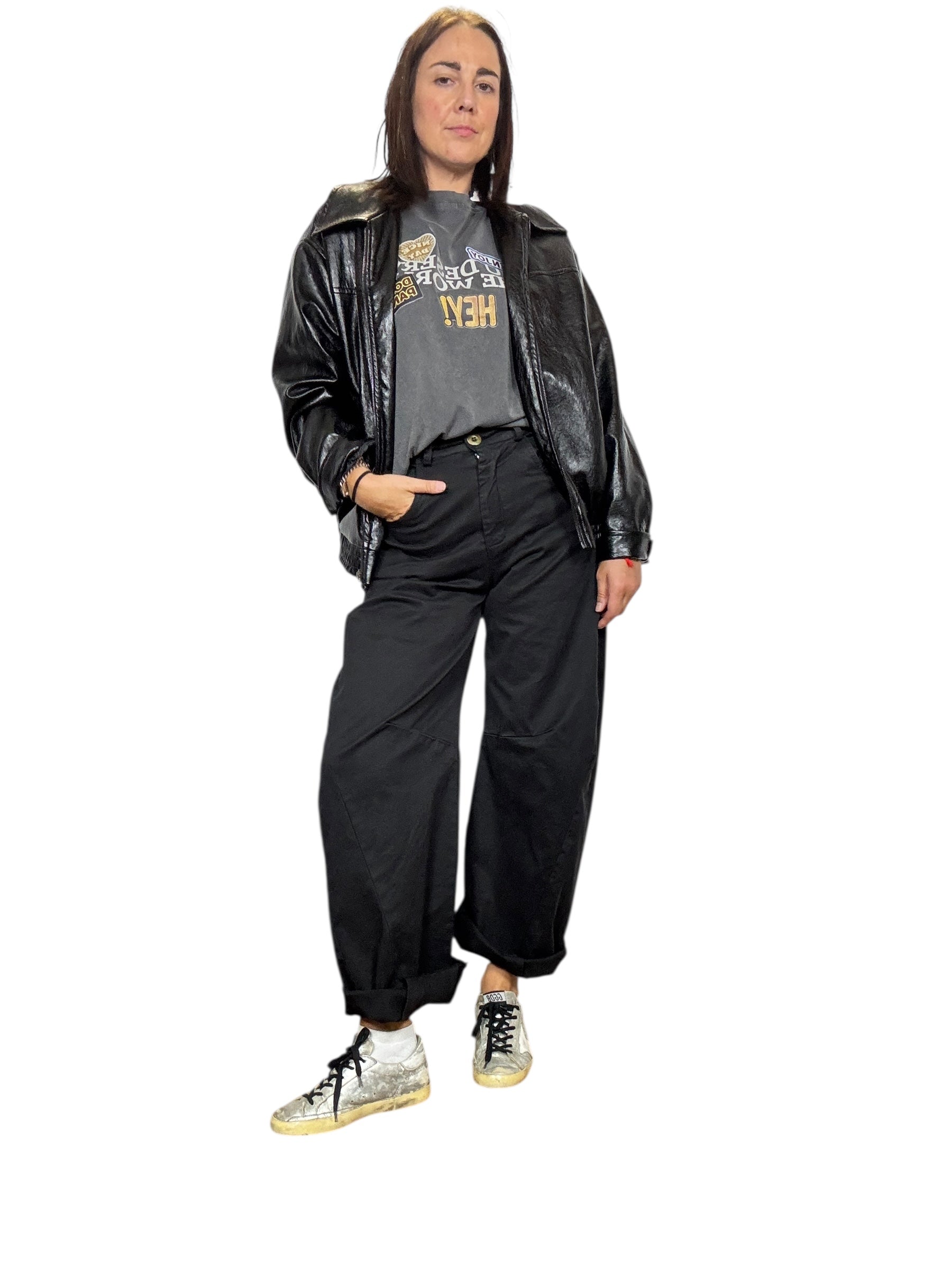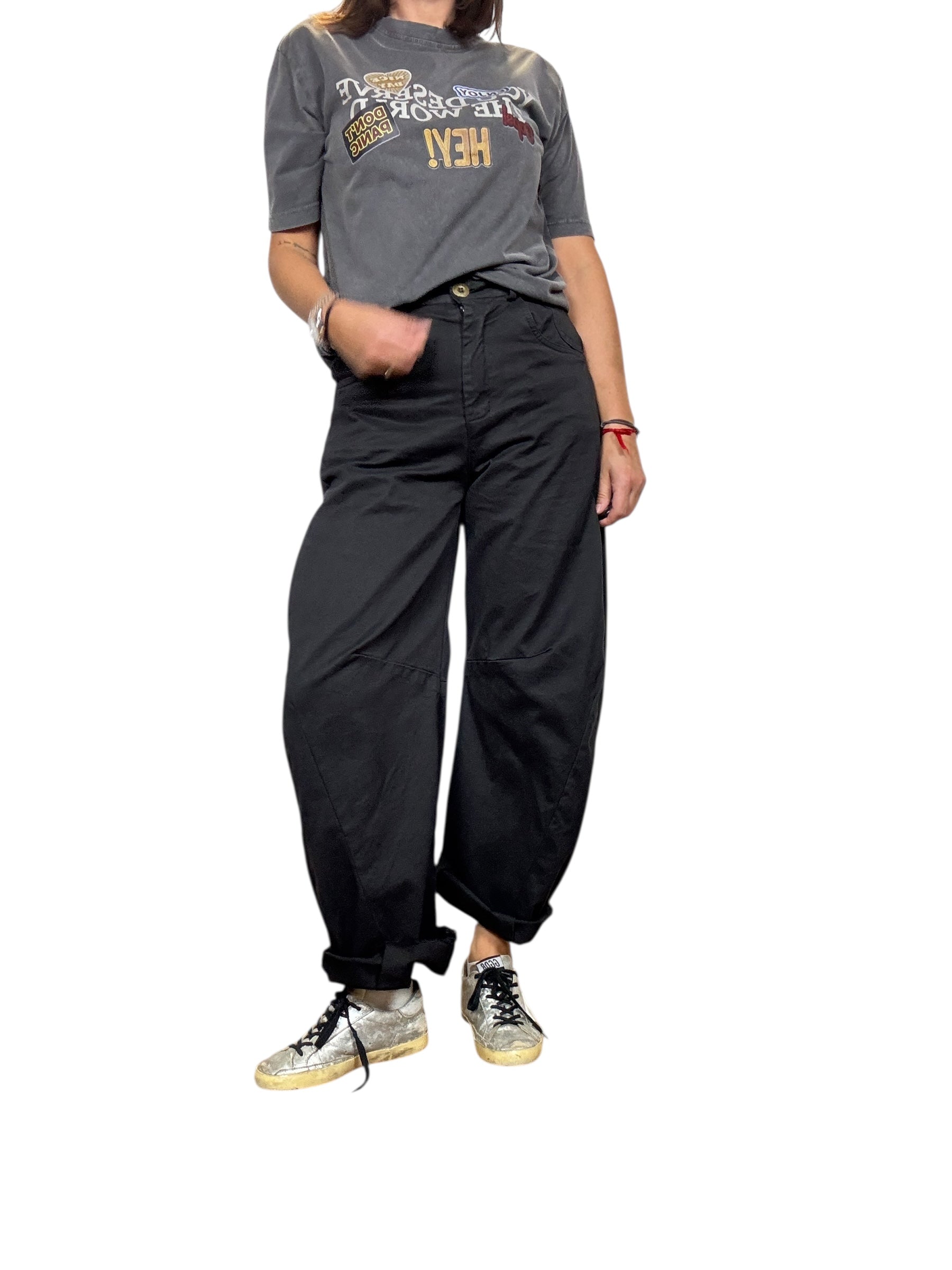 Pantalone a vita alta con tasche laterali e posteriori, chiusura con zip e bottone frontale. Modello a "banana" con gamba larga che va a chiudersi in caviglia, sfrangaito sul fondo (tg in foto S) elasticizzato