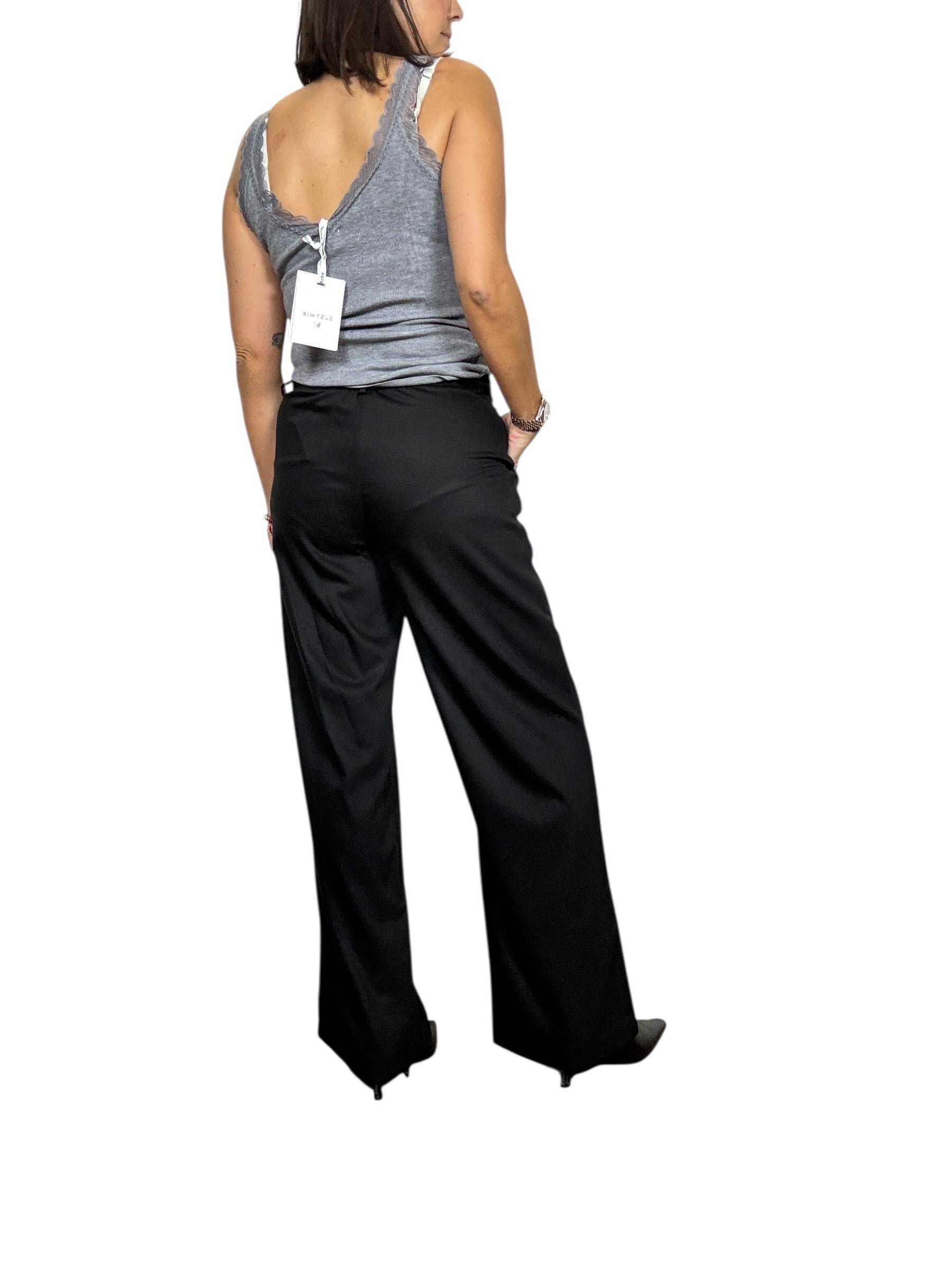 Pantalone a vita alta con fascia elastica sul retro del cinturone e tasche laterali. Modello a palazzo elasticizzato (tg in foto S)