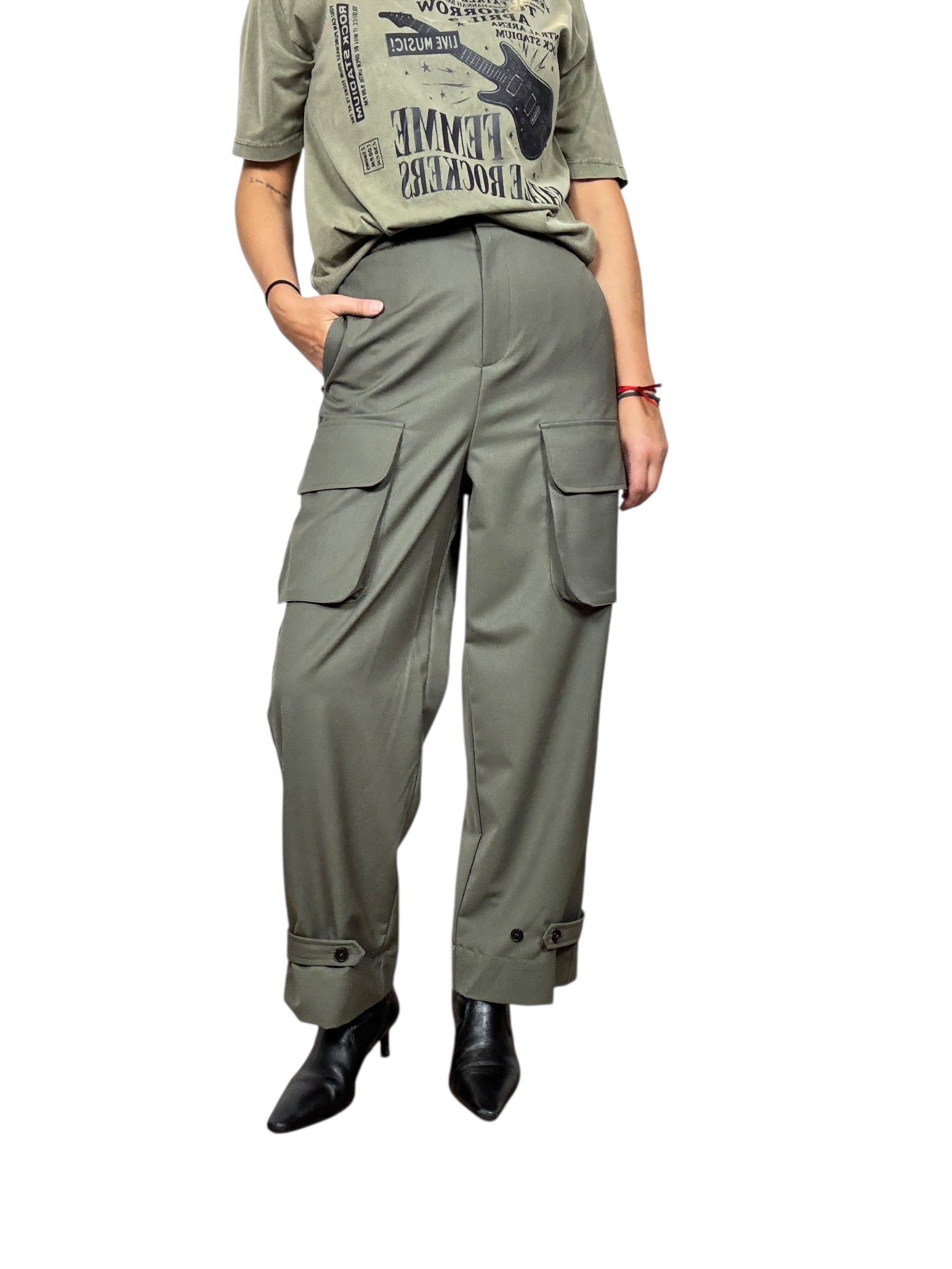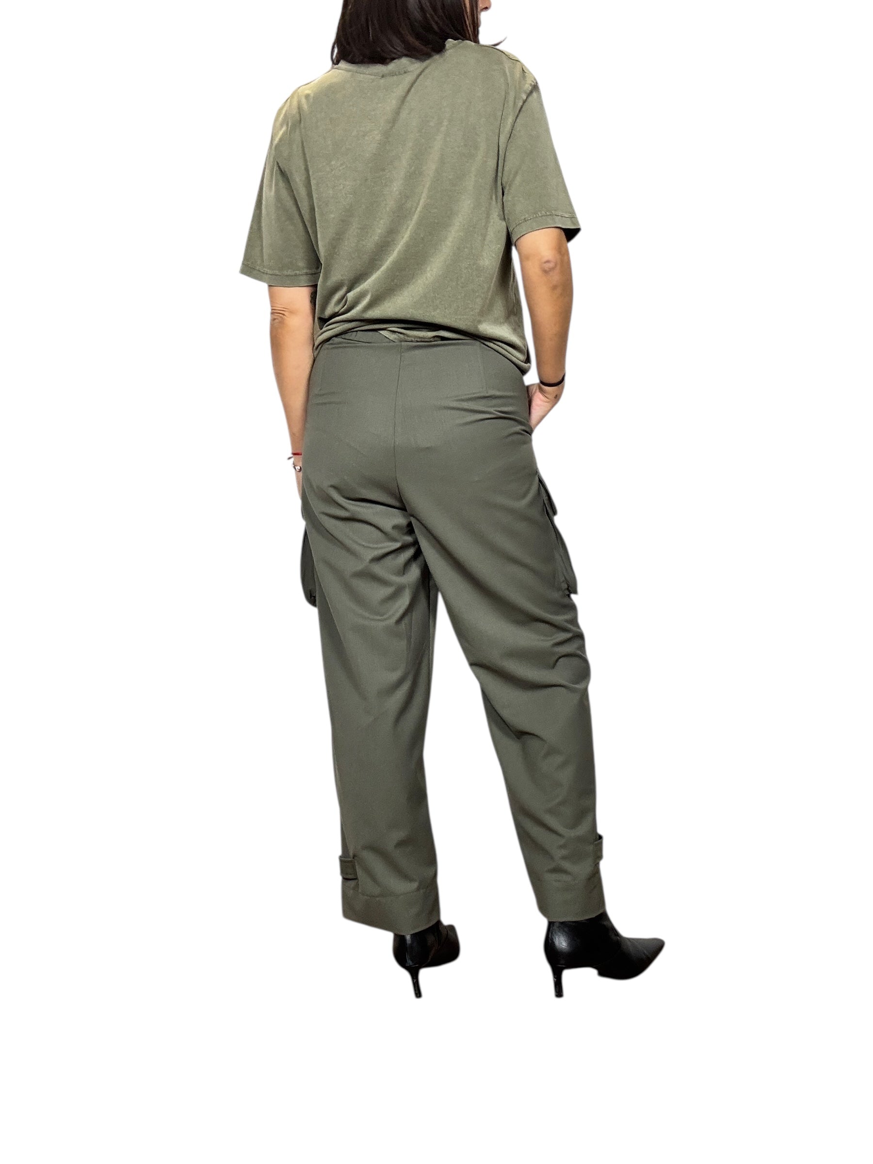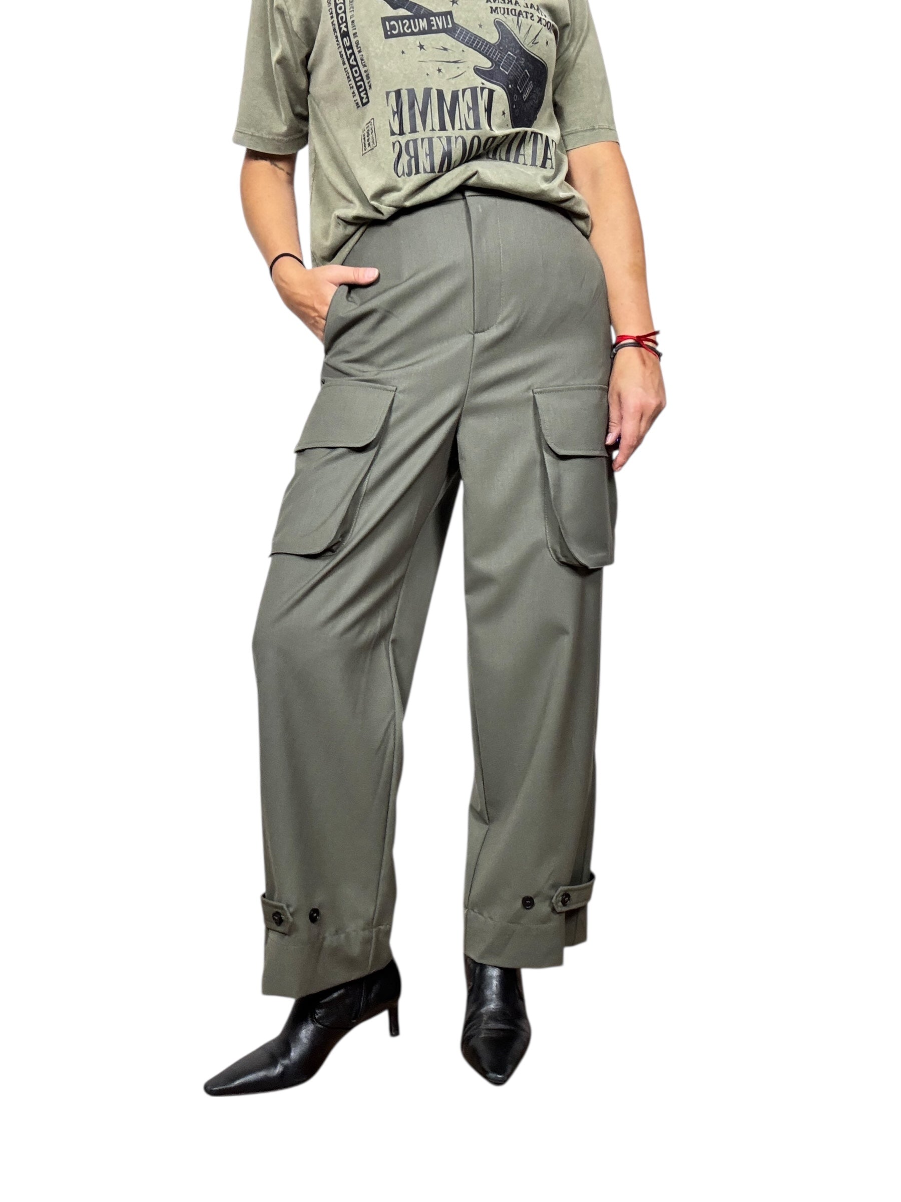 Pantalone a vita alta con bottone e zip frontale, tasche laterali. Modello con gamba a palazzo (che si puo stringere in caviglia grazie alla presenza di un tinturino regolabile) e tasconi (tg in foto S)