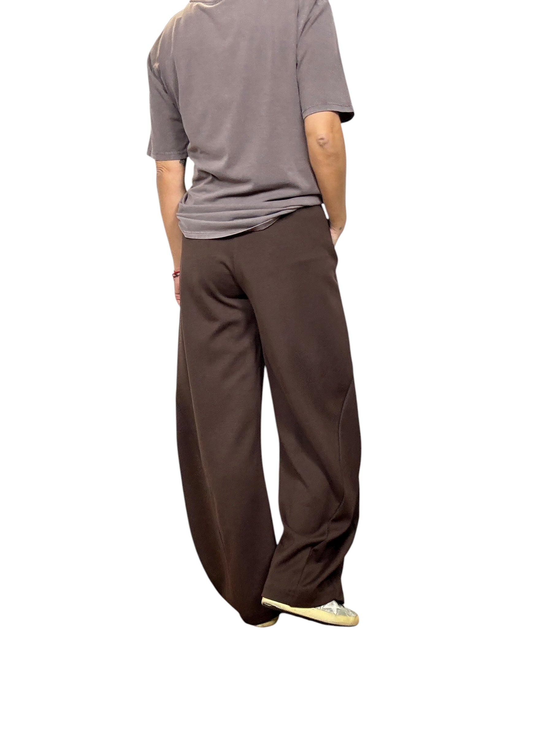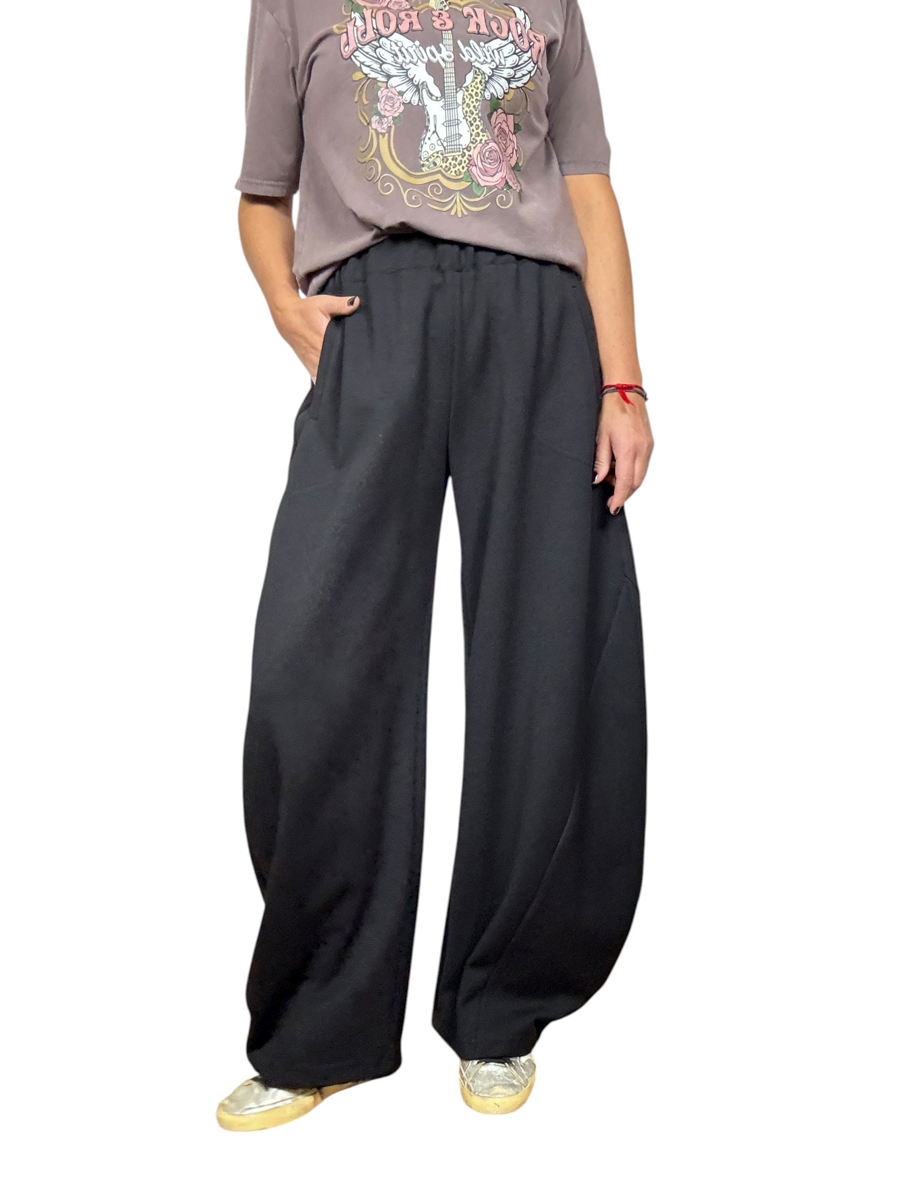 Pantalone a vita alta con elastico in cintura e tasche laterali. Modello carrot con gamba morbida che va a chiudersi in caviglia (tg in foto XS veste grande)