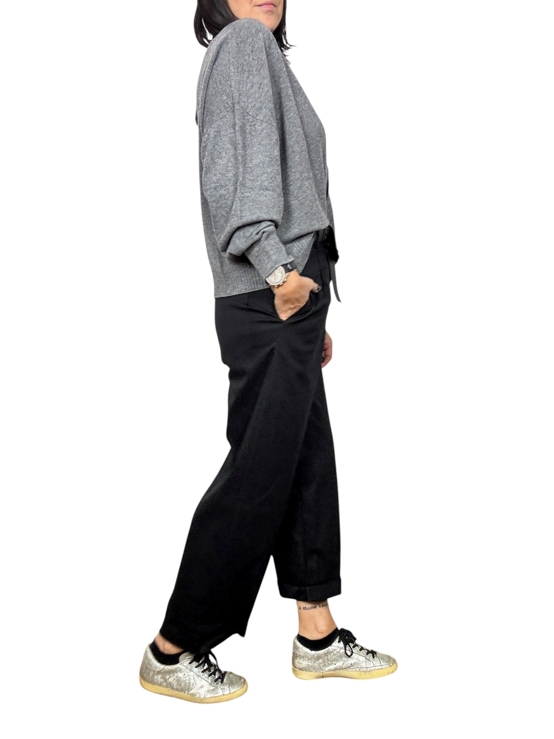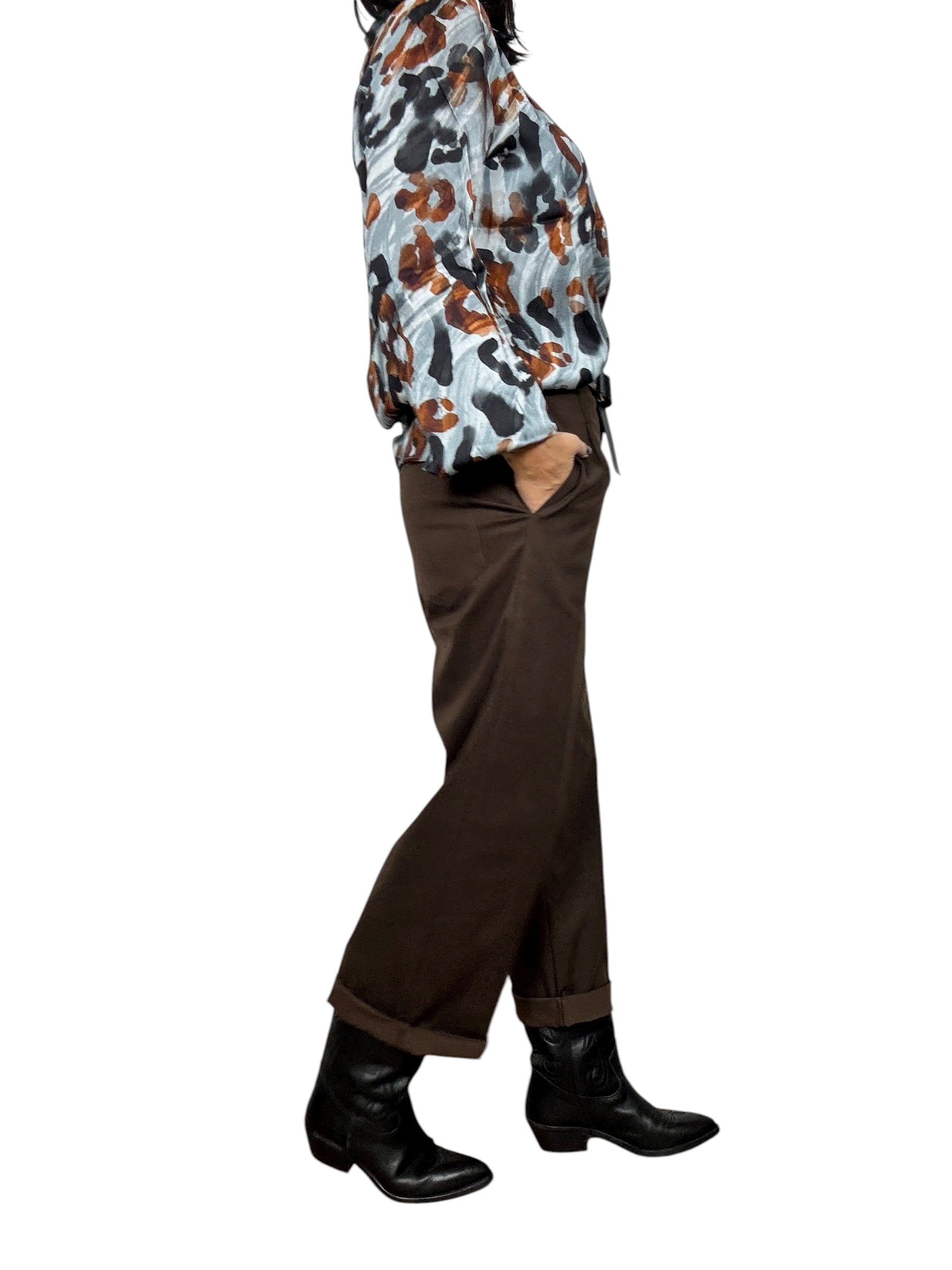 Pantalone a vita alta con pinces piatte, cinturone con bottone e zip, tasche laterali. Modello a gamba dritta, elasticizzato (vestibilità regolare tg in foto S)