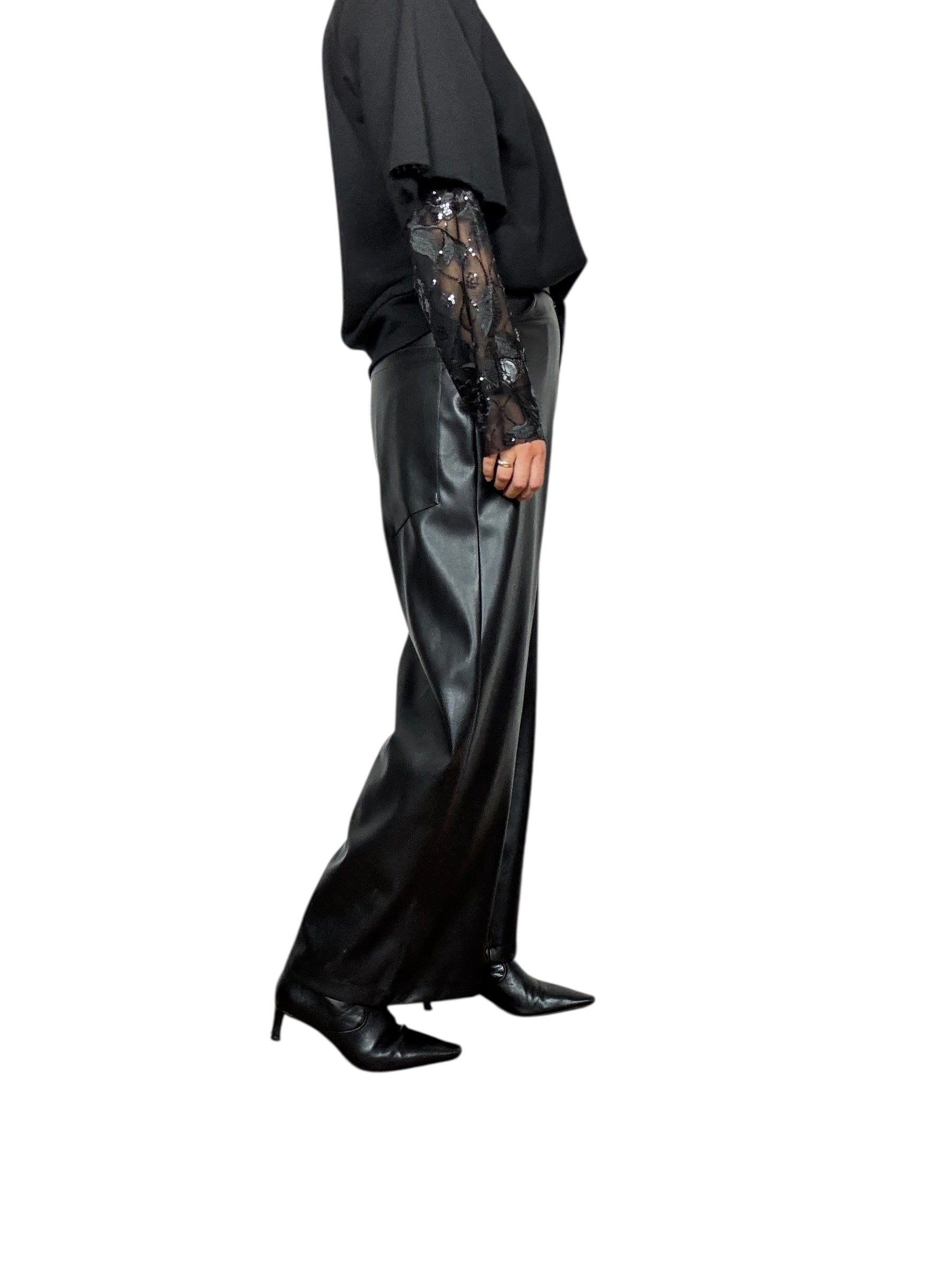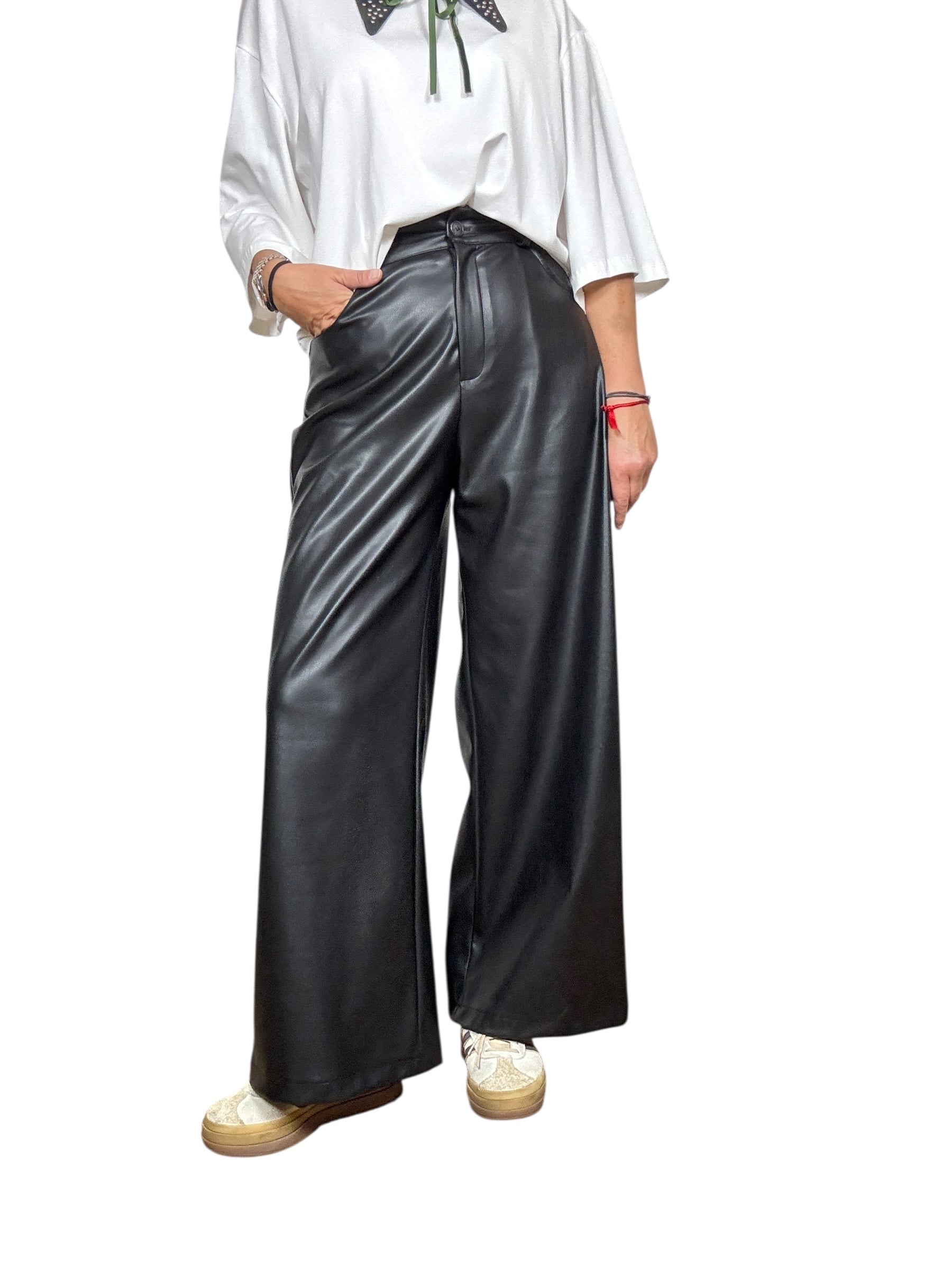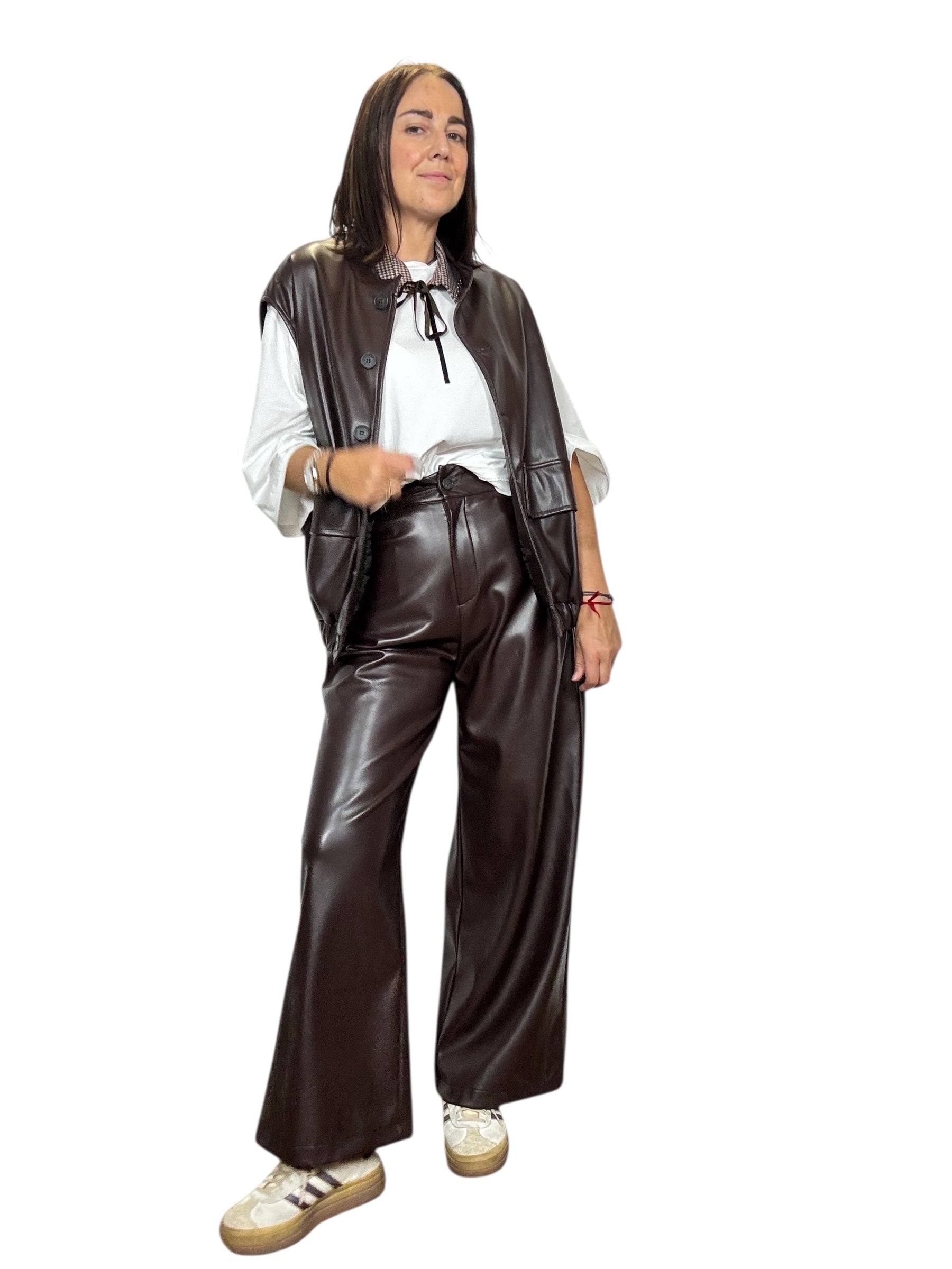 Pantalone a vita alta con tasche laterali e posteriori, chiusura con zip e bottone frontale. Modello a palazzo, tessuto super elasticizzato (tg in foto S) gilet abbinabile